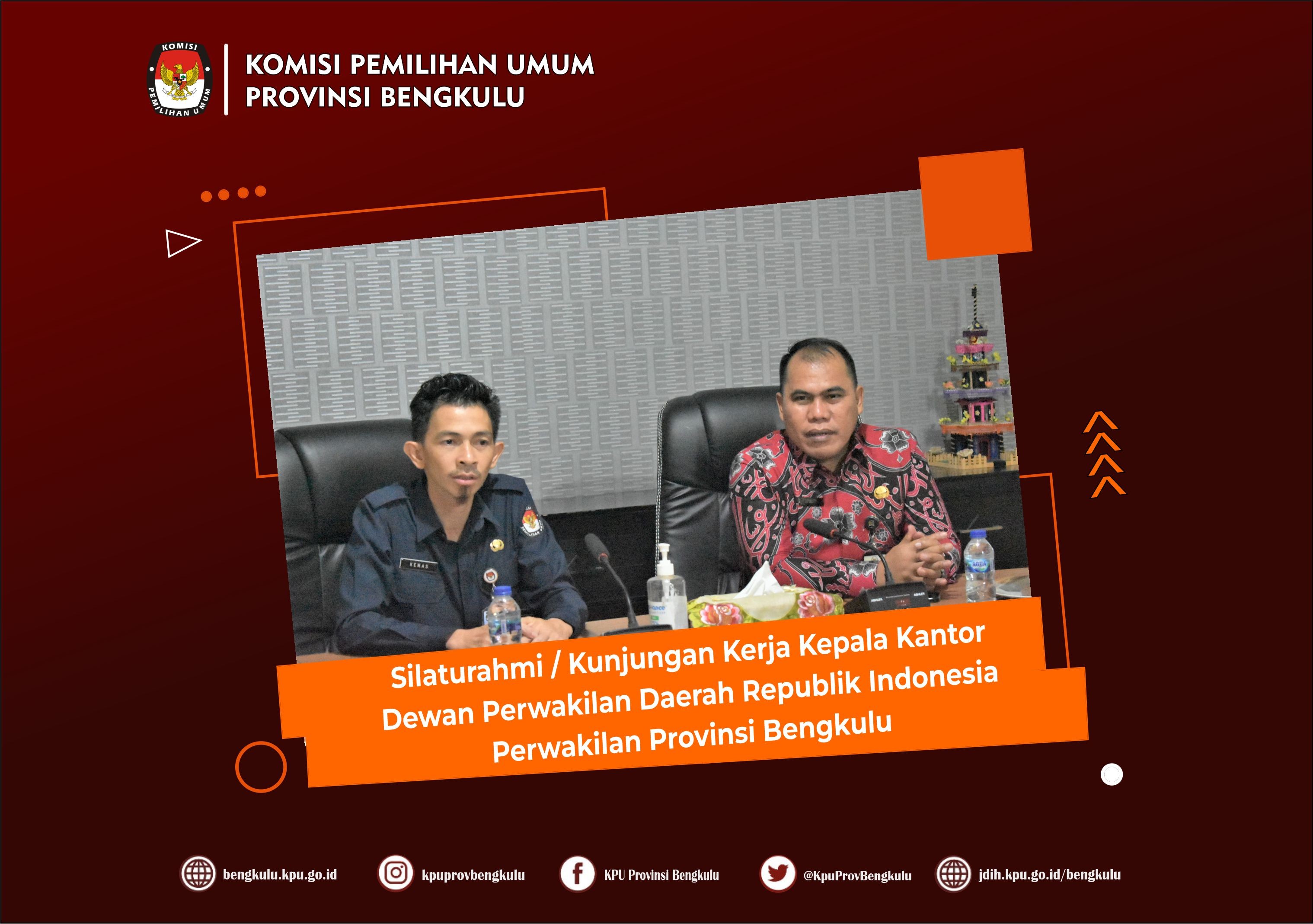 Bengkulu-bengkulu.kpu.go.id, Sekretaris KPU Provinsi Bengkulu Kemas M Ajir bersama Para Kabag Sudirman, Oktan Huzaeiry dan Hamzah menerima Silaturahmi/Kunjungan Kerja Kepala Kantor Dewan Perwakilan Daerah Republik Indonesia Perwakilan Provinsi Bengkulu Untung Putra Jaya dan rombongan bertempat di Kantor KPU Provinsi Bengkulu Selasa (24/5).