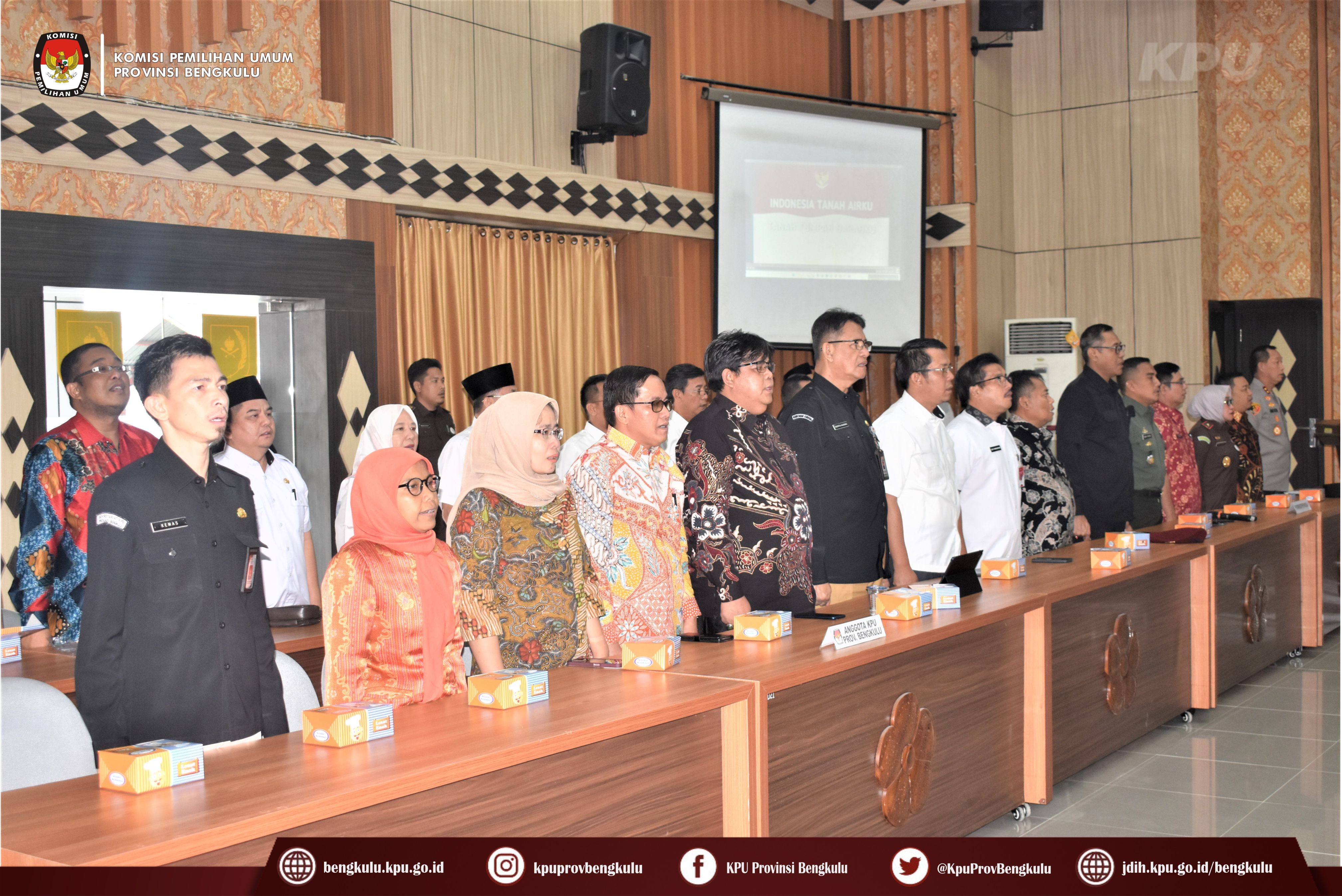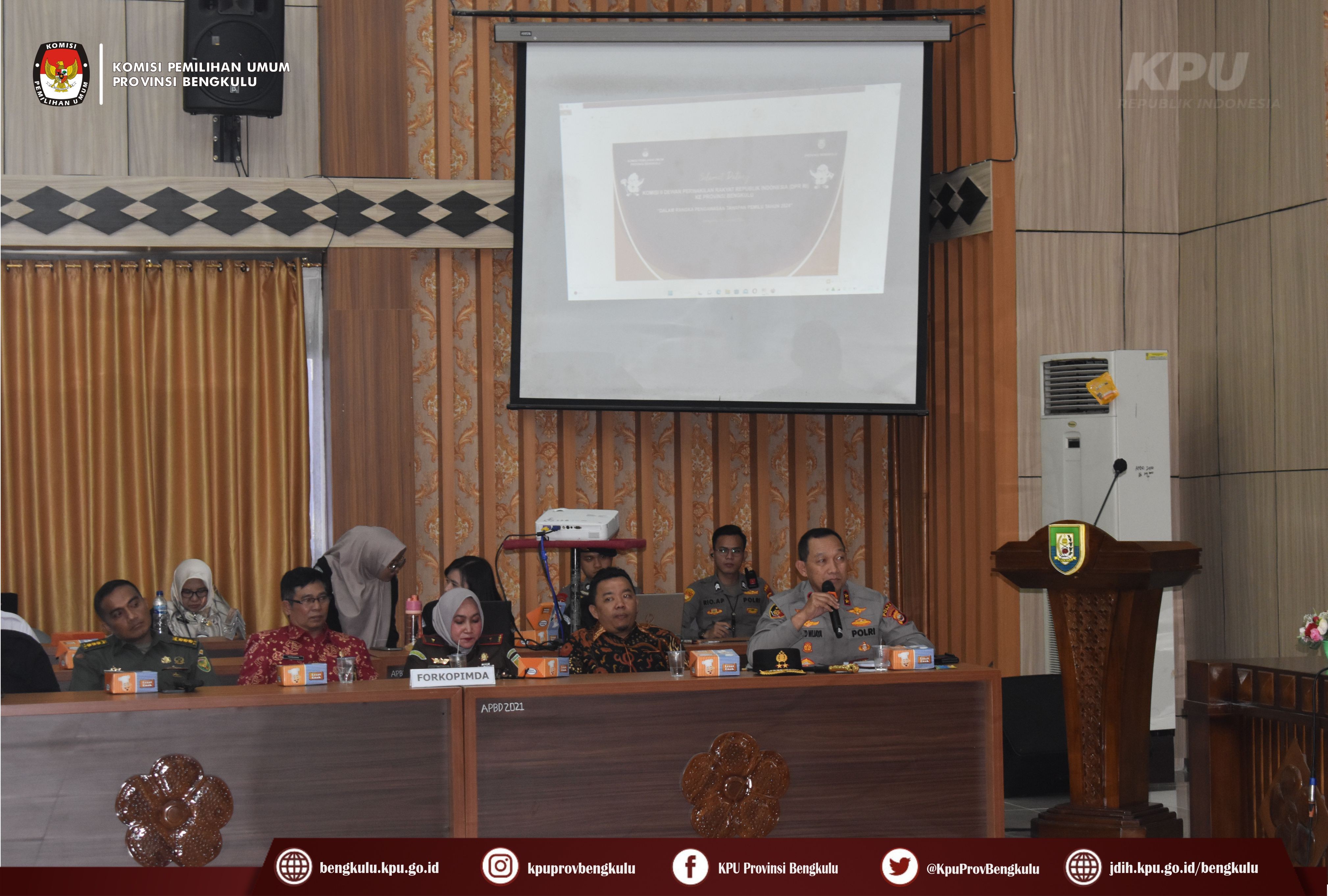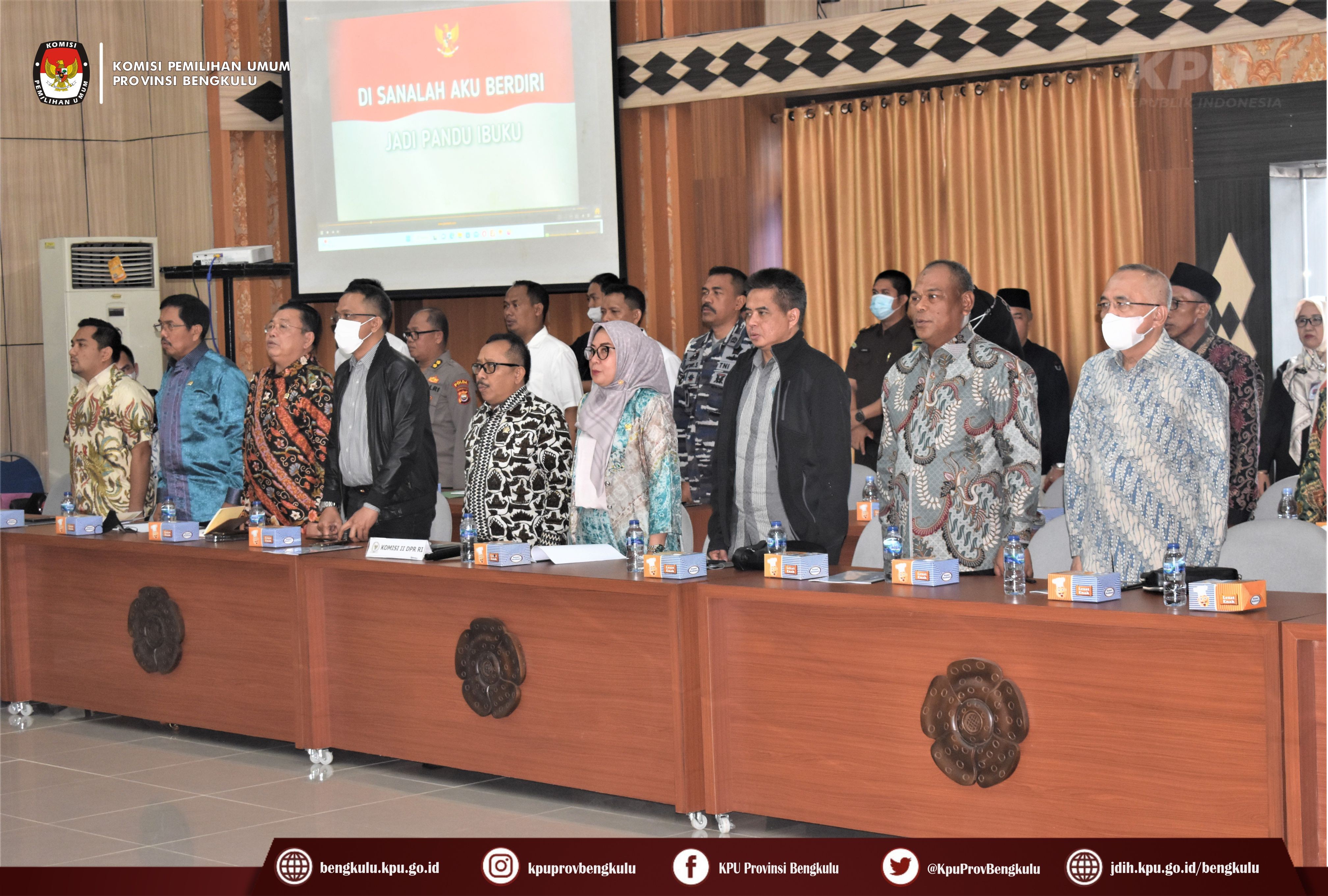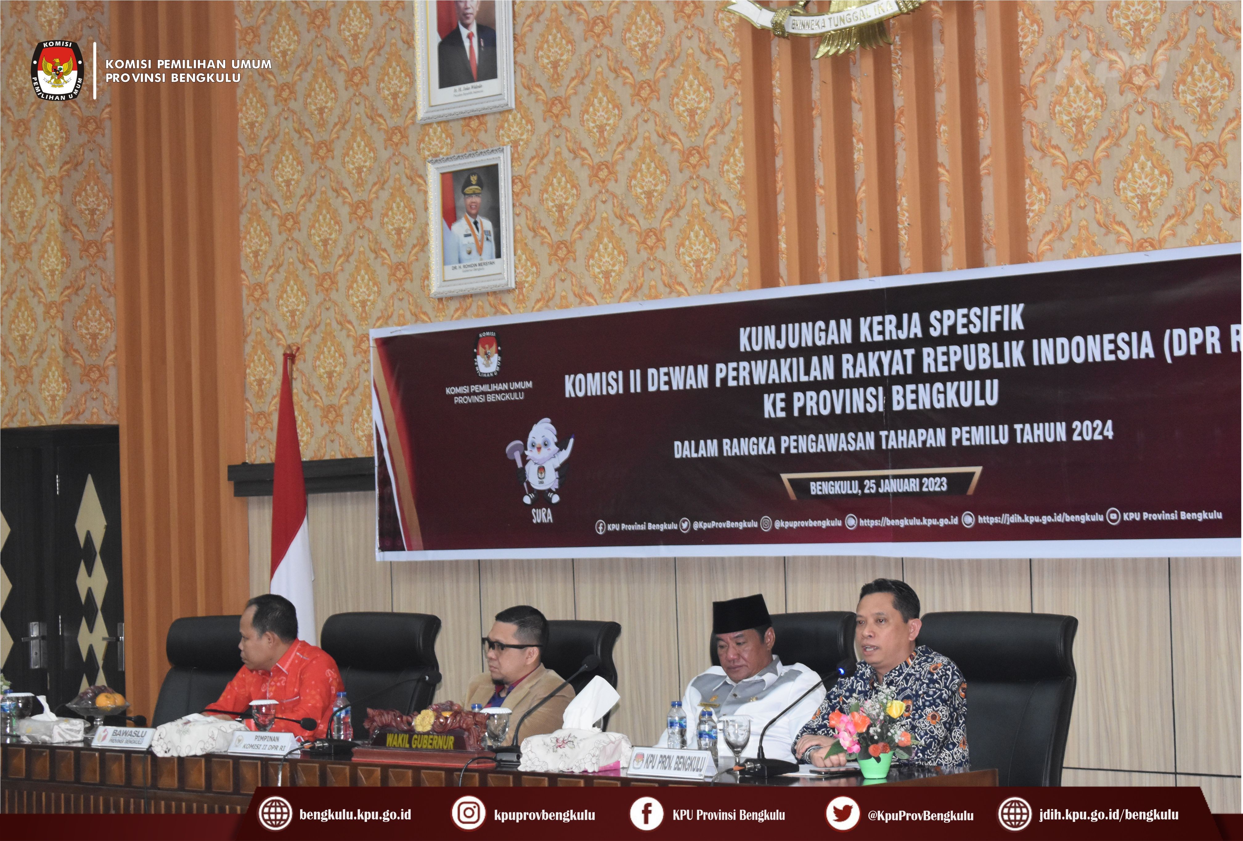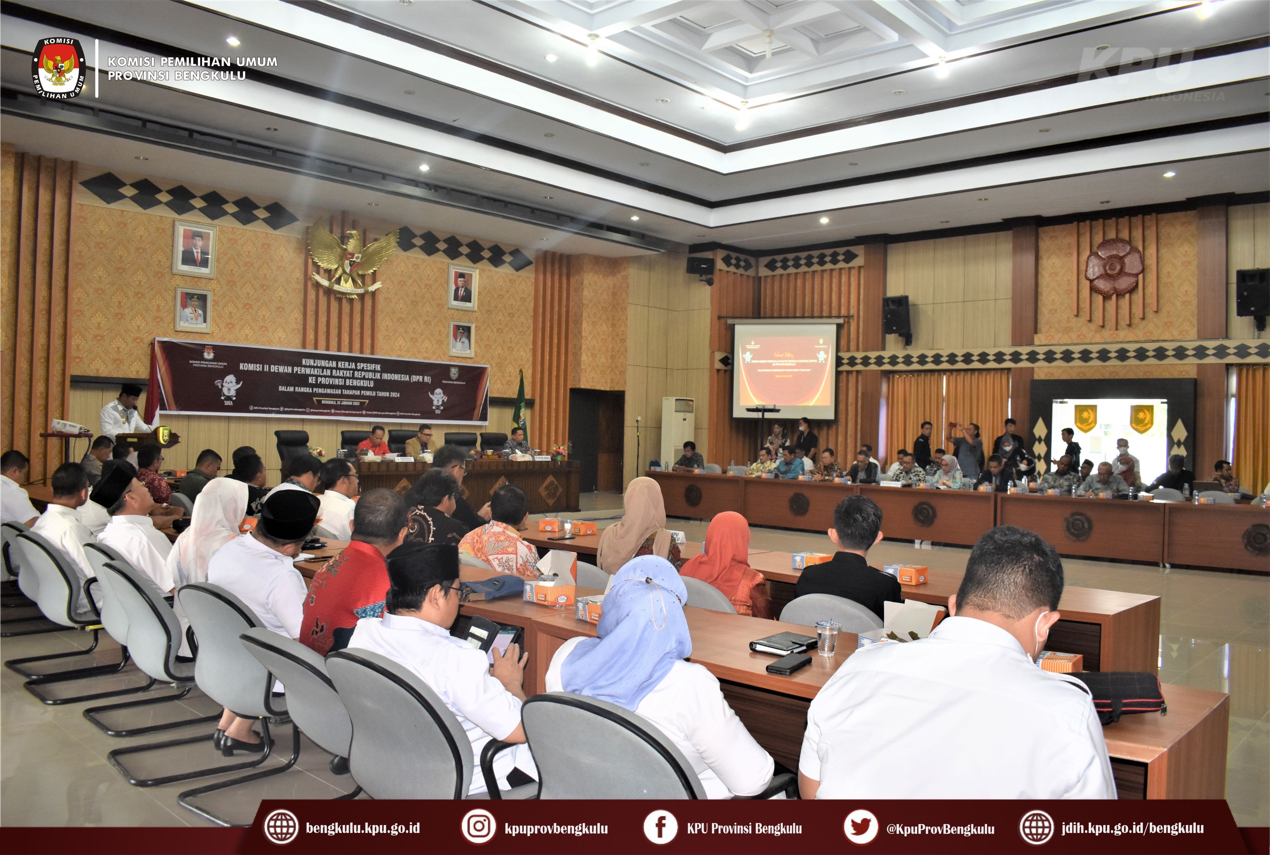 Bengkulu-bengkulu.kpu.go.id, Ketua KPU Provinsi Bengkulu Irwan Saputra bersama Anggota Siti Baroroh, Darlinsyah, Emex Verzoni dan Irna Riza Yuliastuty serta Sekretaris Kemas Mohammad Ajir hadir pada Kunjungan Kerja Spesifik Komisi II DPR RI ke Provinsi Bengkulu dalam rangka Pengawasan Tahapan Pemilu Tahun 2024 bertempat di Gedung Pola Pemerintah Provinsi Bengkulu, Rabu (25/1). Hadir dalam kunjungan kerja tersebut adalah Pejabat Kemendagri, Deputi Bidang Dukungan Teknis KPU RI Eberta Kawima, Wakil Gubernur Bengkulu, unsur Forkompinda, yaitu Kapolda, Kajati, DPRD Provinsi, Pengadilan Tinggi, Danrem 041 Gamas, BINDA, Bawaslu, dan sebagainya.