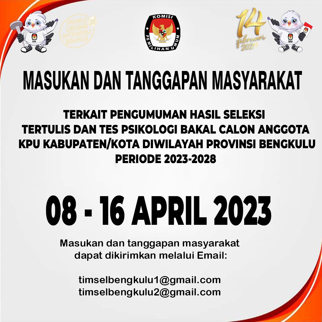 MASUKAN DAN TANGGAPAN MASYARAKAT TERKAIT PENGUMUMAN HASIL SELEKSI TERTULIS DAN PSIKOLOGI BAKAL CALON ANGGOTA KPU KABUPATEN/KOTA DIPROVINSI BENGKULU