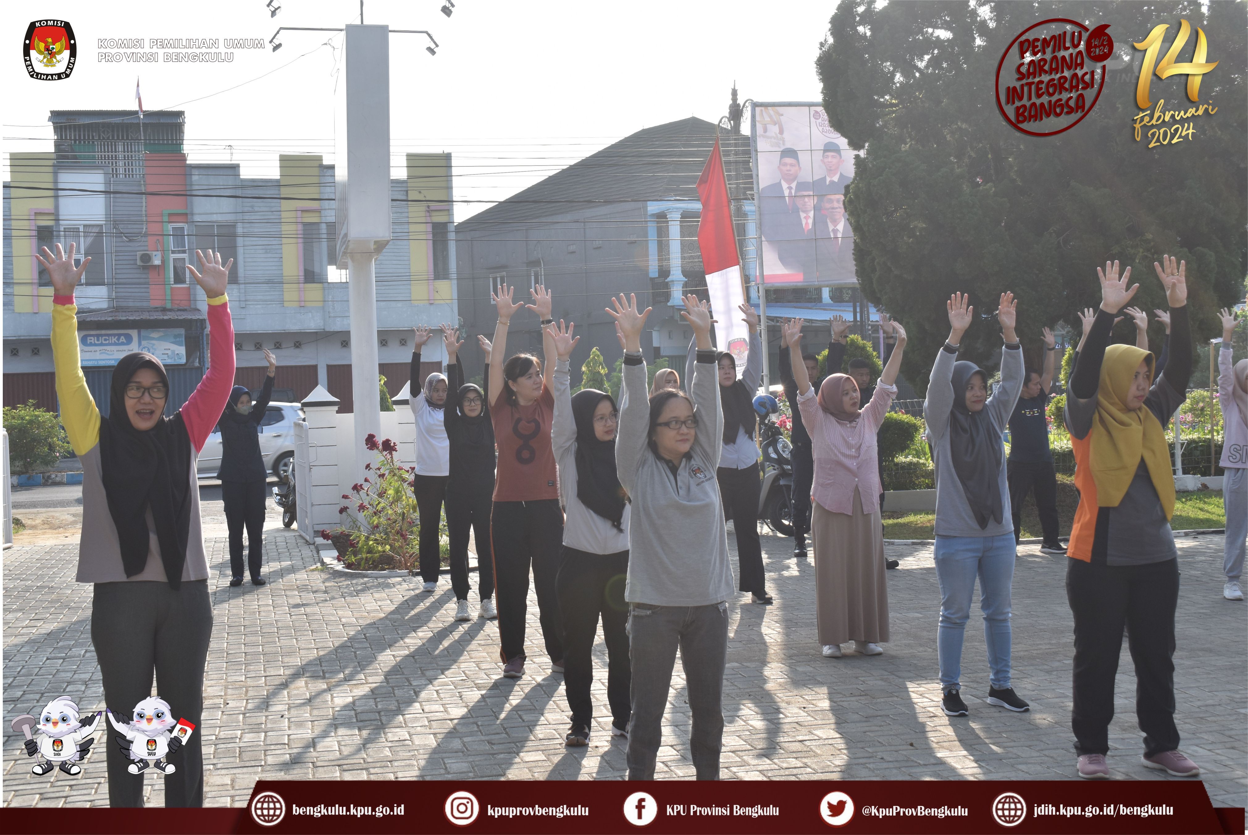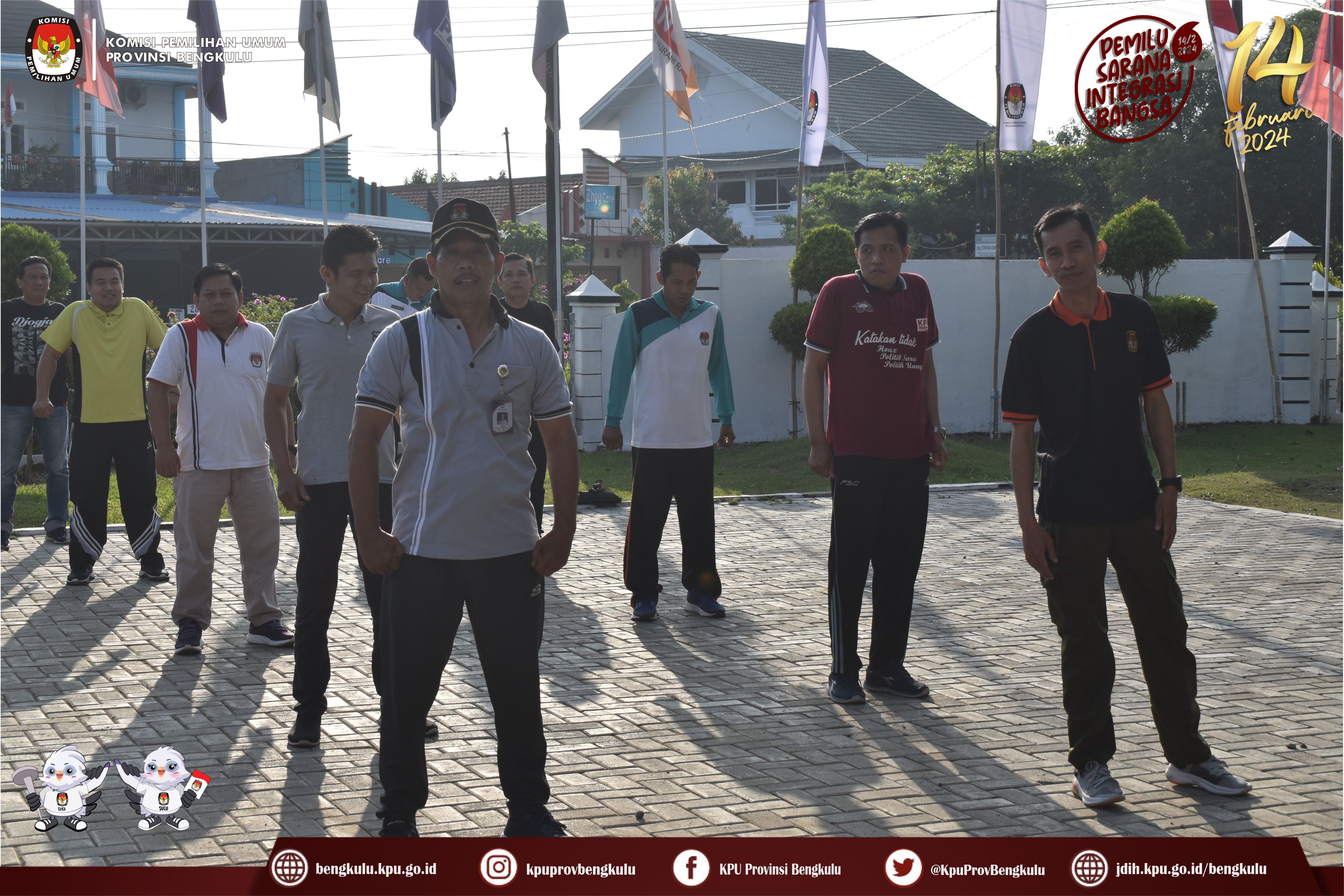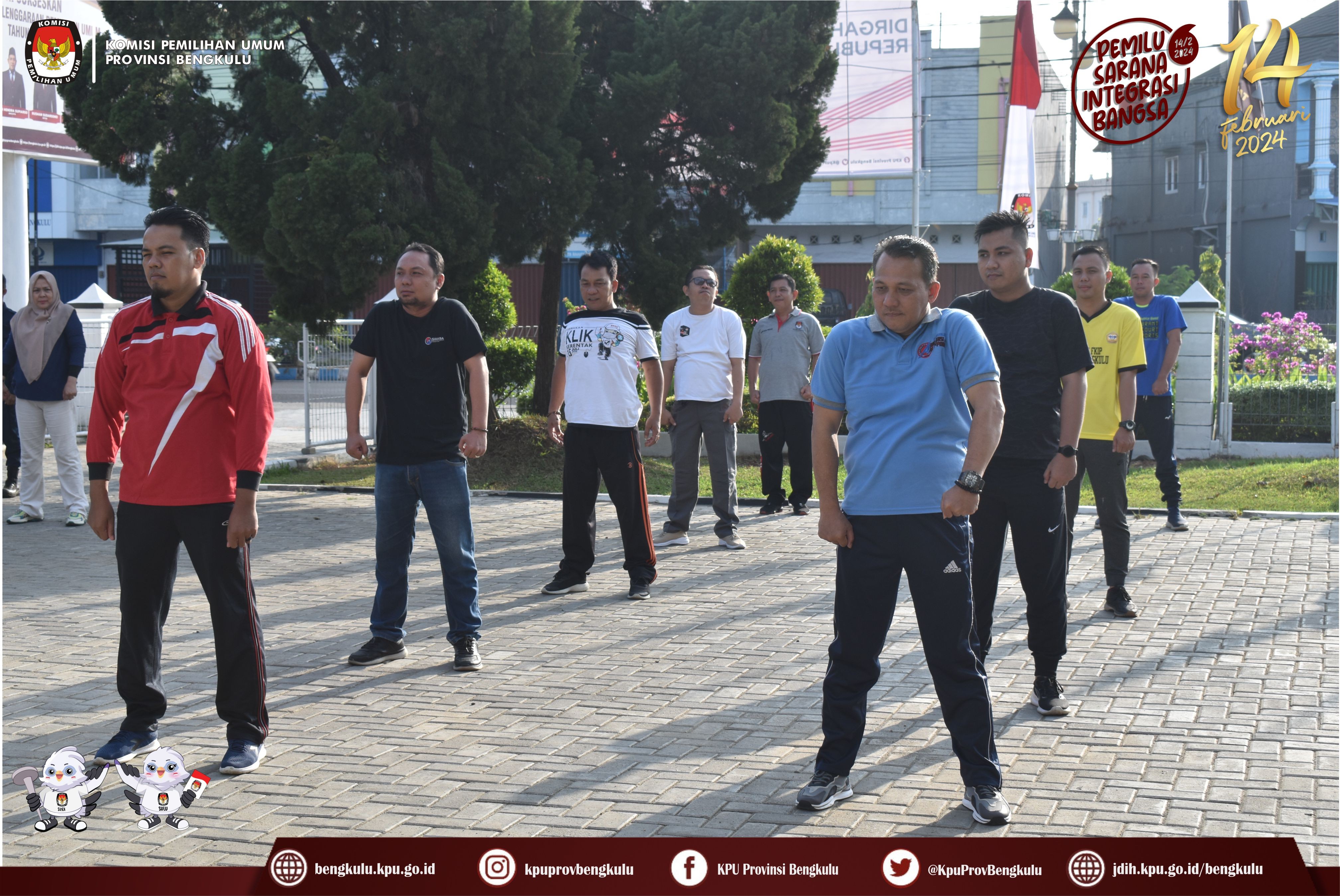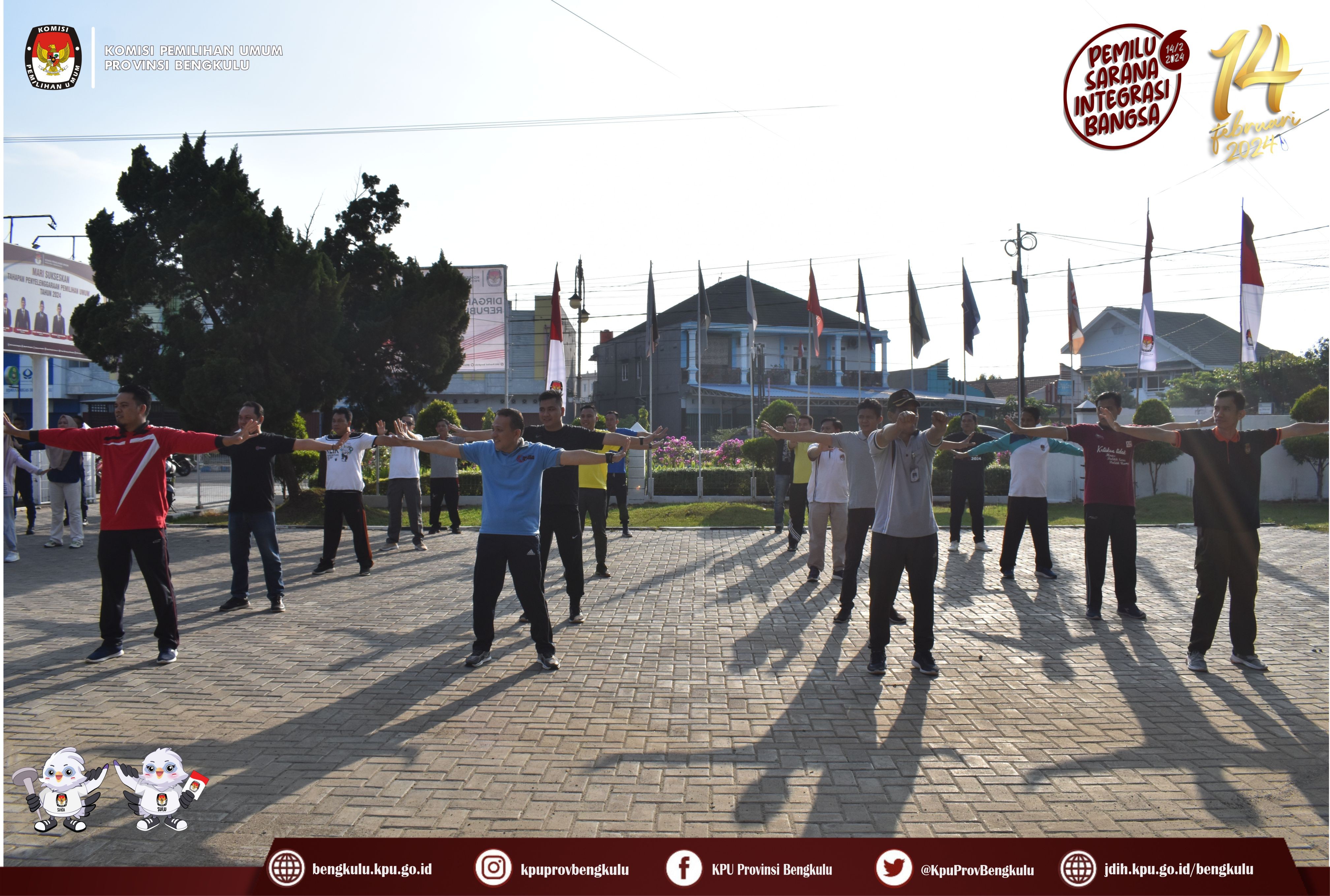 Bengkulu, bengkulu.kpu.go.id - Dalam rangka menindaklanjuti Surat Sekjen KPU Nomor 2963/SDM.07.1-SD/04/2023 perihal pelaksanaan olahraga pada hari jum’at, Jajaran Sekretariat KPU Provinsi Bengkulu melaksanakan Olahraga Jum’at (11/8/2023) di Halaman Kantor KPU Provinsi Bengkulu. Kegiatan olahraga diiikuti Kabag, Kasubbag, staf dan PPNPN di lingkungan Sekretariat KPU Provinsi Bengkulu. Olahraga ini dalam rangka menjaga dan meningkatkan kebugaran pegawai untuk menunjang produktifitas dan optimalisasi kinerja dalam menghadapi Pemilu Serentak Tahun 2024.