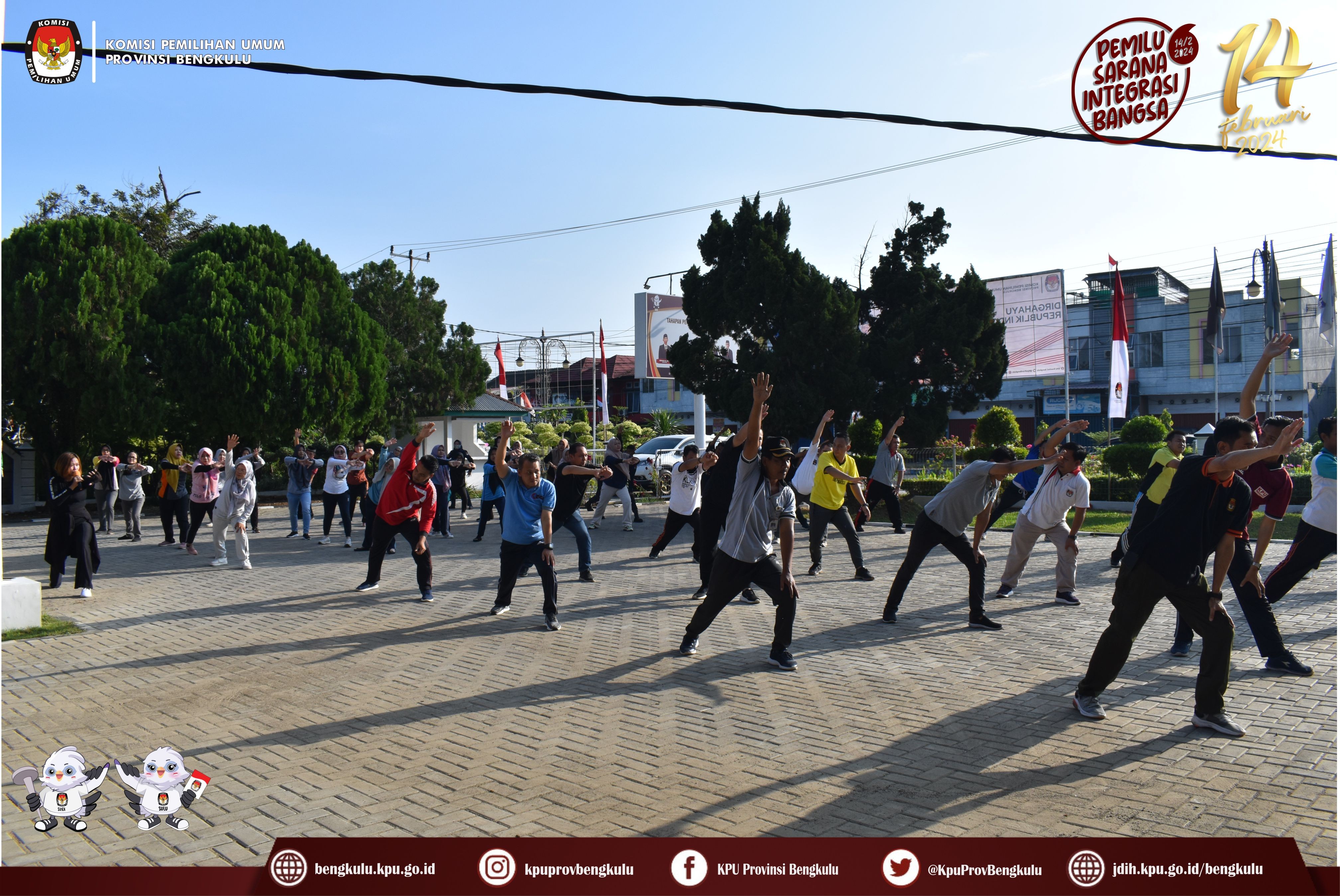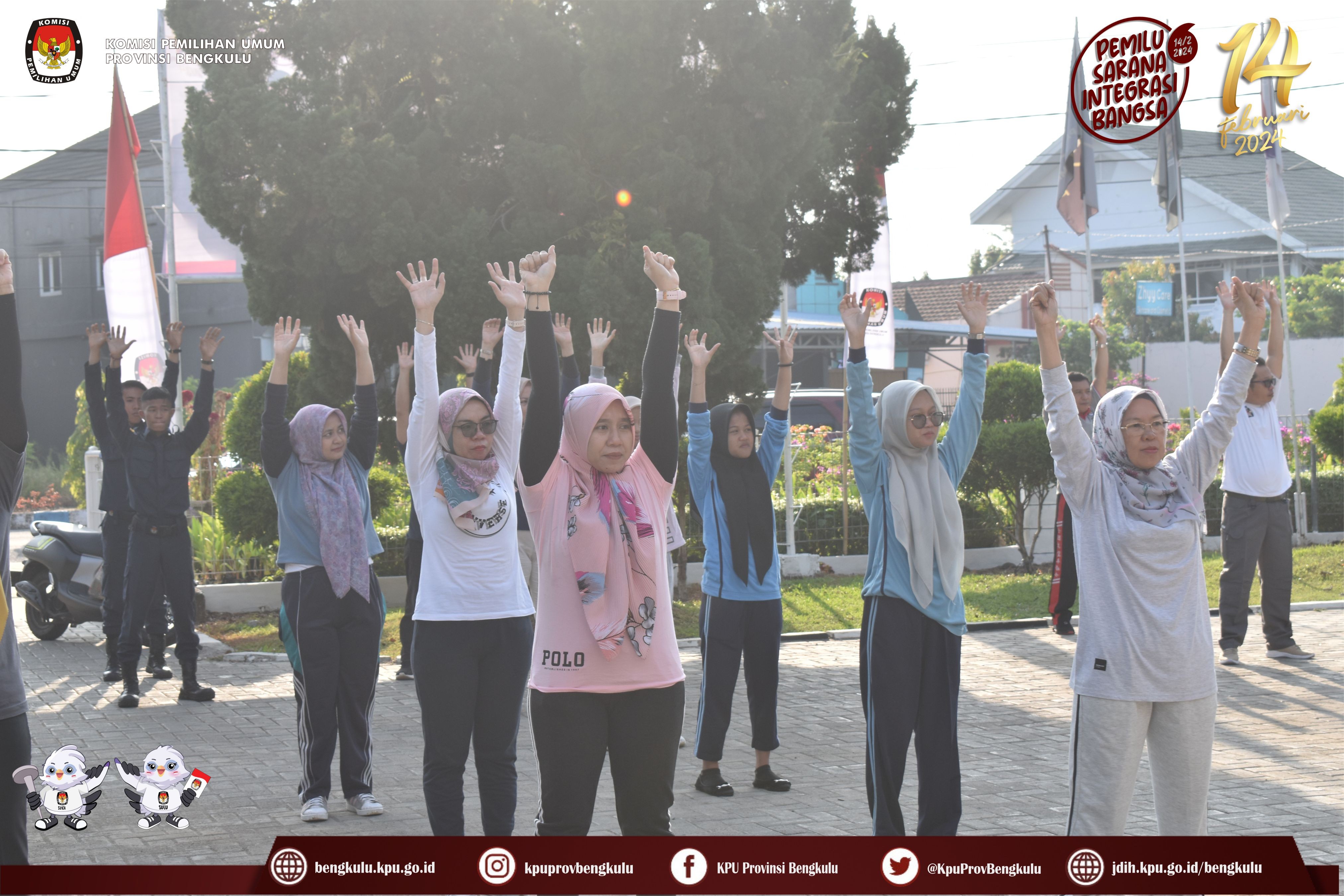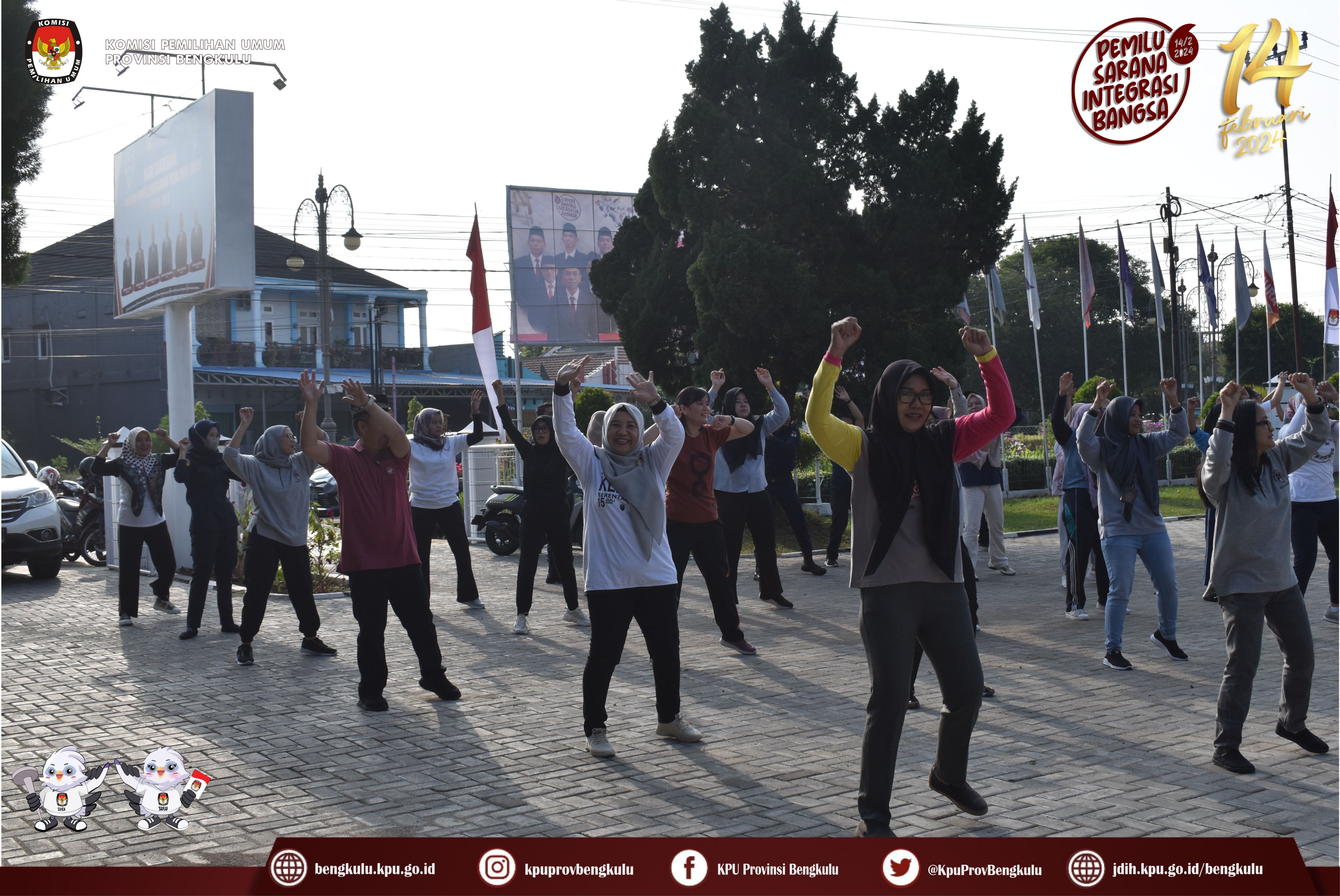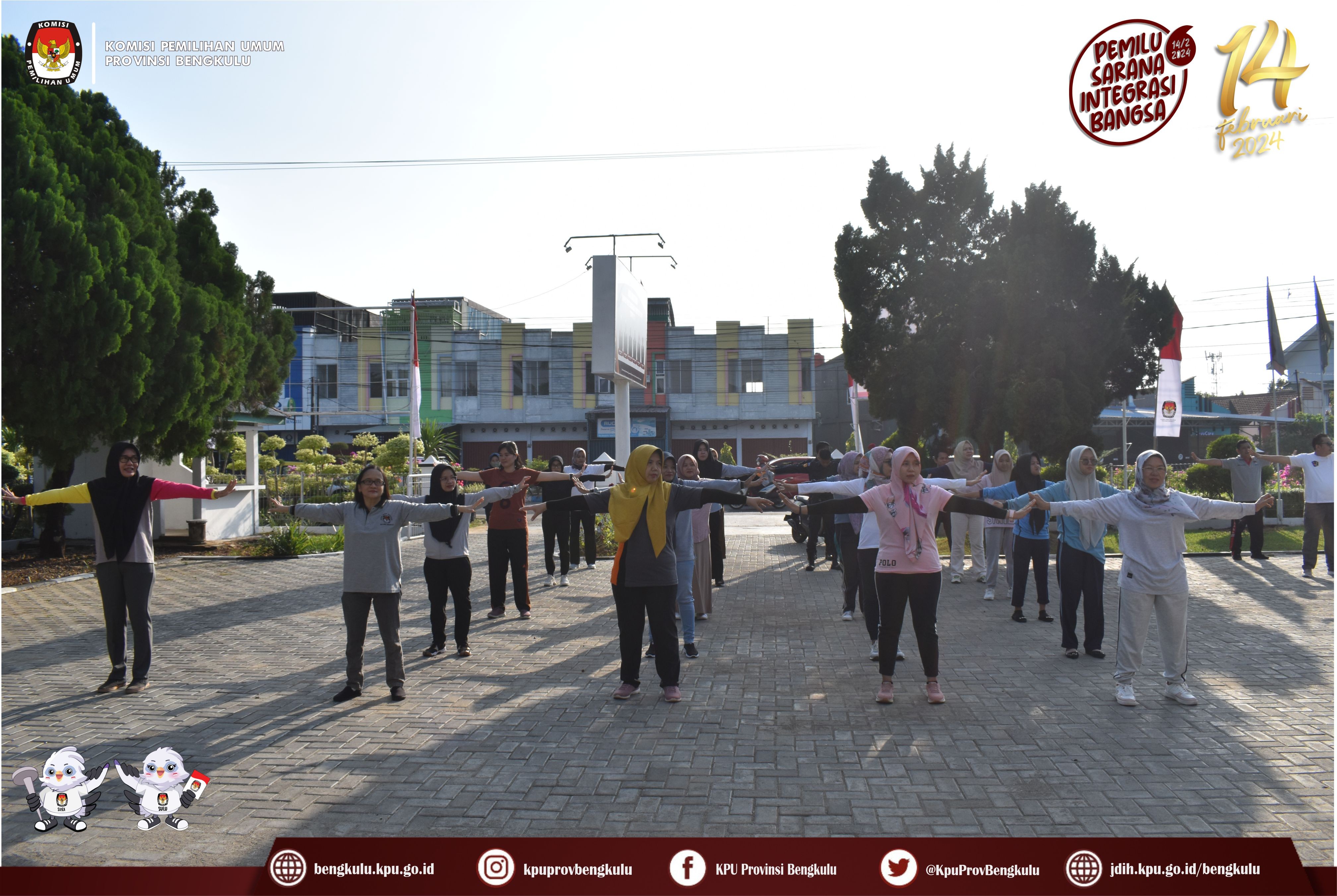 Bengkulu, bengkulu.kpu.go.id - Dalam rangka menindaklanjuti Surat Sekjen KPU Nomor 2963/SDM.07.1-SD/04/2023 perihal pelaksanaan olahraga pada hari jum’at, Jajaran Sekretariat KPU Provinsi Bengkulu melaksanakan Olahraga Jum’at (11/8/2023) di Halaman Kantor KPU Provinsi Bengkulu. Kegiatan olahraga diiikuti Kabag, Kasubbag, staf dan PPNPN di lingkungan Sekretariat KPU Provinsi Bengkulu. Olahraga ini dalam rangka menjaga dan meningkatkan kebugaran pegawai untuk menunjang produktifitas dan optimalisasi kinerja dalam menghadapi Pemilu Serentak Tahun 2024.