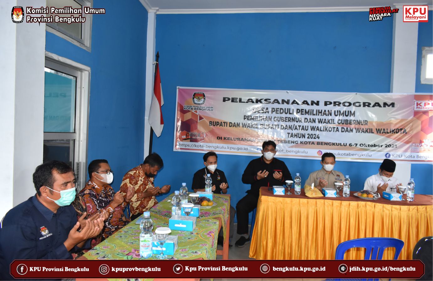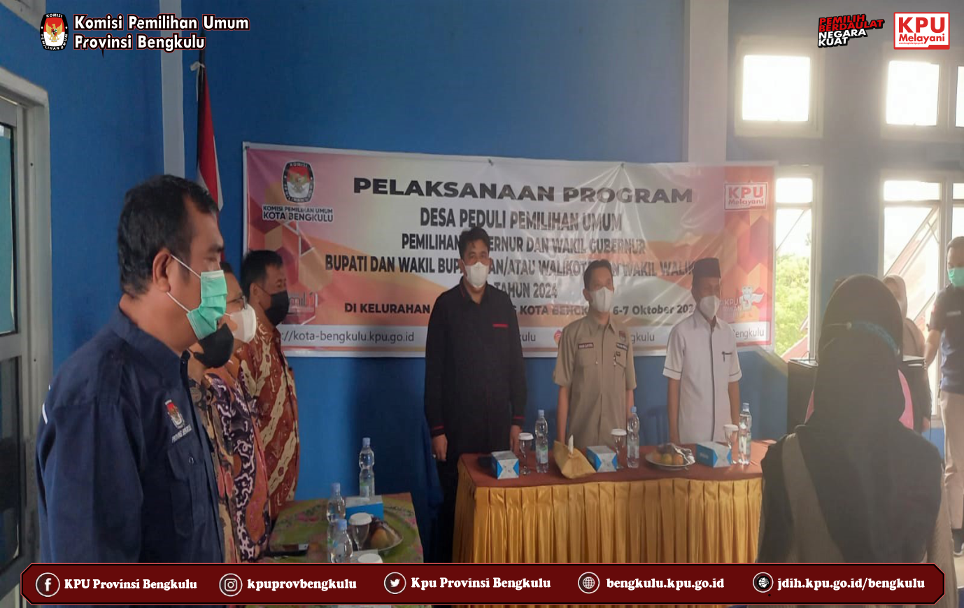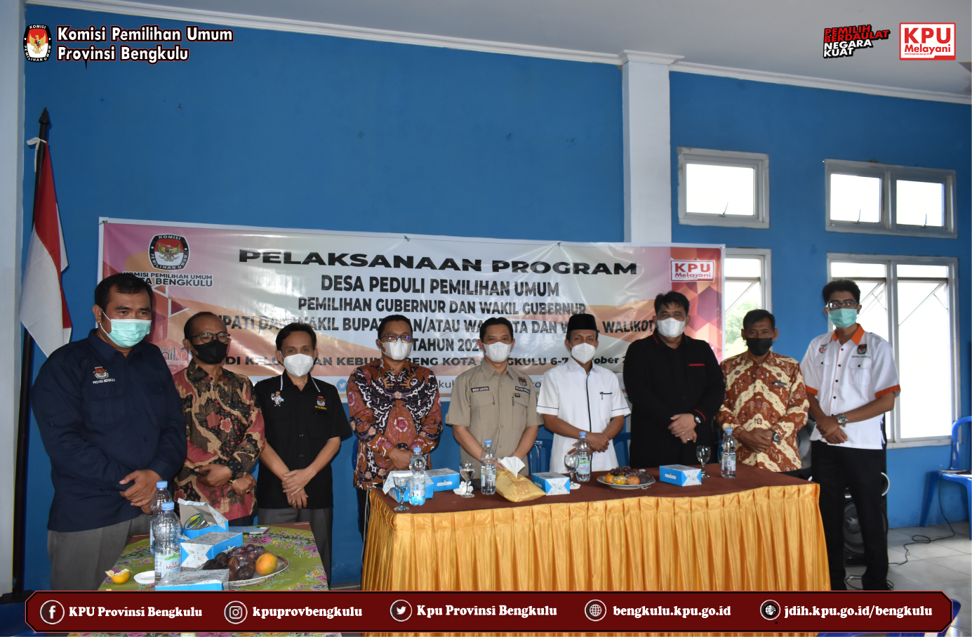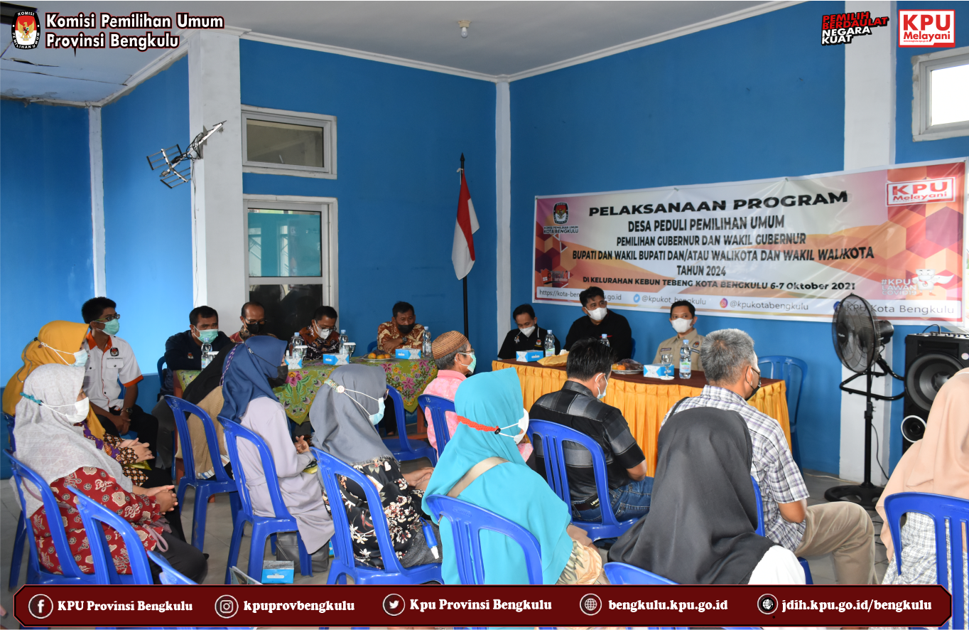 Ketua KPU Provinsi Bengkulu Irwan Saputra serta Anggota Eko Sugianto dan Darlinsyah bersama hadir dalam Pelaksanaan Program Desa/Kelurahan Peduli Pemilu dan Pemilihan Gubernur dan Wakil Gubernur, Bupati dan Wakil Bupati dan/atau Walikota dan Wakil Walikota Tahun 2024 pada Rabu (6/10) di Kelurahan Kebun Tebeng Kec. Ratu Agung Kota Bengkulu. Kegiatan ini dihadiri Ketua dan Anggota KPU Kota Bengkulu, Lurah Kebun Tebeng serta 25 (dua puluh lima) orang yang berasal masyarakat Kelurahan Kebun Tebeng.