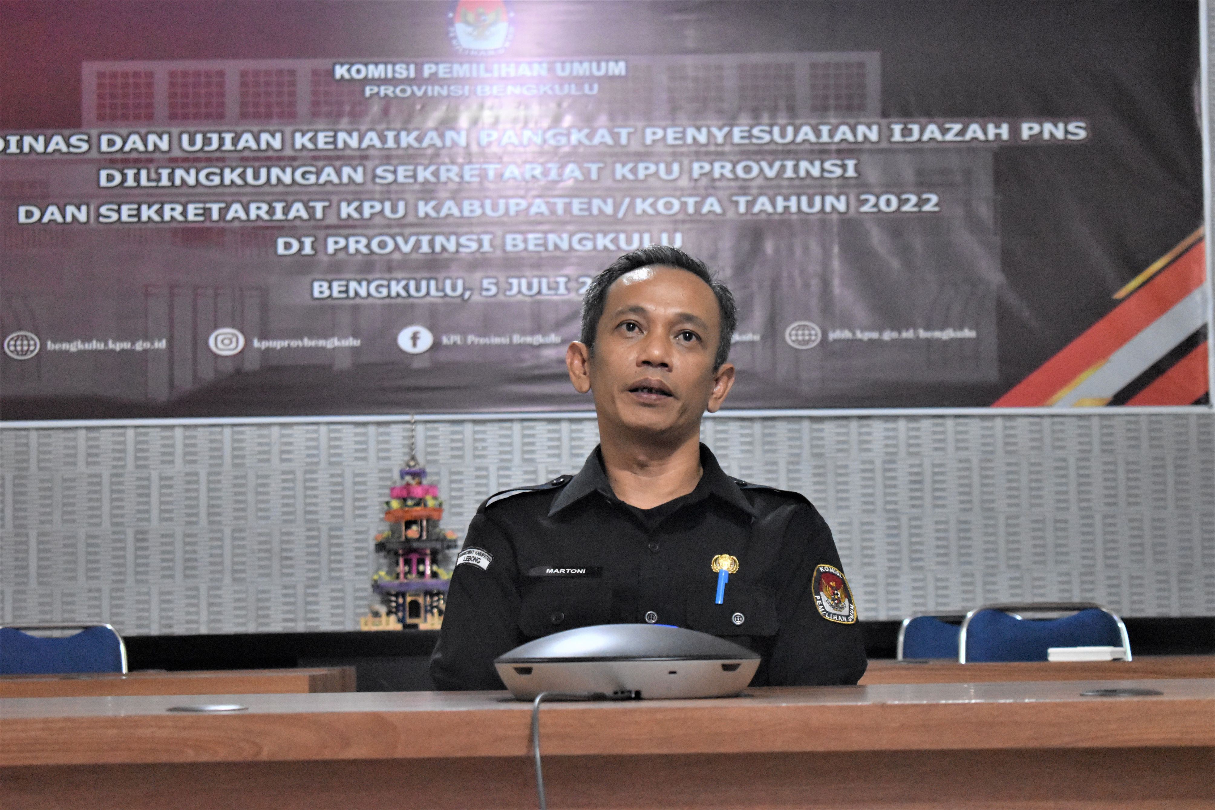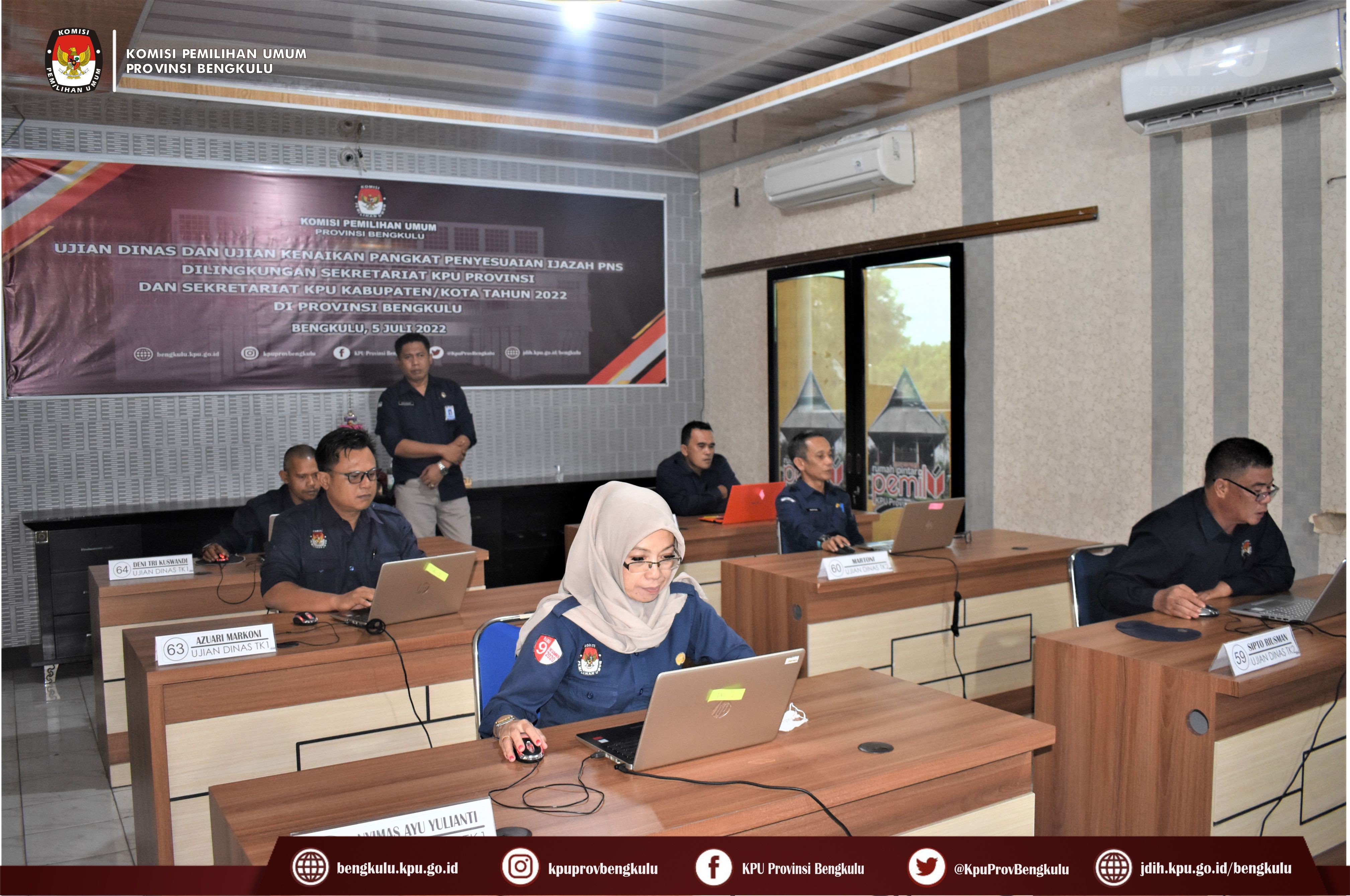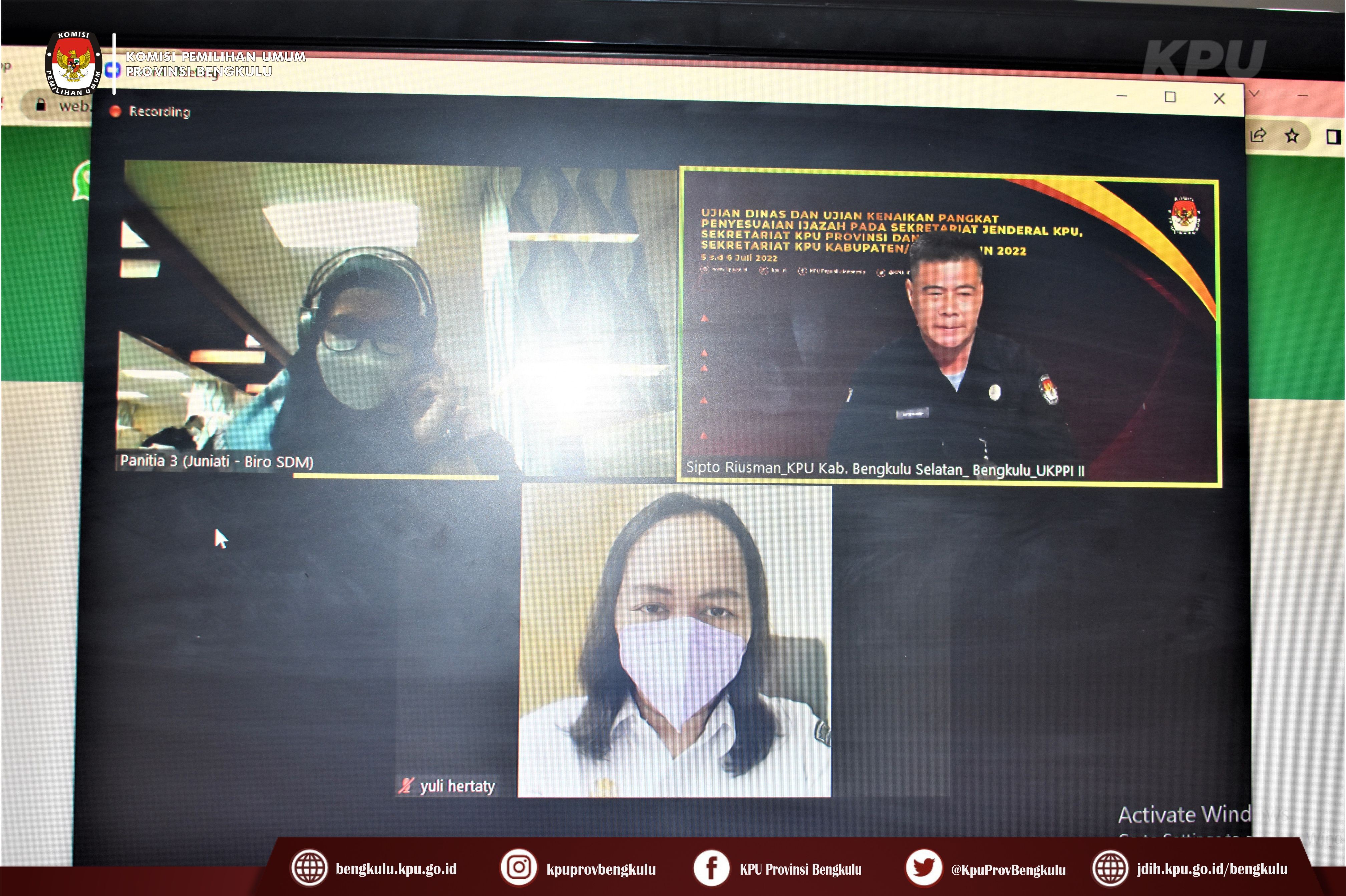 Bengkulu-bengkulu.kpu.go.id, Dalam rangka menindaklanjuti Surat Setjen KPU RI Nomor 1249/SDM.03.1-SD/04/2022, pada Selasa (5/7) dilaksanakan Ujian Dinas dan Ujian Kenaikan Pangkat Penyesuaian Ijazah di Lingkungan Sekretariat KPU Provinsi dan Sekretariat KPU Kabupaten/Kota Se-Indonesia secarayang dilaksanakan oleh Sekretariat Jenderal KPU RI secara daring (zoom meeting). Untuk di Provinsi Bengkulu pelaksanaan UD dan UKPPI diikuti 6 (enam) orang Sekretariat Kabupaten, yaitu 2 (dua) orang KPU Kabupaten Bengkulu Selatan, 1 (satu) orang KPU Kabupaten Rejang Lebong, 2 (dua) orang KPU Kabupaten Lebong dan 1 (satu) orang KPU Kabupaten Mukomuko. UD dan UKPPI dilaksanakan menggunakan Computer Assited Test (CAT) dan Wawancara.
