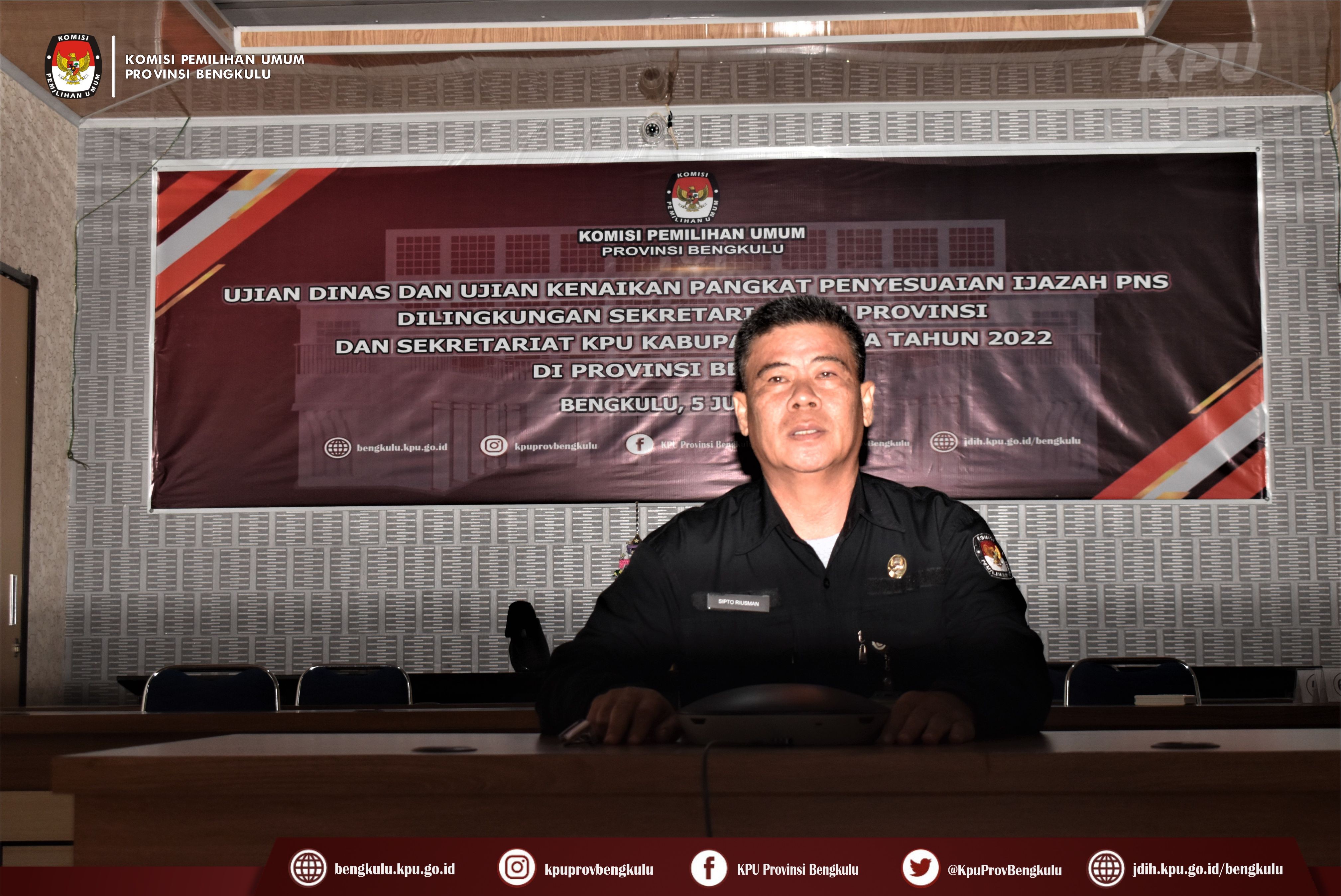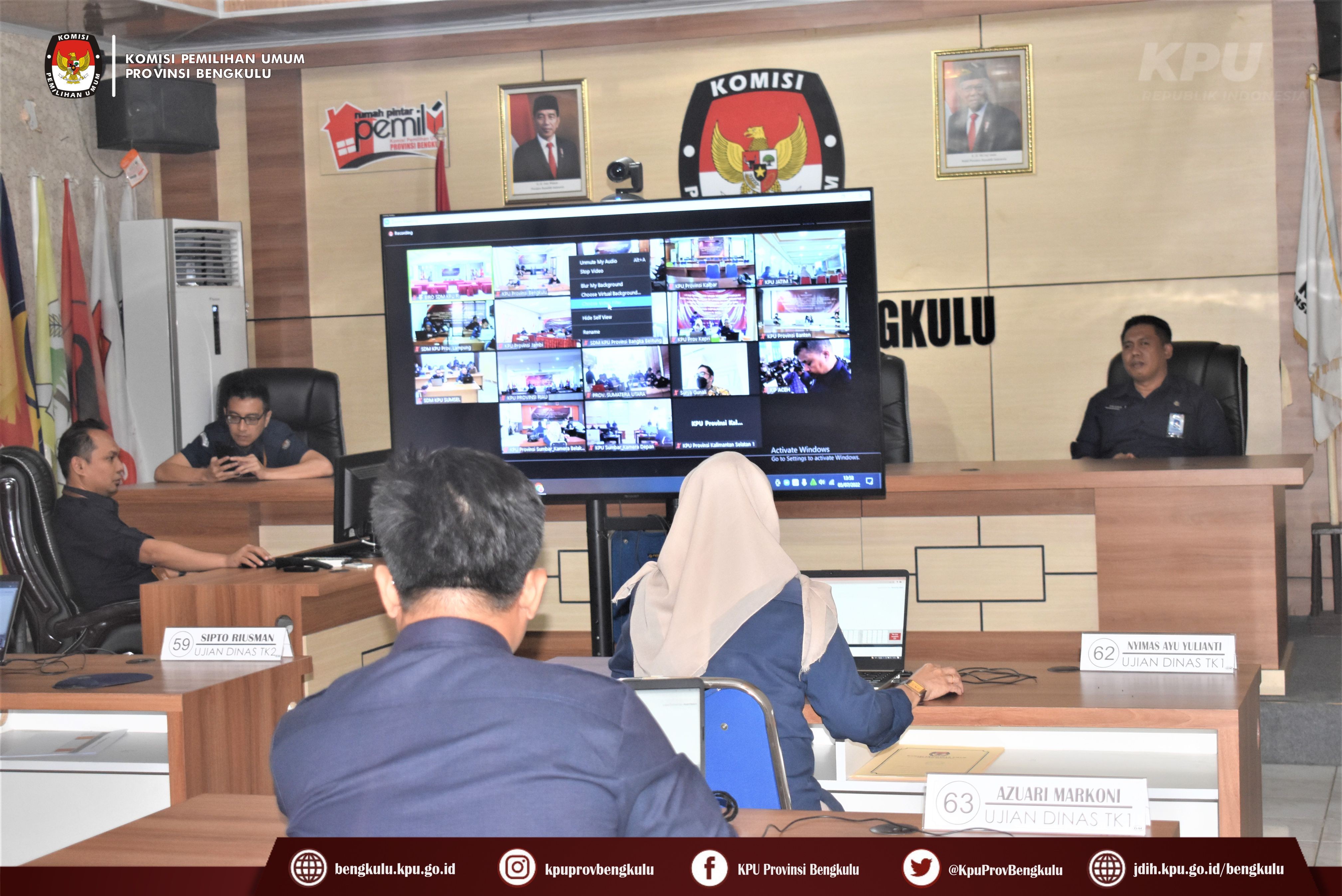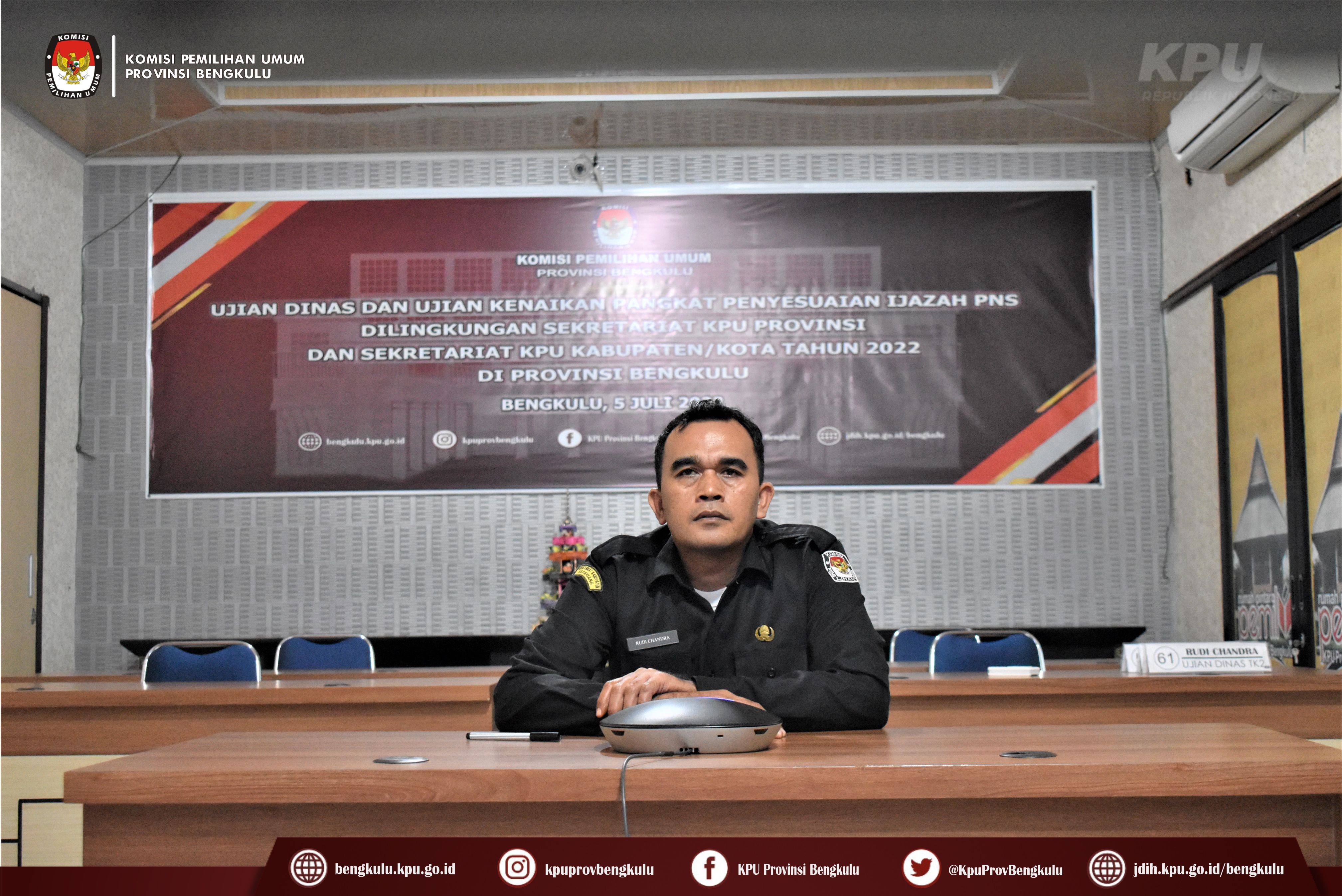 Bengkulu-bengkulu.kpu.go.id, Dalam rangka menindaklanjuti Surat Setjen KPU RI Nomor 1249/SDM.03.1-SD/04/2022, pada Selasa (5/7) dilaksanakan Ujian Dinas dan Ujian Kenaikan Pangkat Penyesuaian Ijazah di Lingkungan Sekretariat KPU Provinsi dan Sekretariat KPU Kabupaten/Kota Se-Indonesia secarayang dilaksanakan oleh Sekretariat Jenderal KPU RI secara daring (zoom meeting). Untuk di Provinsi Bengkulu pelaksanaan UD dan UKPPI diikuti 6 (enam) orang Sekretariat Kabupaten, yaitu 2 (dua) orang KPU Kabupaten Bengkulu Selatan, 1 (satu) orang KPU Kabupaten Rejang Lebong, 2 (dua) orang KPU Kabupaten Lebong dan 1 (satu) orang KPU Kabupaten Mukomuko. UD dan UKPPI dilaksanakan menggunakan Computer Assited Test (CAT) dan Wawancara.