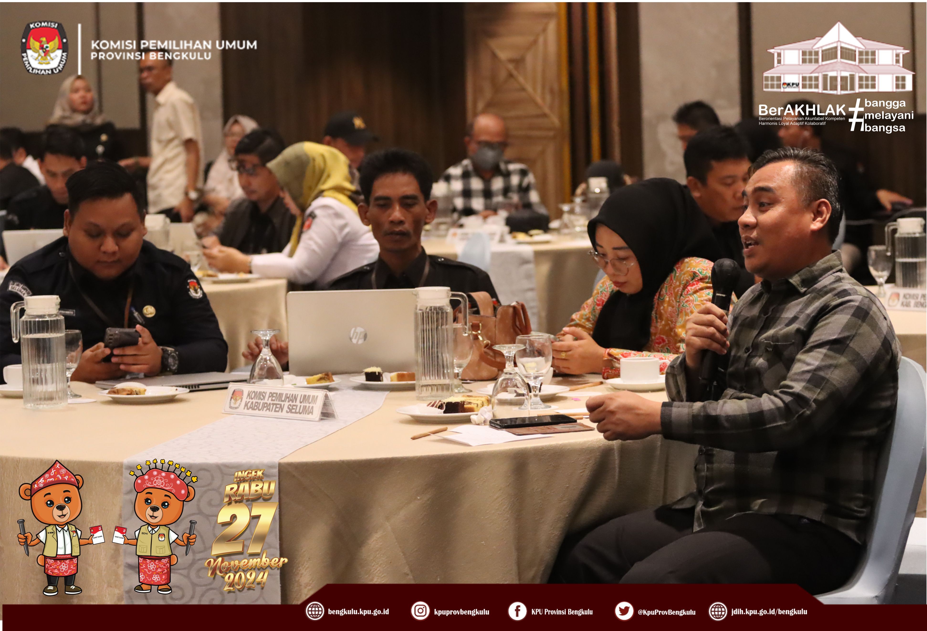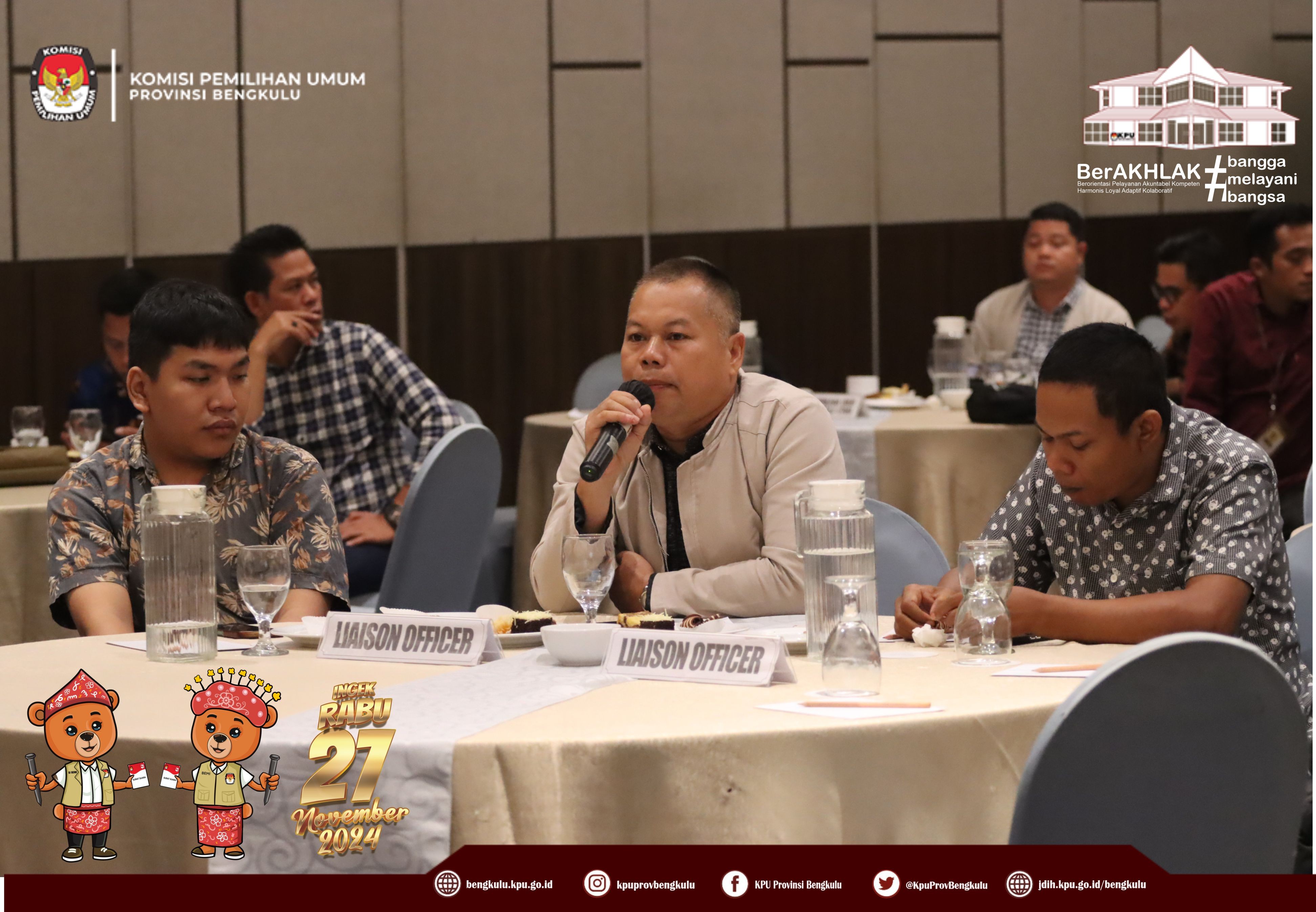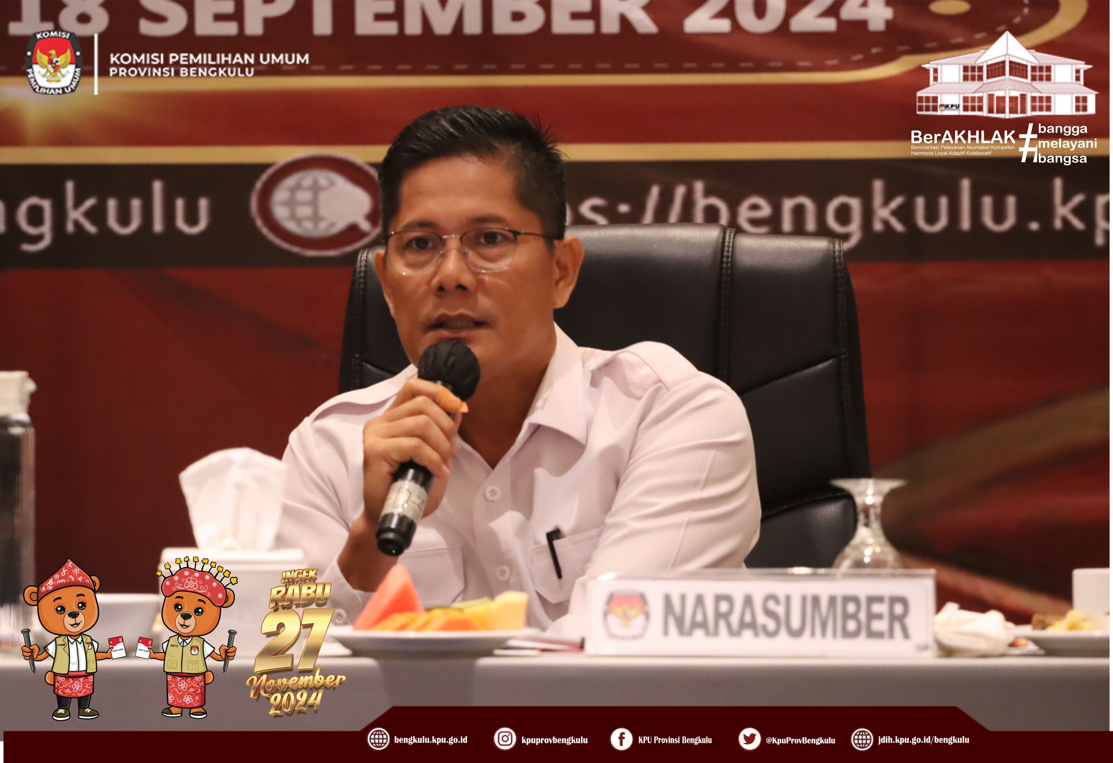 Bengkulu, bengkulu.kpu.go.id - Hari kedua Rabu (18/9/2024) Bimbingan Teknis Pelaksanaan Regulasi Kampanye dan Pelaporan Dana Kampanye untuk mewujudkan Pemilihan Gubernur dan Wakil Gubernur, Bupati dan Wakil Bupati serta Walikota dan Wakil Walikota di Provinsi Bengkulu Tahun 2024 yang Partisipatif, Terbuka, dan Berakuntabilitas Publik dilanjutkan dengan penyampaian materi dari Anggota KPU Provinsi Bengkulu Bapak Dodi Hendra Supiarso yang membahas tentang Kebijakan Kampanye Pemilihan Serentak Tahun 2024, Anggota KPU Provinsi Bengkulu Bapak Sarjan Efendi yang membahas tentang Kebijakan Dana Kampanye Pemilihan Serentak Tahun 2024, Ketua Bawaslu Provinsi Bengkulu Fahamsyah yang membahas tentang Pengawasan Tahapan Kampanye dan Dana Kampanye pada Pemilihan Serentak Tahun 2024, Kasubdit Politik Ditintelkam Polda Bengkulu Bapak AKBP. PM. Amin, S.Ag yang membahas tentang Peran Kepolisian Dalam Pengamanan Kampanye dan Pencegahan Dana Kampanye Illegal dan Asisten Pemerintahan Dan Kesra Setda Provinsi Bengkulu Bapak Drs. Khairil Anwar, M.Si yang membahas tentang Zona dan Lokasi Kampanye Pemilihan Serentak Tahun 2024 di Wilayah Provinsi Bengkulu. Selain materi, ada diskusi tanya jawab.
