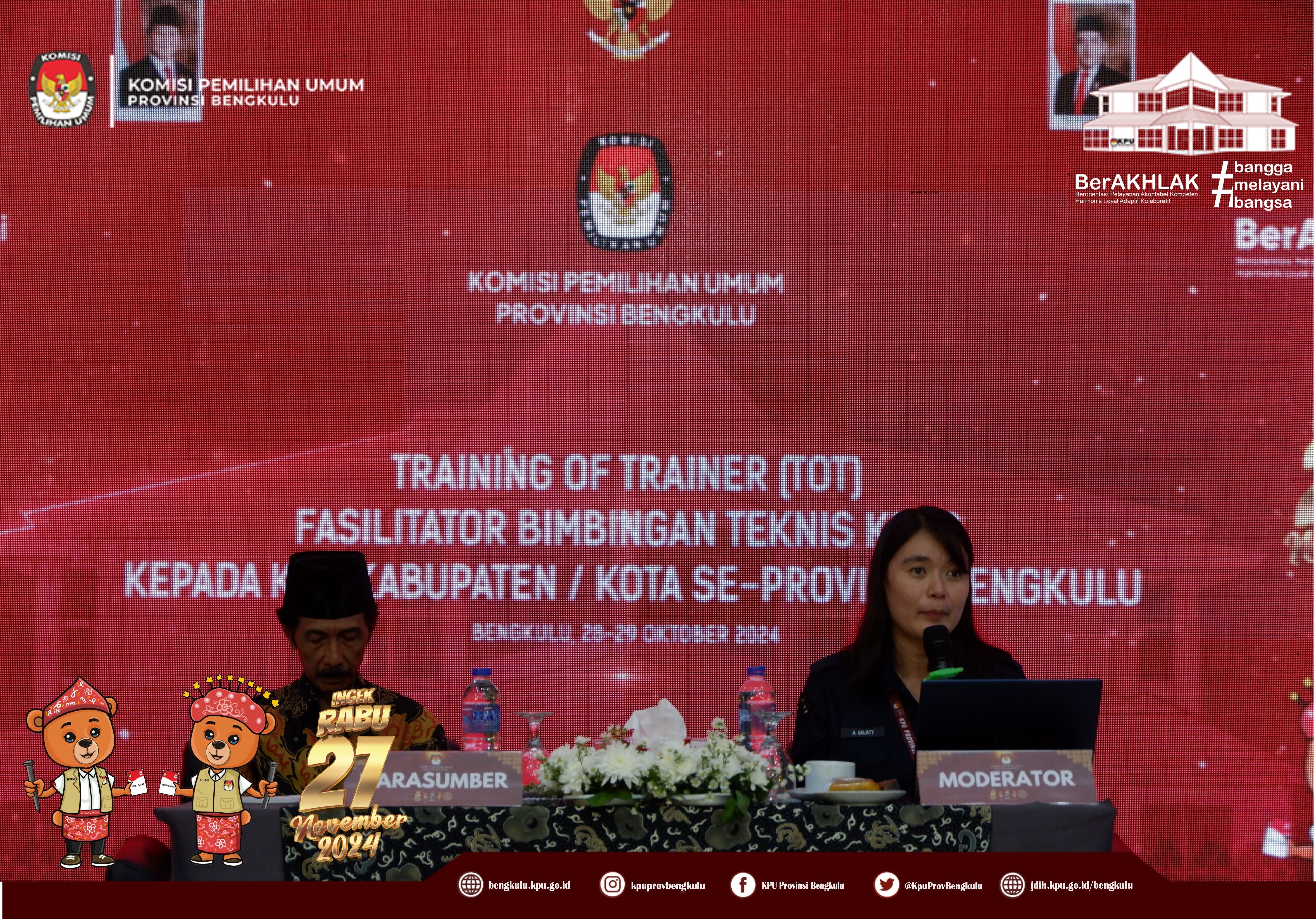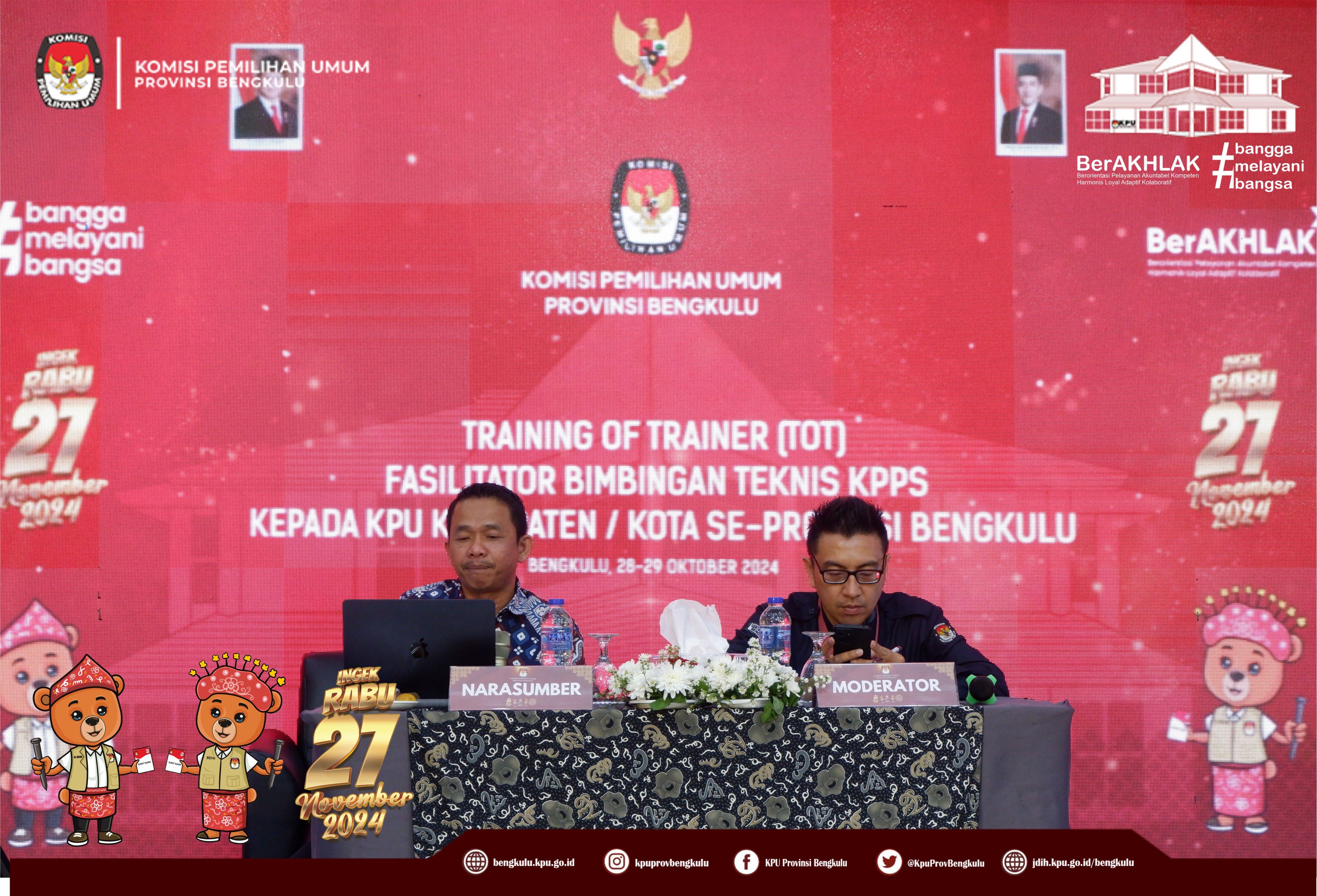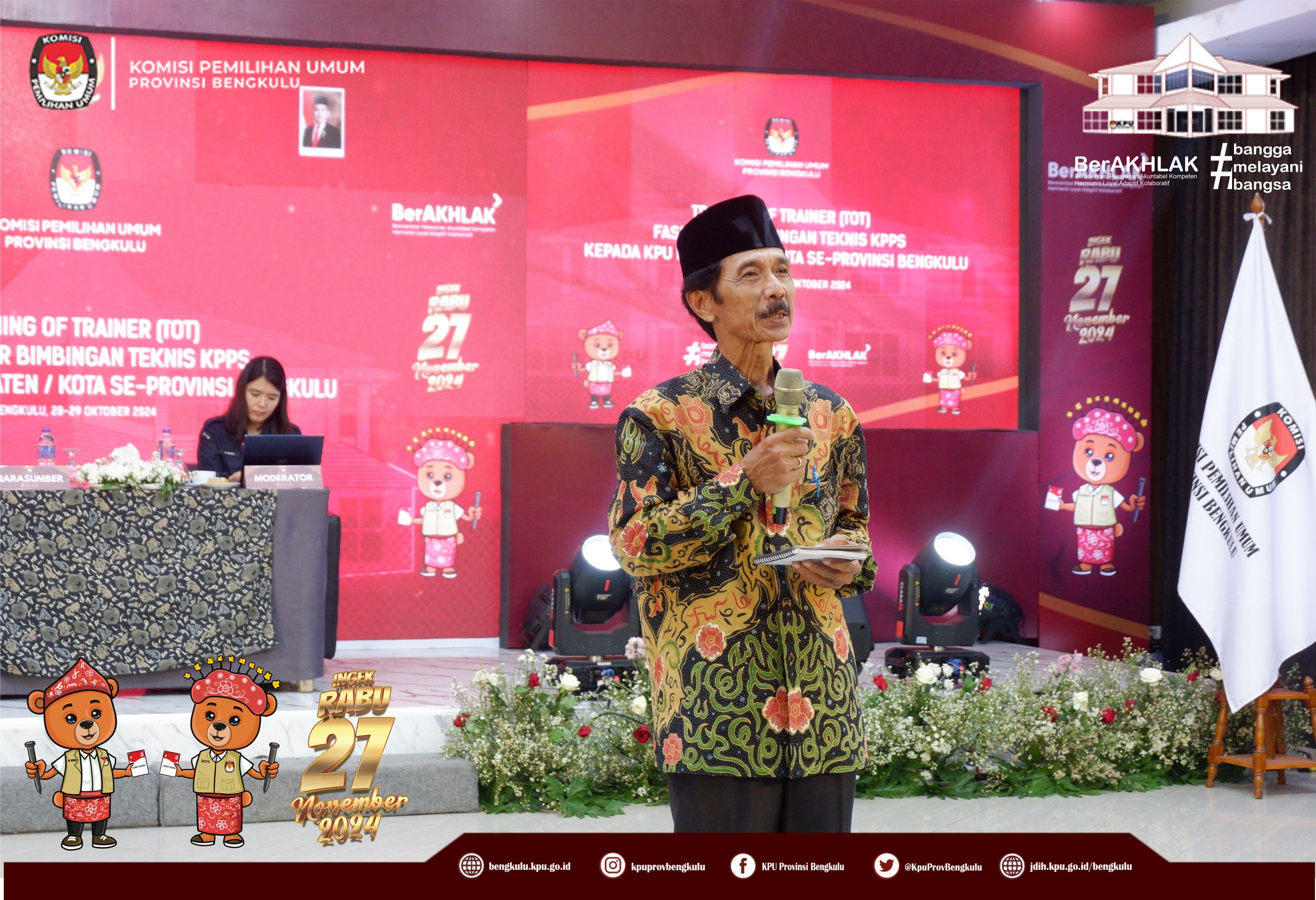 Bengkulu, bengkulu.kpu.go.id - Hari kedua, Selasa (29/10/2024) Kegiatan Training of Trainer Fasilitator Bimbingan Teknis Kepada KPU Kabupaten/Kota se-Provinsi Bengkulu dilanjutkan dengan pemaparan materi dari Narasumber Tenaga Ahli KPU RI Bapak Firnandes Maurisya yang menyampaikan materi Alur Kerja, Bahan Modul dan Buku Pintar KPPS dalam Training of Trainer dan Bimbingan Teknis KPPS, serta cara melakukan dan memberikan Bimbingan Teknis bagi KPPS, sedangkan Guru Besar FKIP Universitas Bengkulu Bapak Prof. Dr. Drs. Sarwit Sarwono menyampaikan materi terkait Metode Pelatiihan, Pembelajaran dan Pendidikan dalam Bimbingan Teknis bagi KPPS.