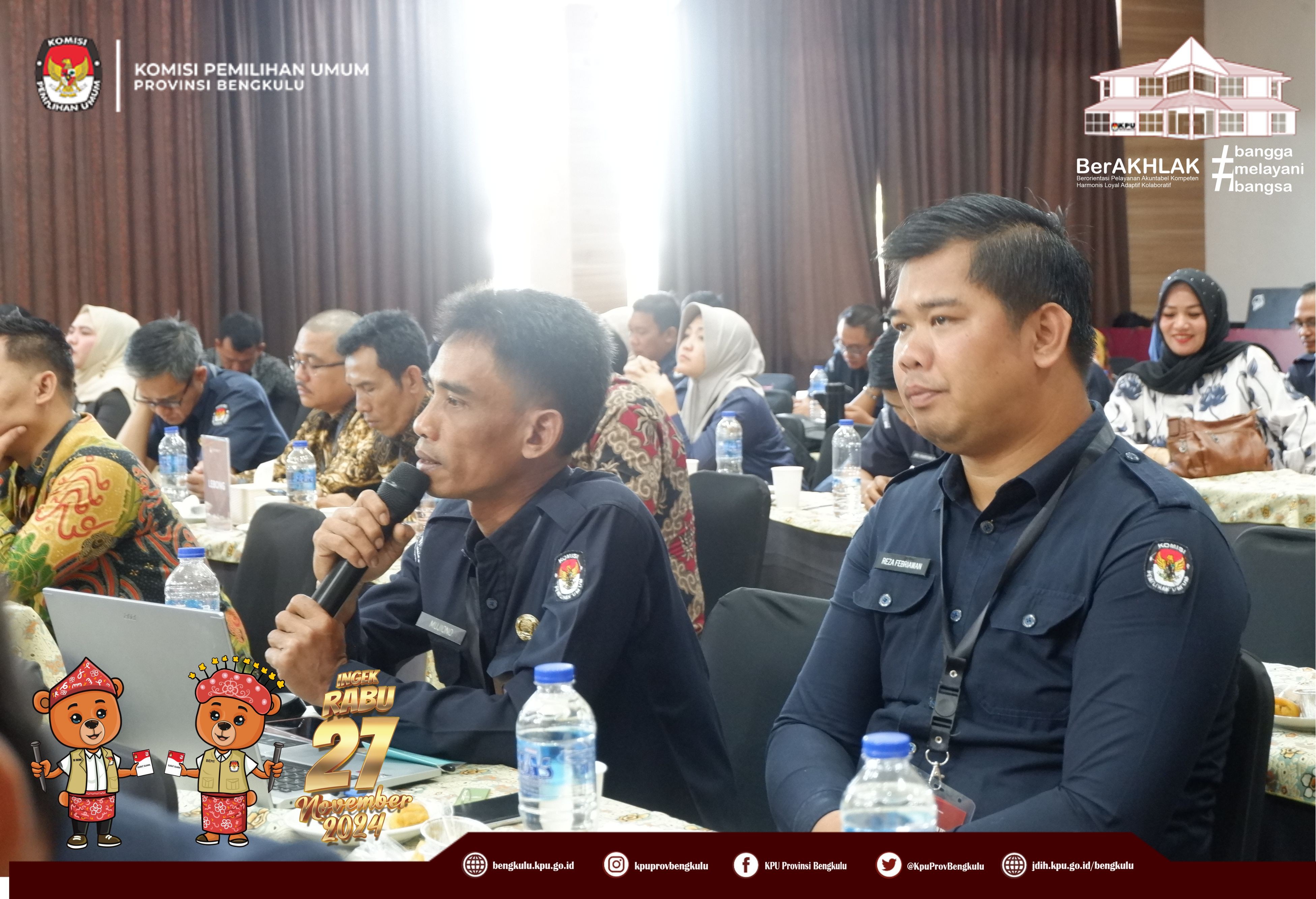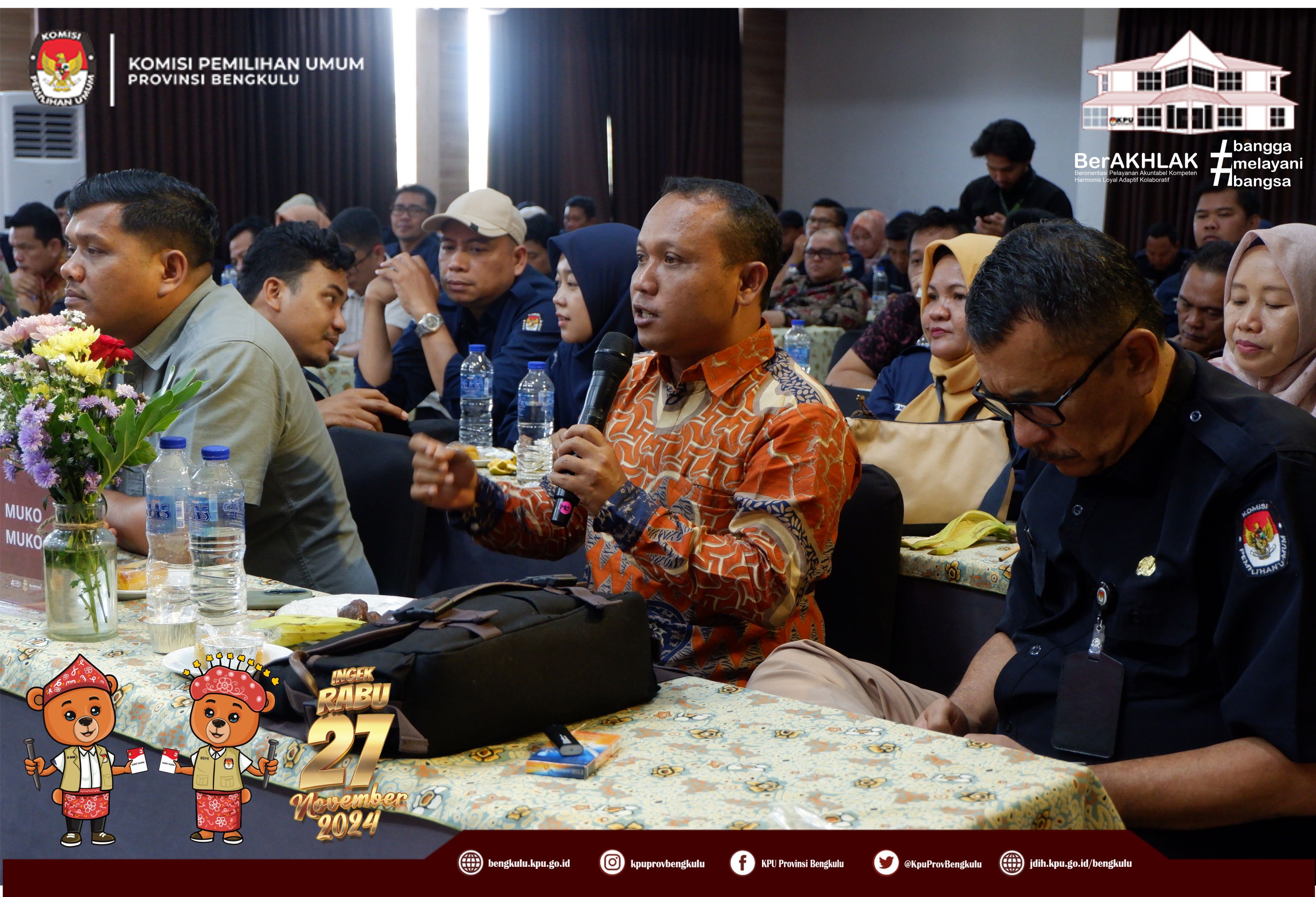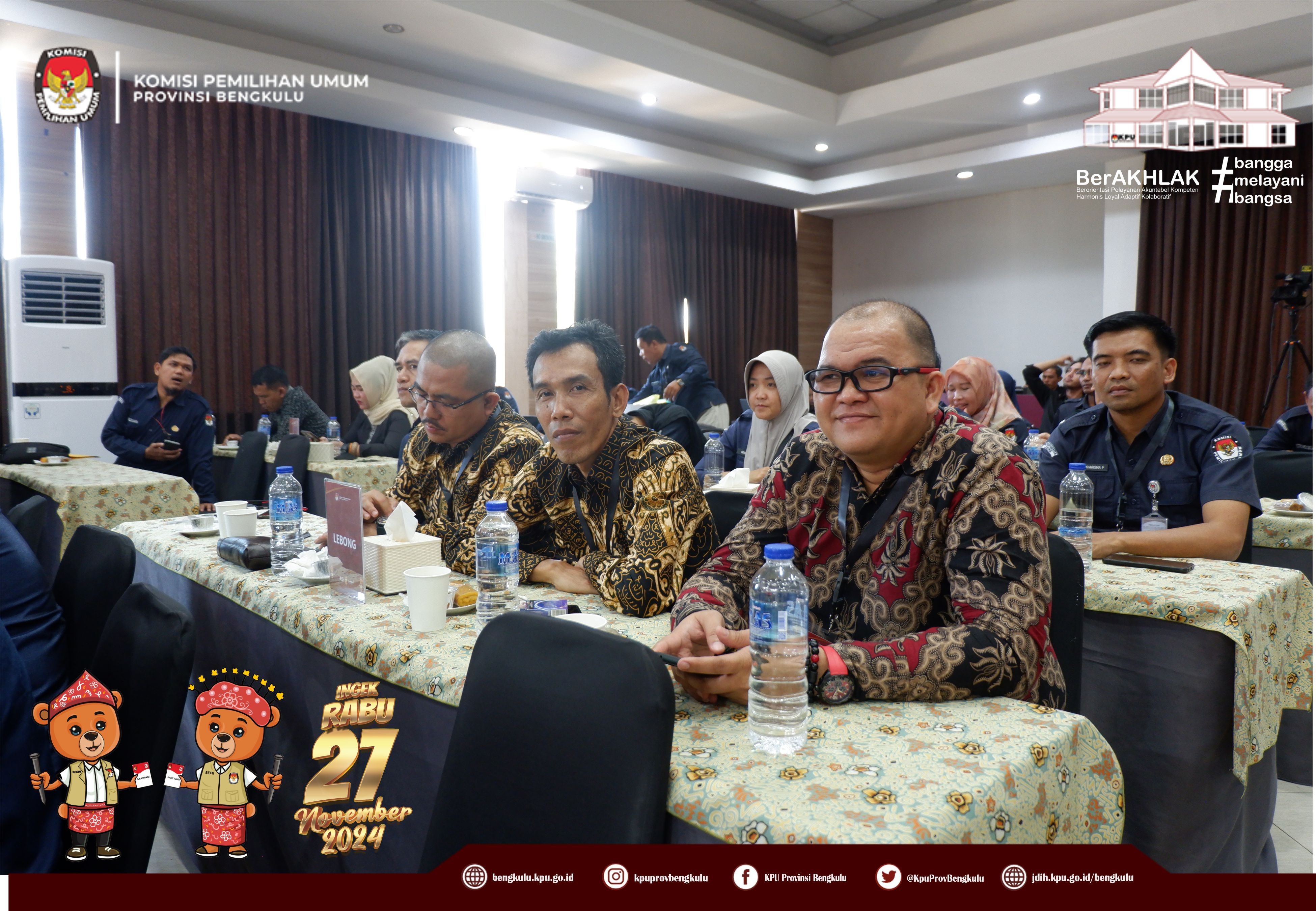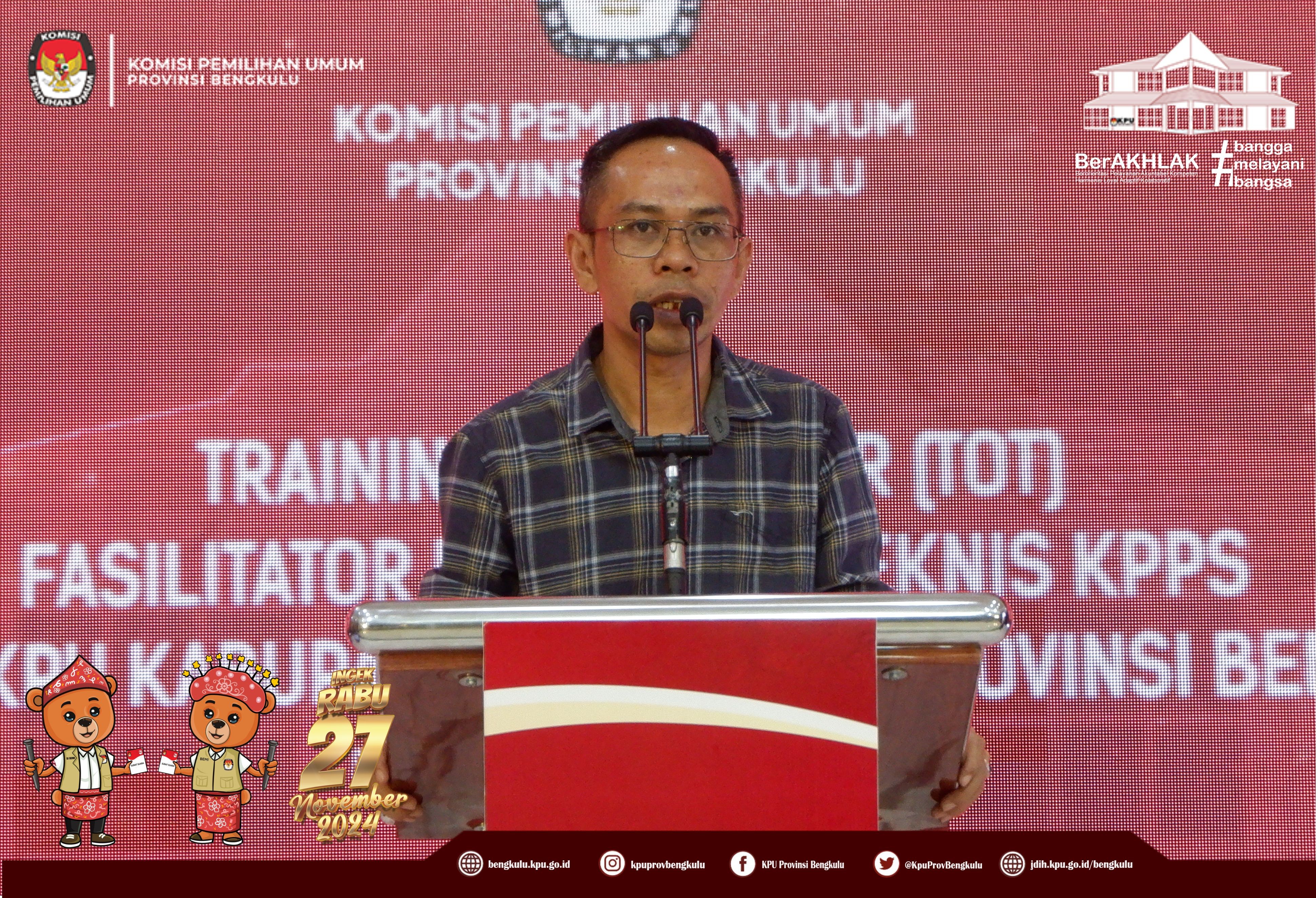 Bengkulu, bengkulu.kpu.go.id - Hari kedua, Selasa (29/10/2024) Kegiatan Training of Trainer Fasilitator Bimbingan Teknis Kepada KPU Kabupaten/Kota se-Provinsi Bengkulu dilanjutkan dengan pemaparan materi dari Narasumber Tenaga Ahli KPU RI Bapak Firnandes Maurisya yang menyampaikan materi Alur Kerja, Bahan Modul dan Buku Pintar KPPS dalam Training of Trainer dan Bimbingan Teknis KPPS, serta cara melakukan dan memberikan Bimbingan Teknis bagi KPPS, sedangkan Guru Besar FKIP Universitas Bengkulu Bapak Prof. Dr. Drs. Sarwit Sarwono menyampaikan materi terkait Metode Pelatiihan, Pembelajaran dan Pendidikan dalam Bimbingan Teknis bagi KPPS.