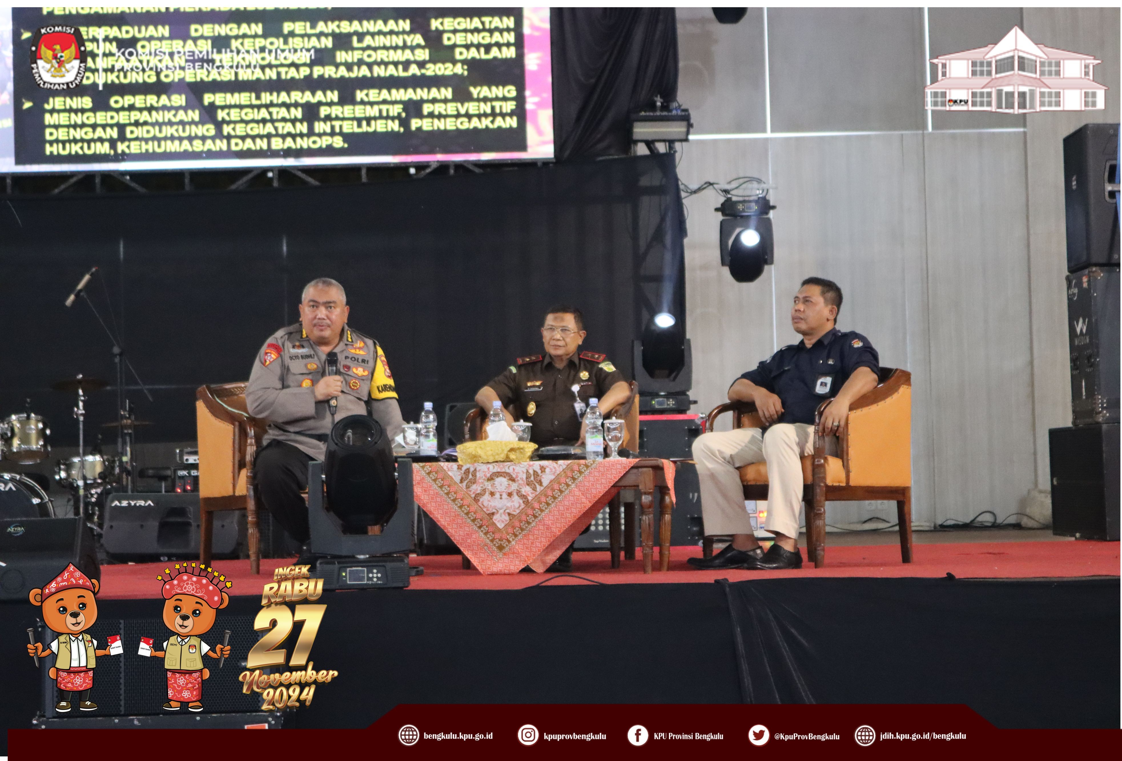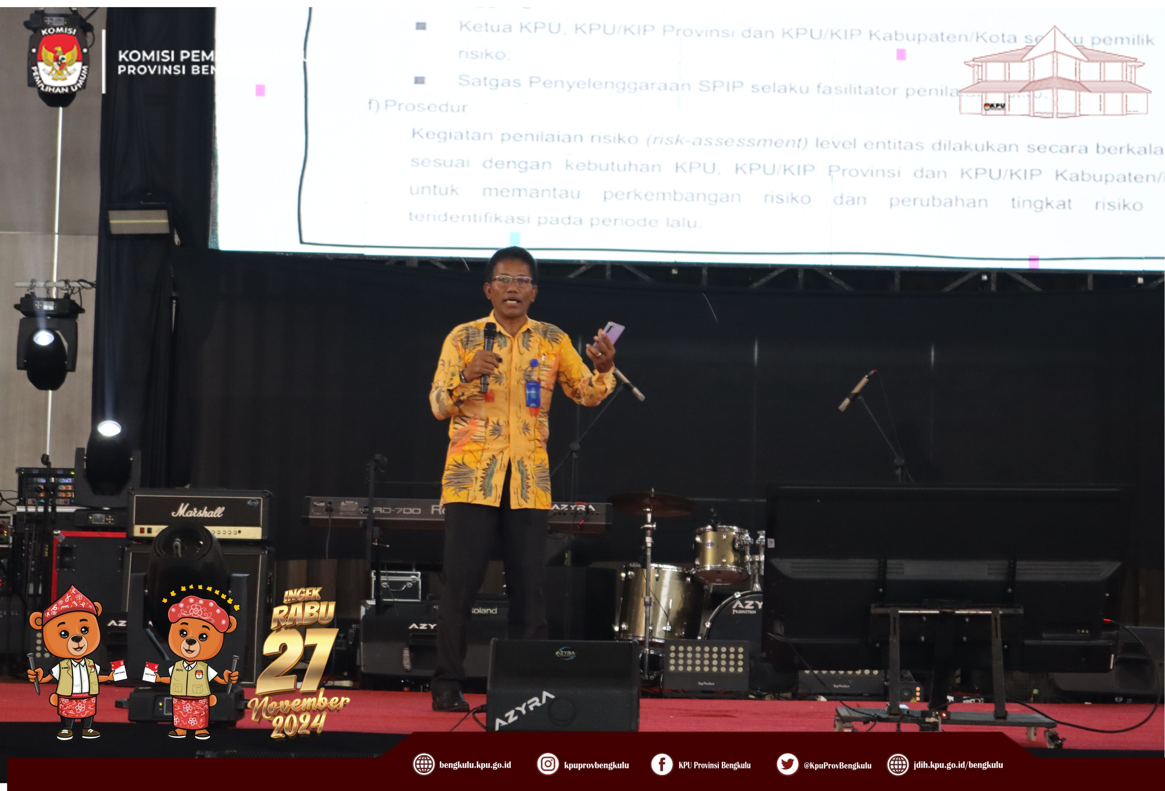 Bengkulu, bengkulu.kpu.go.id - Hari Kedua Selasa (13/8/2024) Konsolidasi Daerah KPU Provinsi dengan KPU Kabupaten/Kota, PPK dan PPS se-Provinsi Bengkulu dilanjutkan dengan pemaparan materi dari Anggota KPU Provinsi Bengkulu Bapak Alpin Samsen dan Bapak Sarjan Efendi, Kepala Kejaksaan Tinggi Bengkulu Bapak Syaifudin Tagamal, SH.,MH, Kepala Biro Operasi (Roops) Polda Bengkulu Bapak Kombes Pol. Octo Budhi Prasetyo S.IK, M.M, dan Koordinator Pengawasan Kelompok JFA Bidang Instansi Pemerintah Pusat BPKP Perwakilan Provinsi Bengkulu Bapak Muzakkir, SE., Ak., M.Bus (Acc), CA., CRGP, CRMP. Alpin menyampaikan ucapan terima kepada jajaran KPU Kabupaten/Kota, PPK dan PPS yang telah menetapkan Daftar Pemilih Sementara (DPS) dan menjelaskan mekanisme pemutakhiran data pemilih Pilkada 2024, Sarjan menegaskan agar seluruh penyelenggara pemilihan KPU Kabupaten/Kota, PPK dan PPS bekerja secara profesional, solid, dan berintegritas dalam melaksanakan tahapan pilkada 2024 secara baik sesuai dengan regulasi yang ada, Muzakkir menyampaikan materi SPIP dan Manajemen Risiko Pertanggungjawaban Keuangan, Syaifudin menjelaskan materi Pencegahan Korupsi dalam Pengelolaan Keuangan Negara Terkait Pengelolaan Anggaran Penyelenggaraan Pilkada 2024, dan Octo menjelaskan materi Kesiapan Polda Bengkulu dalam Pengamanan Pilkada Tahun 2024 di Wilayah Hukum Polda Bengkulu.