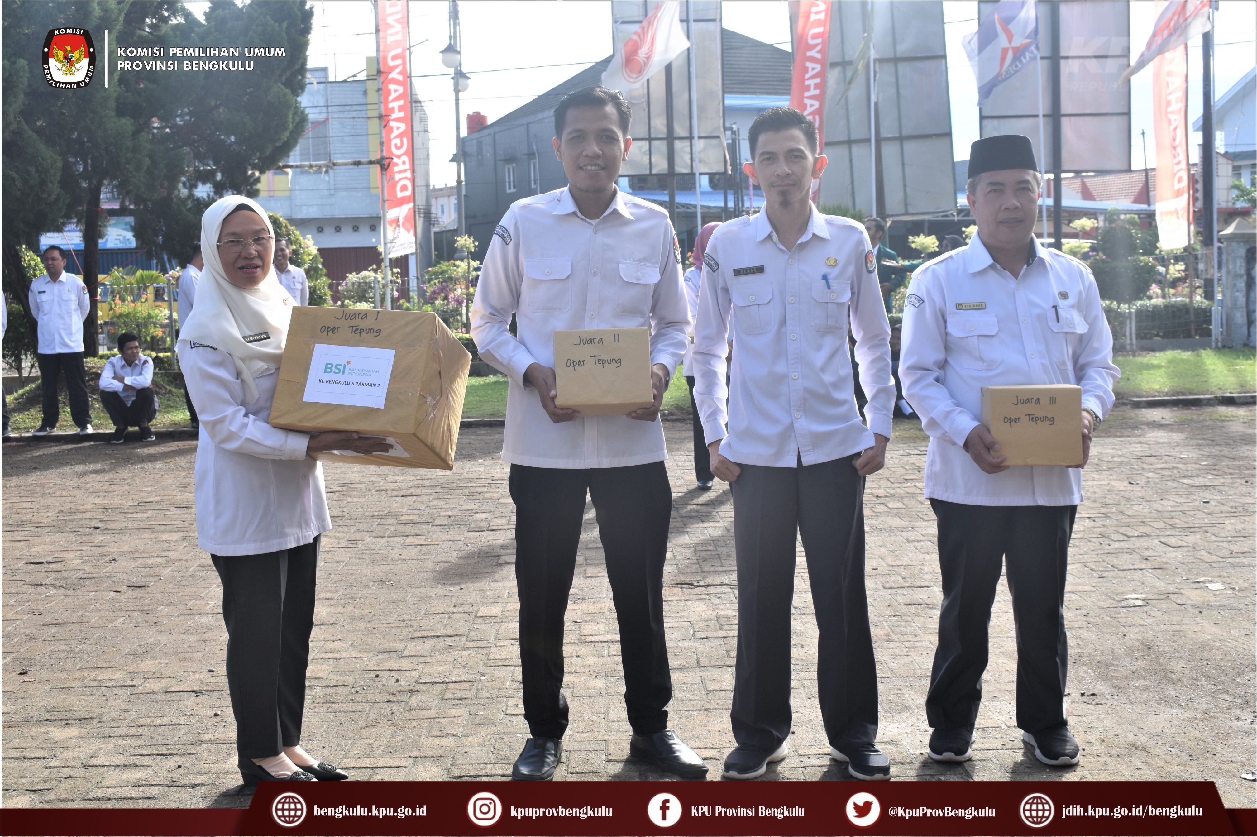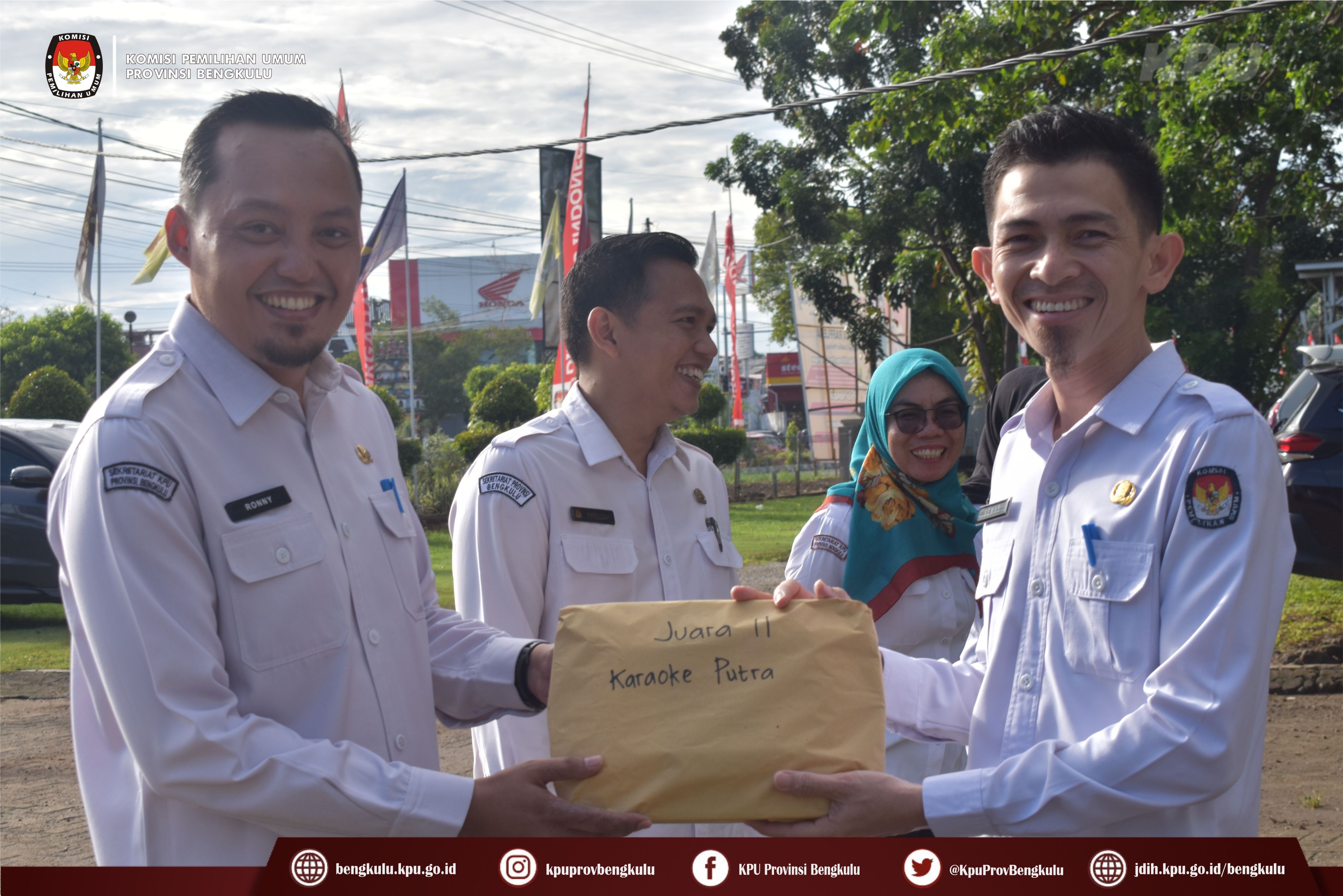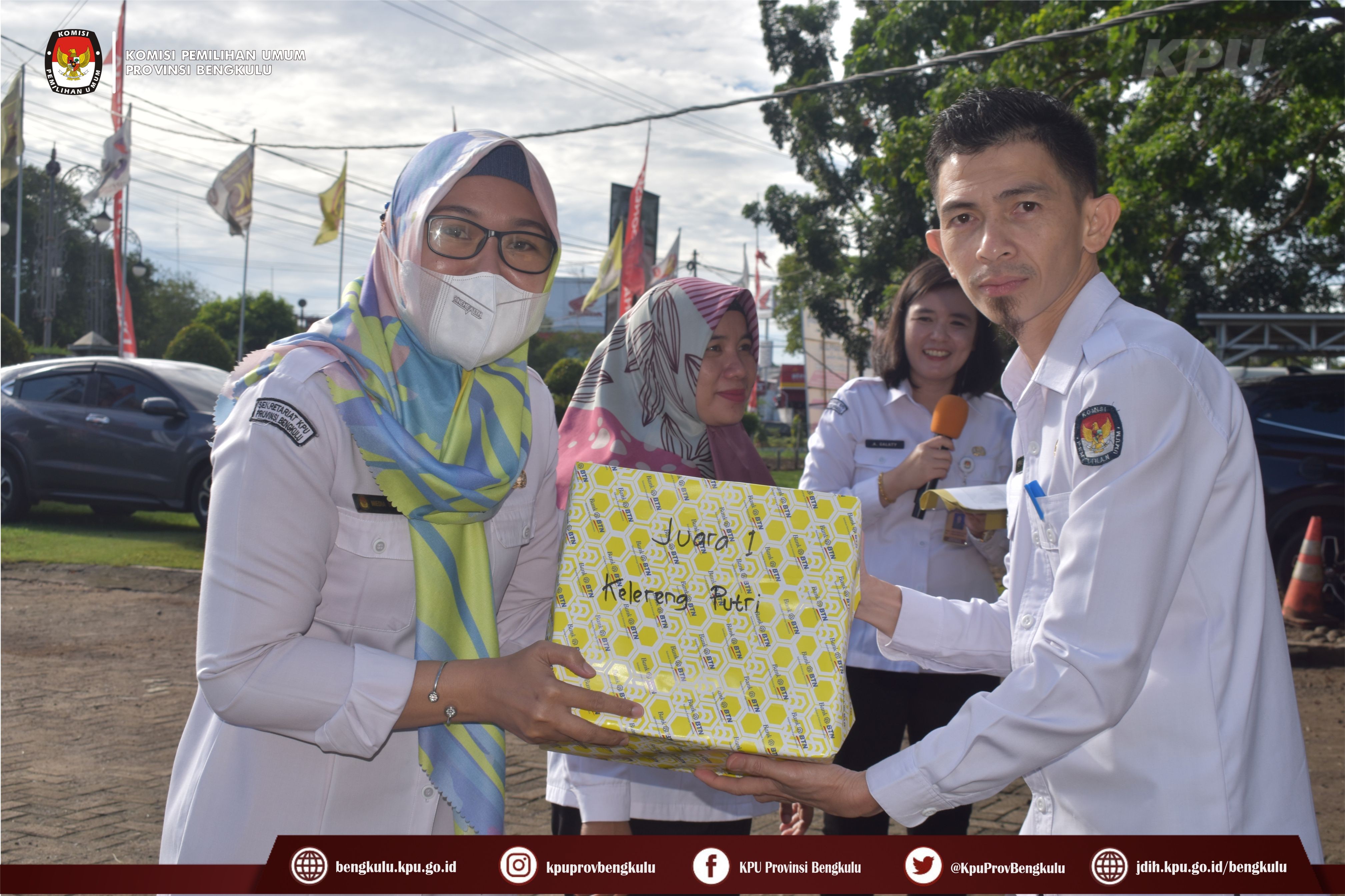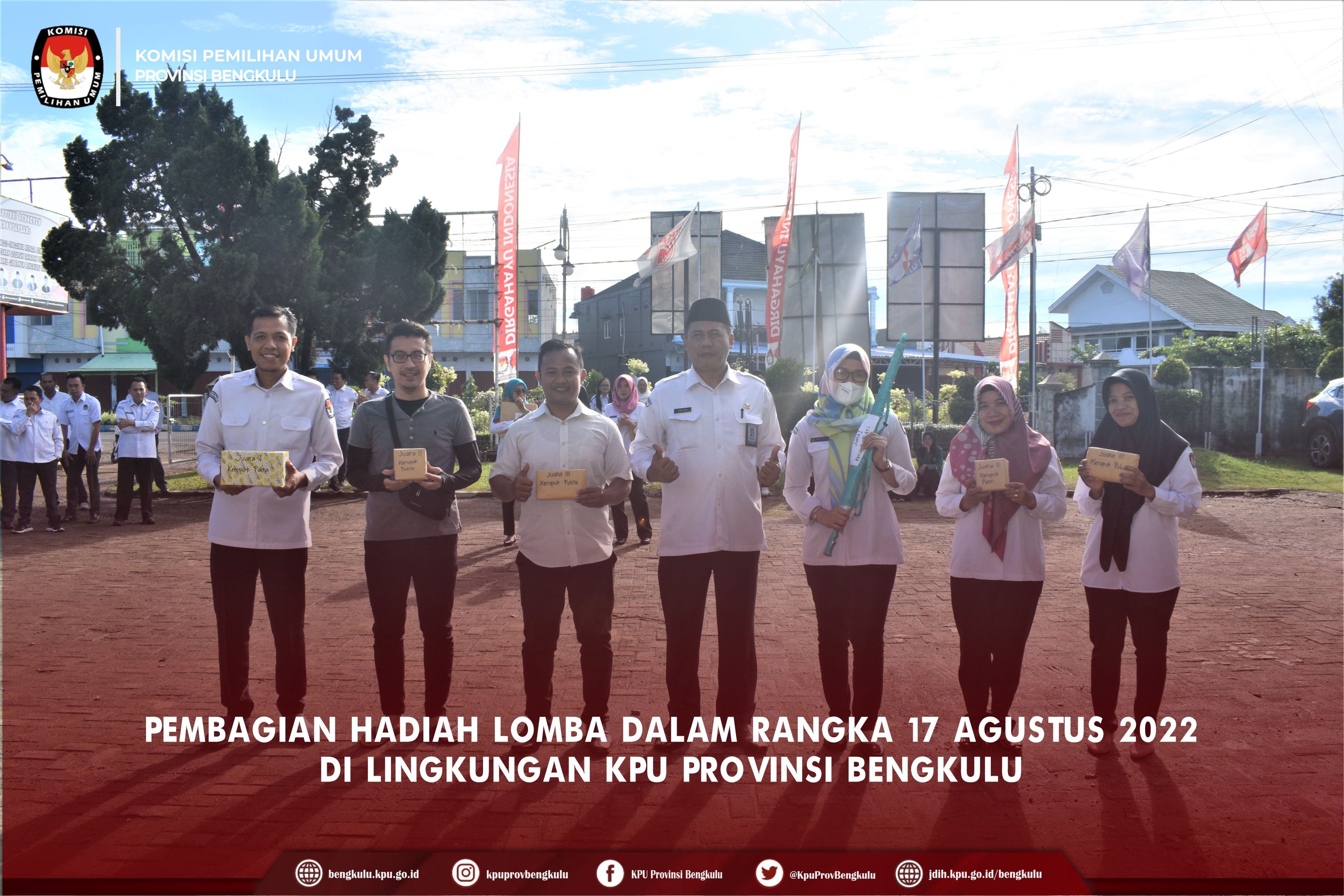 Bengkulu-bengkulu.kpu.go.id, Anggota KPU Provinsi Bengkulu Emex Verzoni dan Sekretaris Kemas Mohammad Ajir didampingi Kabag KUL Sudirman dan Kabag TPPPHHS Oktan Huzaeiry membagikan hadiah lomba dalam rangka memeriahkan Hari Ulang Tahun Republik Indonesia ke-77 di Lingkungan Sekretariat KPU Provinsi Bengkulu. Pembagian hadiah dilaksanakan di halaman Kantor KPU Provinsi Bengkulu, Senin (22/8). Adapun rincian hadiah lomba yang dibagikan adalah lomba kelereng dalam sendok, karaoke, joged balon, memasukkan paku dalam botol, balap karung, makan kerupuk, estafet tepung, dan memindahkan belut. Selamat kepada juara lomba semoga di tahun depan lebih meriah.