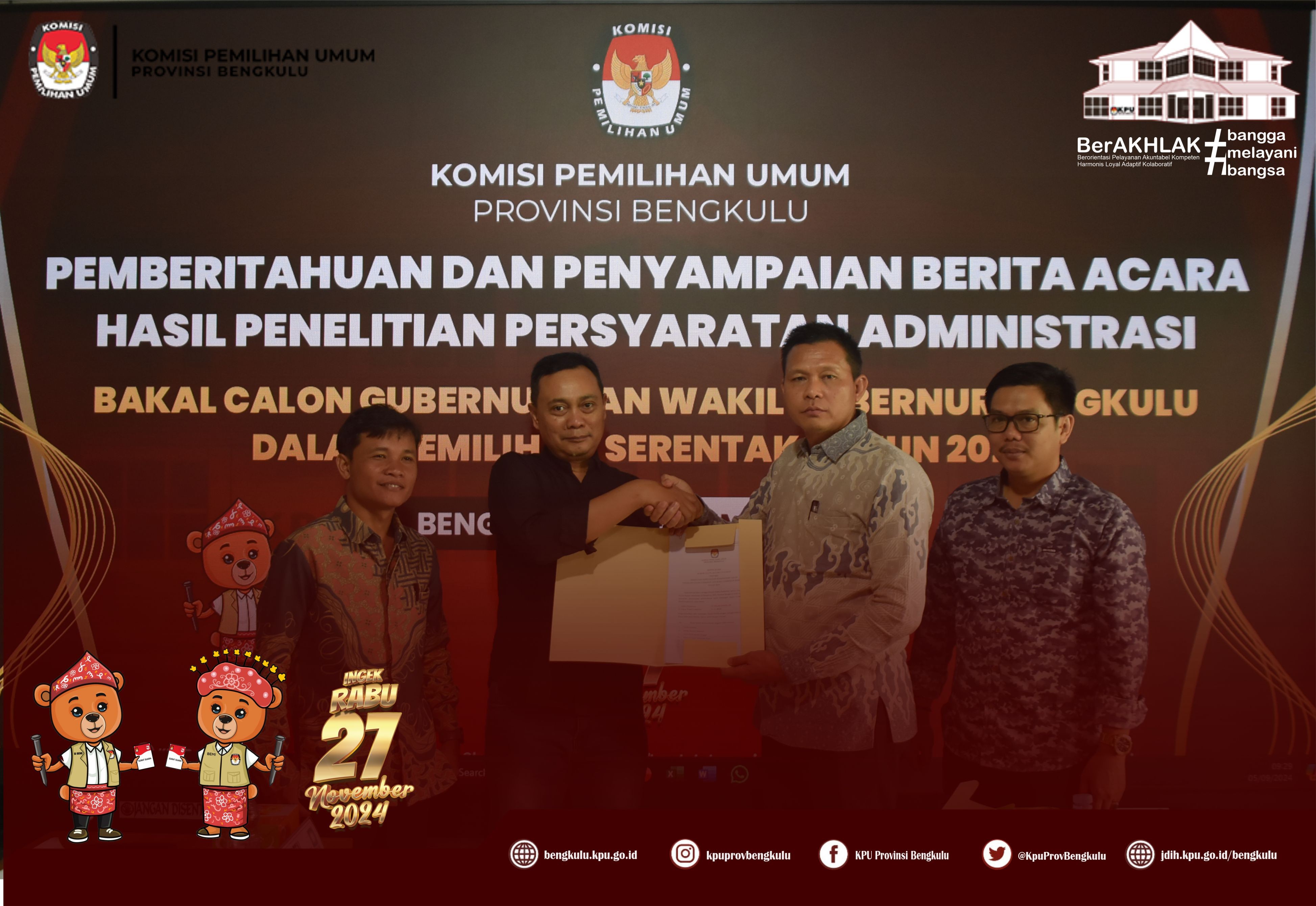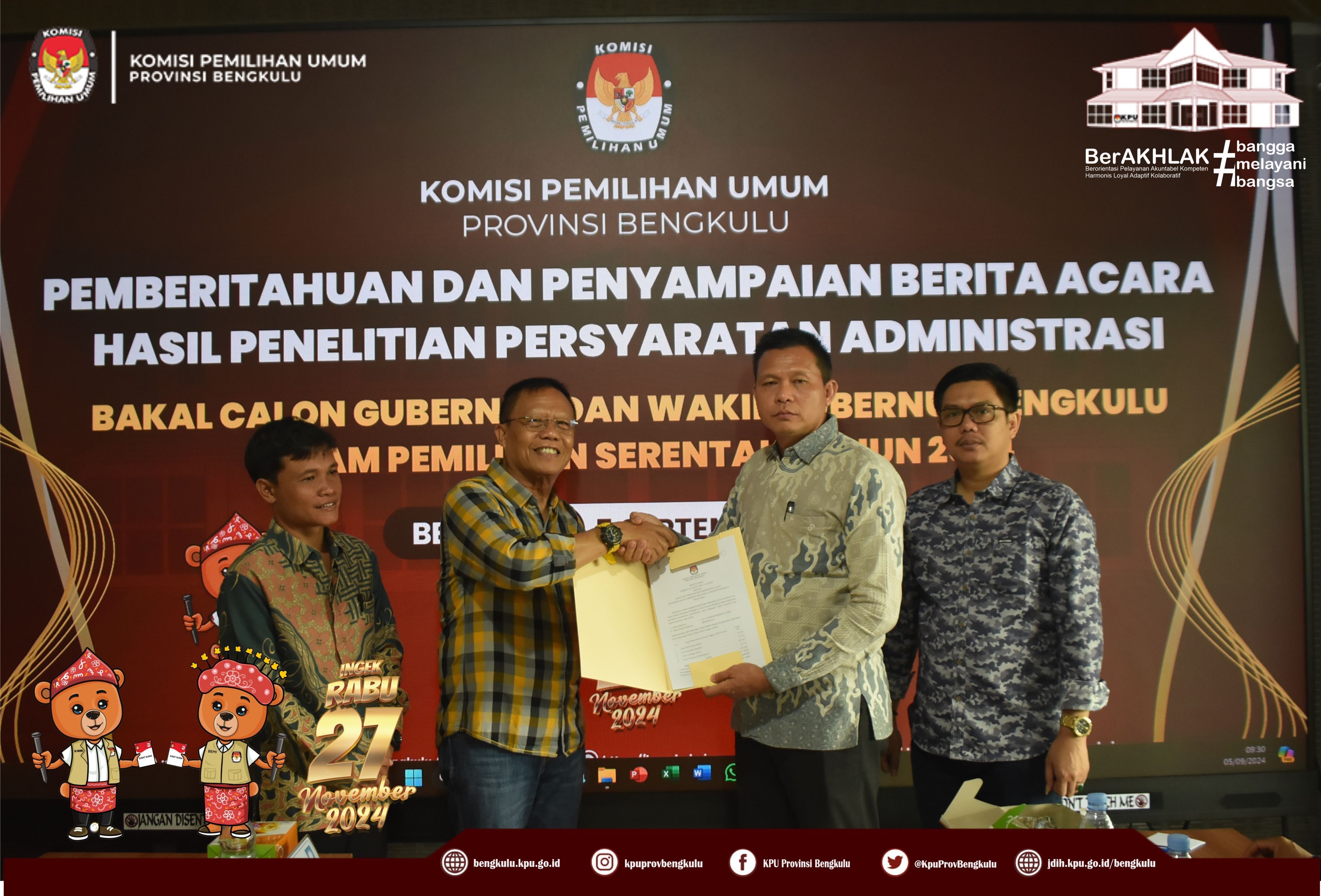Pemberitahuan dan Penyampaian Berita Acara Hasil Penelitian Persyaratan Administrasi Balon Gubernur dan Wakil Gubernur Bengkulu Dalam Pemlihan Serentak Tahun 2024