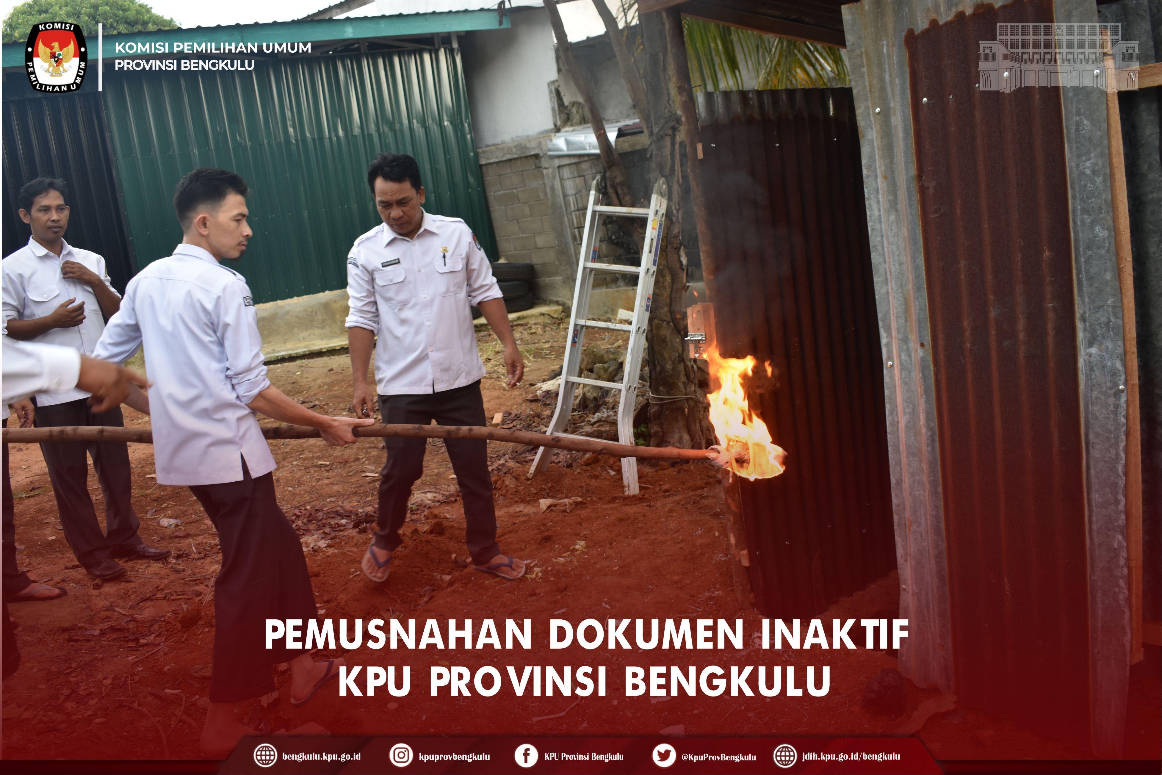 Bengkulu-bengkulu.kpu.go.id, Sekretaris KPU Provinsi Bengkulu Kemas Mohammad Ajir didampingi Kabag, Kasubbag dan Staf Sekretariat KPU Provinsi Bengkulu melaksanakan Pemusnahan Dokumen Inaktif di halaman belakang Kantor KPU Provinsi Bengkulu, Senin (15/8). Pemusnahan dokumen dilakukan dengan cara dibakar dan bertahap.