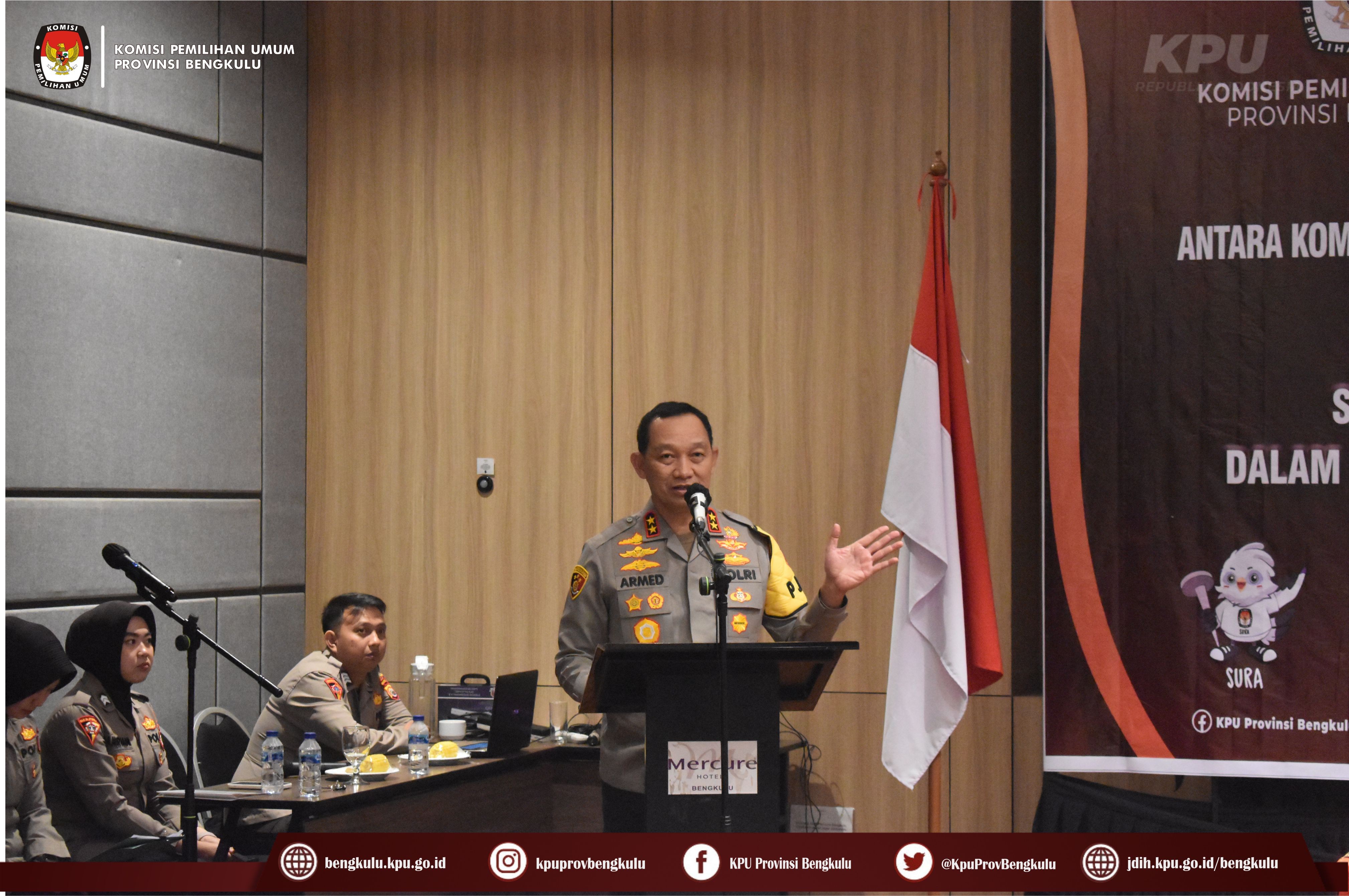 Acara dibuka dengan menyanyikan lagu Indonesia Raya, sambutan Ketua KPU Provinsi Bengkulu Irwan Saputra. Irwan menyampaikan bahwa perjanjian kerjasama ini dilakukan dalam rangka menjalin sinergitas yang telah terjalin baik selama ini dengan Polda bengkulu dan jajaran. Sementara itu, Kepala Kepolisian Daerah Bengkulu Armed Wijaya, MH. Menyampaikan pihaknya dan jajaran siap dalam pengamanan dan pengawalan terhadap pelaksanaan tahapan Pemilu Tahun 2024. Setelah itu dilanjutkan penandatangan perjanjian kerjasama, dan ditutup foto bersama.