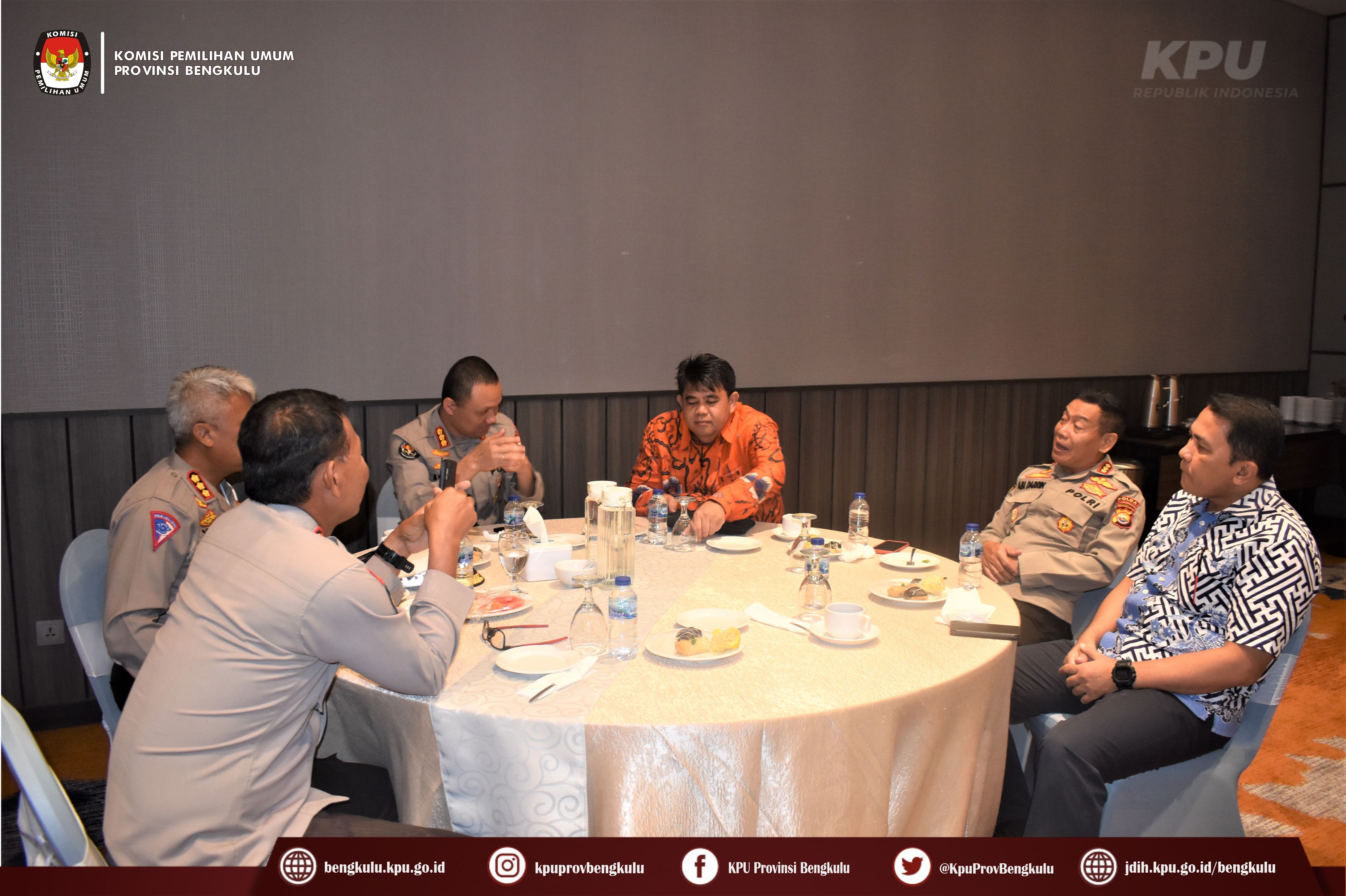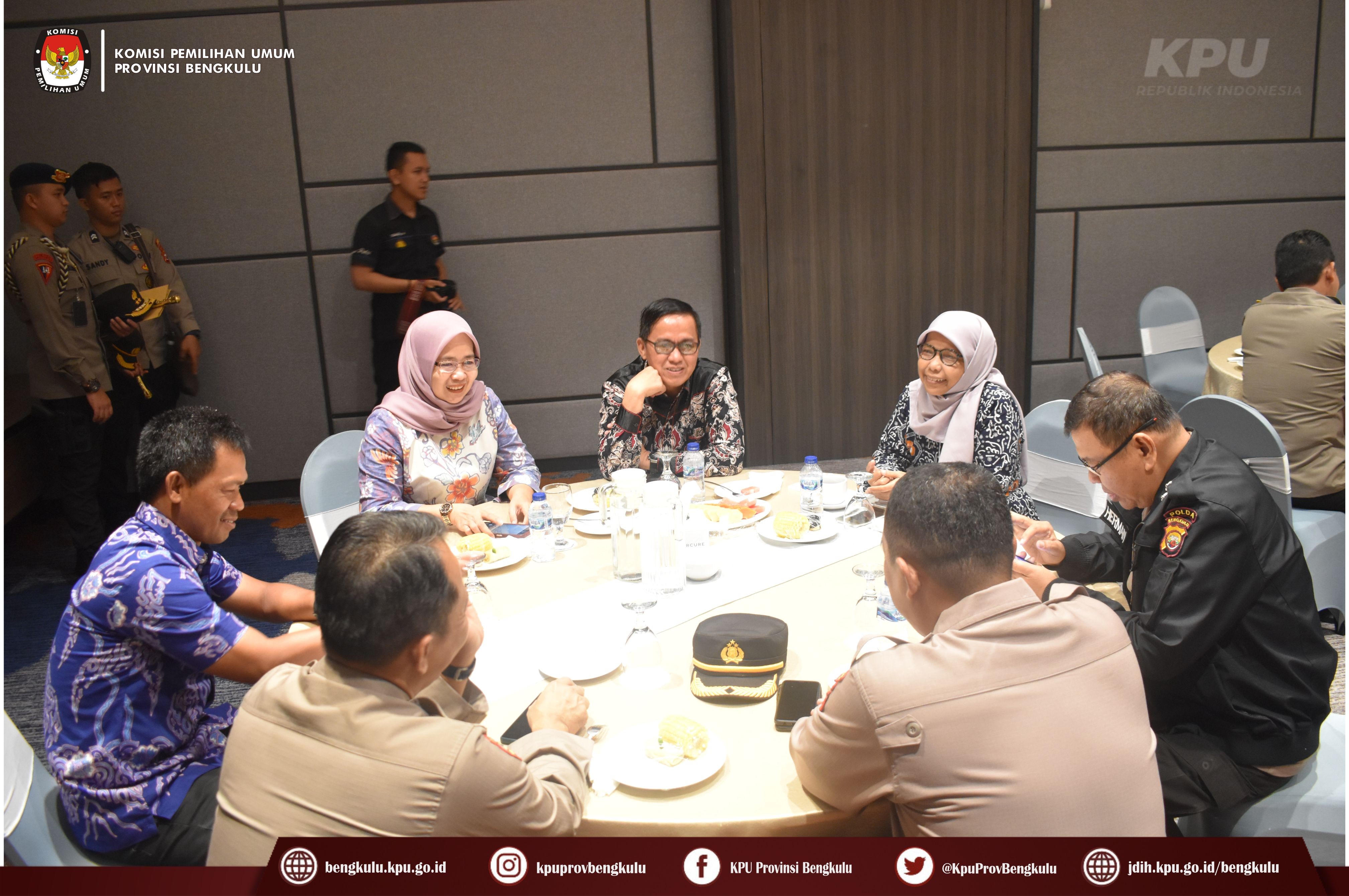 Bengkulu-bengkulu.kpu.go.id, Ketua KPU Provinsi Bengkulu Irwan Saputra bersama Anggota Siti Baroroh, Darlinsyah, Emex Verzoni dan Irna Riza Yuliastuty hadir dalam Penandatangan Perjanjian Kerjasama Antara KPU Provinsi Bengkulu dan Kepolisian Daerah Bengkulu bertempat di Hotel Mercure Bengkulu, Jum’at (17/2/2023). Hadir dalam kegiatan adalah Kepala Kepolisian Daerah Bengkulu Armed Wijaya, MH dan jajarannya, Ketua KPU Kabupaten/Kota se-Provinsi Bengkulu.