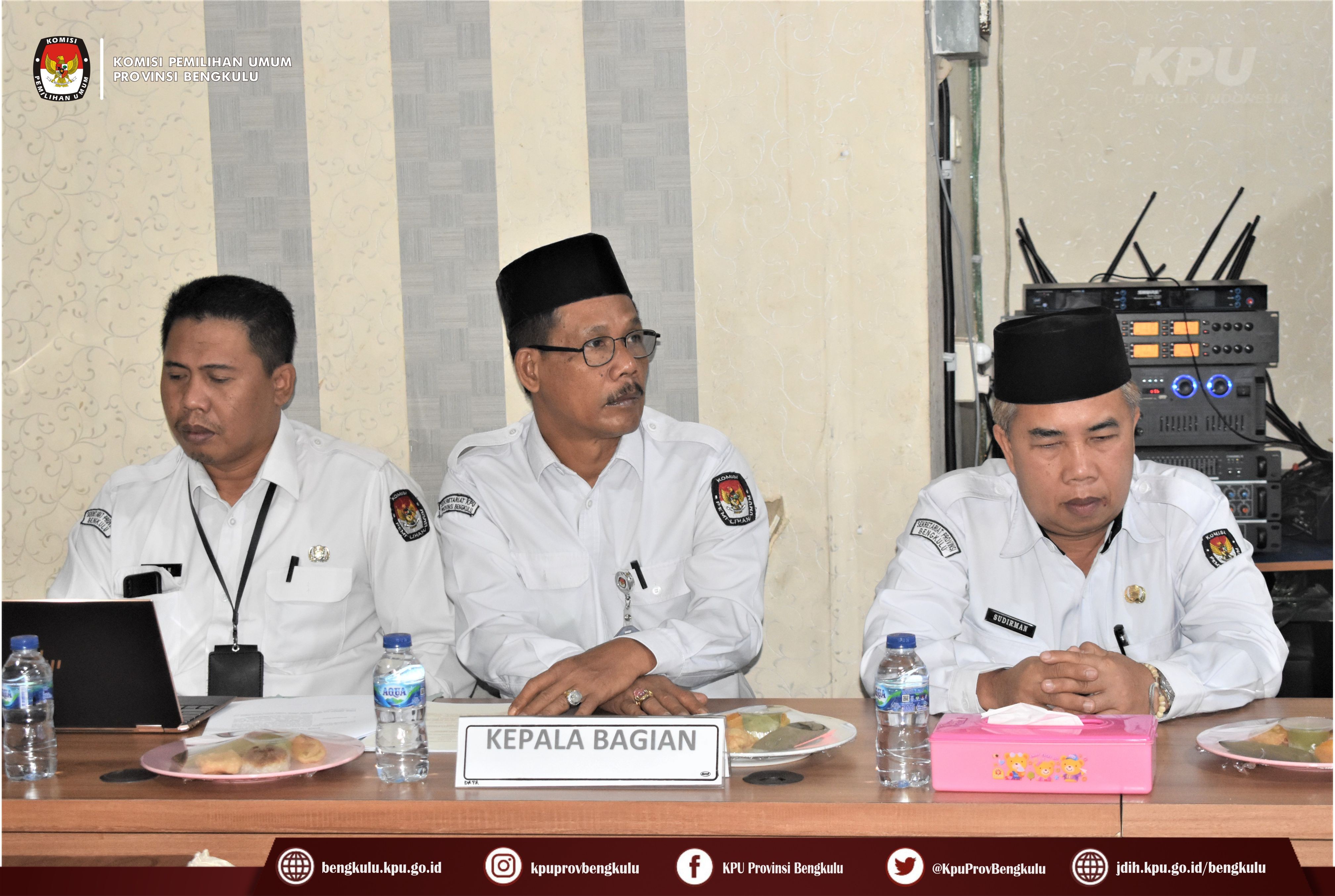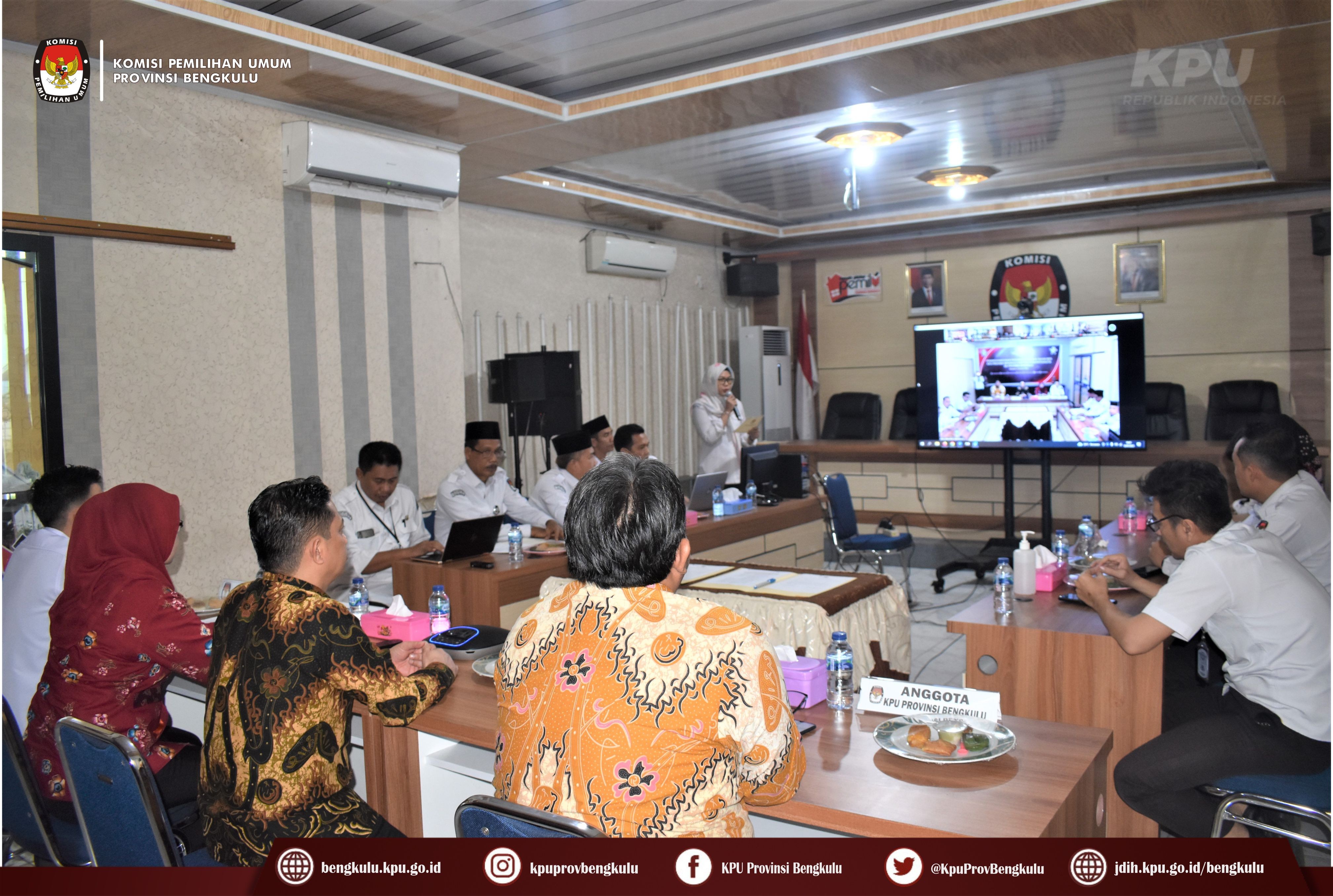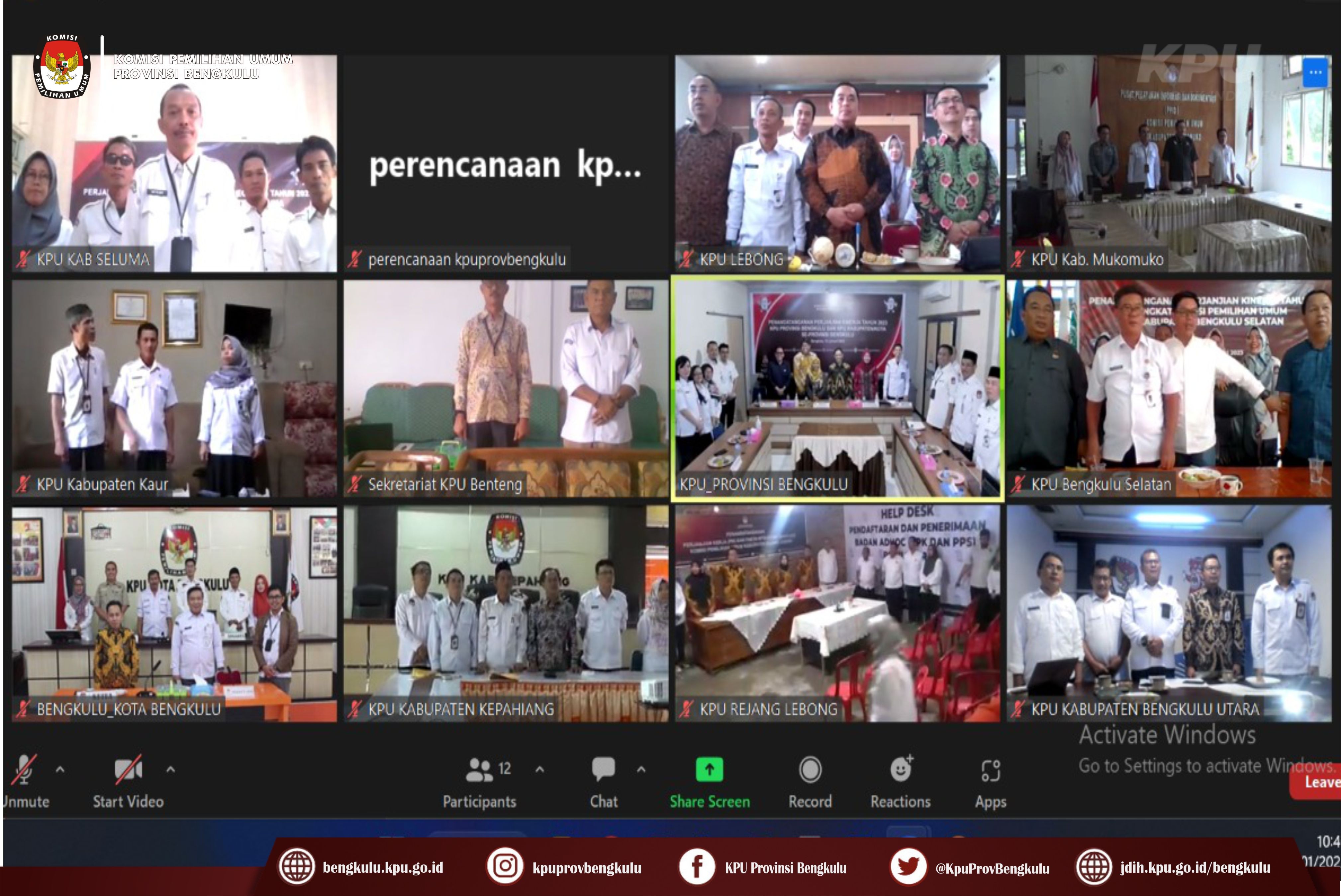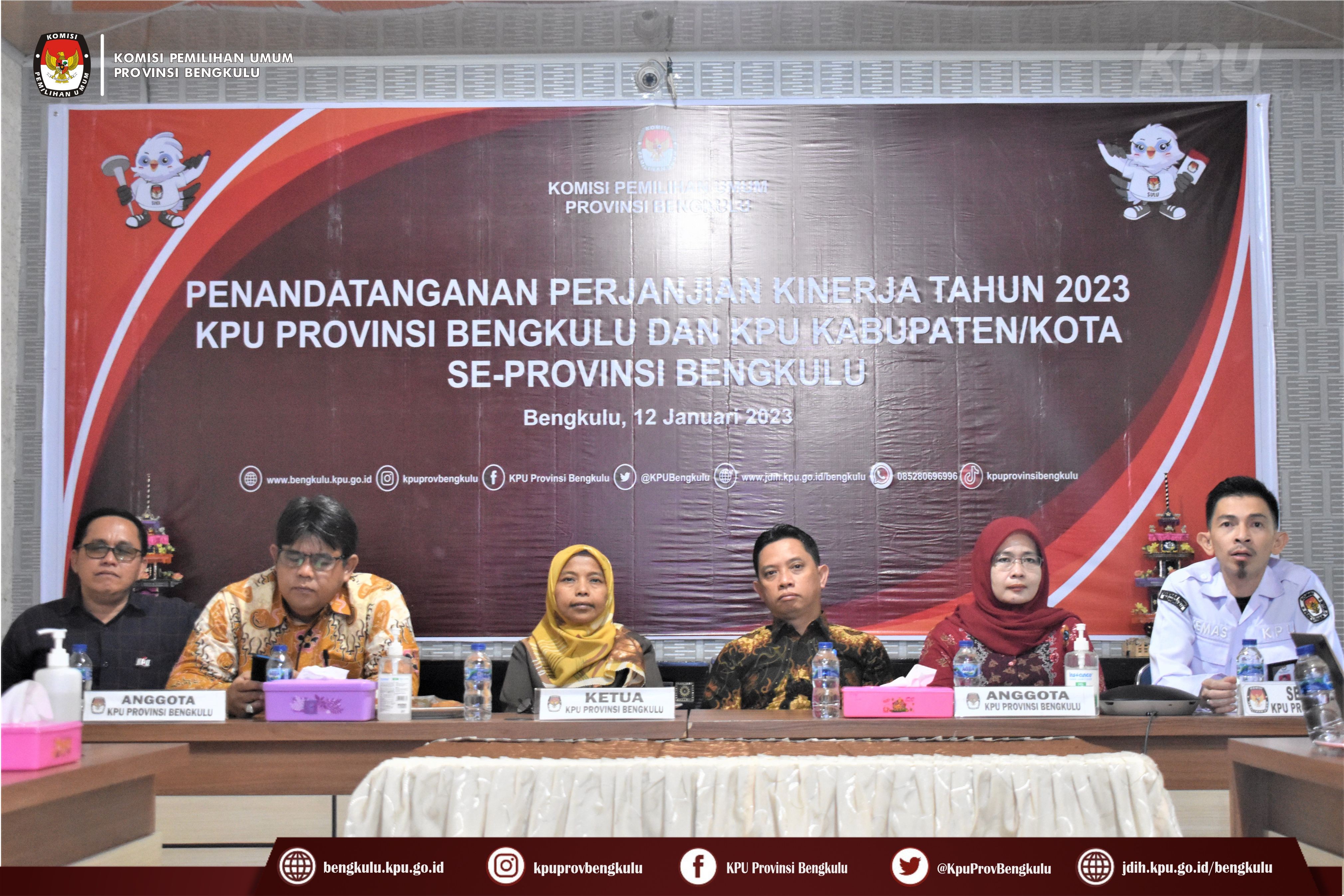 Bengkulu-bengkulu.kpu.go.id, Ketua KPU Provinsi Bengkulu Irwan Saputra bersama Anggota KPU Provinsi Bengkulu Siti Baroroh, Darlinsyah, Emex Verzoni, dan Irna Riza Yuliastuty serta Sekretaris Kemas Mohammad Ajir, Kabag dan Kasubbag membuka acara Penandatangan Perjanjian Kinerja Tahun 2023 KPU Provinsi dan KPU Kabupaten/Kota se-Provinsi Bengkulu yang dilaksanakan secara daring (zoom meeting) pada Kamis (12/1). Kegiatan tersebut diikuti Ketua, Anggota, Sekretaris, dan Kasubbag KPU Kabupaten/Kota se-Provinsi Bengkulu. Acara berjalan khidmat dan lancar ini dibuka dengan menyanyikan lagu kebangsaan Indonesia Raya, pembacaan doa, arahan Ketua dan Sekretaris KPU Provinsi Bengkulu. Irwan menyampaikan pelaksanaan penandatanganan perjanjian kinerja hari ini sangat bermakna mempengaruhi sejauh mana pencapaian yang menjadi visi misi KPU akan dievaluasi bisa menjadi gambaran terkait kinerja kita. Sementara itu, Kemas menjelaskan bahwa pelaksanaan perjanjian kinerja ini sesuai dengan PermenPANRB Nomor 53 Tahun 2014 dan Keputusan KPU 5/PR.03-1-Kpt/03/KPU/I/2018 mempunyai tujuan sebagai wujud nyata komitmen antara penerima dan pemberi amanah untuk meningkatkan integritas, akuntabilitas, transparansi dan kinerja aparatur, menciptakan tolak ukur kinerja sebagai dasar evaluasi kinerja aparatur, sebagai dasar penilaian keberhasilan/kegagalan pencapaian tujuan dan sasaran organisasi dan sebagai dasar pemberian penghargaan dan sanksi, sebagai dasar bagi pemberi amanah untuk melakukan monitoring, evaluasi dan supervisi atas perkembanga/kemajuan kinerja penerima amanah dan sebagai dasar dalam penetapan sasaran kinerja pegawai. Untuk itu, Kemas berharap kepada seluruh jajaran sekretariat KPU Provinsi dan KPU Kabupaten/Kota untuk meningkatkan kinerja.