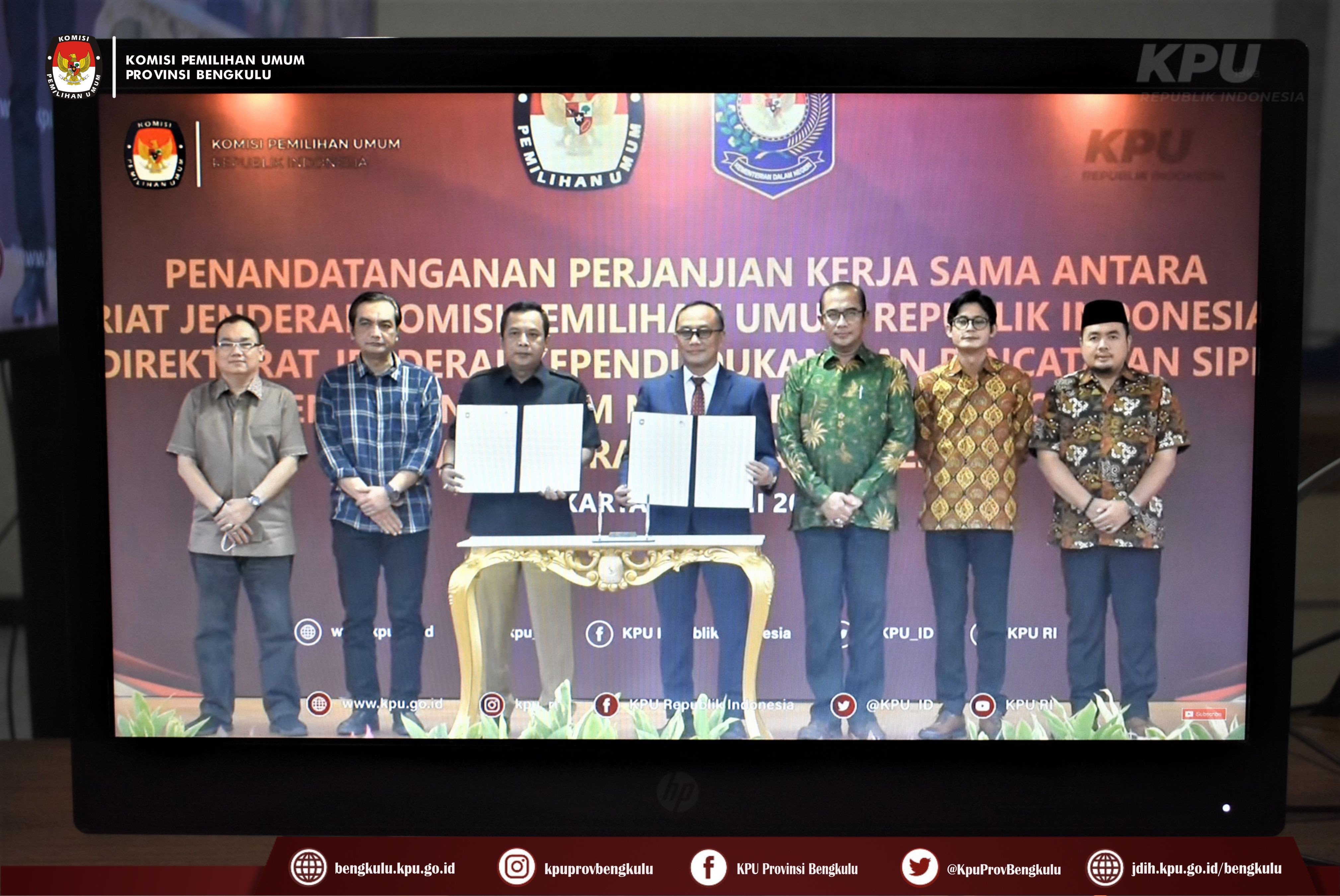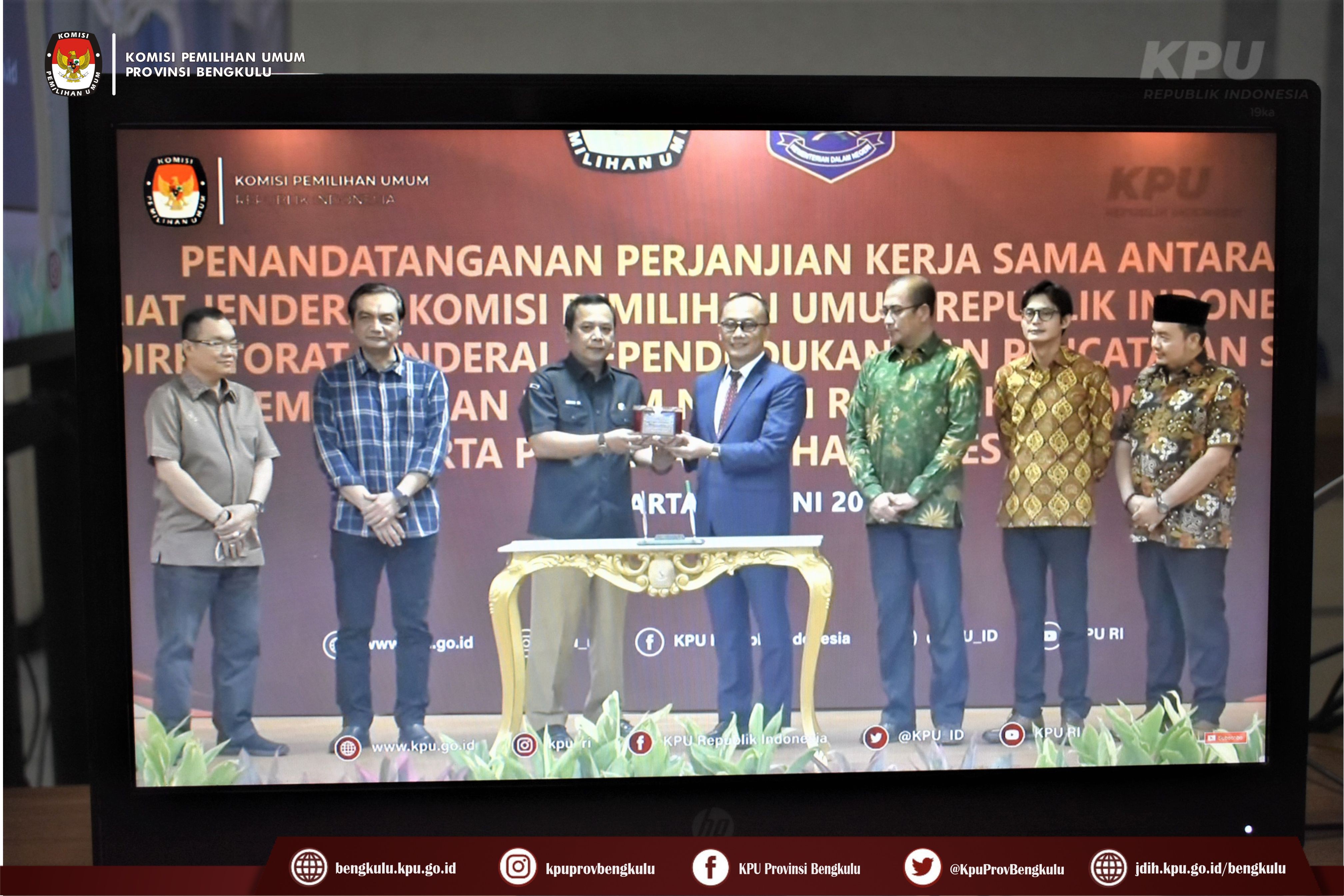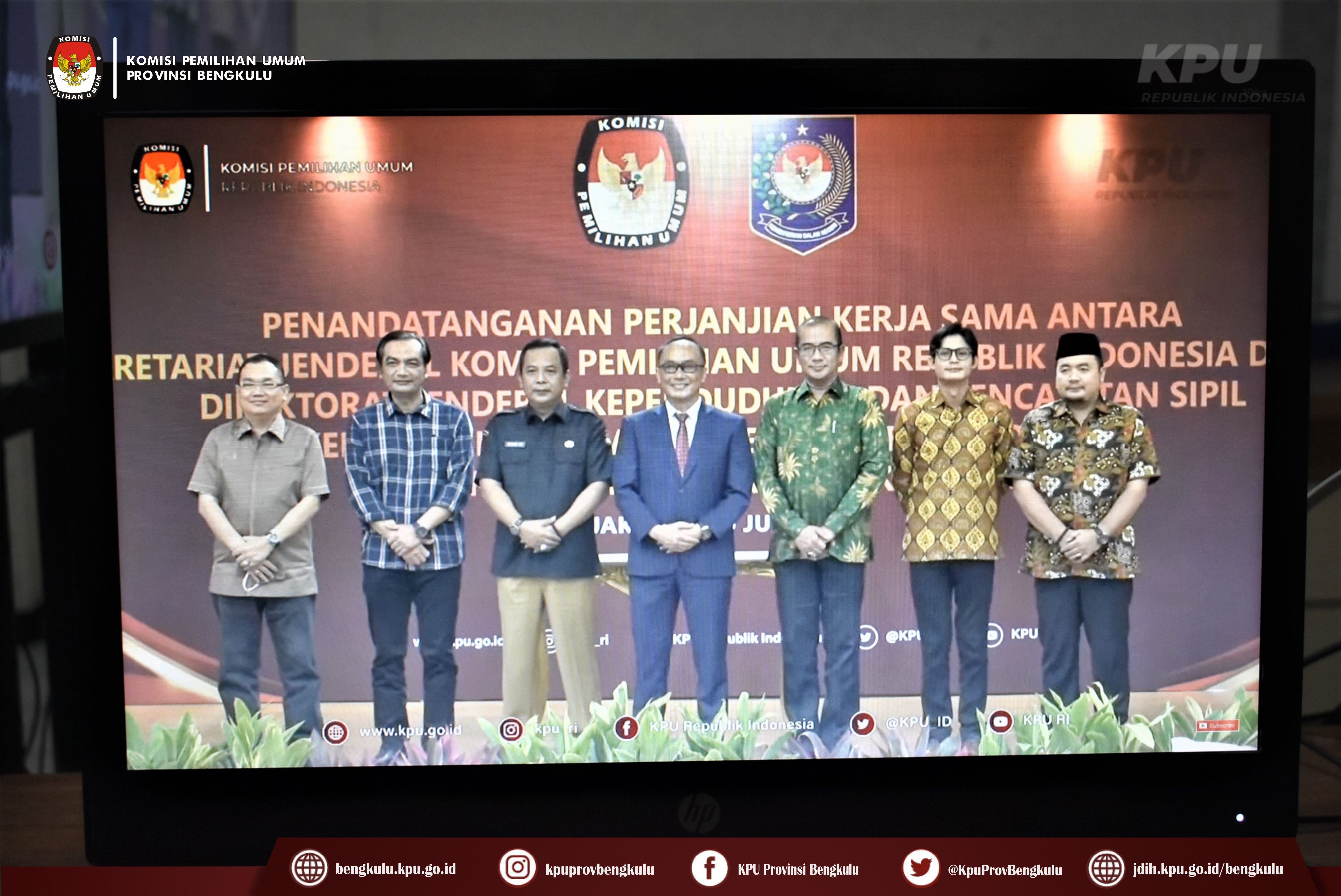 Bengkulu-bengkulu.kpu.go.id, Ketua KPU Provinsi Bengkulu Irwan Saputra bersama Anggota Siti Baroroh, Sekretaris Kemas M Ajir dan Kasubbag Data dan Informasi Yunita Dika Fitri mengikuti Penandatanganan Perjanjian Kerjasama Antara Setjen KPU RI dengan Dirjen Dukcapil Kemendagri secara daring melalui live streaming youtube KPU RI, Rabu (29/6). Penandatanganan kerjasama ini dilakukan oleh Sekretaris Jenderal KPU RI Bernad Dermawan Sutrisno dan Dirjen Dukcapil Kemendagri Zudan Arif Fakrulloh disaksikan Ketua KPU RI Hasyim Asy'ari dan Anggota KPU RI Yulianto Sudrajat, Parsadaan Harahap, August Mellaz, dan M. Afifuddin. Setelah penandatanganan acara dilanjutkan dengan sambutan Dirjen Dukcapil Kemendagri Zudan Arif Fakrulloh dan Ketua KPU RI Hasyim Asy'ari.