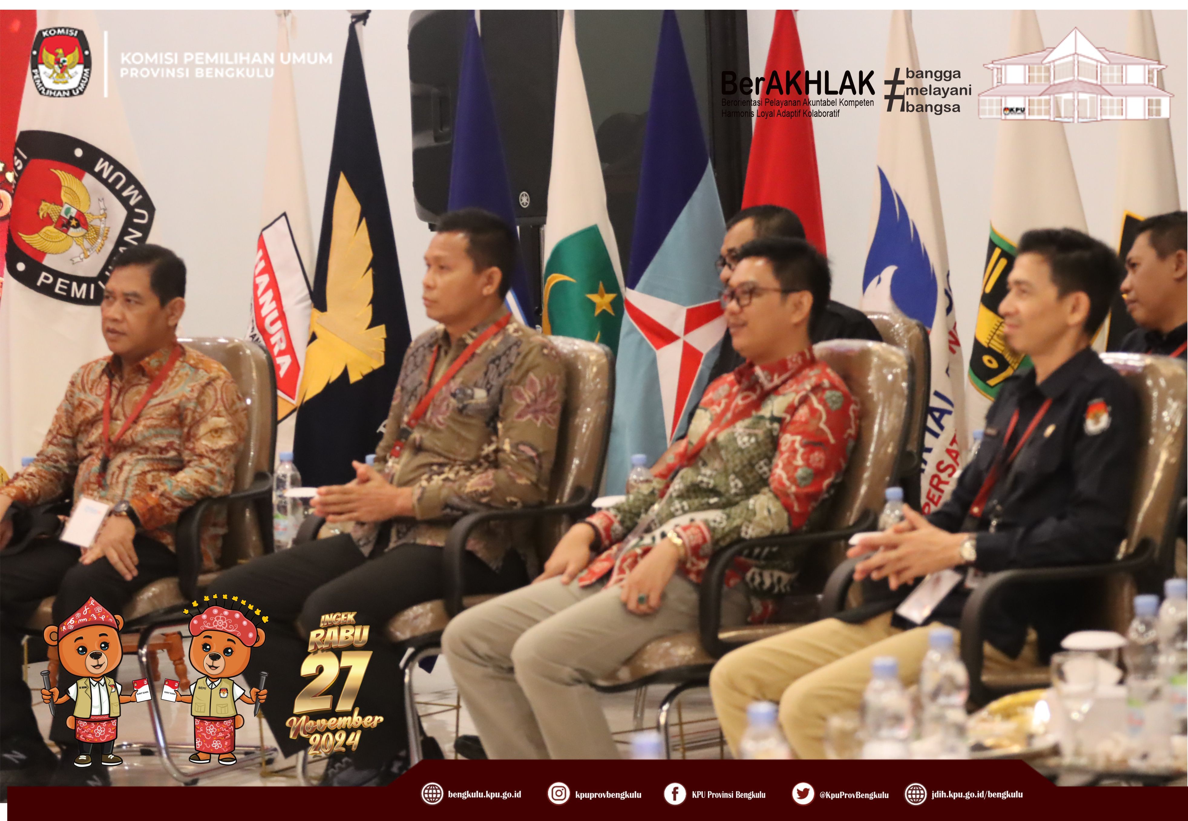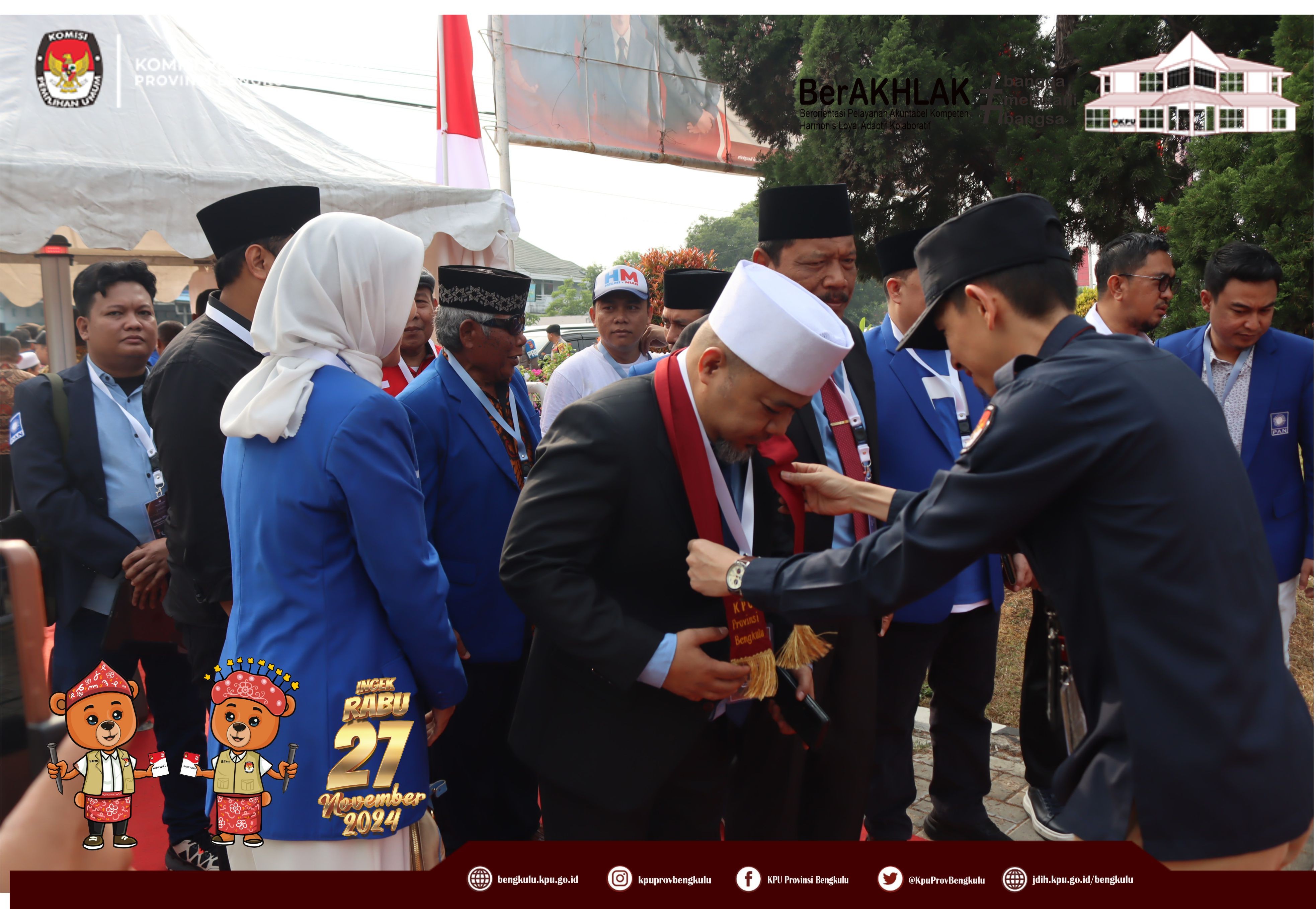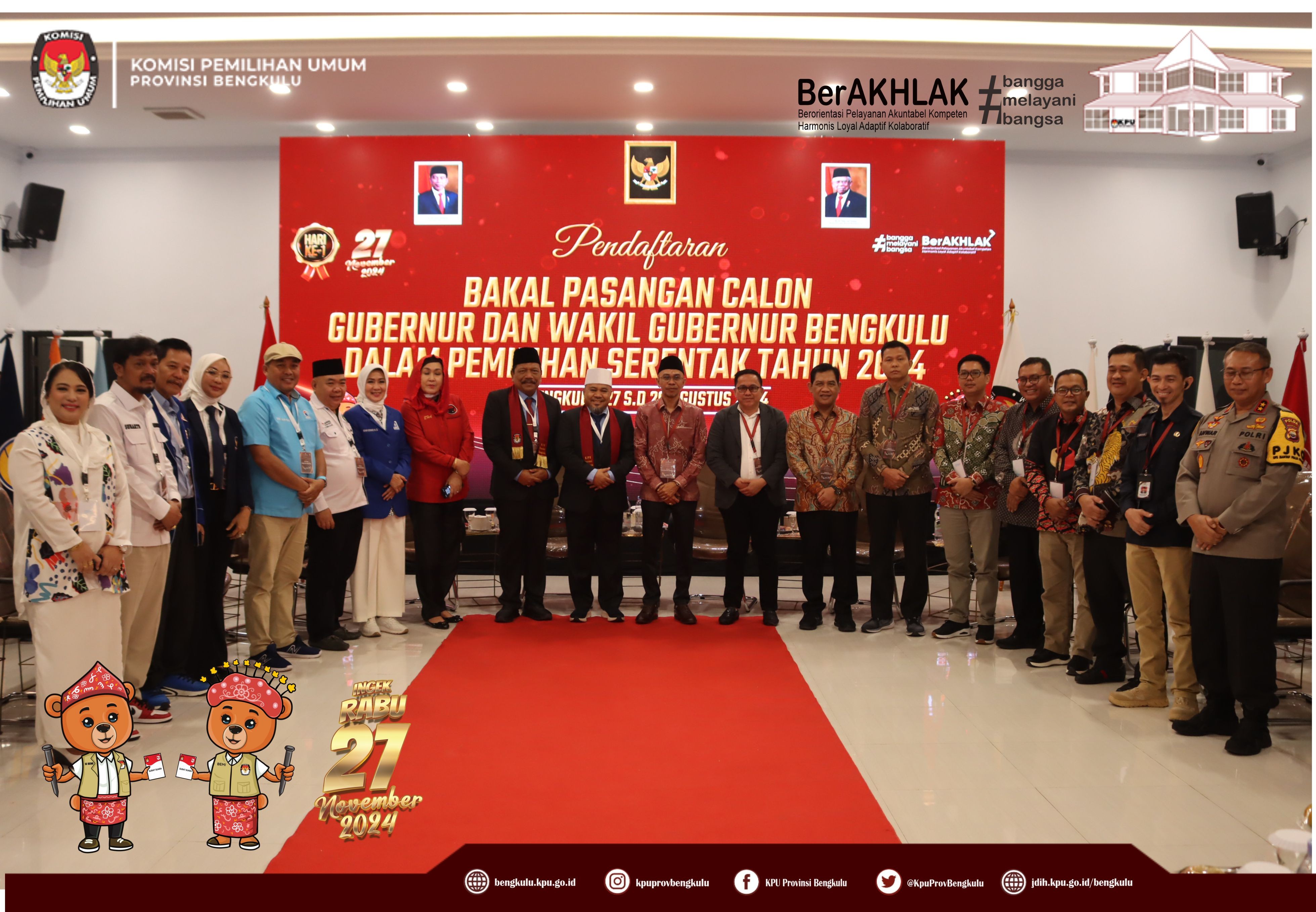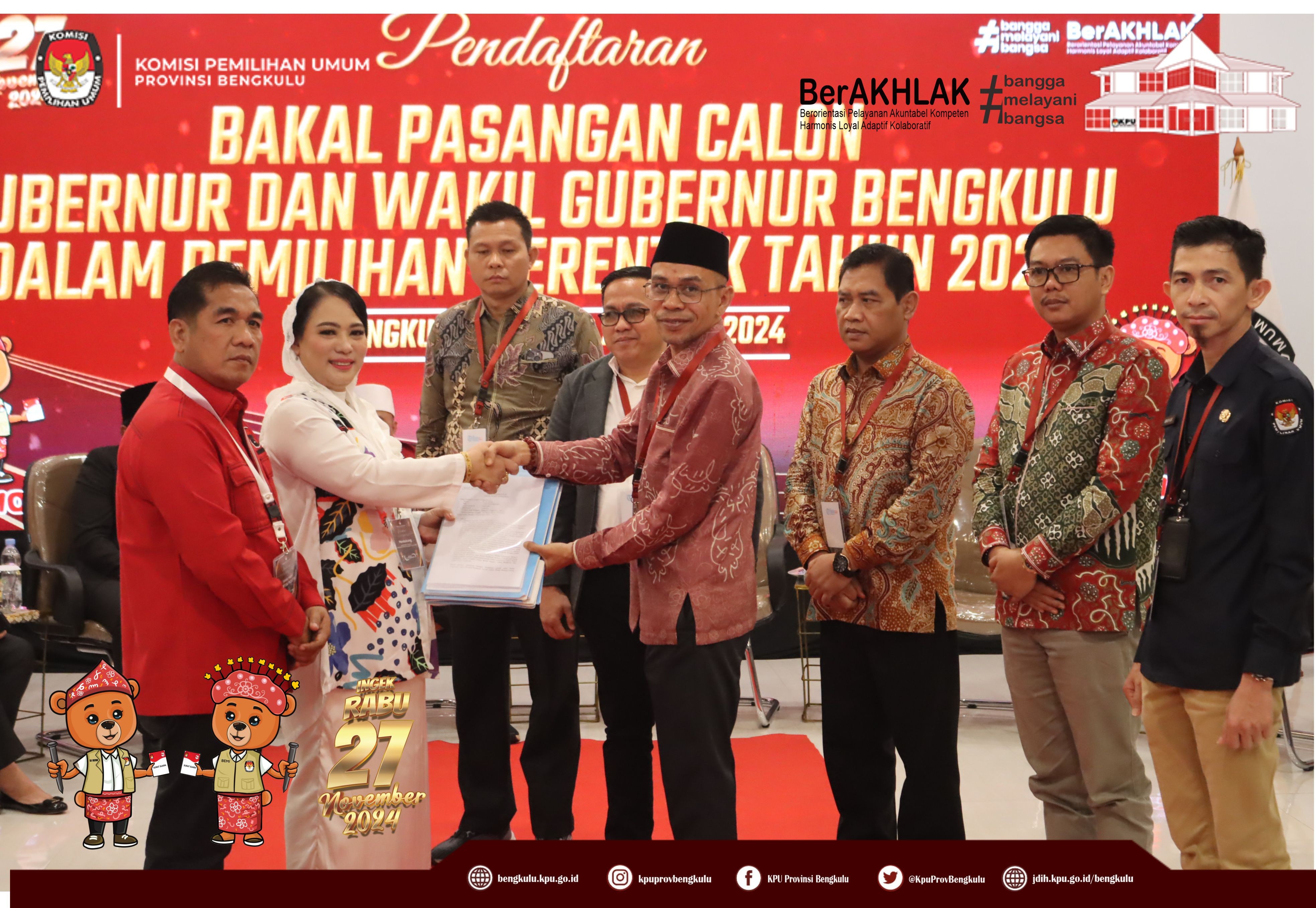Bengkulu, bengkulu.kpu.go.id - KPU Provinsi Bengkulu Menerima Pendaftaran Bakal Pasangan Gubernur dan Wakil Gubernur Bengkulu Dalam Pemilihan Serentak Tahun 2024, Selasa (27/8/2024), di Aula Demokrasi KPU Provinsi Bengkulu. Rombongan Bakal Pasangan Calon Bapak H. Helmi Hasan, SE dan Bapak Ir. H. Mian bersama Pimpinan Partai Politik Pengusul disambut Ketua KPU Provinsi Bengkulu Bapak Rusman Sudarsono bersama Anggota KPU Provinsi Bengkulu Bapak Alpin Samsen, Bapak Dodi Hendra Supiarso, Bapak Emex Verzoni dan Bapak Sarjan Efendi serta Sekretaris Bapak Kemas Mohammad Ajir. Hadir Ketua Bawaslu Provinsi Bengkulu Bapak Fahamsyah dan Anggota Bawaslu Provinsi Bengkulu Bapak Eko Sugianto dan Bapak Debisi Ilhodi dan Kapolda Bengkulu Bapak Irjen. Pol. Anwar, S.IK.,M.Si. Acara dibuka dengan menyanyikan Lagu Kebangsaan Indonesia Raya dan Jingle Pemilihan Serentak Provinsi Bengkulu, Sambutan Perwakilan Bakal Pasangan Calon disampaikan oleh Ibu Destita Khairilisani yang menyampaikan bahwa hari pertama ini H. Helmi Hasan, SE dan Ir. H. Mian mendaftar ke KPU Provinsi Bengkulu dengan diusung 7 (tujuh) partai politik, yaitu PAN, PDIP, GERINDRA, NASDEM, DEMOKRAT, PKB dan GELORA kemudian dilanjutkan dengan penyerahan dokumen syarat pencalonan dan syarat bakal calon kepada Ketua KPU Provinsi Bengkulu. Sambutan Bakal Calon Gubernur Bapak H. Helmi Hasan, SE menyampaikan ucapan terima kasih dan apresiasi kepada KPU Provinsi Bengkulu yang telah menerima pendaftaran bakal pasangan calon H. Helmi Hasan, SE dan Ir. H. Mian serta berharap ke depan penyelenggaraan pilkada berjalan dengan baik dan lancar. Sambutan Ketua KPU Provinsi Bengkulu Bapak Rusman Sudarsono menyampaikan bahwa jadwal pendaftaran bakal pasangan calon Gubernur dan Wakil Gubernur Bengkulu Dalam Pemilihan Serentak Tahun 2024 27 s.d 29 Agustus 2024 dan pada hari ini bakal pasangan calon H. Helmi Hasan, SE dan Ir. H. Mian yang pertama mendaftar ke KPU Provinsi Bengkulu. Setelah itu, Pengecekan dokumen syarat pencalonan dan syarat bakal calon oleh petugas pengecekan dan disaksikan oleh Bawaslu Provinsi Bengkulu kemudian ditutup dengan penyerahan cinderamata dan foto bersama.