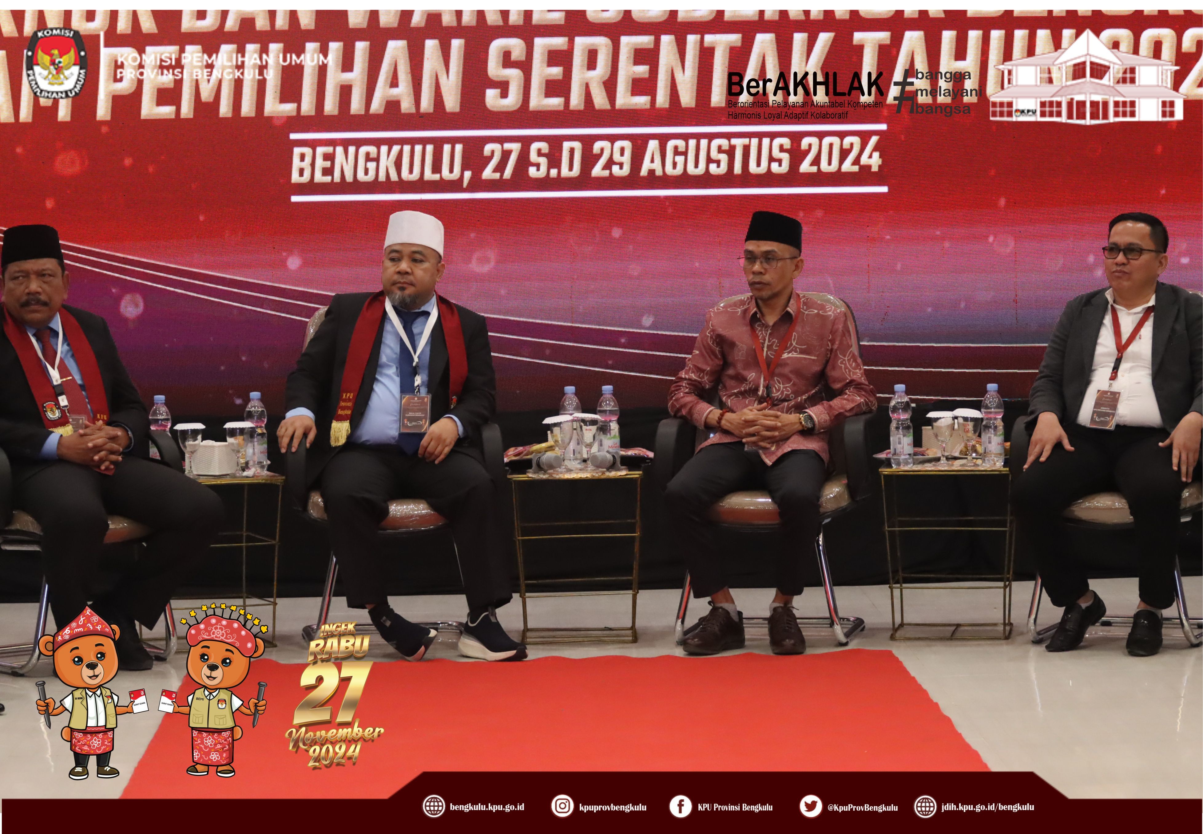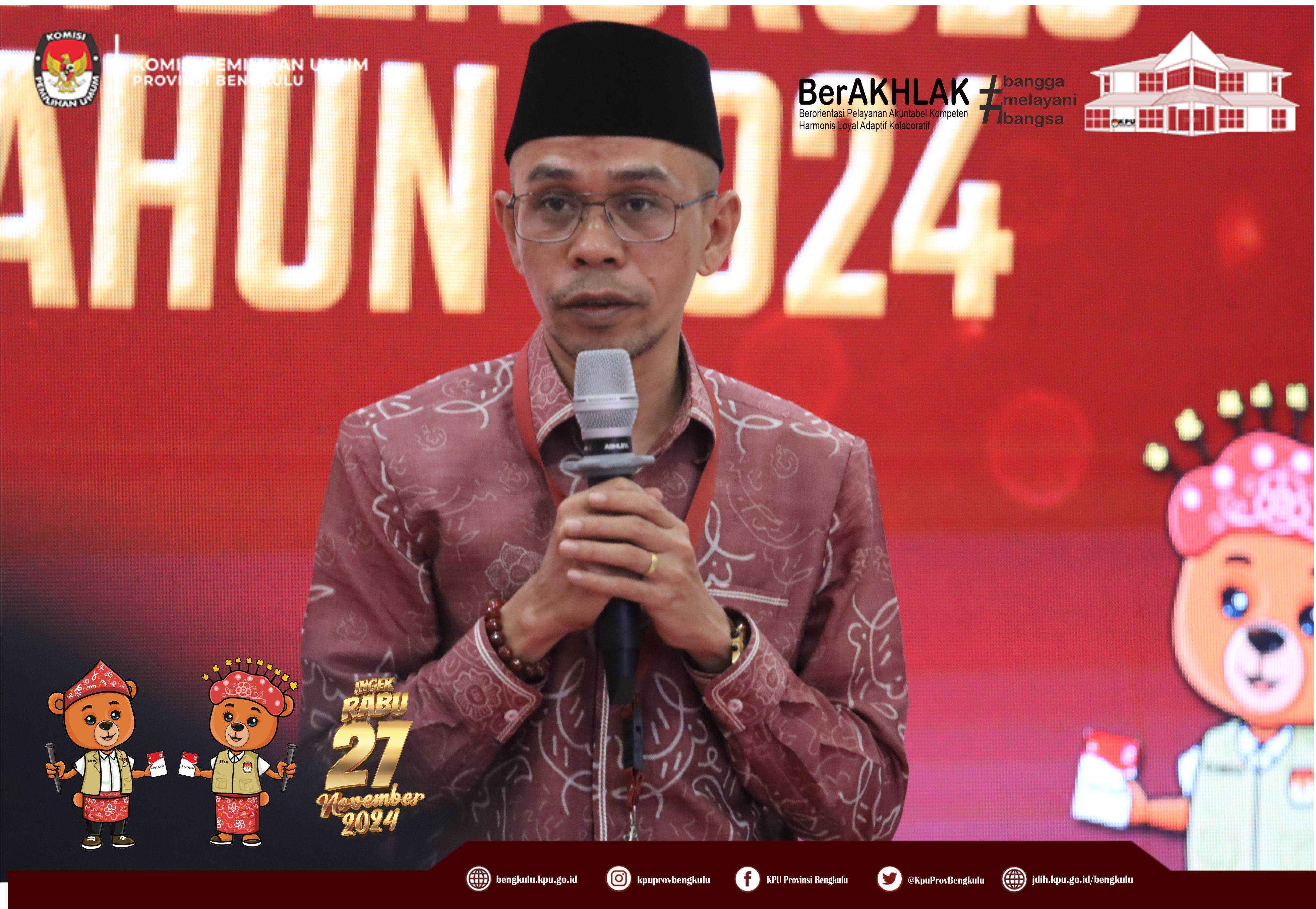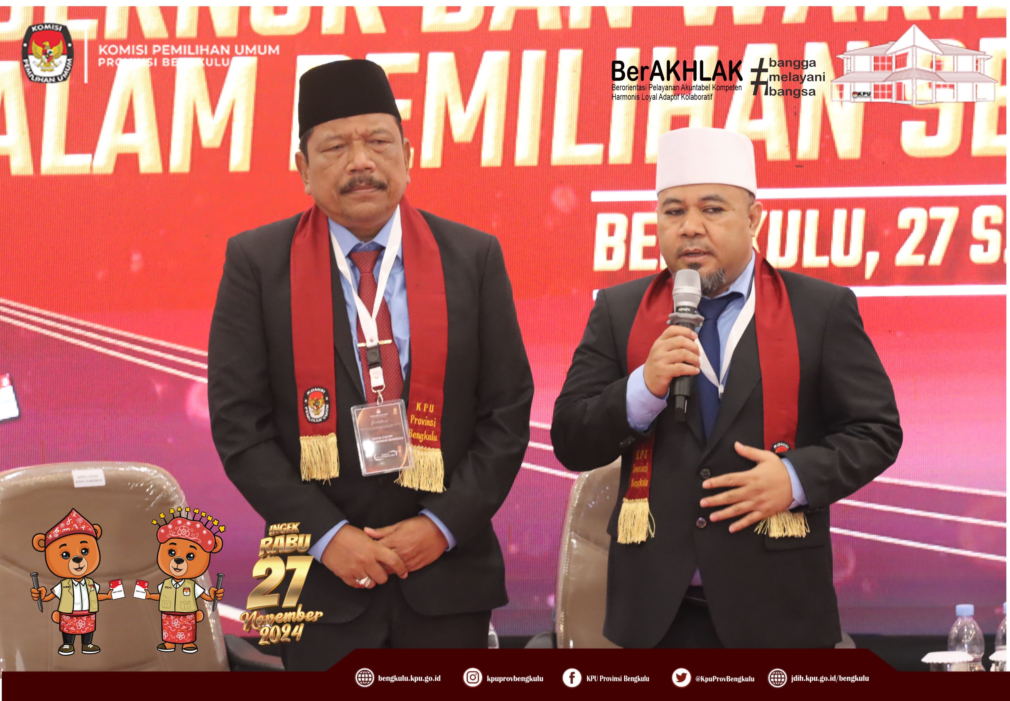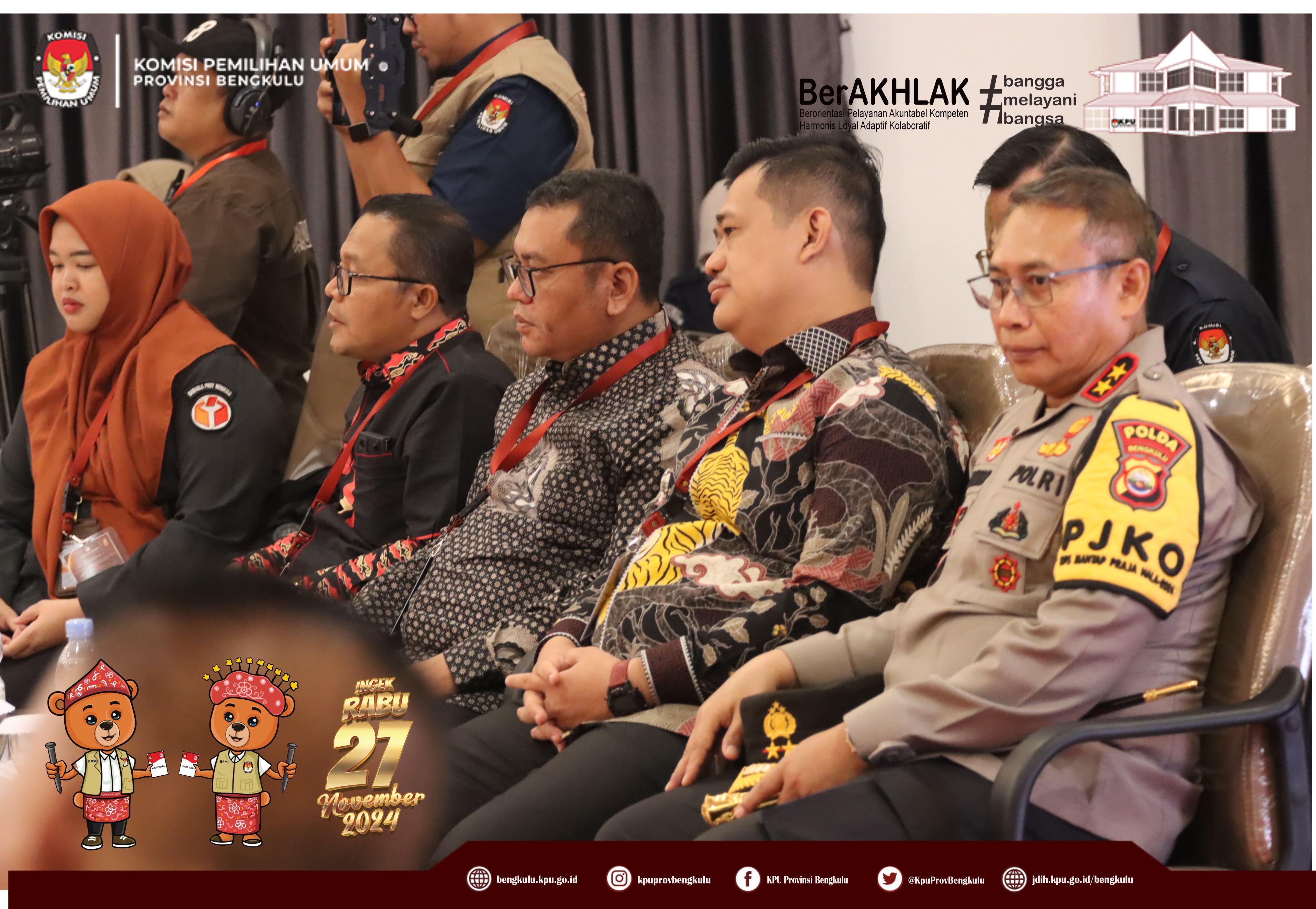 Bengkulu, bengkulu.kpu.go.id - KPU Provinsi Bengkulu Menerima Pendaftaran Bakal Pasangan Gubernur dan Wakil Gubernur Bengkulu Dalam Pemilihan Serentak Tahun 2024, Selasa (27/8/2024), di Aula Demokrasi KPU Provinsi Bengkulu. Rombongan Bakal Pasangan Calon Bapak H. Helmi Hasan, SE dan Bapak Ir. H. Mian bersama Pimpinan Partai Politik Pengusul disambut Ketua KPU Provinsi Bengkulu Bapak Rusman Sudarsono bersama Anggota KPU Provinsi Bengkulu Bapak Alpin Samsen, Bapak Dodi Hendra Supiarso, Bapak Emex Verzoni dan Bapak Sarjan Efendi serta Sekretaris Bapak Kemas Mohammad Ajir. Hadir Ketua Bawaslu Provinsi Bengkulu Bapak Fahamsyah dan Anggota Bawaslu Provinsi Bengkulu Bapak Eko Sugianto dan Bapak Debisi Ilhodi dan Kapolda Bengkulu Bapak Irjen. Pol. Anwar, S.IK.,M.Si. Acara dibuka dengan menyanyikan Lagu Kebangsaan Indonesia Raya dan Jingle Pemilihan Serentak Provinsi Bengkulu, Sambutan Perwakilan Bakal Pasangan Calon disampaikan oleh Ibu Destita Khairilisani yang menyampaikan bahwa hari pertama ini H. Helmi Hasan, SE dan Ir. H. Mian mendaftar ke KPU Provinsi Bengkulu dengan diusung 7 (tujuh) partai politik, yaitu PAN, PDIP, GERINDRA, NASDEM, DEMOKRAT, PKB dan GELORA kemudian dilanjutkan dengan penyerahan dokumen syarat pencalonan dan syarat bakal calon kepada Ketua KPU Provinsi Bengkulu. Sambutan Bakal Calon Gubernur Bapak H. Helmi Hasan, SE menyampaikan ucapan terima kasih dan apresiasi kepada KPU Provinsi Bengkulu yang telah menerima pendaftaran bakal pasangan calon H. Helmi Hasan, SE dan Ir. H. Mian serta berharap ke depan penyelenggaraan pilkada berjalan dengan baik dan lancar. Sambutan Ketua KPU Provinsi Bengkulu Bapak Rusman Sudarsono menyampaikan bahwa jadwal pendaftaran bakal pasangan calon Gubernur dan Wakil Gubernur Bengkulu Dalam Pemilihan Serentak Tahun 2024 27 s.d 29 Agustus 2024 dan pada hari ini bakal pasangan calon H. Helmi Hasan, SE dan Ir. H. Mian yang pertama mendaftar ke KPU Provinsi Bengkulu. Setelah itu, Pengecekan dokumen syarat pencalonan dan syarat bakal calon oleh petugas pengecekan dan disaksikan oleh Bawaslu Provinsi Bengkulu kemudian ditutup dengan penyerahan cinderamata dan foto bersama.