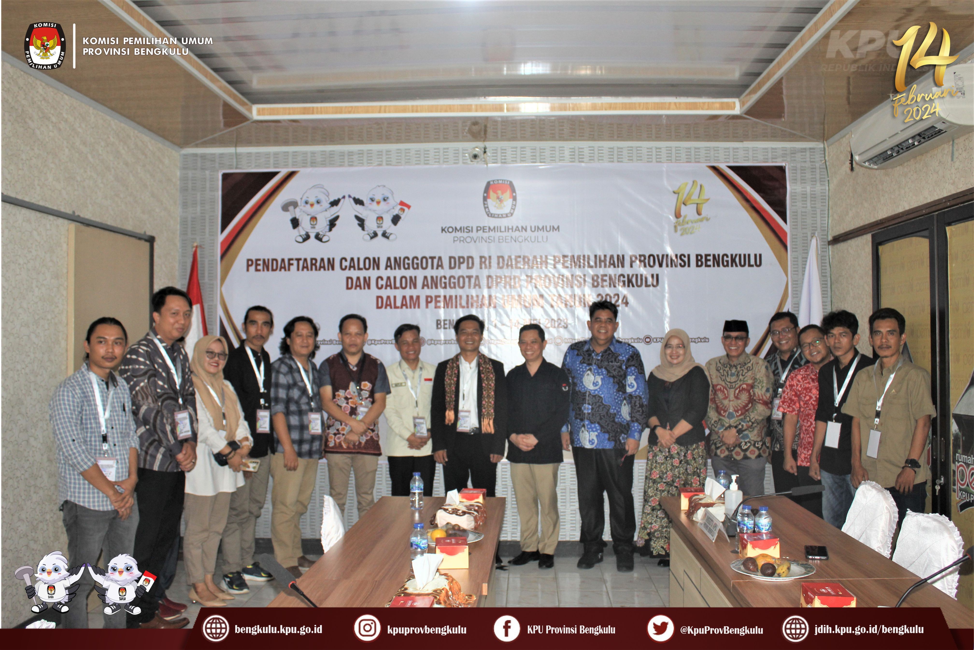 Bengkulu-bengkulu.kpu.go.id, Ketua KPU Provinsi Bengkulu Irwan Saputra bersama Anggota Darlinsyah, Emex Verzoni dan Irna Riza Yuliastuty serta Sekretaris Kemas Mohammad Ajir menerima Pendaftaran Calon Anggota DPD RI Daerah Pemilihan Provinsi Bengkulu yaitu, Def Tri Hardianto pada Pemilihan Umum Serentak 2024, Sabtu (13/5/2023) di Kantor KPU Provinsi Bengkulu. Rangkaian acara berjalan khidmat dan lancar ini diisi dengan penyampaian maksud dan tujuan dari calon, penyerahan dokumen syarat pencalonan, sambutan dari Ketua KPU Provinsi Bengkulu Irwan Saputra, foto bersama, pemeriksaan dokumen syarat calon dan konferensi pers. Hadir dalam pendaftaran Ketua Bawaslu Provinsi Bengkulu Halid Saifullah dan Anggota Fahamsyah, Eko Sugianto serta Natijo Elem. Pelaksanaan pendaftaran disiarkan live streaming melalui youtube KPU Provinsi Bengkulu.