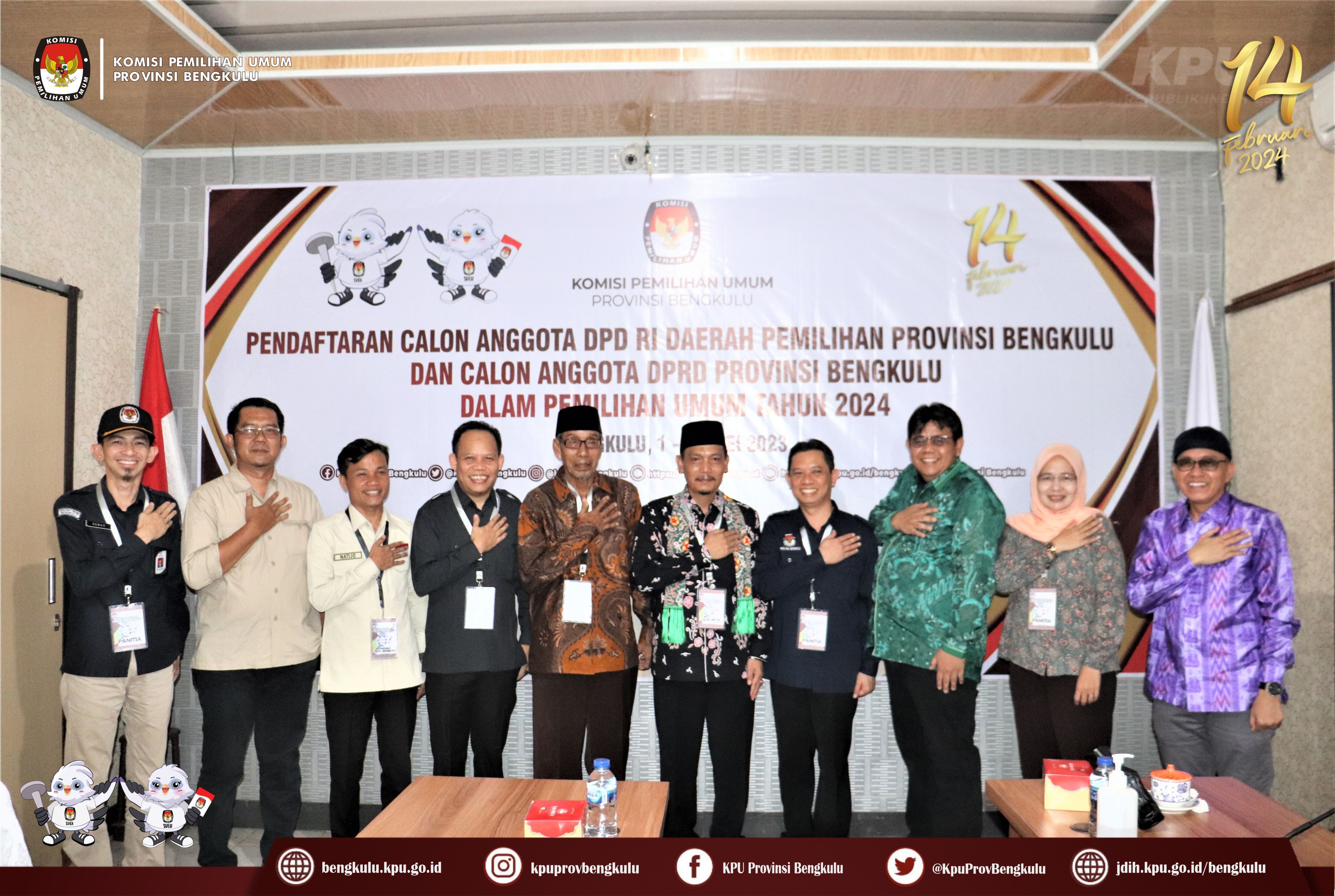 Bengkulu-bengkulu.kpu.go.id, Ketua KPU Provinsi Bengkulu Irwan Saputra bersama Anggota Darlinsyah, Emex Verzoni dan Irna Riza Yuliastuty serta Sekretaris Kemas Mohammad Ajir menerima Pendaftaran Calon Anggota DPD RI Daerah Pemilihan Provinsi Bengkulu yaitu, Rahiman Dani pada Pemilihan Umum Serentak 2024, Selasa (2/5/2023) di Kantor KPU Provinsi Bengkulu. Rangkaian acara berjalan khidmat dan lancar ini diisi dengan penyampaian maksud dan tujuan dari calon, penyerahan dokumen syarat pencalonan, sambutan dari Ketua KPU Provinsi Bengkulu Irwan Saputra, foto bersama, pemeriksaan dokumen syarat calon dan konferensi pers. Hadir dalam pendaftaran Ketua Bawaslu Provinsi Bengkulu Halid Saifullah dan Anggota Dodi Herwansyah dan Natijo Elem. Pelaksanaan pendaftaran disiarkan live streaming melalui youtube KPU Provinsi Bengkulu.