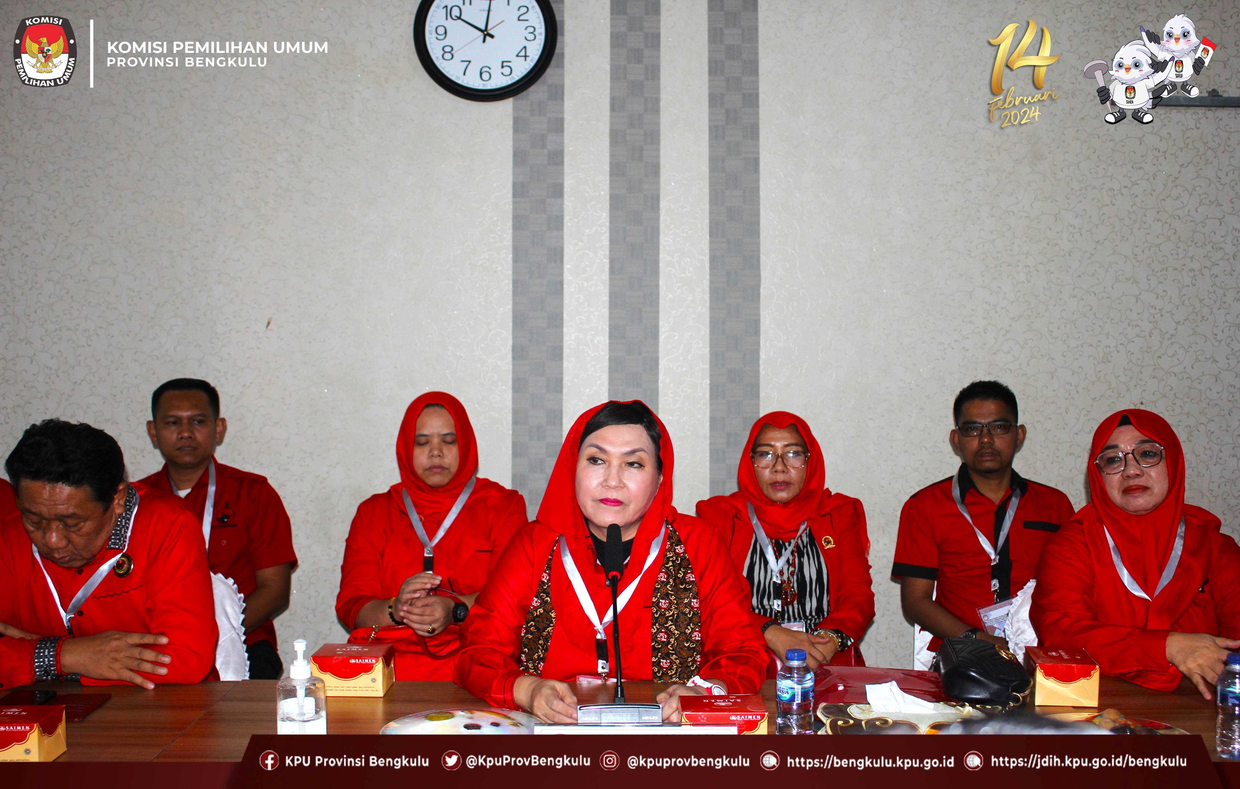 Bengkulu-bengkulu.kpu.go.id, Ketua KPU Provinsi Bengkulu Irwan Saputra bersama Anggota Siti Baroroh, Emex Verzoni dan Irna Riza Yuliastuty serta Sekretaris Kemas Mohammad Ajir menerima Pengajuan Bakal Calon Anggota Dewan Perwakilan Rakyat Daerah Pemilihan Provinsi Bengkulu dari Partai Demokrasi Indonesia Perjuangan pada Pemilihan Umum Serentak 2024, Kamis (11/5/2023) di Kantor KPU Provinsi Bengkulu. Rangkaian acara berjalan khidmat dan lancar, dalam pelaksanaanya diisi dengan penyampaian maksud dan tujuan dari Partai Demokrasi Indonesia Perjuangan, penyerahan dokumen syarat Pengajuan Bakal Calon , sambutan dari Ketua KPU Provinsi Bengkulu Irwan Saputra, foto bersama, pemeriksaan dokumen syarat calon dan konferensi pers. Hadir dalam pendaftaran Anggota Bawaslu Provinsi Bengkulu Natijo Elem, Eko Sugianto dan Dodi Herwansyah Pelaksanaan pendaftaran disiarkan pula live streaming melalui youtube KPU Provinsi Bengkulu.