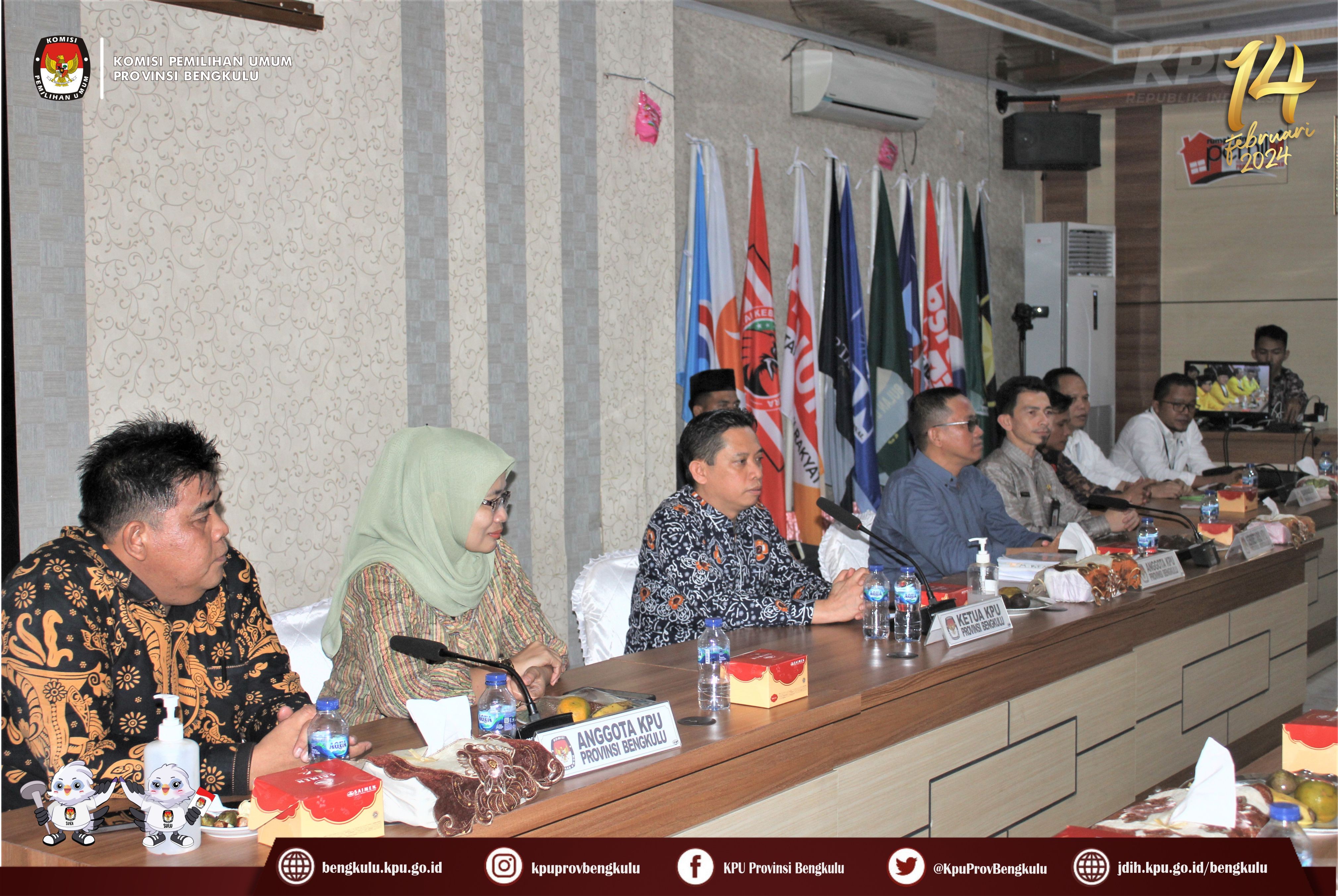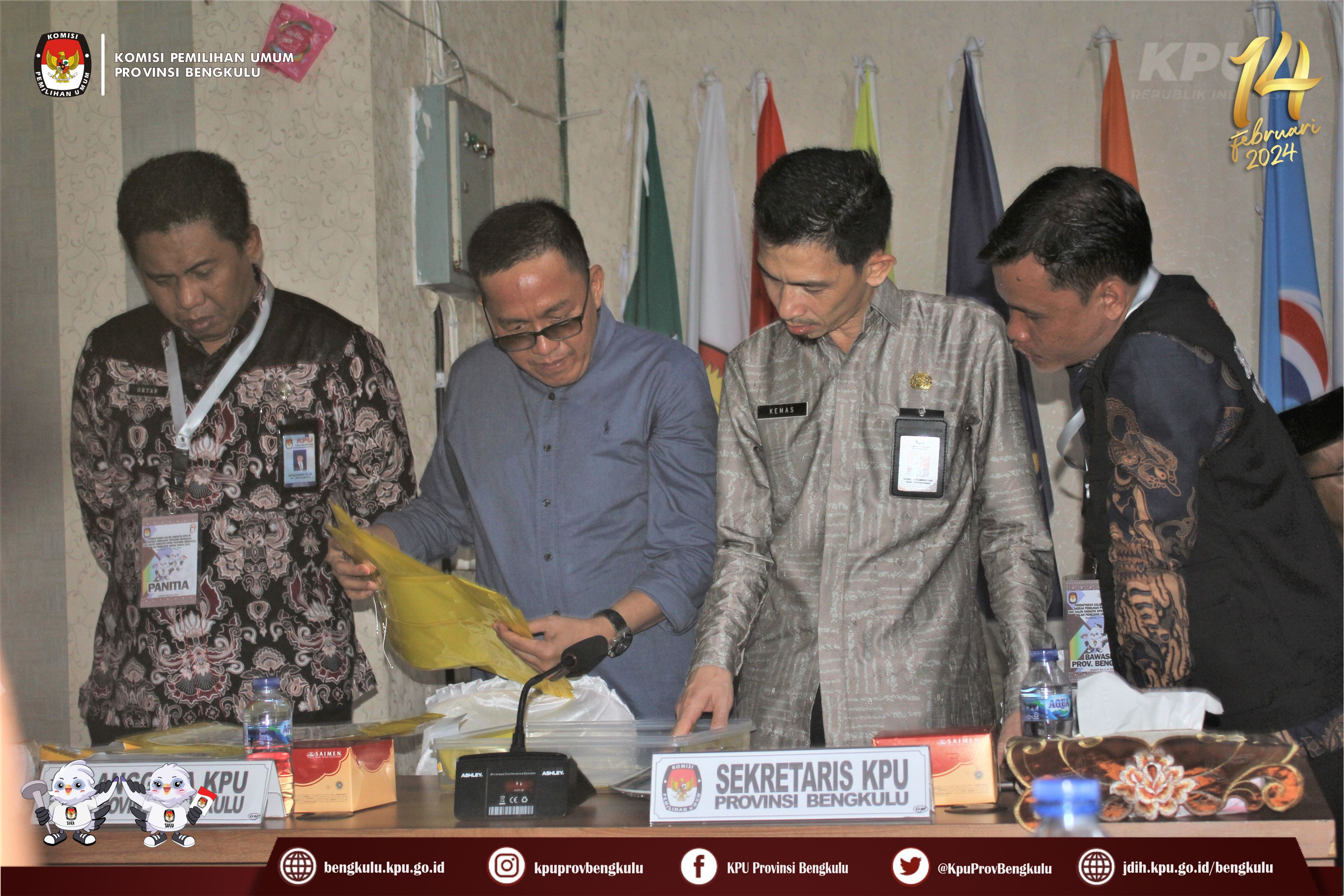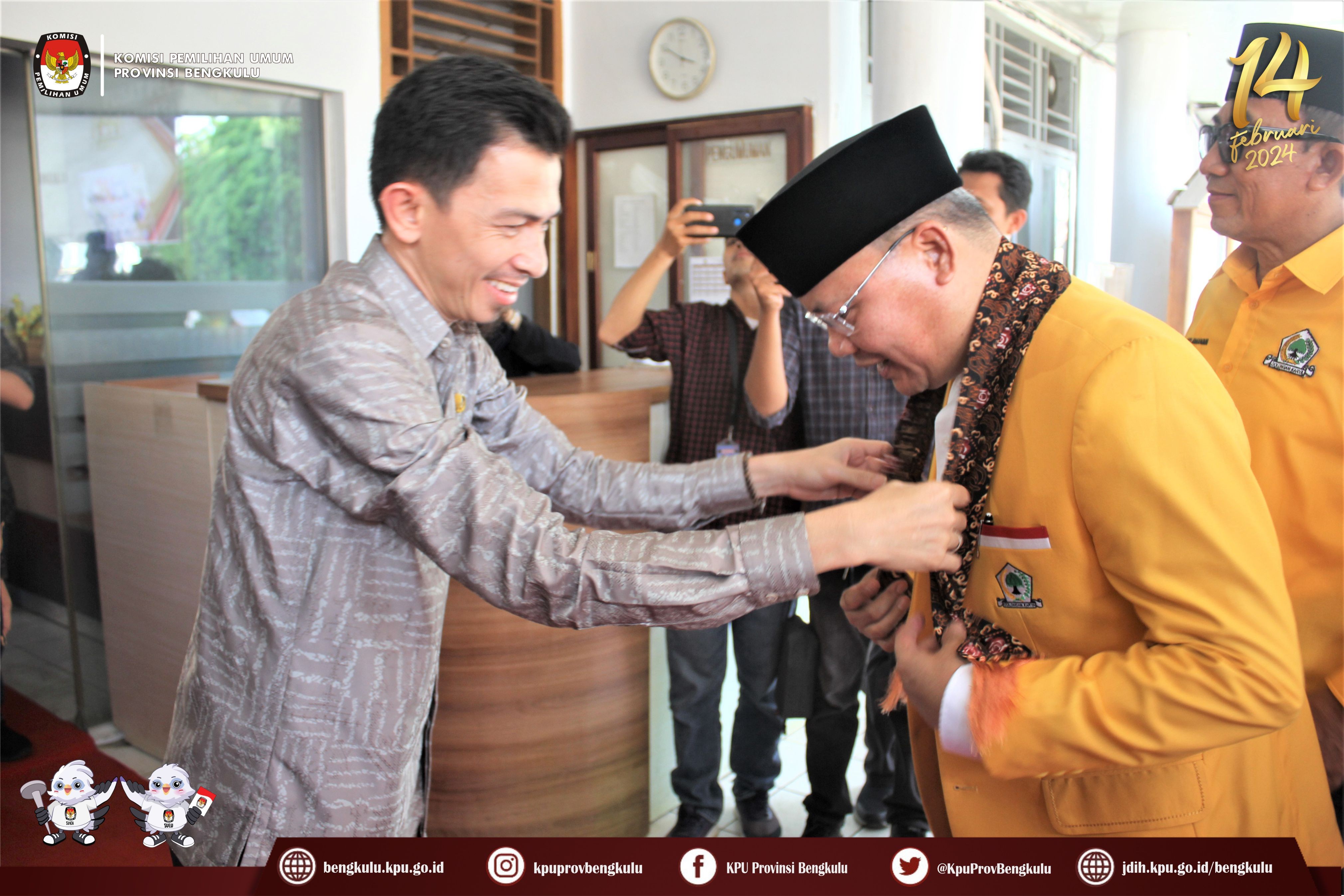 Bengkulu-bengkulu.kpu.go.id, Ketua KPU Provinsi Bengkulu Irwan Saputra bersama Anggota Darlinsyah, Emex Verzoni dan Irna Riza Yuliastuty serta Sekretaris Kemas Mohammad Ajir menerima Pengajuan Bakal Calon Anggota Dewan Perwakilan Rakyat Daerah Pemilihan Provinsi Bengkulu dari Partai Golkar pada Pemilihan Umum Serentak 2024, Jum’at (12/5/2023) di Kantor KPU Provinsi Bengkulu. Rangkaian acara berjalan khidmat dan lancar, dalam pelaksanaanya diisi dengan penyampaian maksud dan tujuan dari Partai Gollkar, penyerahan dokumen syarat Pengajuan Bakal Calon, sambutan dari Ketua KPU Provinsi Bengkulu Irwan Saputra, foto bersama, pemeriksaan dokumen syarat calon dan konferensi pers. Hadir dalam Pengajuan Bakal Calon Anggota Dewan Perwakilan Rakyat Daerah adalah Pengurus DPD Partai Golkar, Ketua Bawaslu Provinsi Bengkulu Halid Saifullah dan Anggota Eko Sugianto serta Natijo Elem. Pelaksanaan Pengajuan disiarkan live streaming melalui youtube KPU Provinsi Bengkulu.