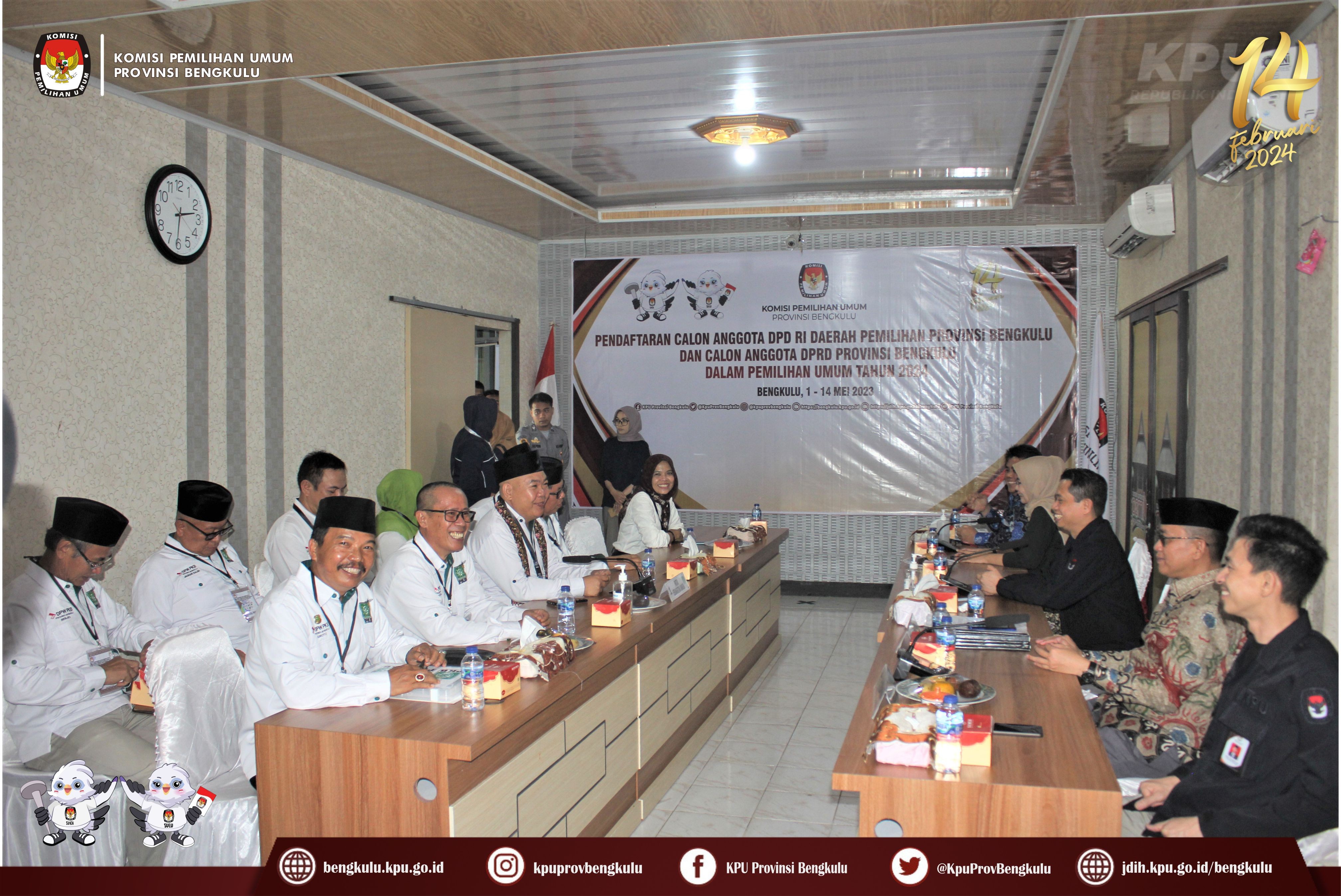 Bengkulu-bengkulu.kpu.go.id, Ketua KPU Provinsi Bengkulu Irwan Saputra bersama Anggota Darlinsyah, Emex Verzoni dan Irna Riza Yuliastuty serta Sekretaris Kemas Mohammad Ajir menerima Pengajuan Bakal Calon Anggota Dewan Perwakilan Rakyat Daerah Pemilihan Provinsi Bengkulu dari Partai Kebangkitan Bangsa (PKB) pada Pemilihan Umum Serentak 2024, Sabtu (13/5/2023) di Kantor KPU Provinsi Bengkulu. Rangkaian acara berjalan khidmat dan lancar, dalam pelaksanaanya diisi dengan penyampaian maksud dan tujuan dari Partai Kebangkitan Bangsa (PKB), penyerahan dokumen syarat Pengajuan Bakal Calon, sambutan dari Ketua KPU Provinsi Bengkulu Irwan Saputra, foto bersama, pemeriksaan dokumen syarat calon dan konferensi pers. Hadir dalam Pengajuan Bakal Calon Anggota Dewan Perwakilan Rakyat Daerah adalah Pengurus DPW Partai Kebangkitan Bangsa (PKB), Ketua Bawaslu Provinsi Bengkulu Halid Saifullah dan Anggota Fahamsyah serta Natijo Elem. Pelaksanaan Pengajuan disiarkan live streaming melalui youtube KPU Provinsi Bengkulu.
