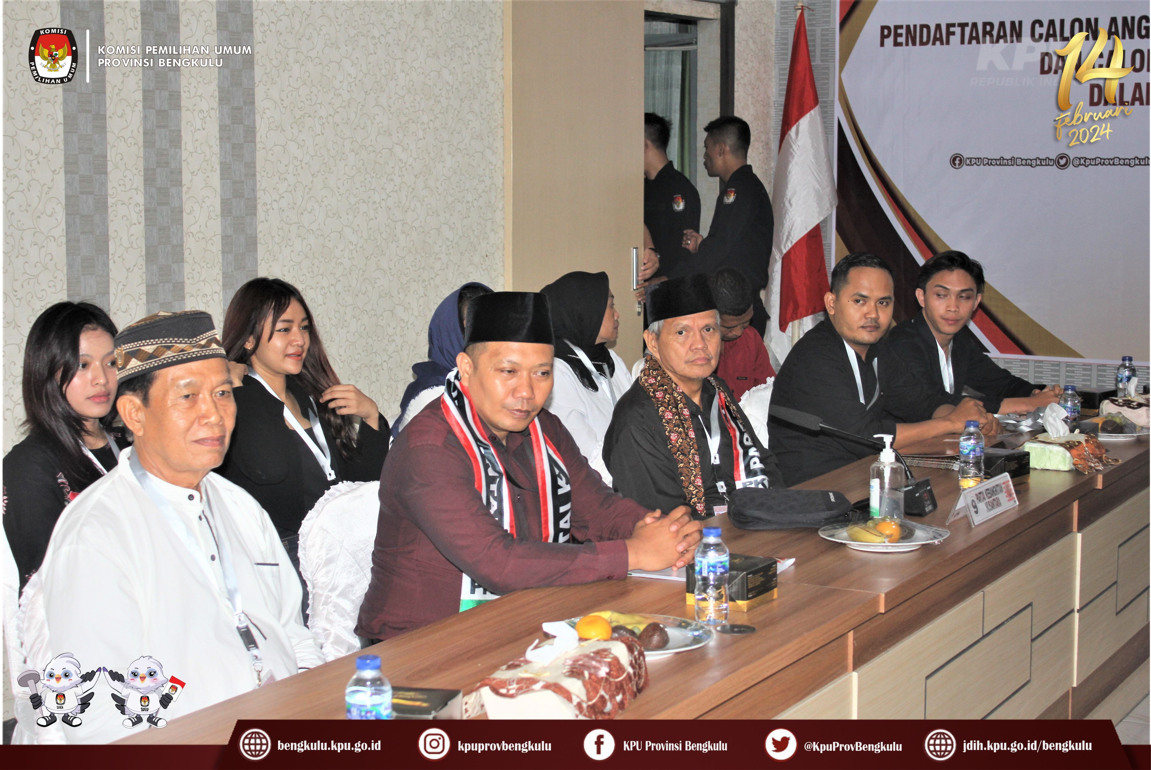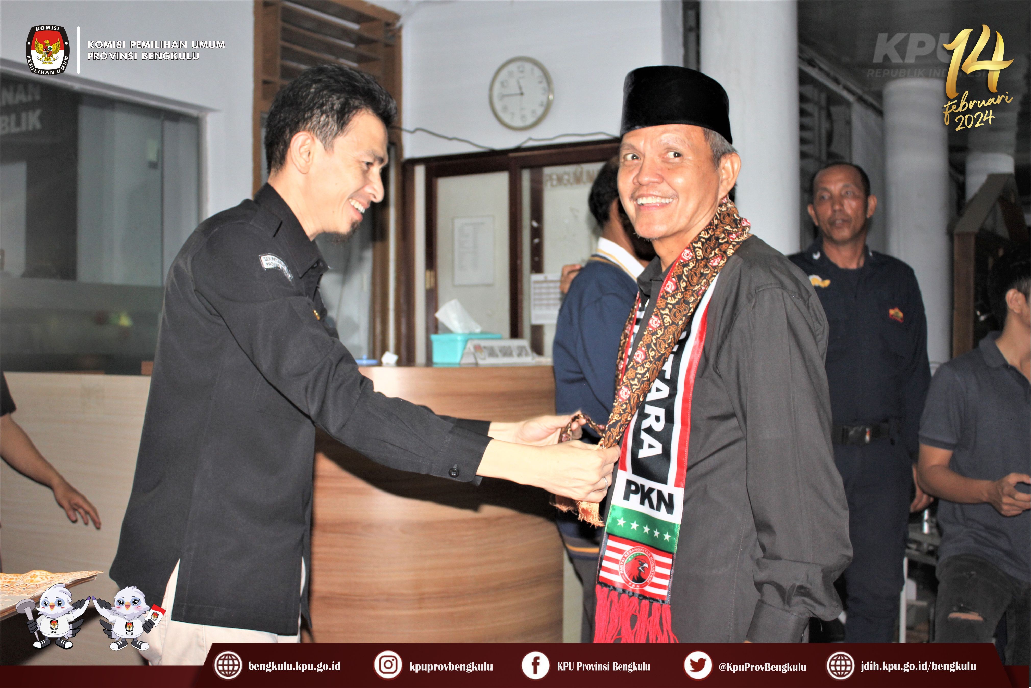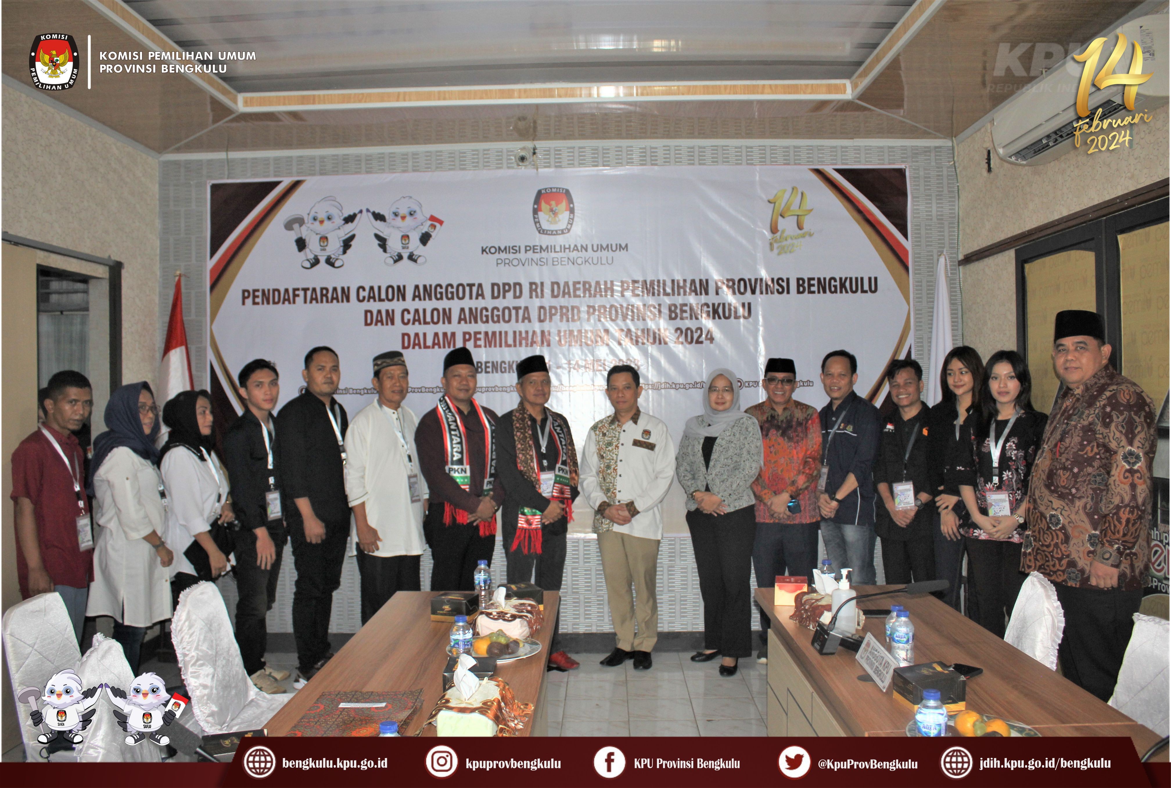 Ketua KPU Provinsi Bengkulu Irwan Saputra bersama Anggota Darlinsyah, Emex Verzoni dan Irna Riza Yuliastuty serta Sekretaris Kemas Mohammad Ajir menerima Pengajuan Bakal Calon Anggota Dewan Perwakilan Rakyat Daerah Pemilihan Provinsi Bengkulu dari Partai Kebangkitan Nusantara (PKN) pada Pemilihan Umum Serentak 2024, Minggu (14/5/2023) di Kantor KPU Provinsi Bengkulu. Rangkaian acara berjalan khidmat dan lancar, dalam pelaksanaanya diisi dengan penyampaian maksud dan tujuan dari Partai Kebangkitan Nusantara (PKN), penyerahan dokumen syarat Pengajuan Bakal Calon, sambutan dari Ketua KPU Provinsi Bengkulu Irwan Saputra, foto bersama, pemeriksaan dokumen syarat calon dan konferensi pers. Hadir dalam Pengajuan Bakal Calon Anggota Dewan Perwakilan Rakyat Daerah adalah PD Partai Kebangkitan Nusantara (PKN), Ketua Bawaslu Provinsi Bengkulu Halid Saifullah dan Anggota Dodi Herwansyah, serta Natijo Elem. Pelaksanaan Pengajuan disiarkan live streaming melalui youtube KPU Provinsi Bengkulu.