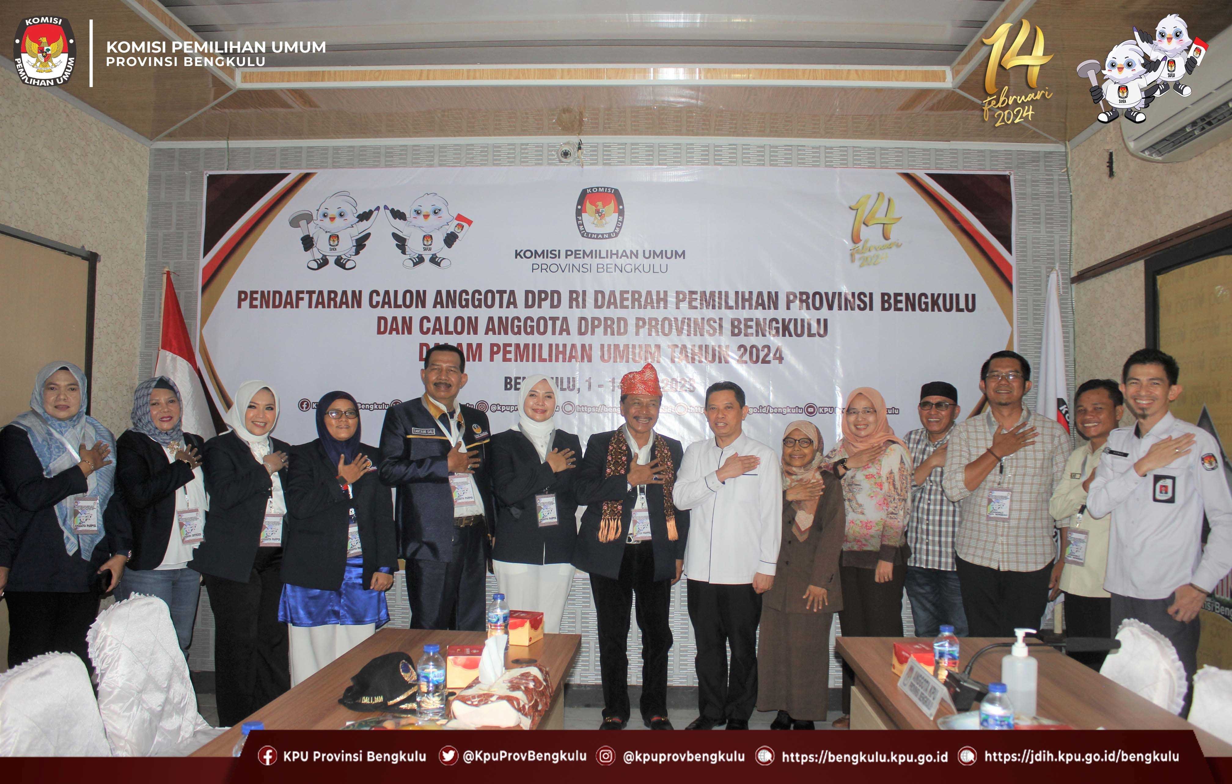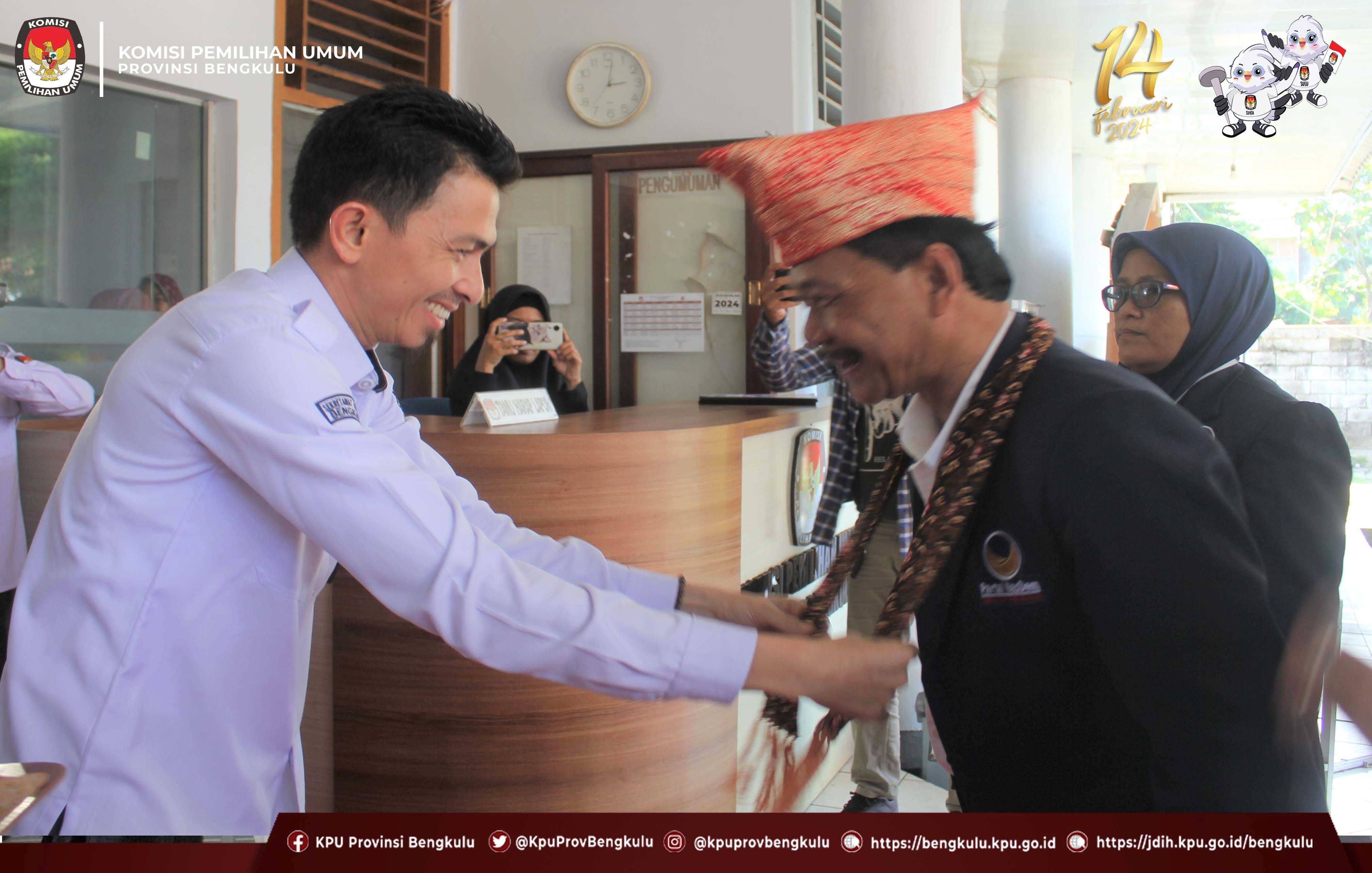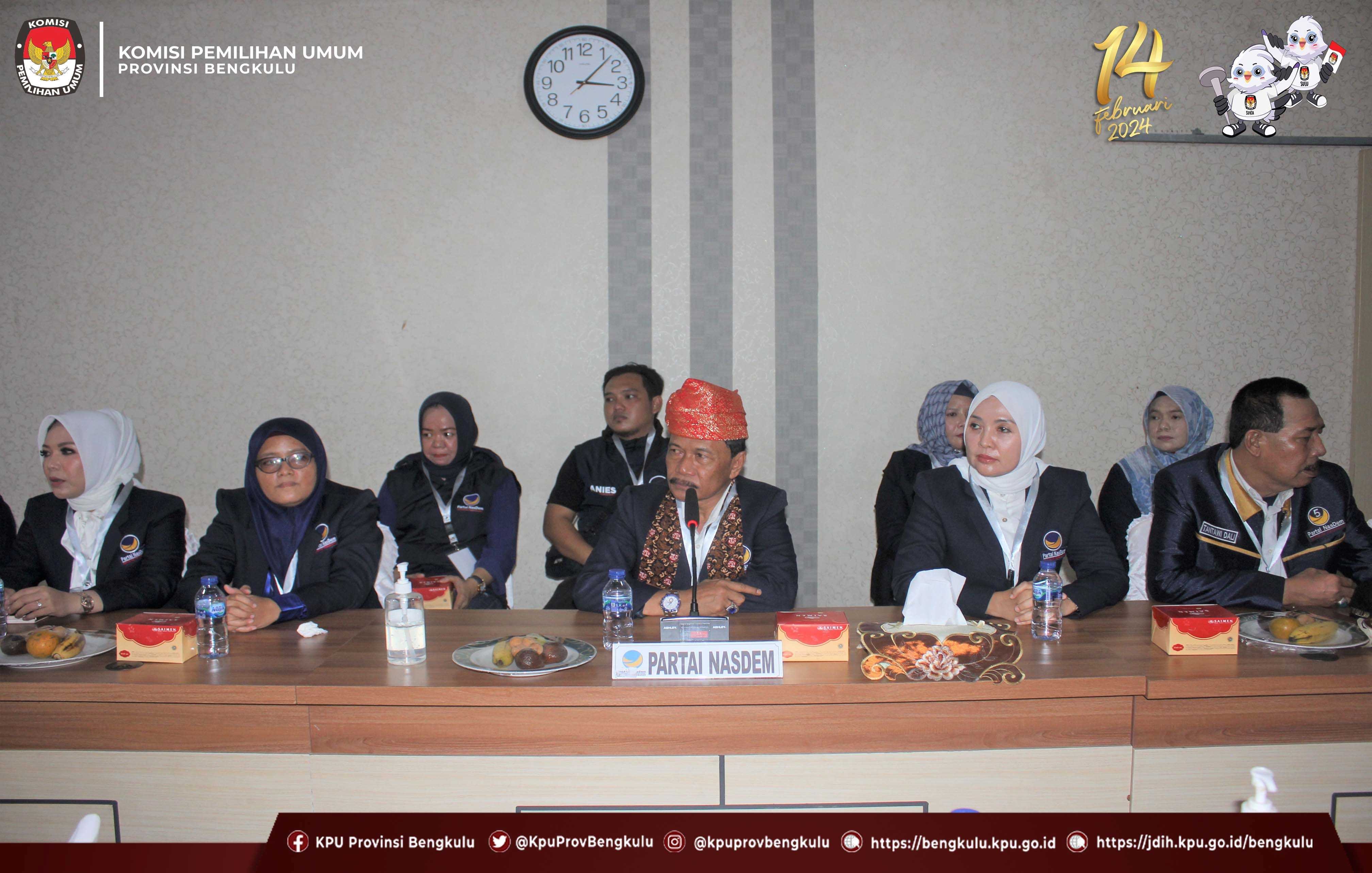 Bengkulu-bengkulu.kpu.go.id, Ketua KPU Provinsi Bengkulu Irwan Saputra bersama Anggota Siti Baroroh, Emex Verzoni dan Irna Riza Yuliastuty serta Sekretaris Kemas Mohammad Ajir menerima Pengajuan Bakal Calon Anggota Dewan Perwakilan Rakyat Daerah Pemilihan Provinsi Bengkulu dari Partai Nasdem pada Pemilihan Umum Serentak 2024, Kamis (11/5/2023) di Kantor KPU Provinsi Bengkulu. Rangkaian acara berjalan khidmat dan lancar, dalam pelaksanaanya diisi dengan penyampaian maksud dan tujuan dari Partai Demokrasi Indonesia Perjuangan, penyerahan dokumen syarat Pengajuan Bakal Calon , sambutan dari Ketua KPU Provinsi Bengkulu Irwan Saputra, foto bersama, pemeriksaan dokumen syarat calon dan konferensi pers. Hadir dalam Pengajuan Bakal Calon Anggota Dewan Perwakilan Rakyat Daerah, Anggota Bawaslu Provinsi Bengkulu Natijo Elemdan Dodi Herwansyah Pelaksanaan Pengajuan disiarkan pula live streaming melalui youtube KPU Provinsi Bengkulu.