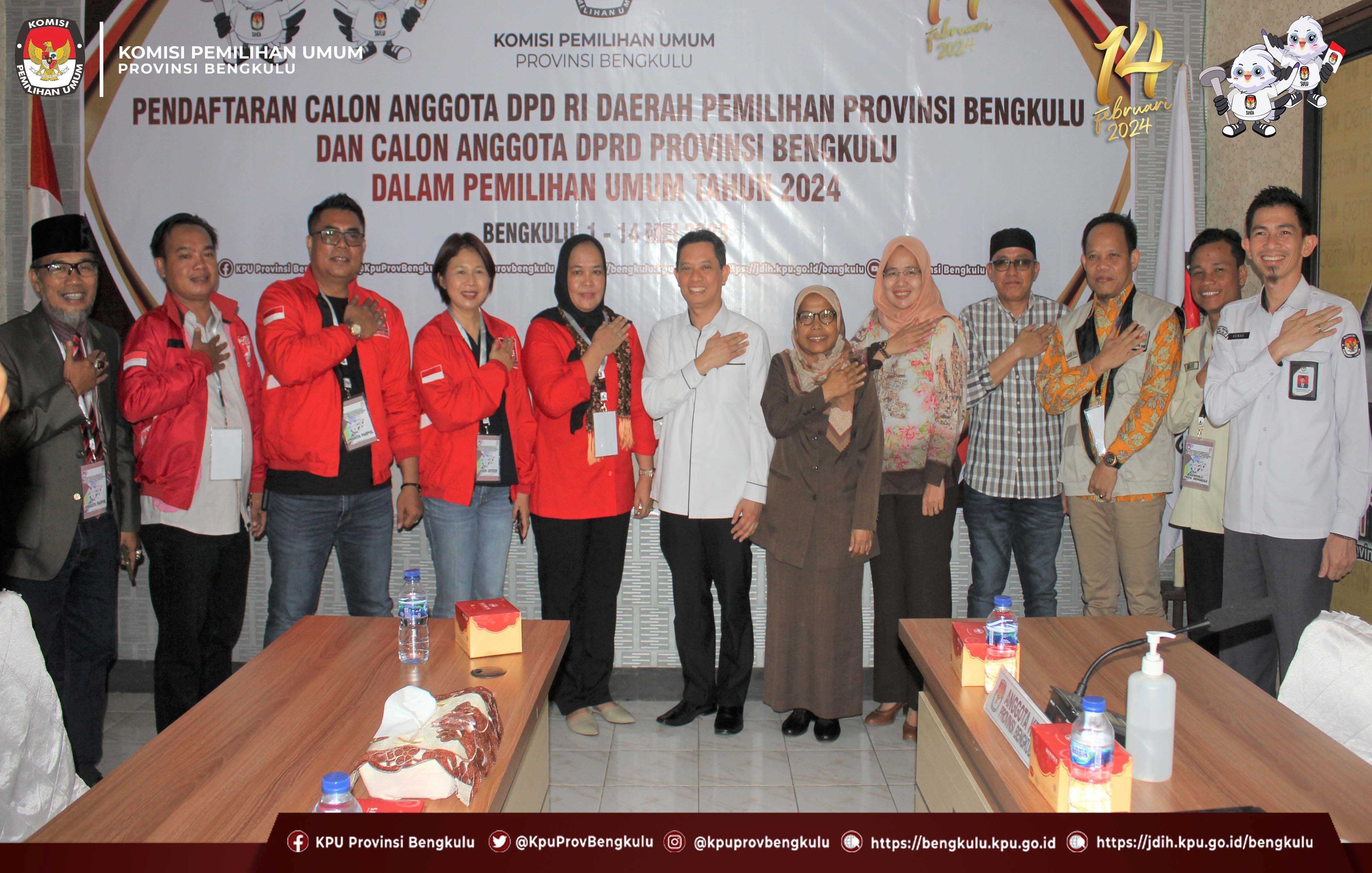 Bengkulu-bengkulu.kpu.go.id, Ketua KPU Provinsi Bengkulu Irwan Saputra bersama Anggota Siti Baroroh, Emex Verzoni dan Irna Riza Yuliastuty serta Sekretaris Kemas Mohammad Ajir menerima Pengajuan Bakal Calon Anggota Dewan Perwakilan Rakyat Daerah Pemilihan Provinsi Bengkulu dari Partai Solidaritas Indonesia pada Pemilihan Umum Serentak 2024, Kamis (11/5/2023) di Kantor KPU Provinsi Bengkulu. Rangkaian acara berjalan khidmat dan lancar, dalam pelaksanaanya diisi dengan penyampaian maksud dan tujuan dari Partai Demokrasi Indonesia Perjuangan, penyerahan dokumen syarat Pengajuan Bakal Calon , sambutan dari Ketua KPU Provinsi Bengkulu Irwan Saputra, foto bersama, pemeriksaan dokumen syarat calon dan konferensi pers. Hadir dalam Pengajuan Ketua Bawaslu Provinsi Bengkulu Halid Saifullah dan anggota Natijo Elem, Pelaksanaan Pengajuan Bakal Calon Anggota Dewan Perwakilan Rakyat Daerah Pemilihan Provinsi Bengkulu disiarkan pula live streaming melalui youtube KPU Provinsi Bengkulu.