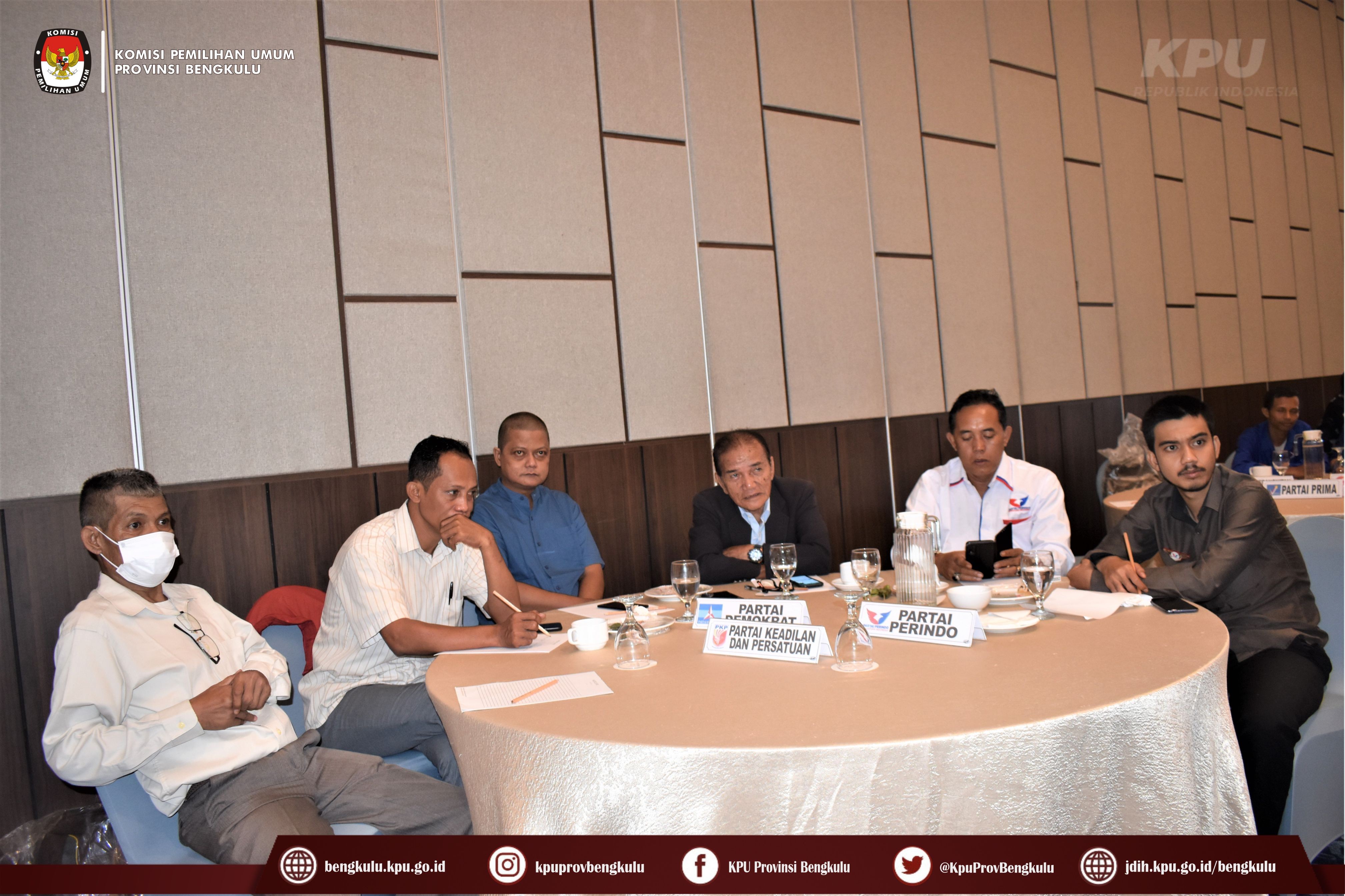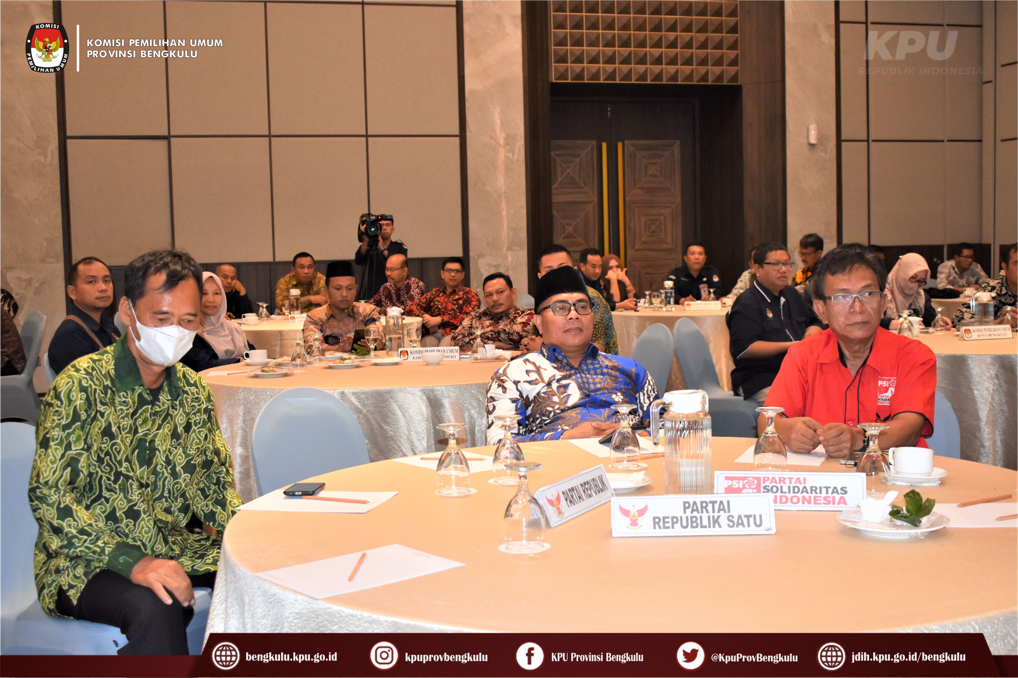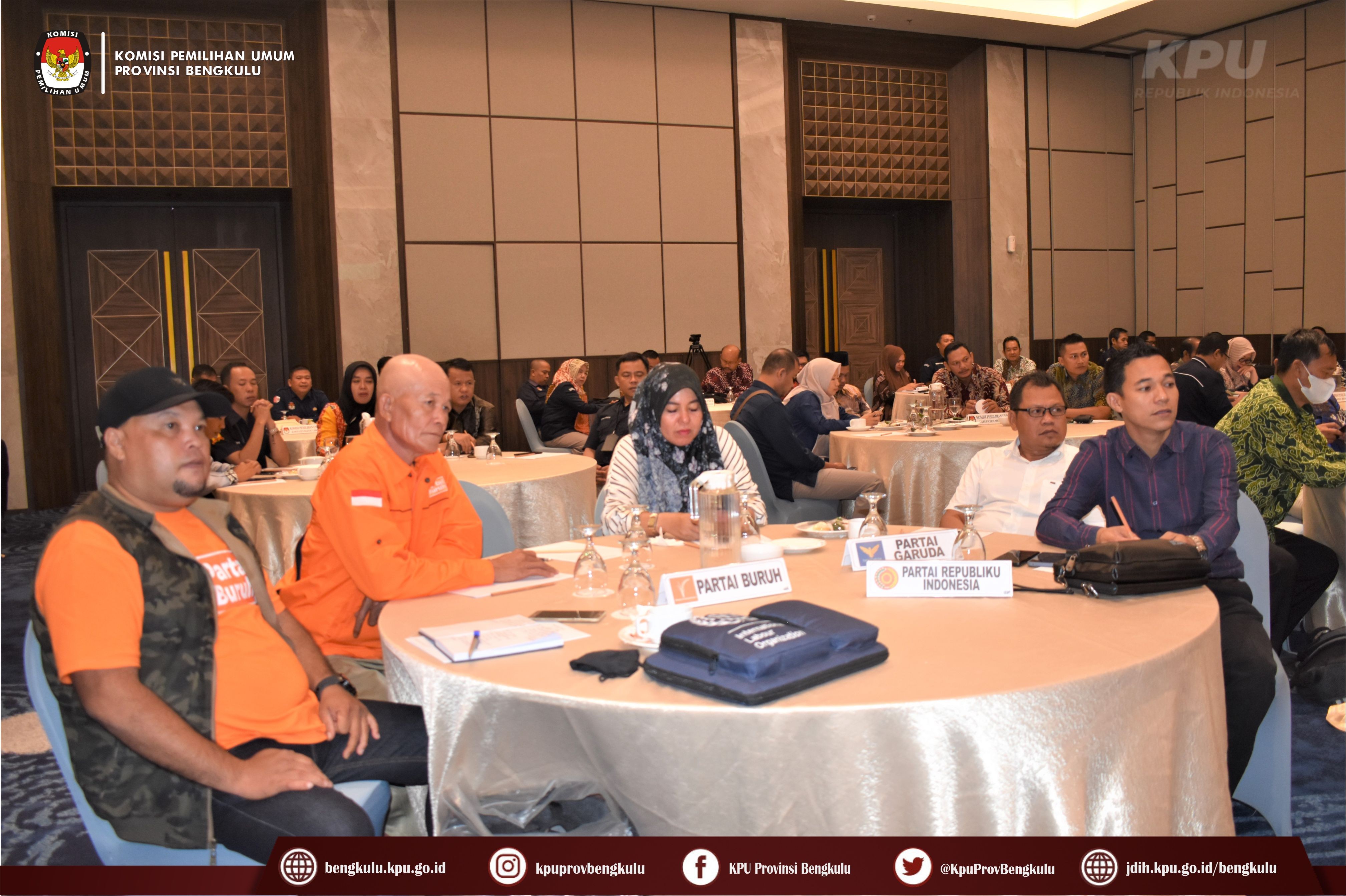 Rapat Koordinasi diikuti Ketua dan Anggota KPU Provinsi Bengkulu, Ketua, Anggota Divisi Teknis Penyelengggaraan, Anggota Divisi Perencanaan Data dan Informasi, Kasubbag TPPPHM, dan Operator/Admin KPU Kabupaten/Kota serta Pengurus Partai Politik Calon Peserta Pemilu Tahun 2024 Tingkat Provinsi Bengkulu.
