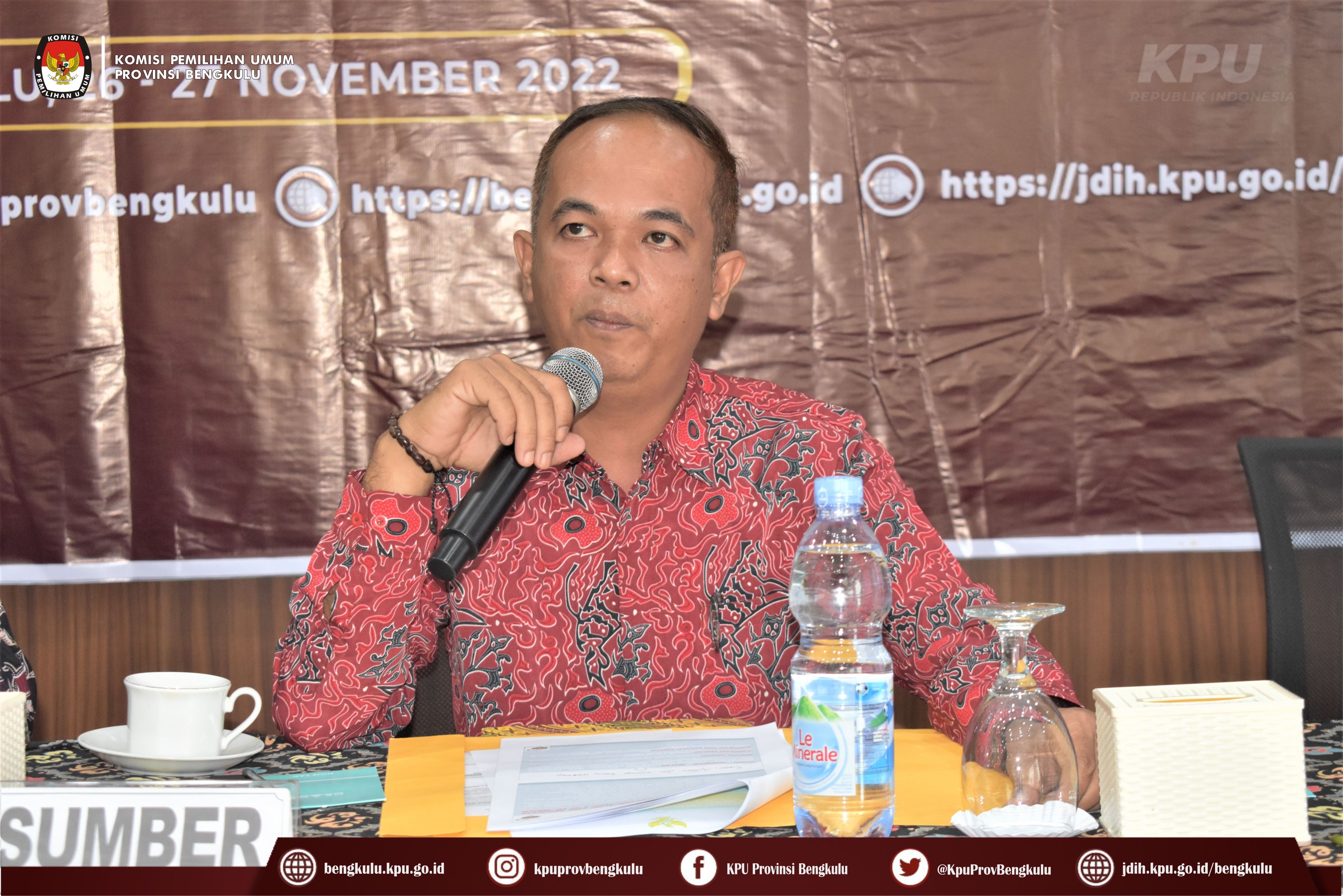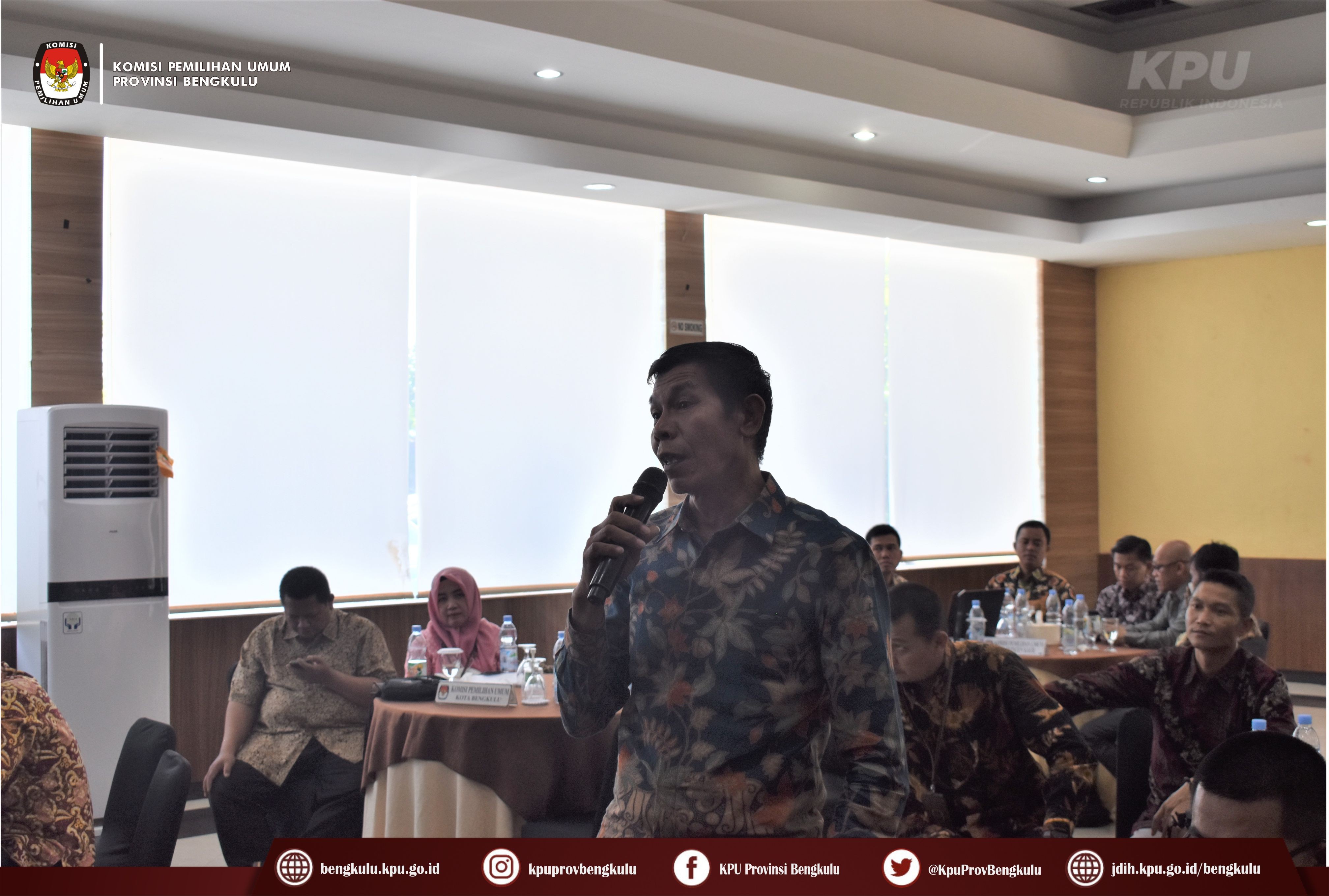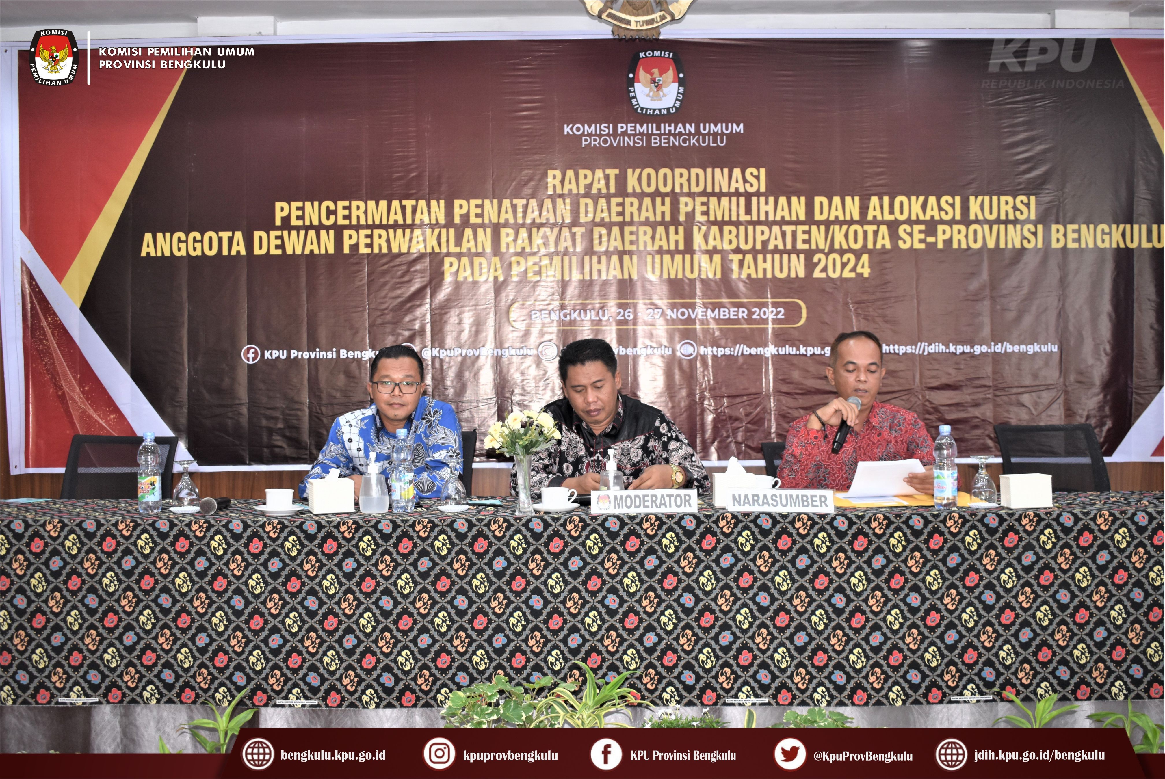 Bengkulu-bengkulu.kpu.go.id, hari kedua Minggu (27/11) Rapat Koordinasi Pencermatan Penataan Daerah Pemilihan dan Alokasi Kursi Anggota Dewan Perwakilan Rakyat Daerah Kabupaten/Kota se-Provinsi Bengkulu pada Pemilihan Umum Tahun 2024 dilanjutkan dengan penyampaian materi dari Anggota Bawaslu Provinsi Bengkulu Eko Sugianto dan Anggota KIP Bengkulu Albert Satya Jaya dan dipandu oleh Kabag TPPPHHS KPU Provinsi Bengkulu Oktan Huzaeiry secara panel. bertempat di Grage Hotel Bengkulu.
