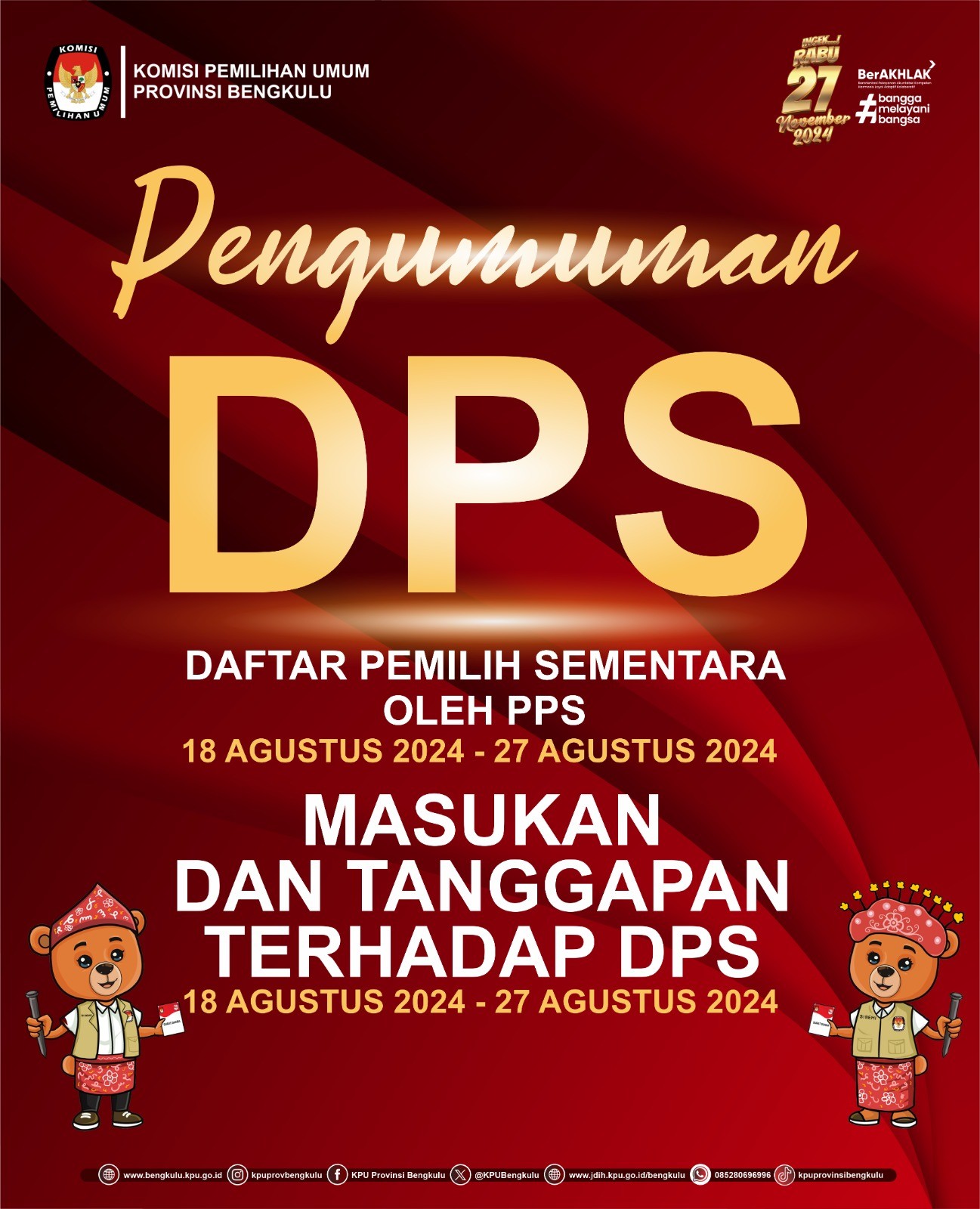 Bengkulu, bengkulu.kpu.go.id - KPU Provinsi Bengkulu mengumumkan Daftar Pemilih Sementara (DPS) oleh PPS serta Masukan dan Tanggapan Terhadap DPS pada 18 s.d 27 Agustus 2024. Jumlah DPS Provinsi Bengkulu sebanyak 1.506.003 pemilih dengan rincian laki-laki sebanyak 760.265 dan perenpuan sebanyak 745.738 pemilih yang tersebar pada 129 kecamatan, 1.513 desa/kelurahan dan 3.451 TPS.