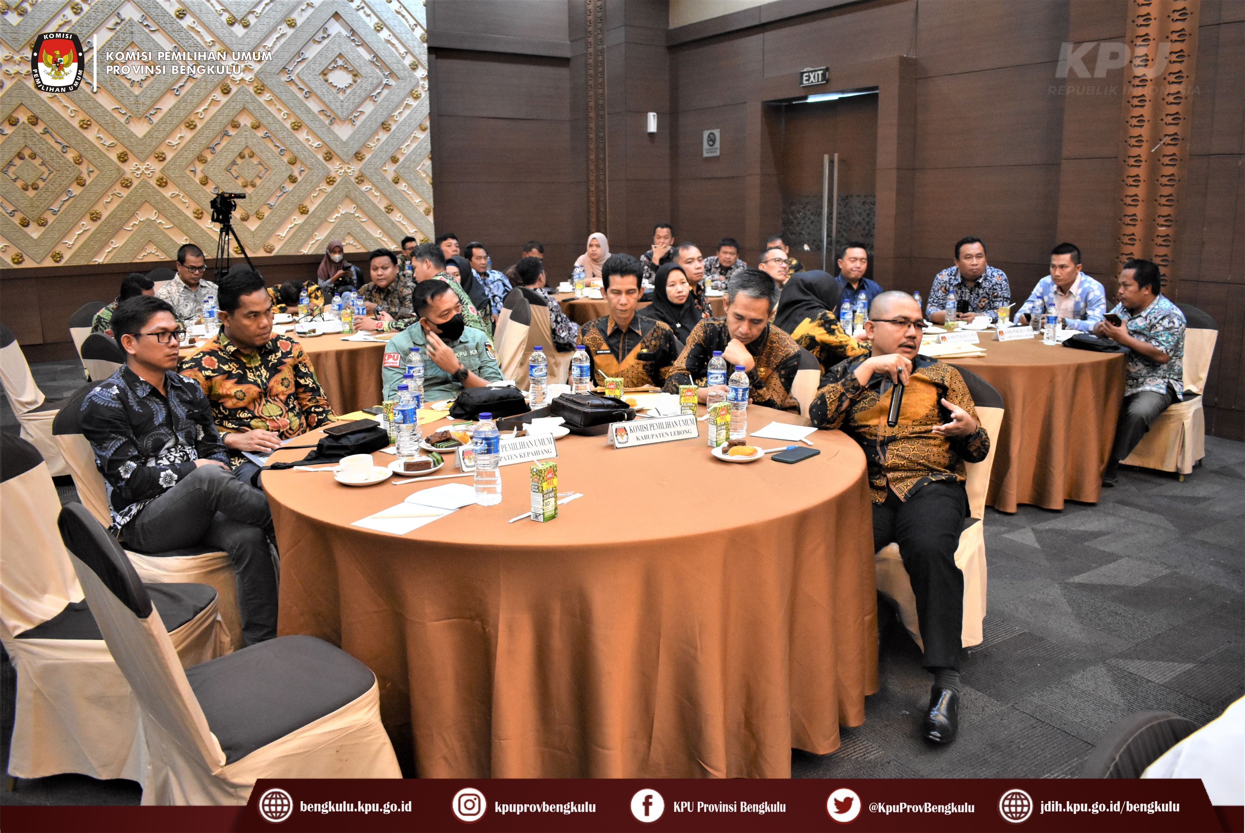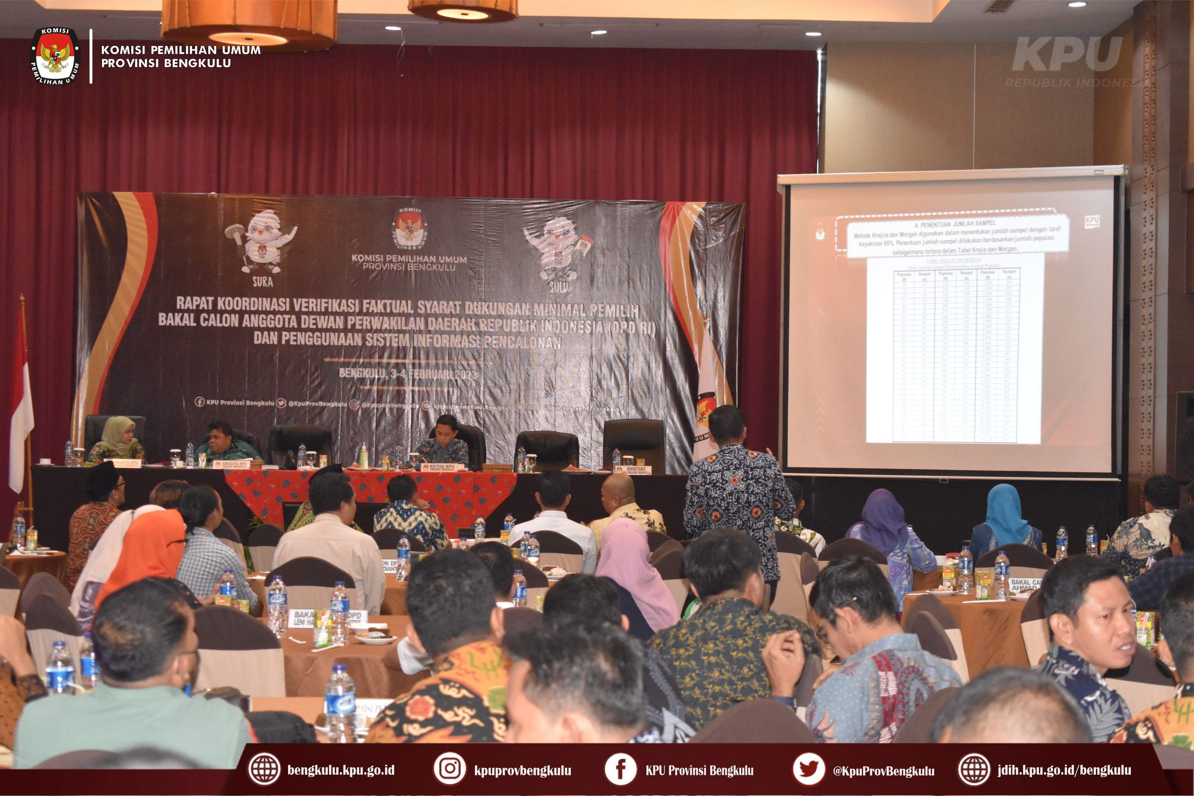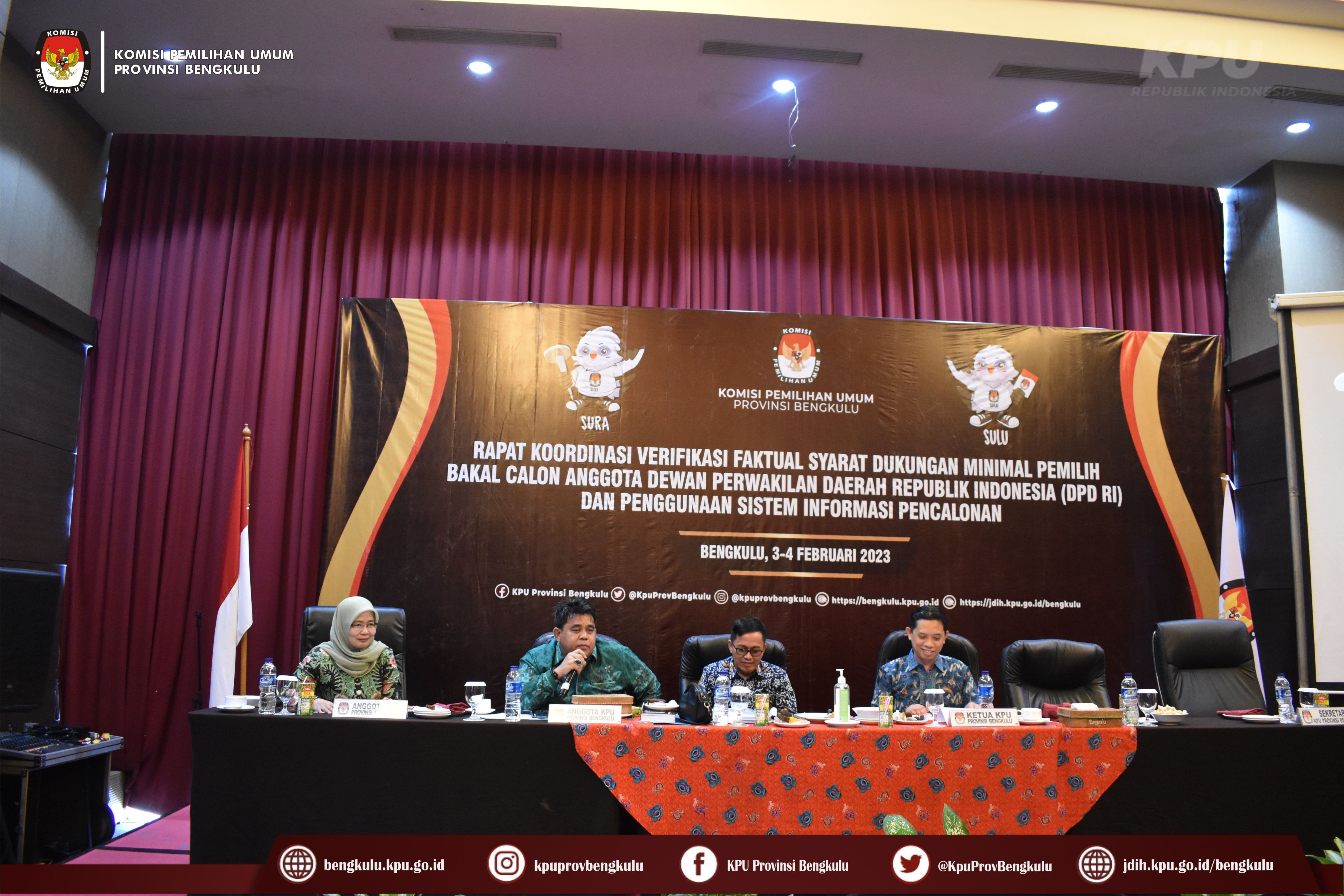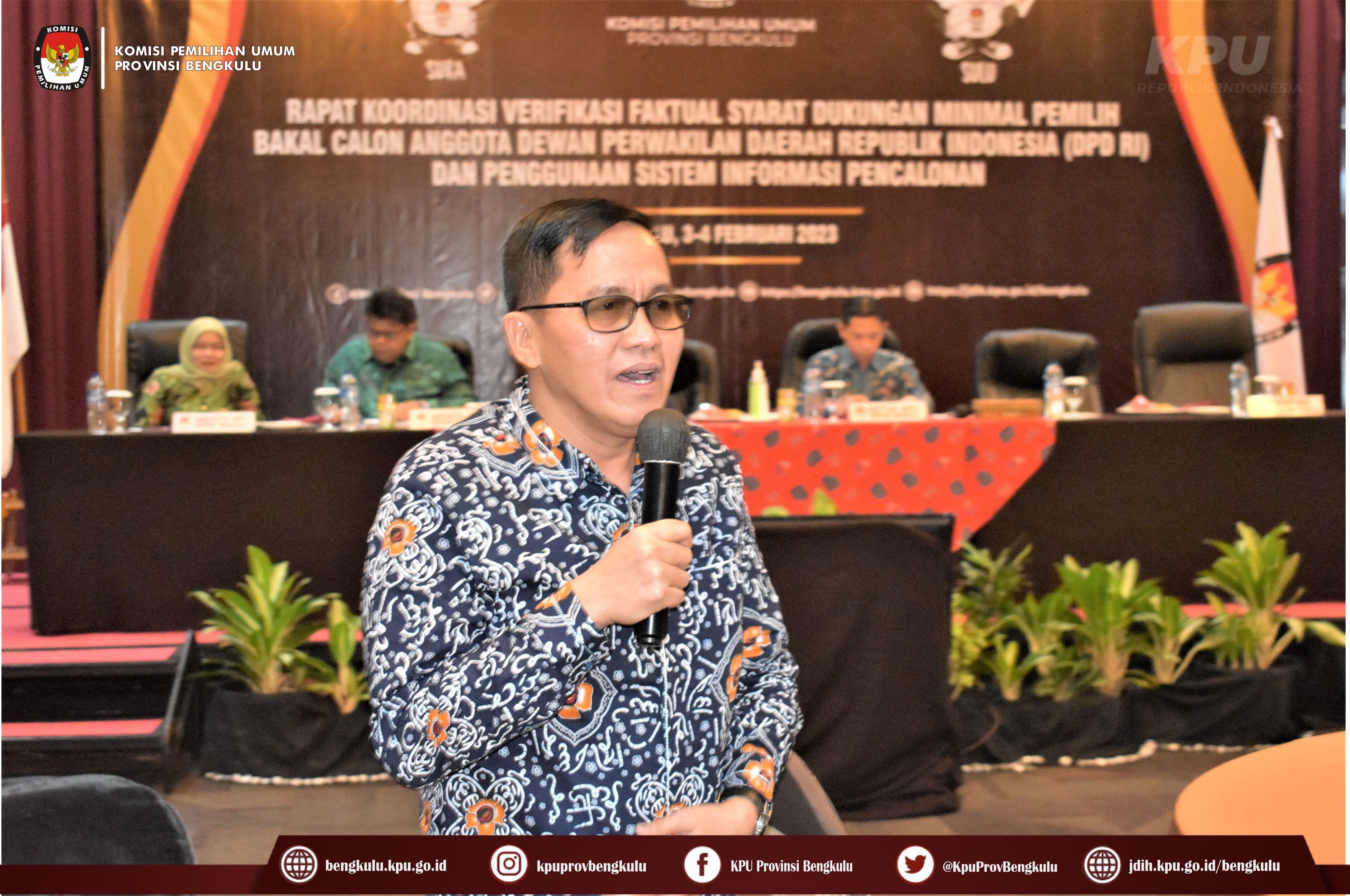Bengkulu-bengkulu.kpui.go.id, Hari kedua Sabtu (4/2/2023) kegiatan Rapat Koordinasi Verifikasi Faktual Syarat Dukungan Minimal Pemilih Bakal Calon Perseorangan Anggota Dewan Perwakilan Daerah (DPD) RI dan Penggunaan Sistem Informasi Pencalonan (SILON) dilanjutkan dengan Penyampaian Materi oleh Anggota KPU Provinsi Bengkulu Emex Verzoni dan bertindak sebagai moderator Anggota KPU Provinsi Bengkulu Darlinsyah.