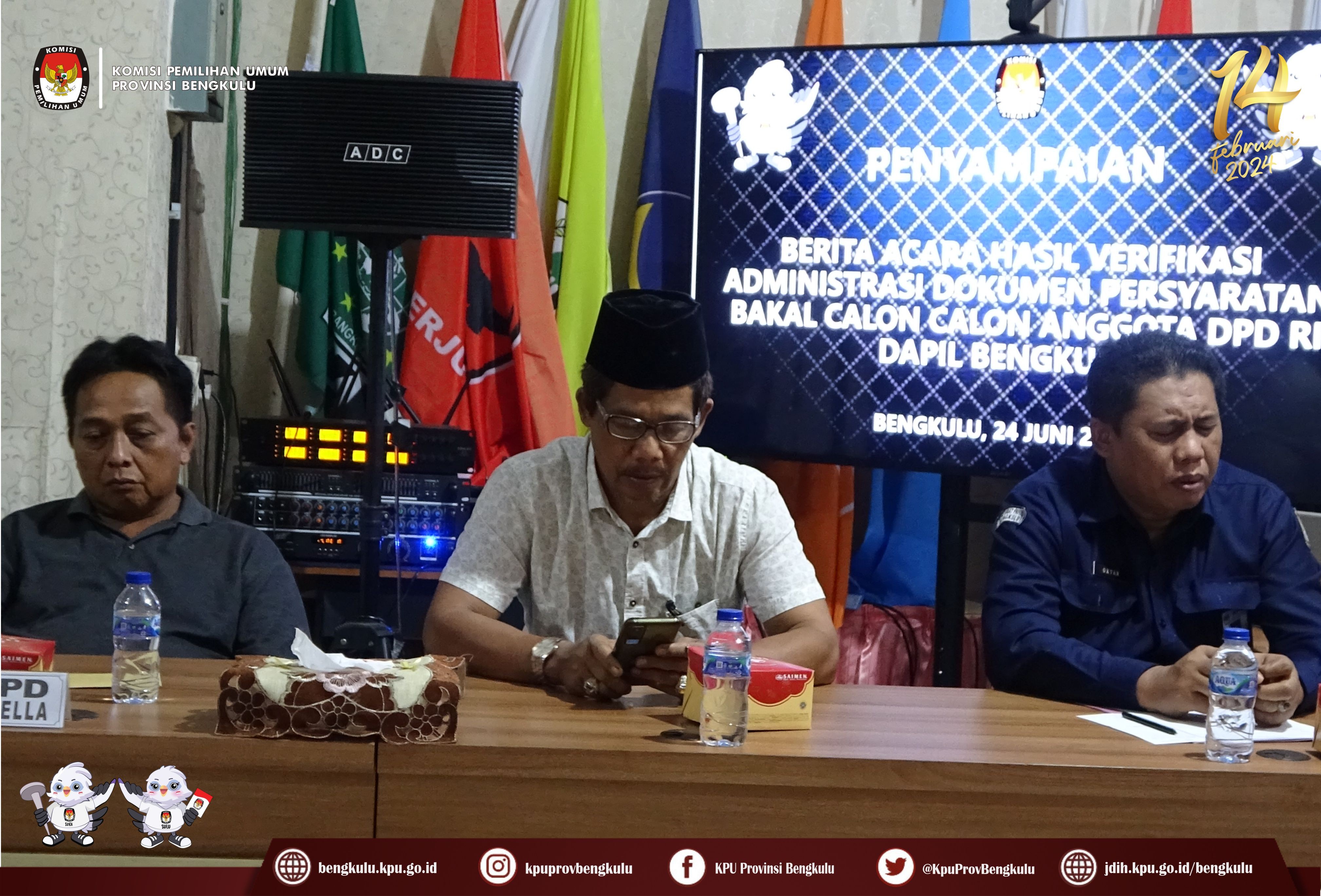 Bengkulu, bengkulu-kpu.go.id Ketua KPU Provinsi Bengkulu Rusman Sudarsono didampingi Anggota Alpin Samsen, Dodi Hendra Supiarso, dan Sarjan Efendi, serta Kabag TPPPHS Oktan Huzaeiry menyampaikan Berita Acara Hasil Verifikasi Administrasi Dokumen Persyaratan Bakal Calon Anggota Dewan Perwakilan Daerah (DPD) Daerah Pemilihan Provinsi Bengkulu pada Sabtu (24/6/2023) di Ruang RPP KPU Provinsi Bengkulu. Penyerahan Berita Acara tersebut disampaikan kepada 12 (dua belas) Bakal Calon melalui Petugas Penghubung (LO) yang disaksikan Anggota Bawaslu Provinsi Bengkulu Natijo Elem.