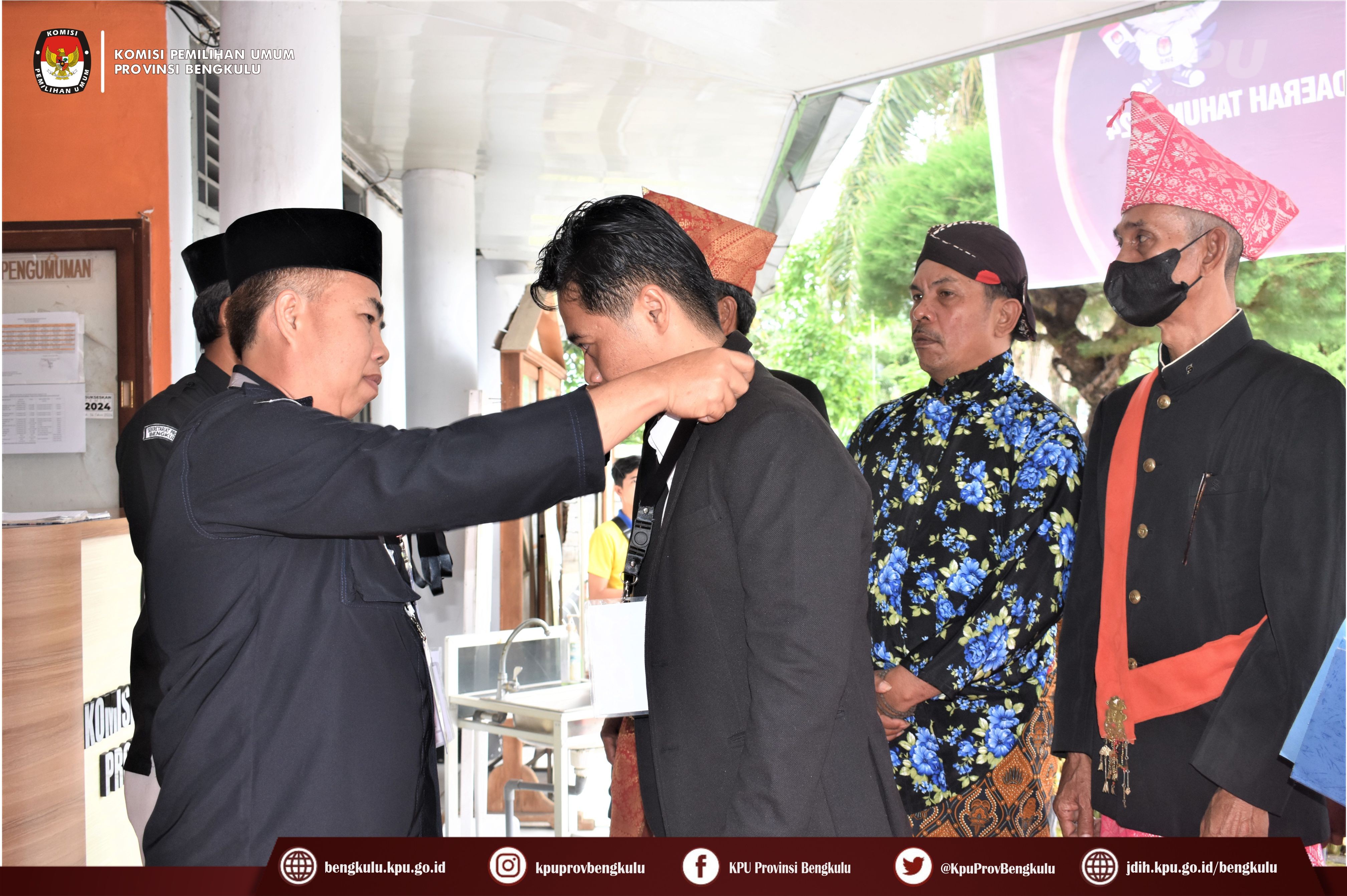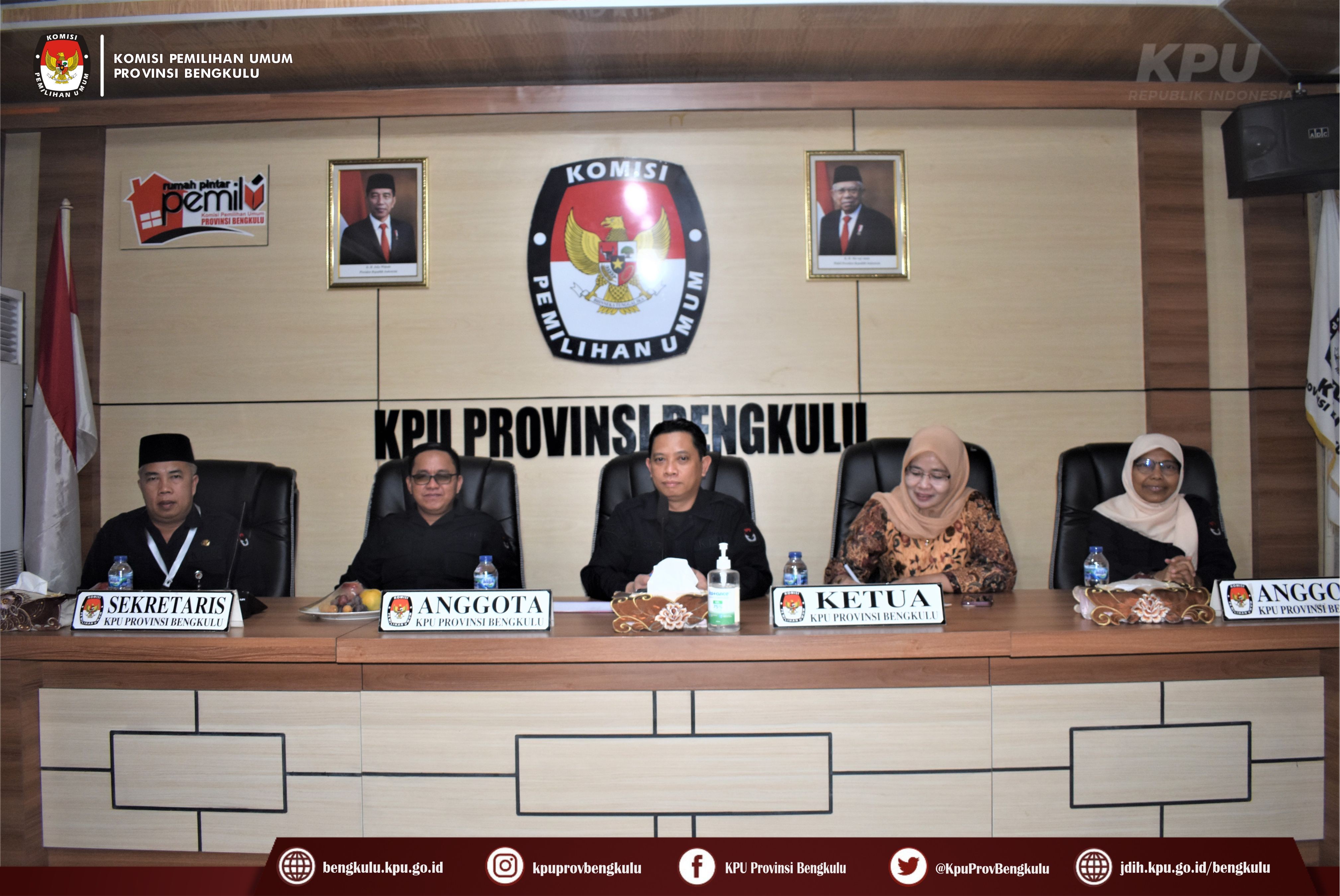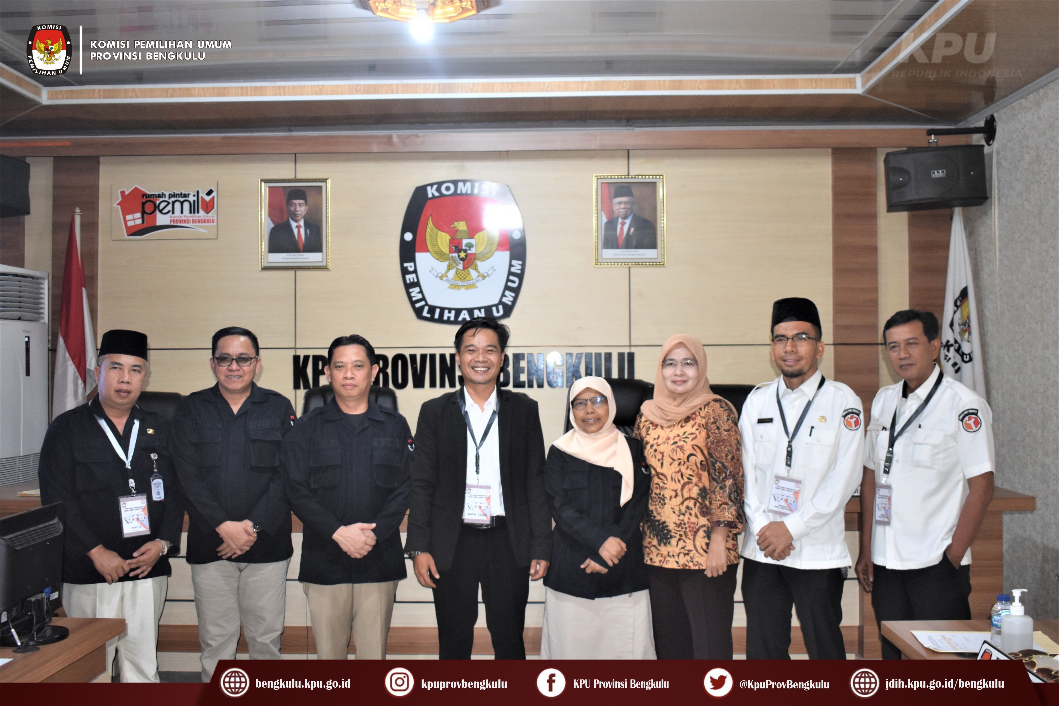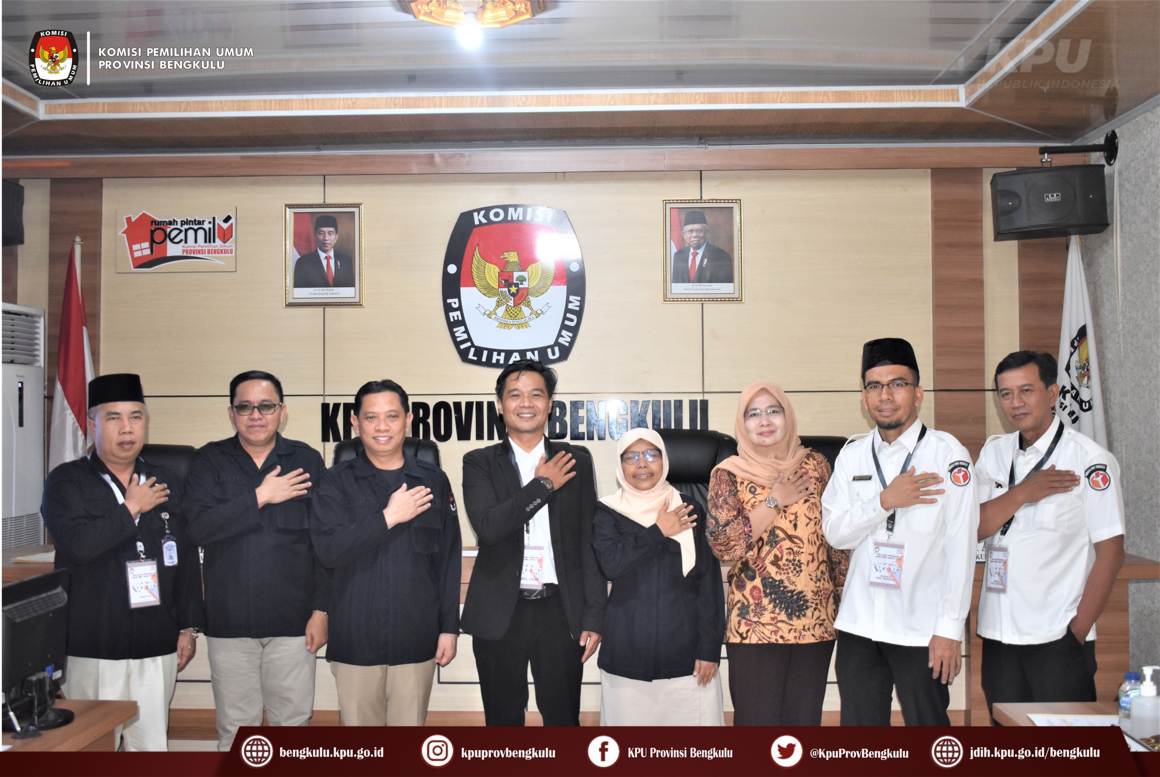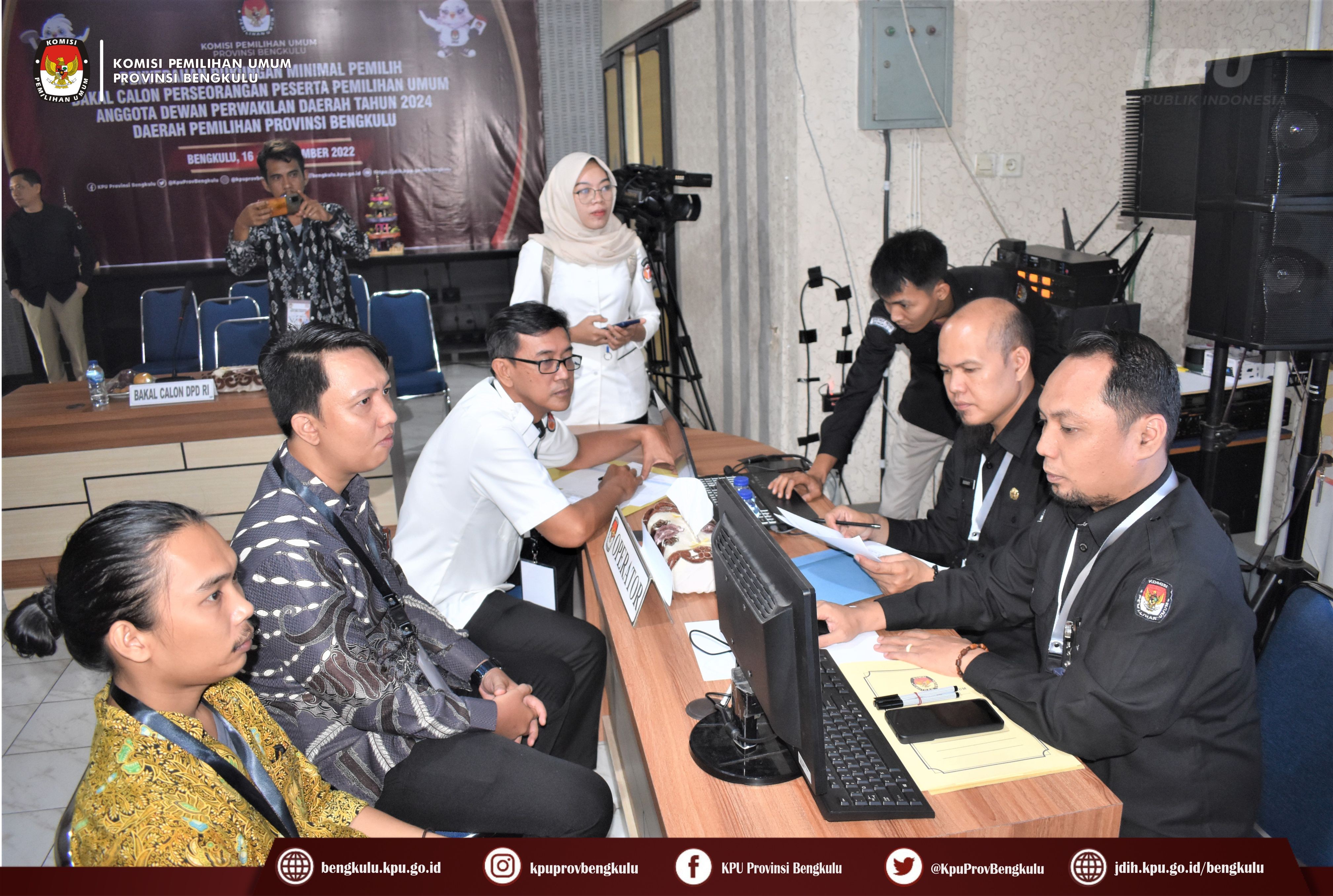 Bengkulu-bengkulu.kpu.go.id, Ketua KPU Provinsi Bengkulu Irwan Saputra bersama Anggota Siti Baroroh, Emex Verzoni, dan Irna Riza Yuliastuty serta Plh. Sekretaris Sudirman menerima Penyerahan Dukungan Minimal Pemilih Bakal Calon Perseorangan Peserta Pemilihan Umum Anggota Dewan Perwakilan Daerah (DPD) Tahun 2024 Daerah Pemilihan Provinsi Bengkulu atas nama Def Tri Hardianto di Ruang Audio Visual Rumah Pintar Pemilu, Rabu (28/12).