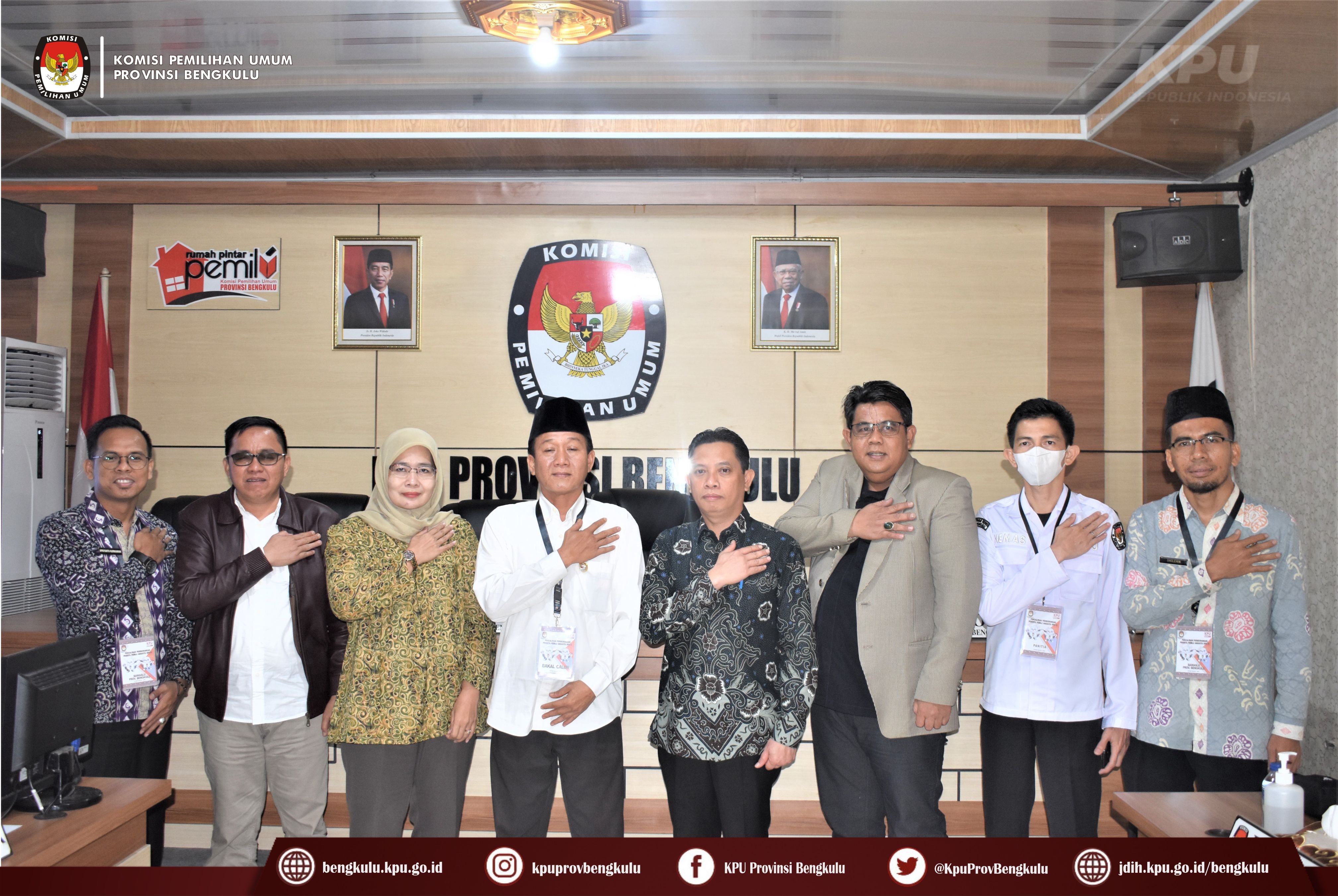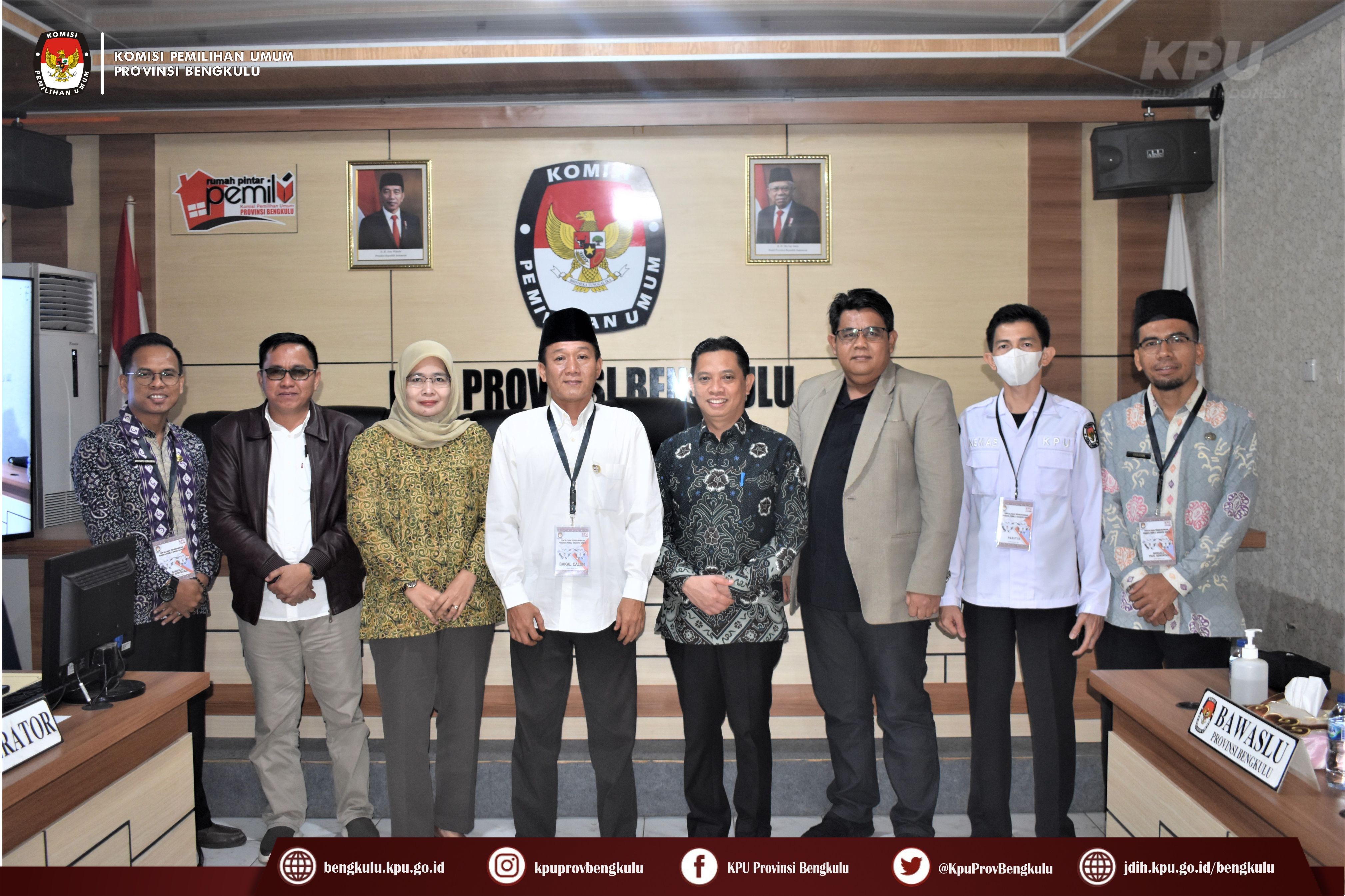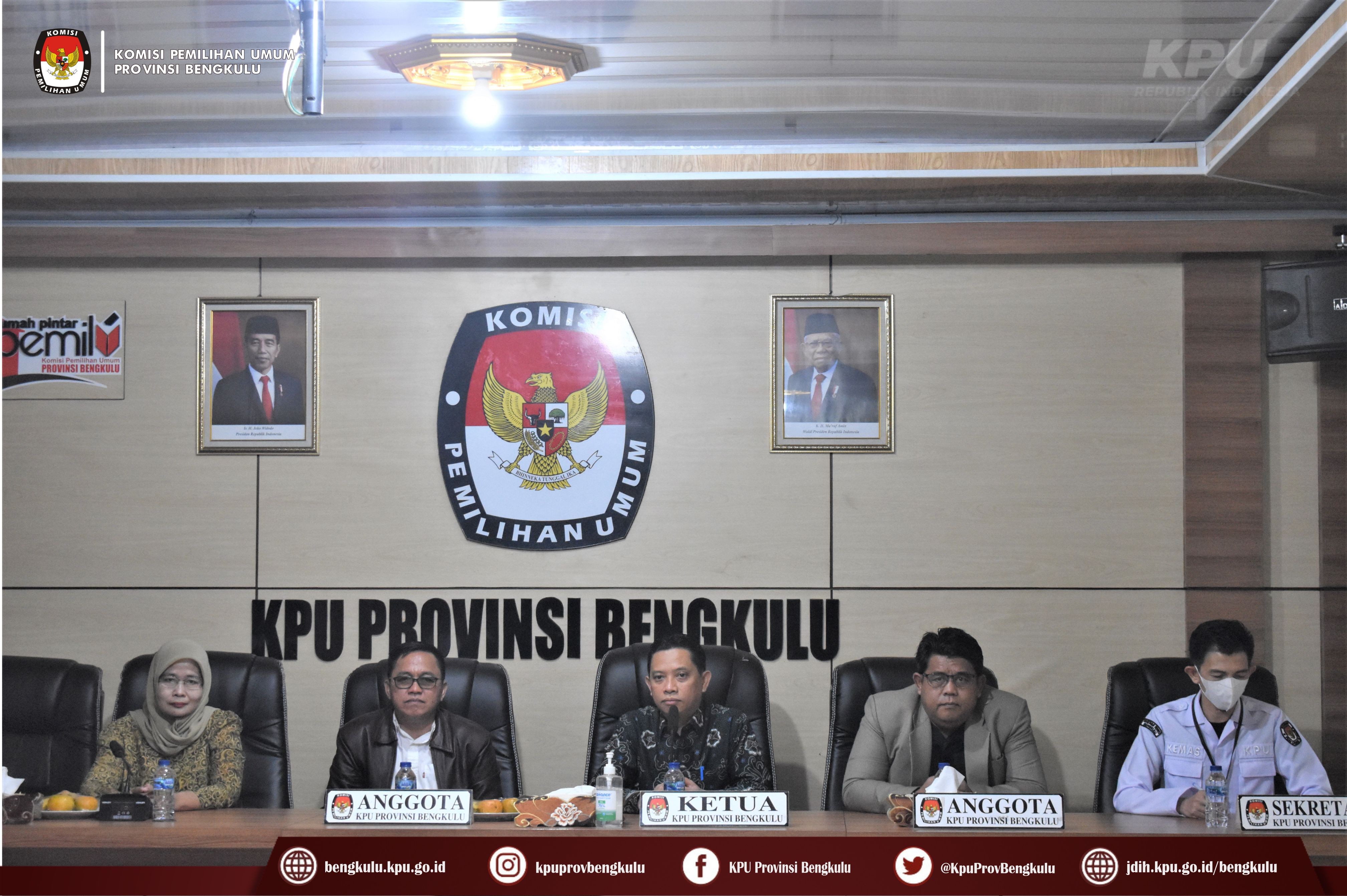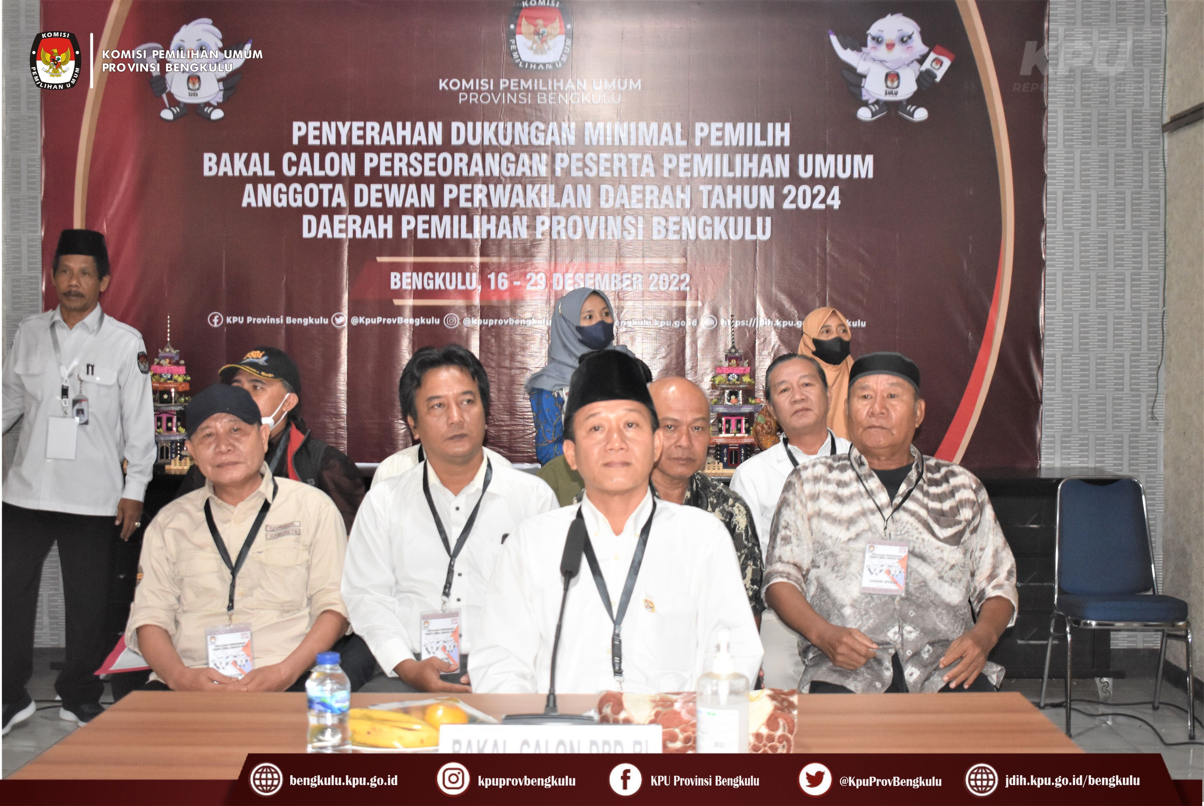 Bengkulu-bengkulu.kpu.go.id, Ketua KPU Provinsi Bengkulu Irwan Saputra bersama Anggota KPU Provinsi Bengkulu Darlinsyah, Emex Verzoni, dan Irna Riza Yuliastuty serta Sekretaris Kemas Mohammad Ajir menerima Penyerahan Dukungan Minimal Pemilih Bakal Calon Perseorangan Peserta Pemilihan Umum Anggota Dewan Perwakilan Daerah (DPD) Tahun 2024 Daerah Pemilihan Provinsi Bengkulu atas nama Edi Agusdin di Ruang Audio Visual Rumah Pintar Pemilu, Kamis (29/12).
