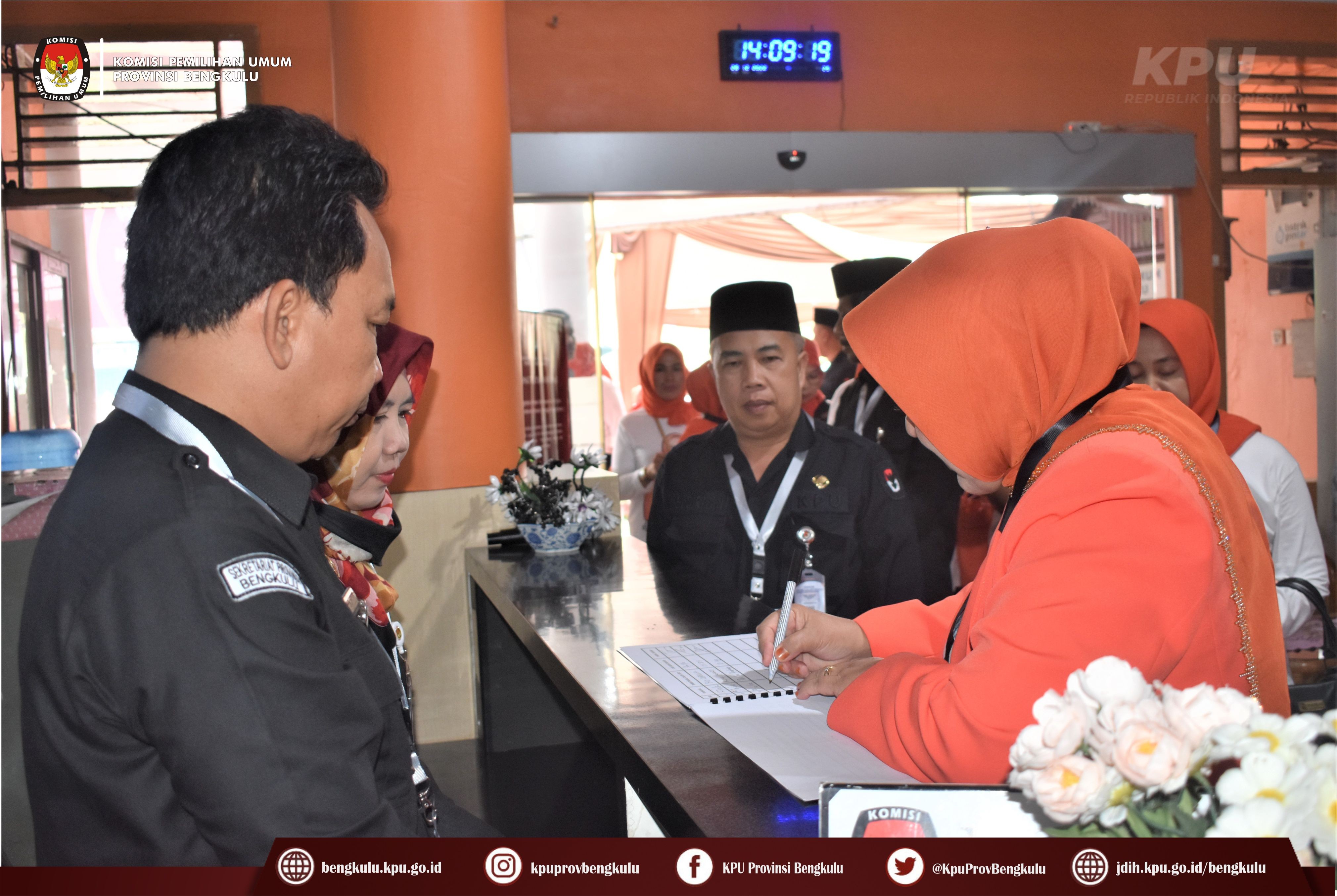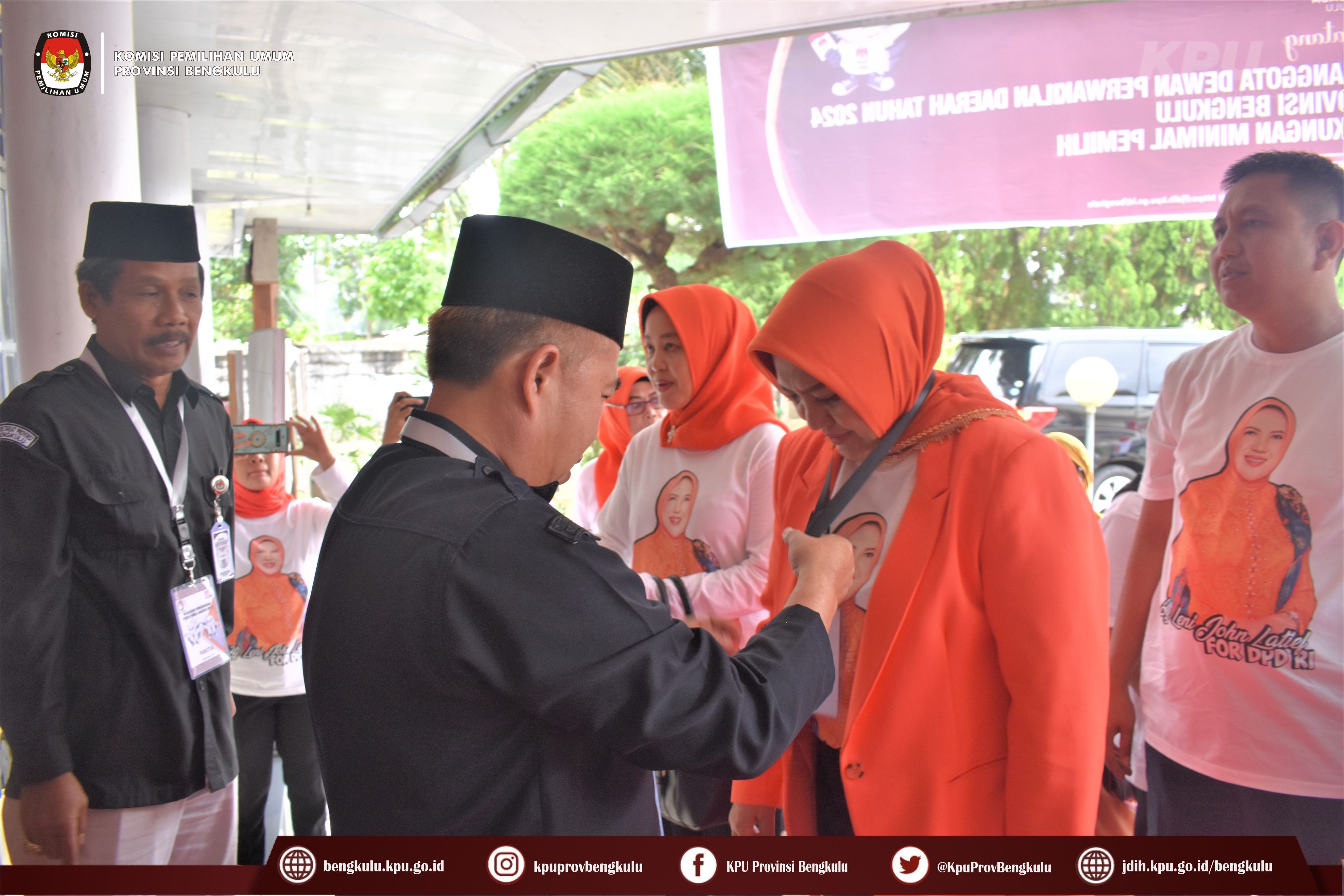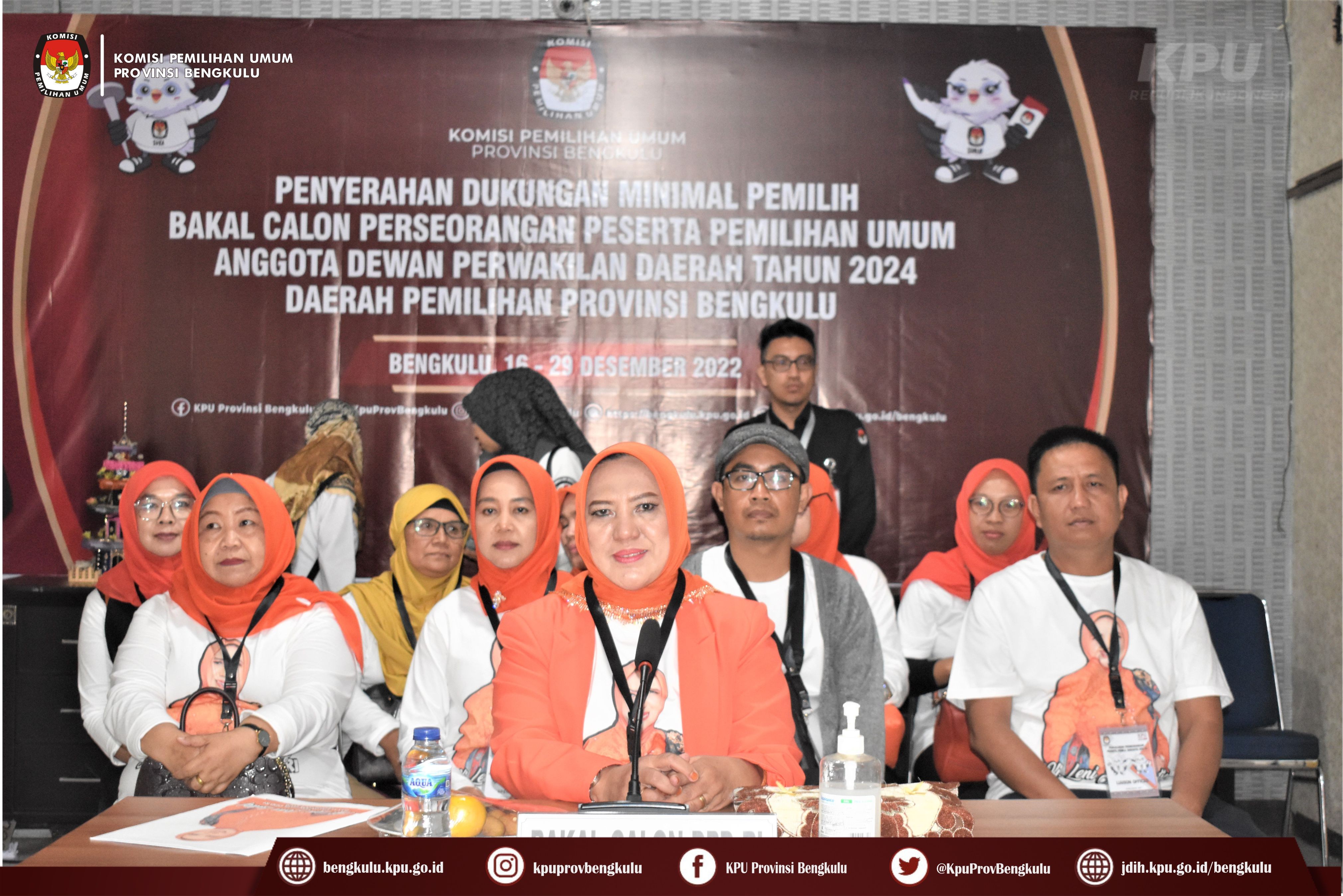 Bengkulu-bengkulu.kpu.go.id, Ketua KPU Provinsi Bengkulu Irwan Saputra bersama Anggota Siti Baroroh, Emex Verzoni, dan Irna Riza Yuliastuty serta Plh. Sekretaris Sudirman menerima Penyerahan Dukungan Minimal Pemilih Bakal Calon Perseorangan Peserta Pemilihan Umum Anggota Dewan Perwakilan Daerah (DPD) Tahun 2024 Daerah Pemilihan Provinsi Bengkulu atas nama Hj. Leni Maryati John Latief, SE.,M.Si di Ruang Audio Visual Rumah Pintar Pemilu, Rabu (28/12).