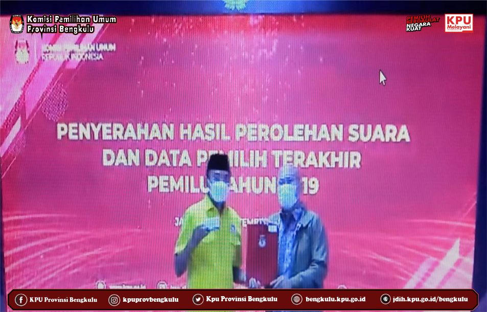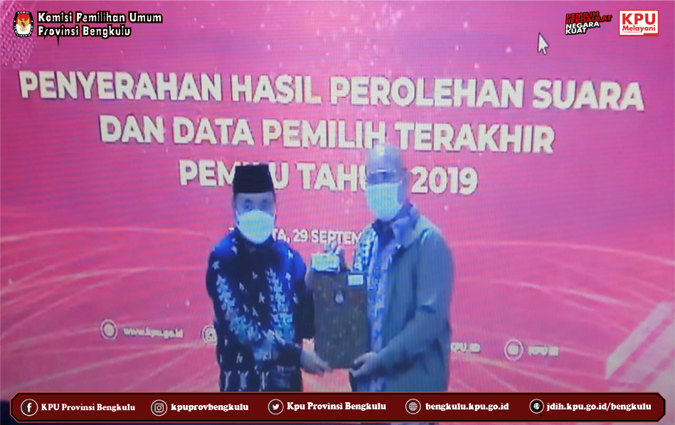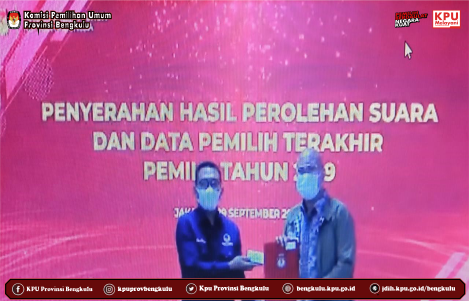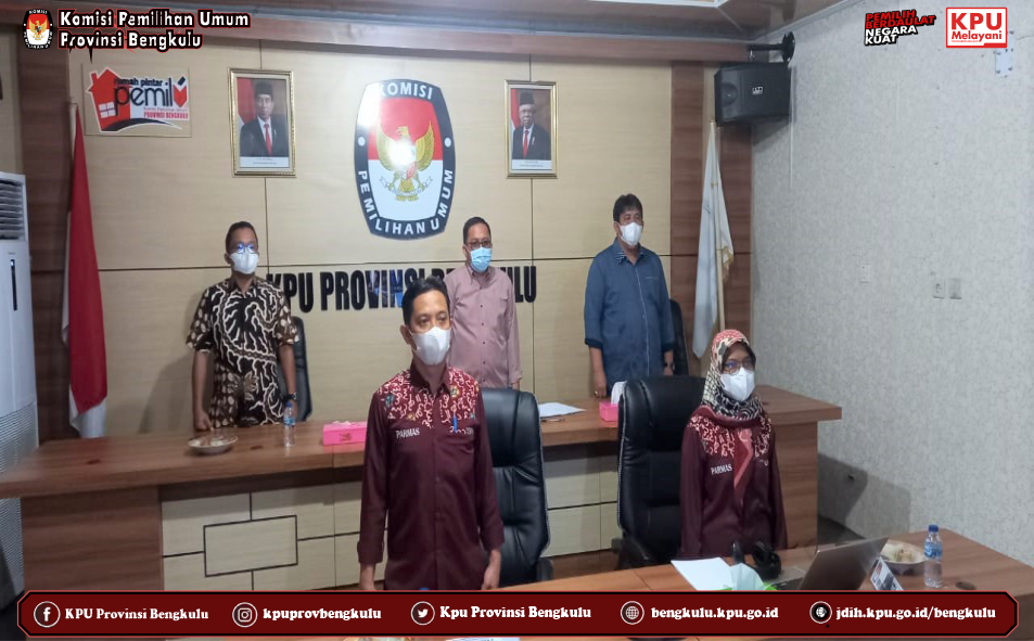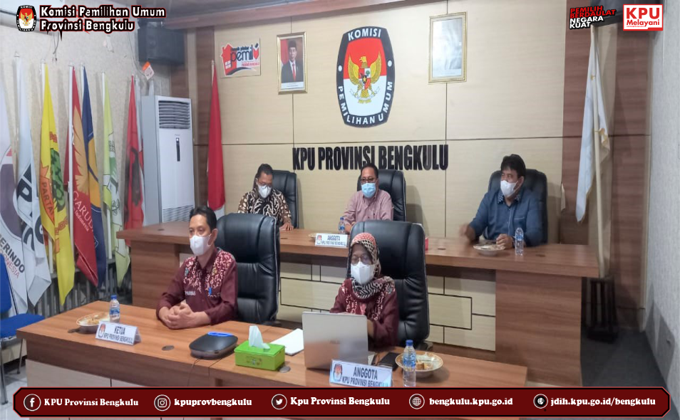 Ketua KPU Provinsi Bengkulu Irwan Saputra dan Anggota Eko Sugianto, Siti Baroroh, Darlinsyah dan Emex Verzoni mengikuti acara Penyerahan Hasil Perolehan Suara dan Data Pemilih Terakhir Pemilu Tahun 2019 yang diselenggarakan oleh KPU Republik Indonesia secara daring (zoom meeting) pada Rabu (29/9). Acara yang dibuka langsung oleh Ketua KPU RI Bapak Ilham Saputra didampingi Anggota KPU RI Bapak Arif Budiman dihadiri perwakilan pimpinan 16 (enam belas) parpol nasional dan 4 (empat) parpol Aceh serta Bawaslu RI.