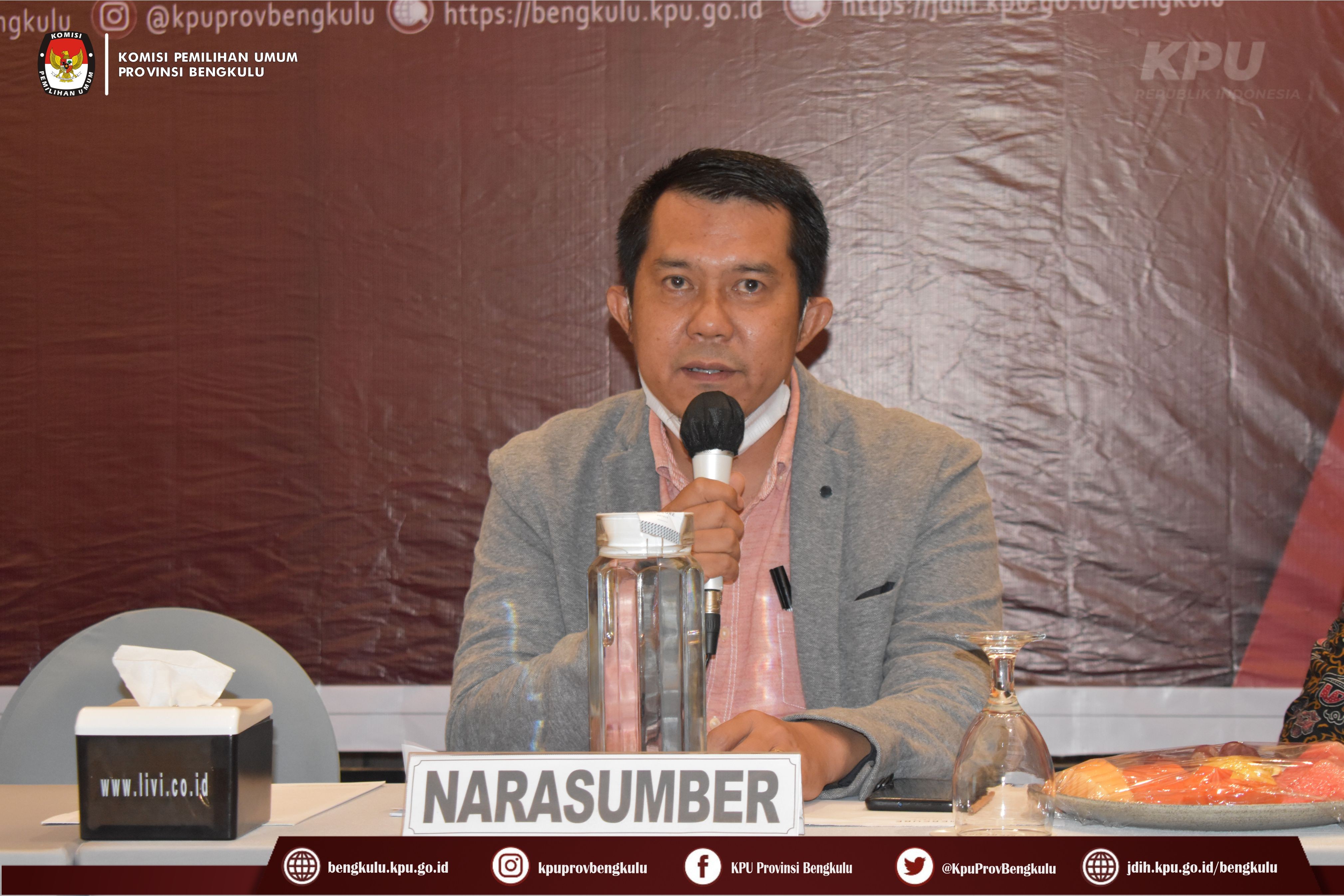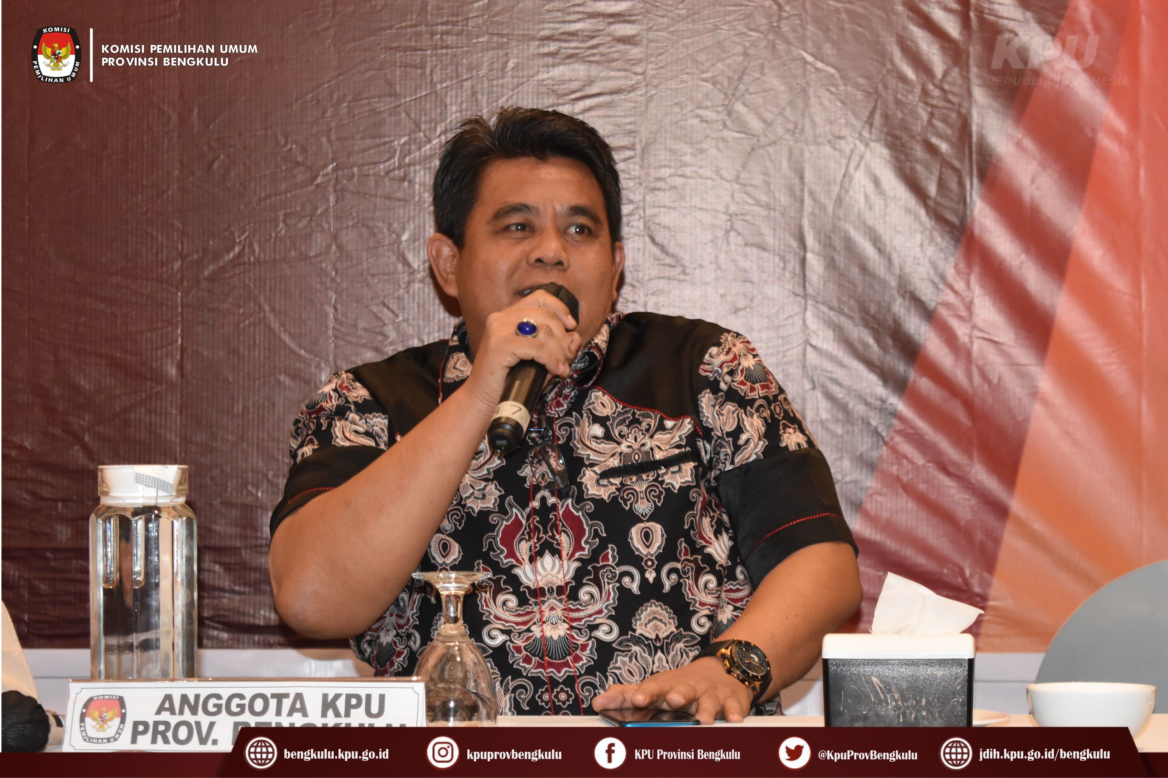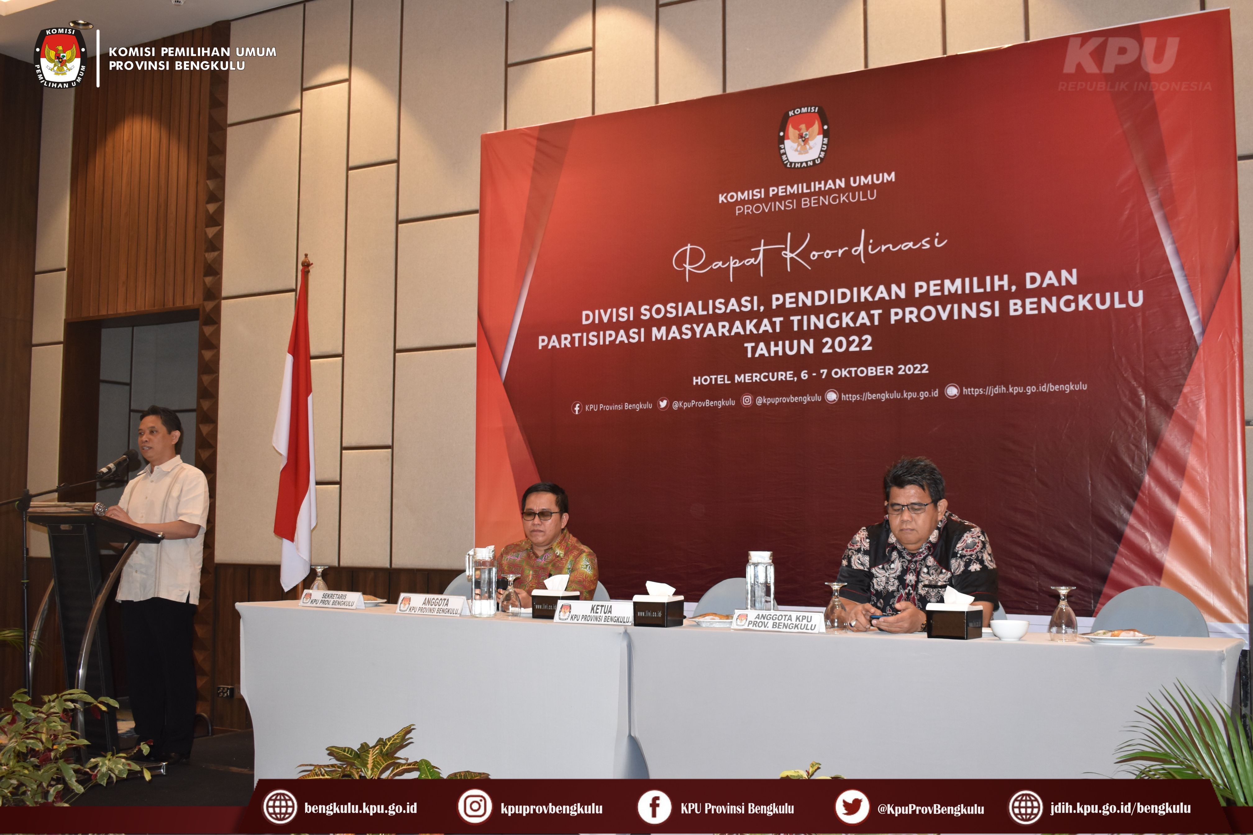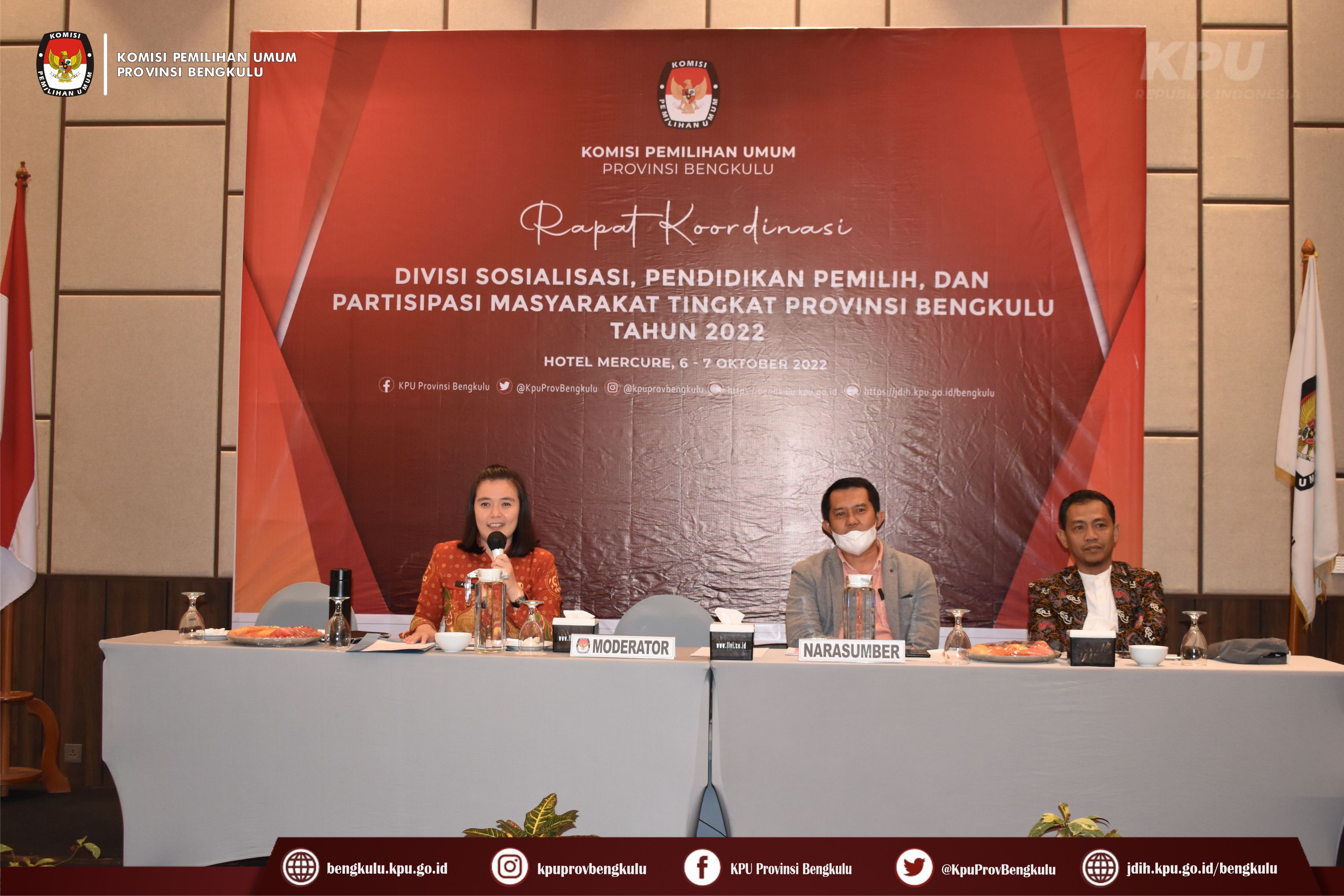 Bengkulu-bengkulu.kpu.go.id, Hari kedua Jum’at (7/10) kegiatan Rapat Koordinasi Divisi Sosialisasi, Pendidikan Pemilih dan Partisipasi Masyarakat Tingkat Provinsi Bengkulu Tahun 2022 di Mercure Hotel Bengkulu dilanjutkan dengan penyampaian materi dengan metode diskusi panel dari Anggota Bawaslu Provinsi Bengkulu Dodi Herwansyah dan General Manager BETV Bengkulu Susanto, serta bertindak sebagai Moderator Kasubbag Umum dan Logistik KPU Provinsi Bengkulu Angky Galaty.
