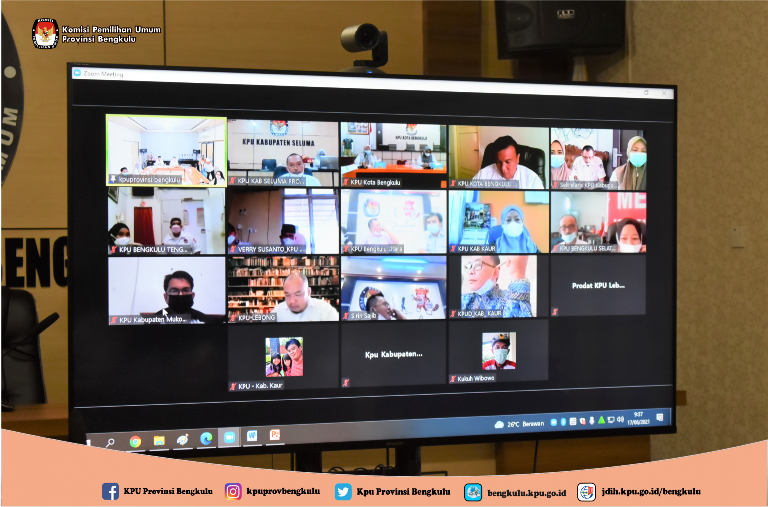 Anggota KPU Provinsi Bengkulu Darlinsyah, dan Sekretaris Kemas M Ajir, Kabag PDOS Hamzah dan Kasubbag Program dan Data Azmiyatun melaksanakan Rapat Persiapan Evaluasi Sistem Akuntabilitas Kinerja Pemerintah (SAKIP) bersama KPU Kabupaten/Kota Se-Provinsi Bengkulu pada Kamis (17/6) secara Daring (zoom meeting) bertempat di Ruang Audio Visual Rumah Pintar Pemilu. Rapat ini diikuti Sekretaris, Kasubbag dan Operator KPU Kabupaten/Kota yang membidangi.