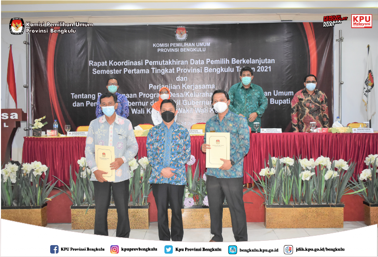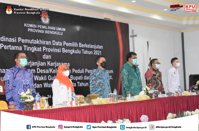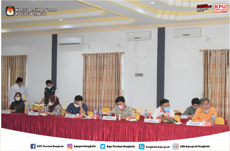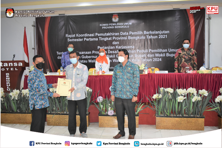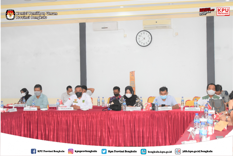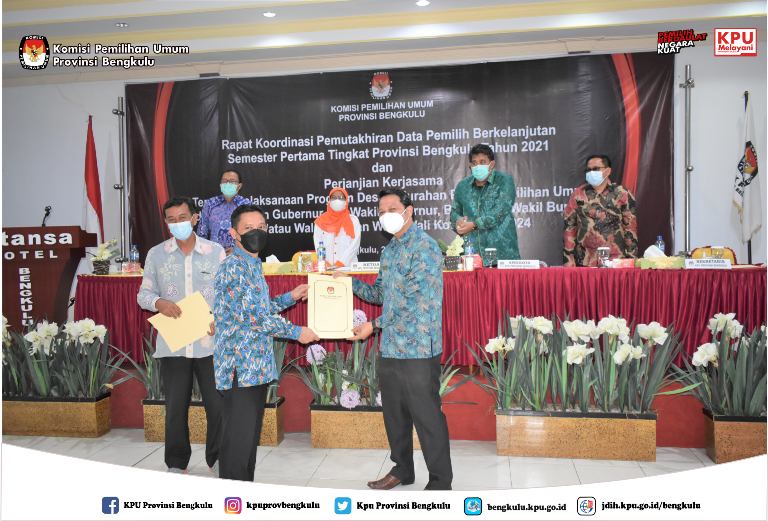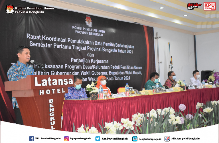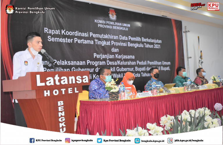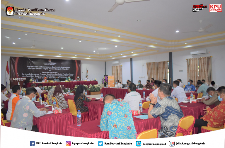 KPU Provinsi Bengkulu pada Kamis (24/6) menggelar Rapat Koordinasi Pemutakhiran Data Pemilih Berkelanjutan Semester Pertama Tingkat Provinsi Bengkulu Bertempat di Hotel Latansa Bengkulu. Rapat Koordinasi ini dihadiri unsur Bawaslu Provinsi, Polda, Korem 041 Gamas, Dinas Dukcapil Provinsi, Pengadilan Tinggi, Kanwil Kemenkumham dan Pimpinan/Petugas Penghubung Parpol Peserta Pemilu Tahun 2019 Tingkat Provinsi. Acara dibuka langsung Ketua KPU Provinsi Bengkulu didampingi Anggota Eko Sugianto, Siti Baroroh, Darlinsyah, dan Emex Verzoni, serta Sekretaris Kemas M Ajir. Rangkaian acara diisi dengan penyampaian materi dari Anggota KPU Provinsi Bengkulu Siti Baroroh mengenai Pemutakhiran Data Pemilih Berkelanjutan (PDPB) Provinsi Bengkulu dalam persiapan menjelang Pemilihan Umum Tahun 2024. Selain itu, acara juga diisi dengan diskusi dalam rangka mendapatkan masukan dan saran dari peserta yang hadir serta Penyampaian DPB Provinsi Bengkulu Semester Pertama Tahun 2021 secara simbolis kepada Bawaslu Provinsi Bengkulu dan Dinas Dukcapil Provinsi Bengkulu.