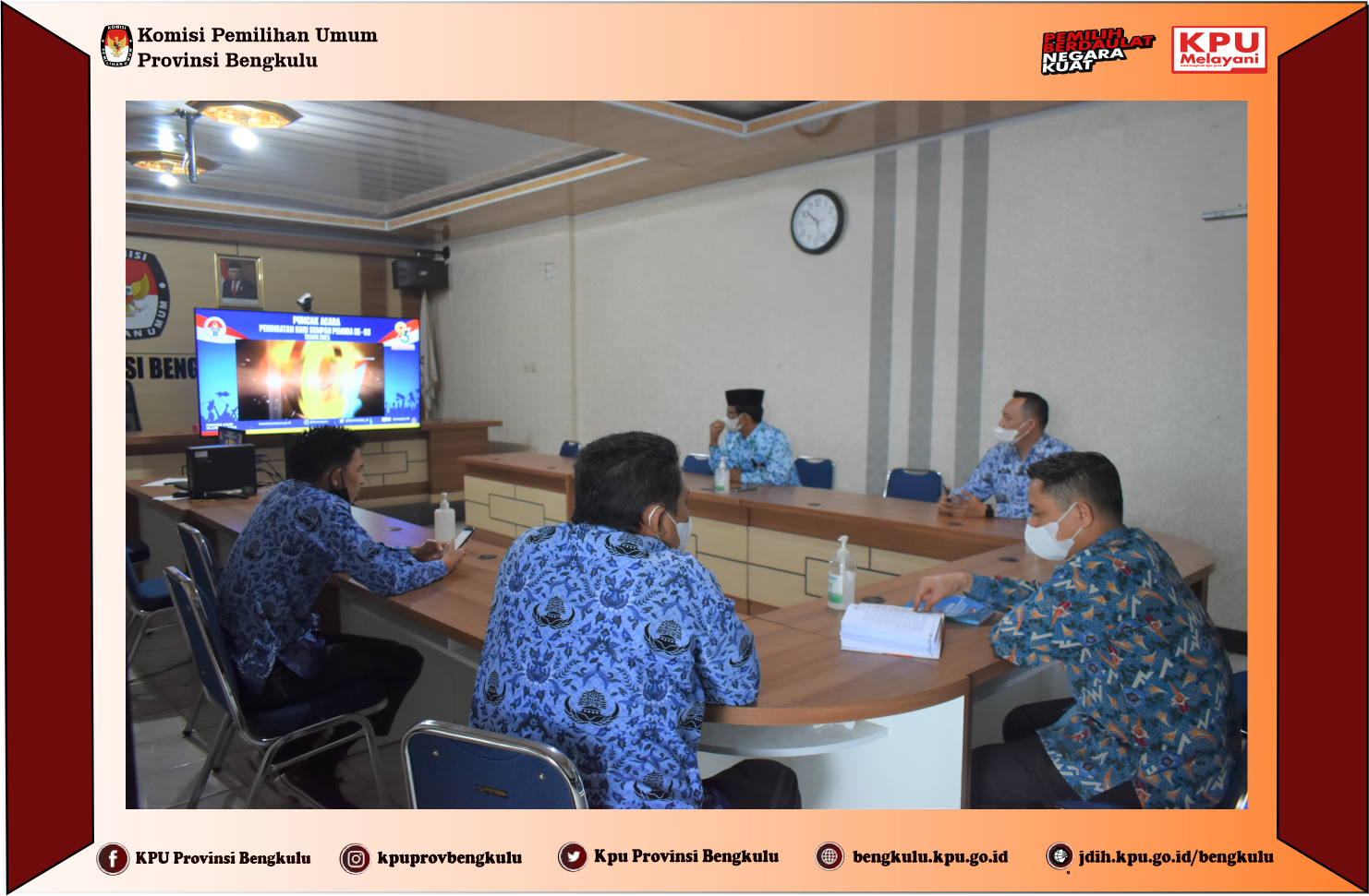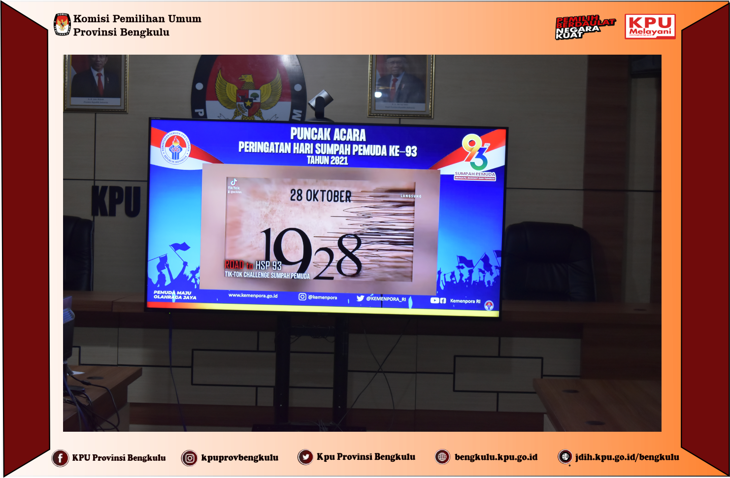 Ketua KPU Provinsi Bengkulu Irwan Saputra, Sekretaris Kemas M Ajir serta Kabag dan Kasubbag di Lingkungan KPU Provinsi Bengkulu mengikuti Rangkaian Pucnak Acara Peringatan Hasi Sumpah Pemuda ke-93, 28 Oktober 2021 yang diselenggarakan oleh Kementerian Pemuda dan Olahraga Republik Indonesia secara daring (zoom meeting).