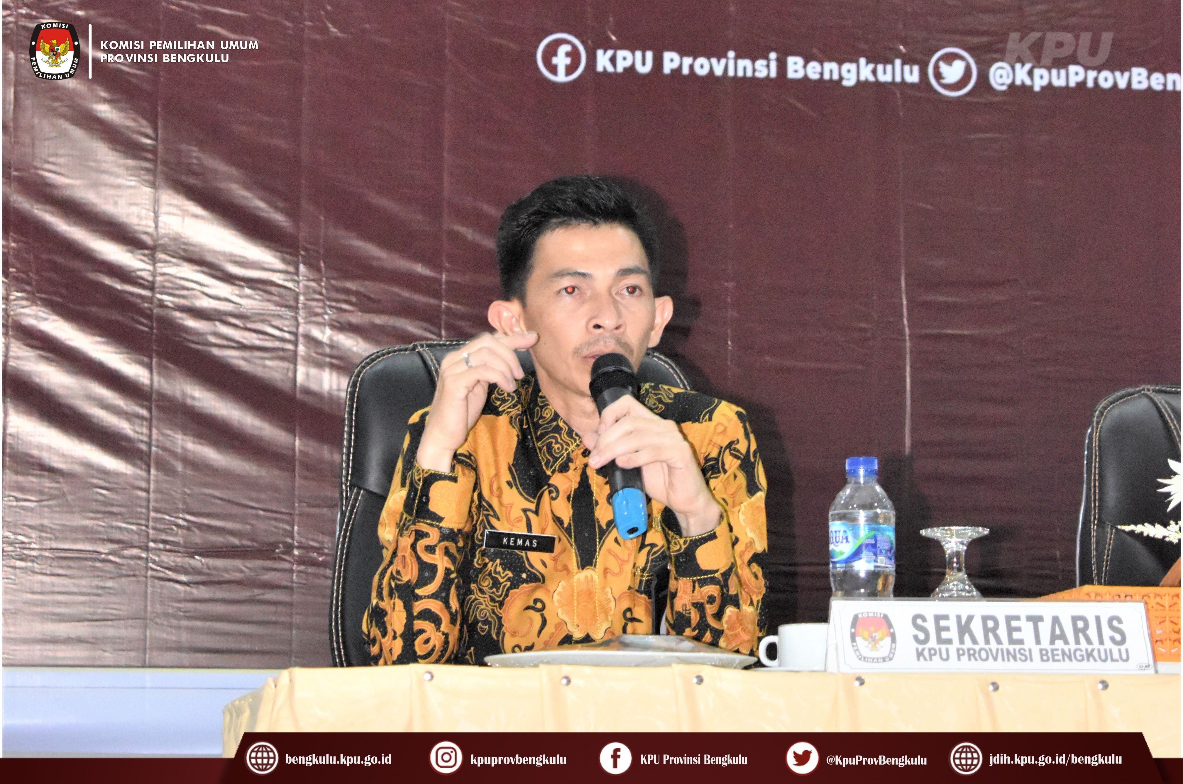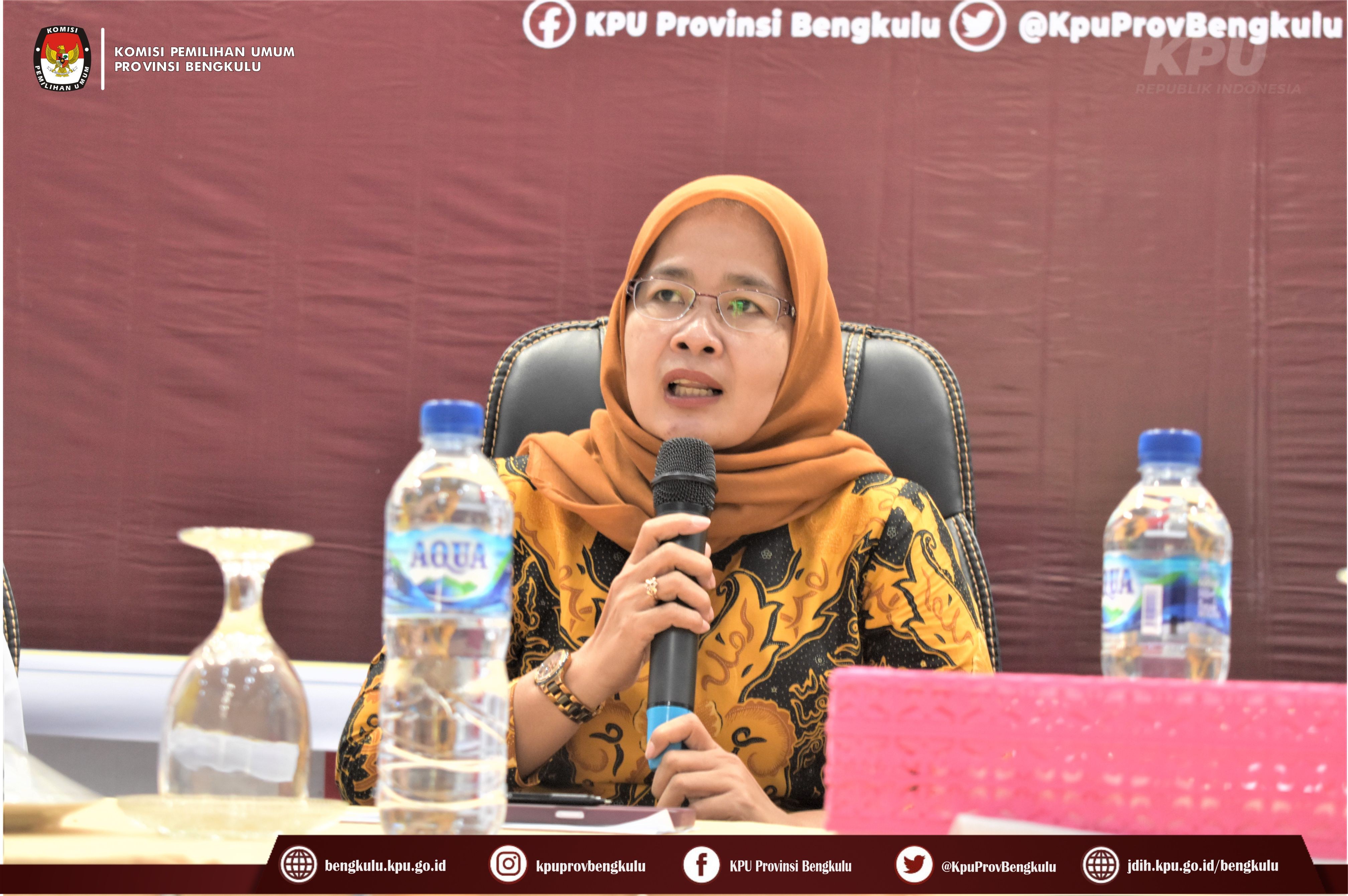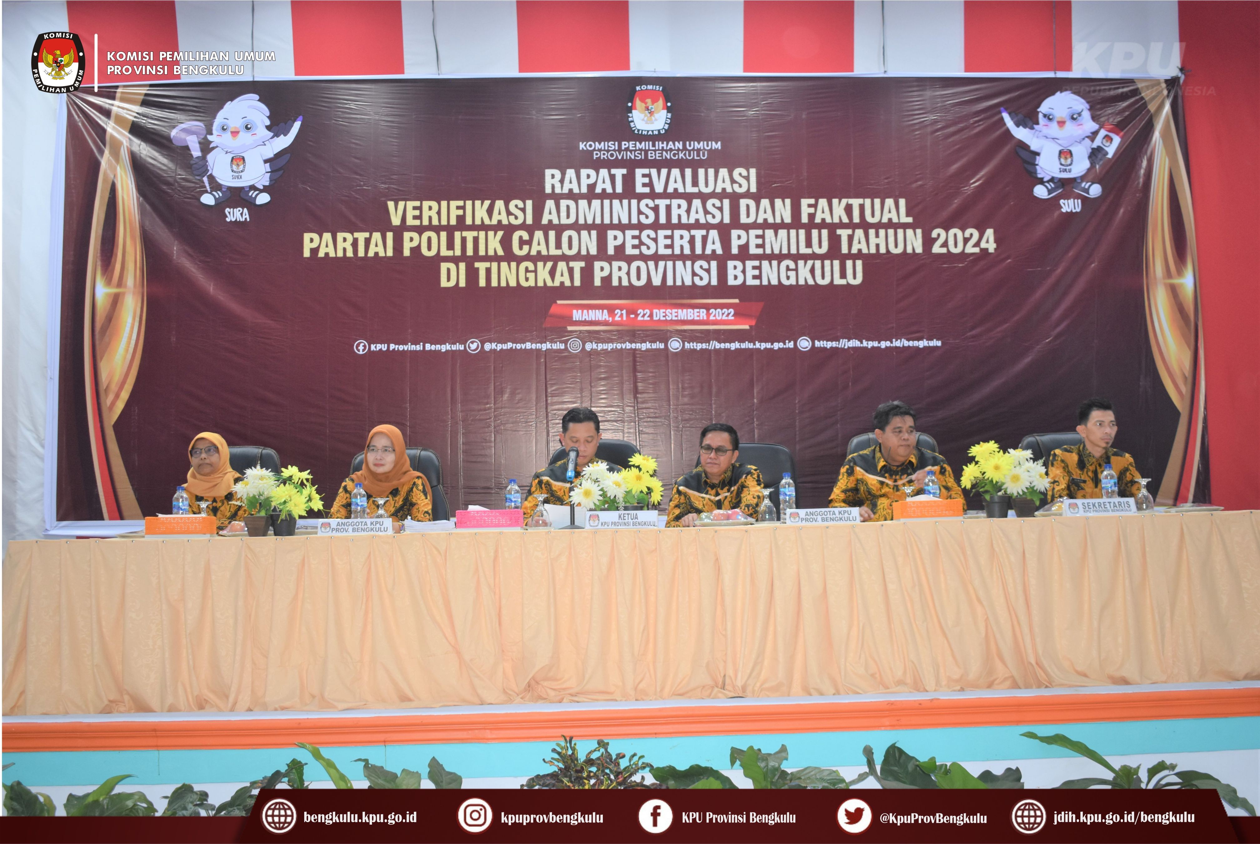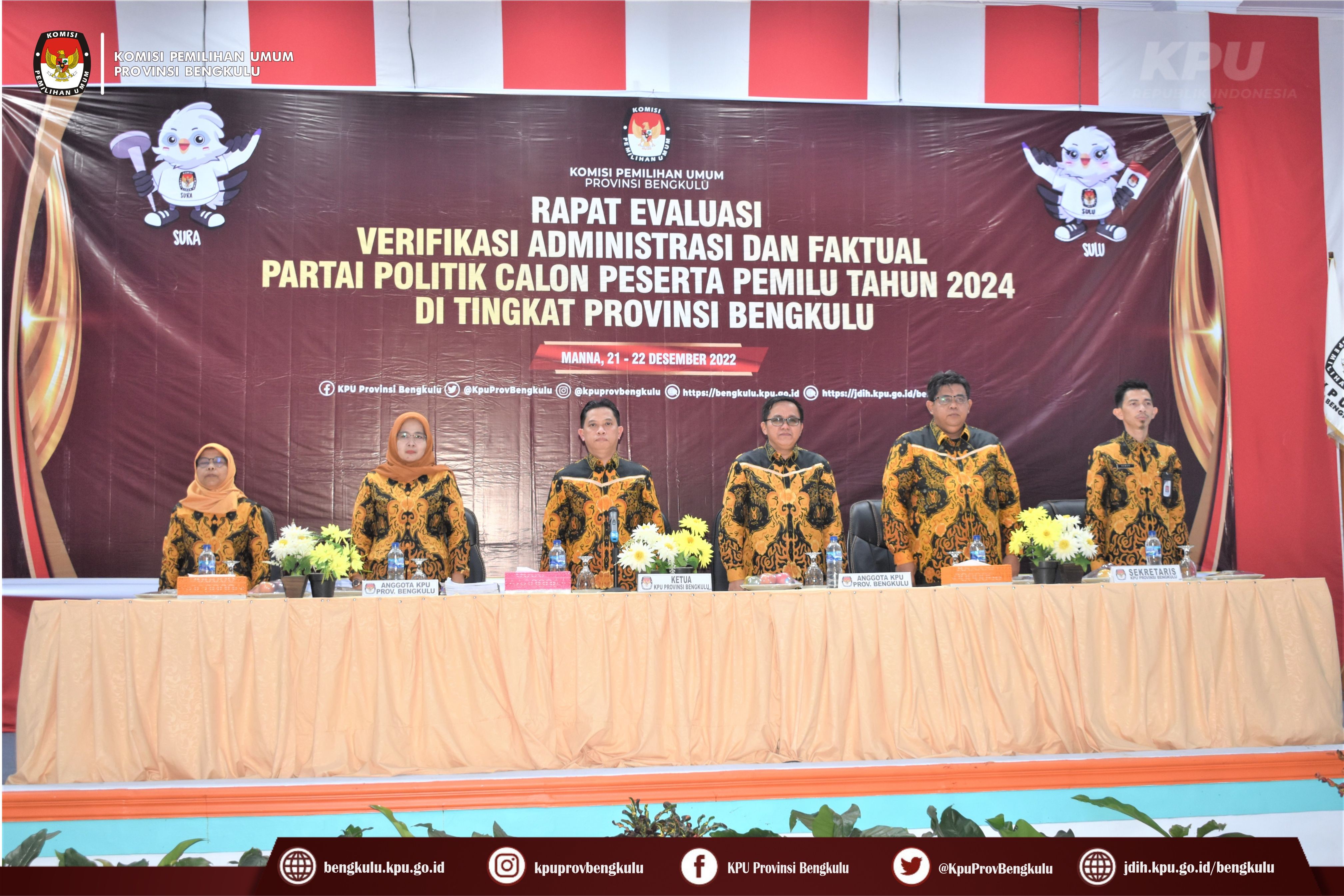 Bengkulu-bengkulu.kpu.go.id, Ketua KPU Provinsi Bengkulu Irwan Saputra dan Anggota KPU Provinsi Bengkulu Siti Baroroh, Darlinsyah, Emex Verzoni dan Irna Riza Yuliastuty serta Sekretaris Kemas Mohammad Ajir membuka Rapat Evaluasi Verifikasi Administrasi dan Faktual Partai Politik Calon Peserta Pemilu Tahun 2024 Tingkat Provinsi Bengkulu di Hotel Seven One Kota Kabupaten Bengkulu Selatan, Rabu (21/12).