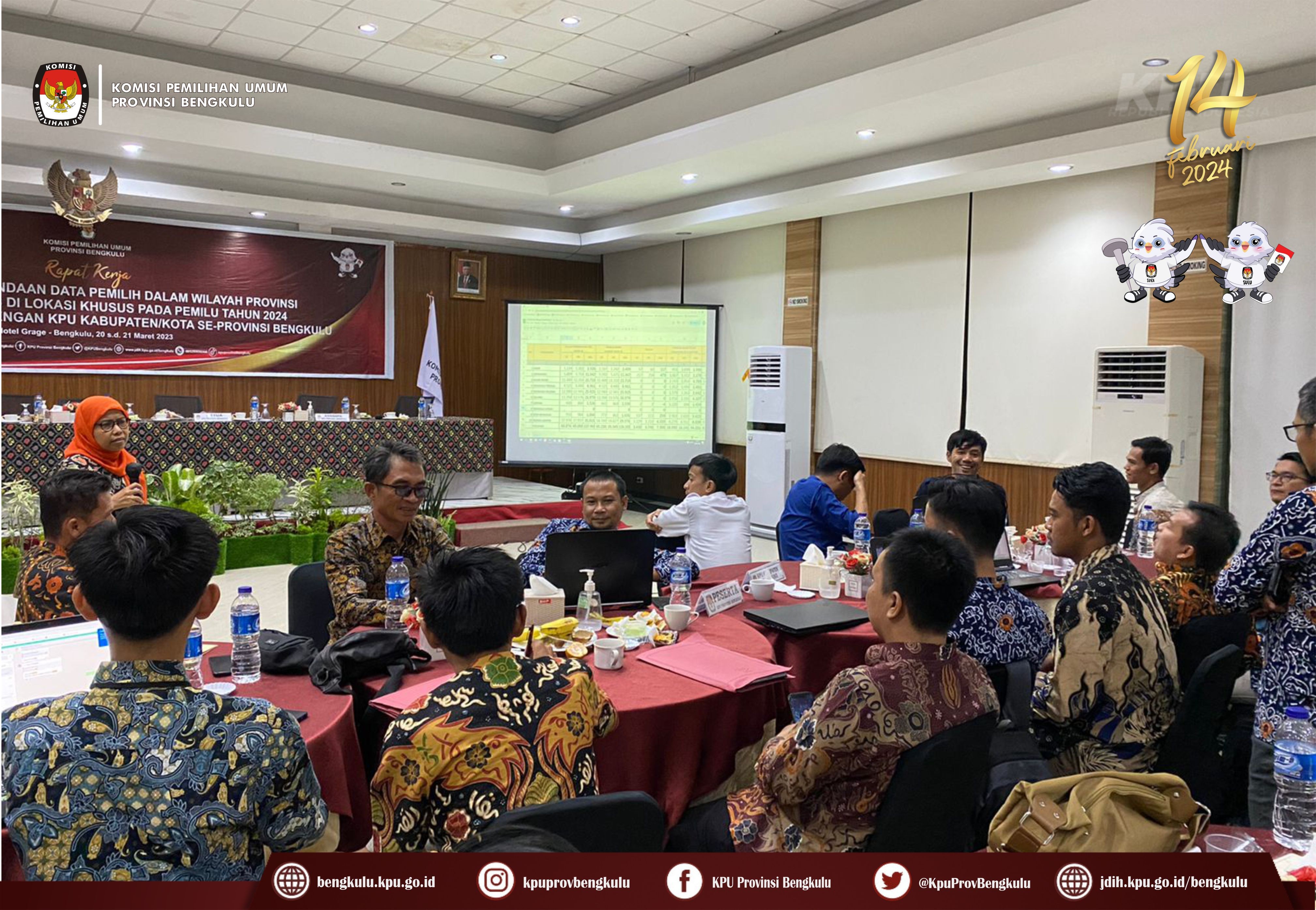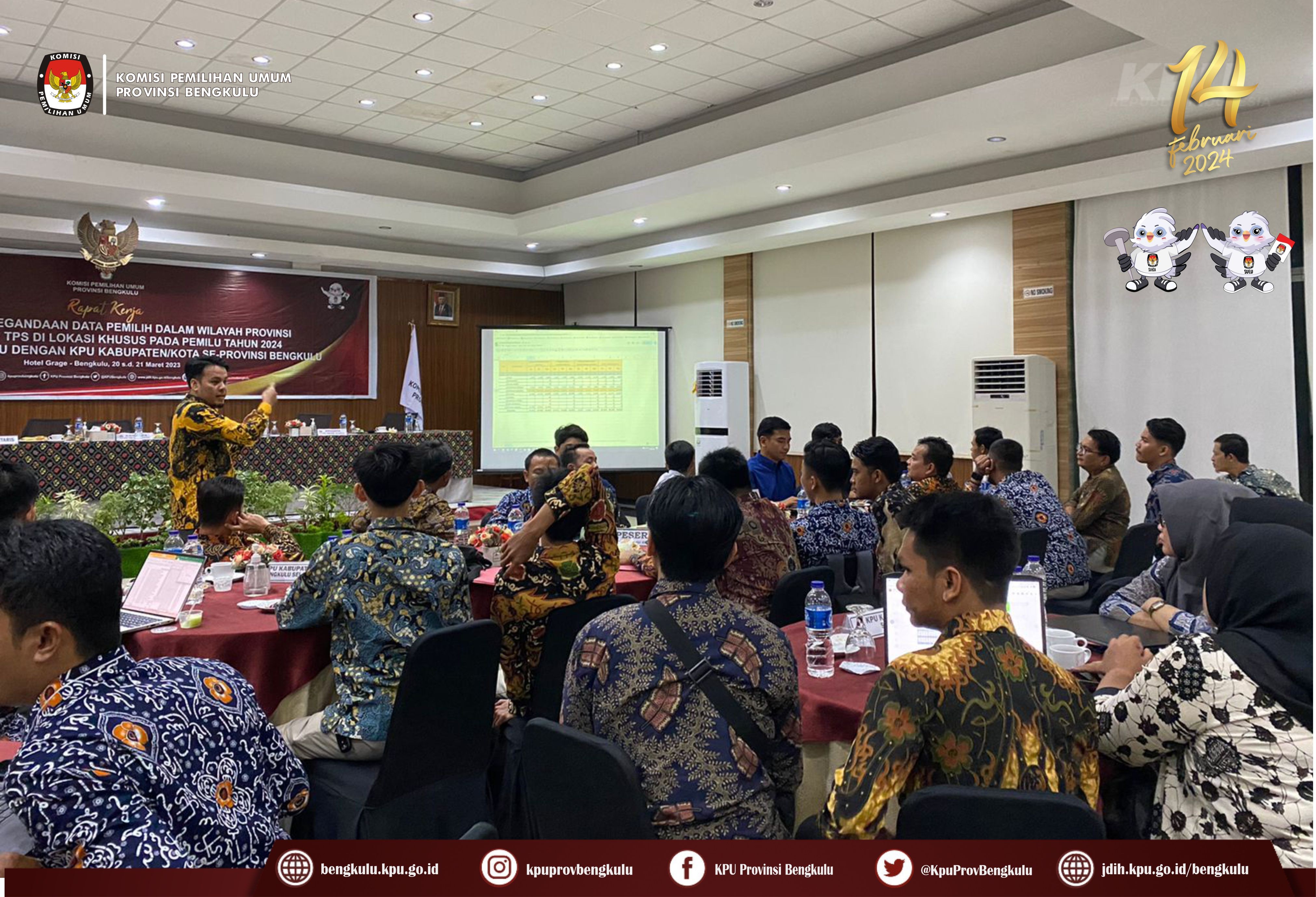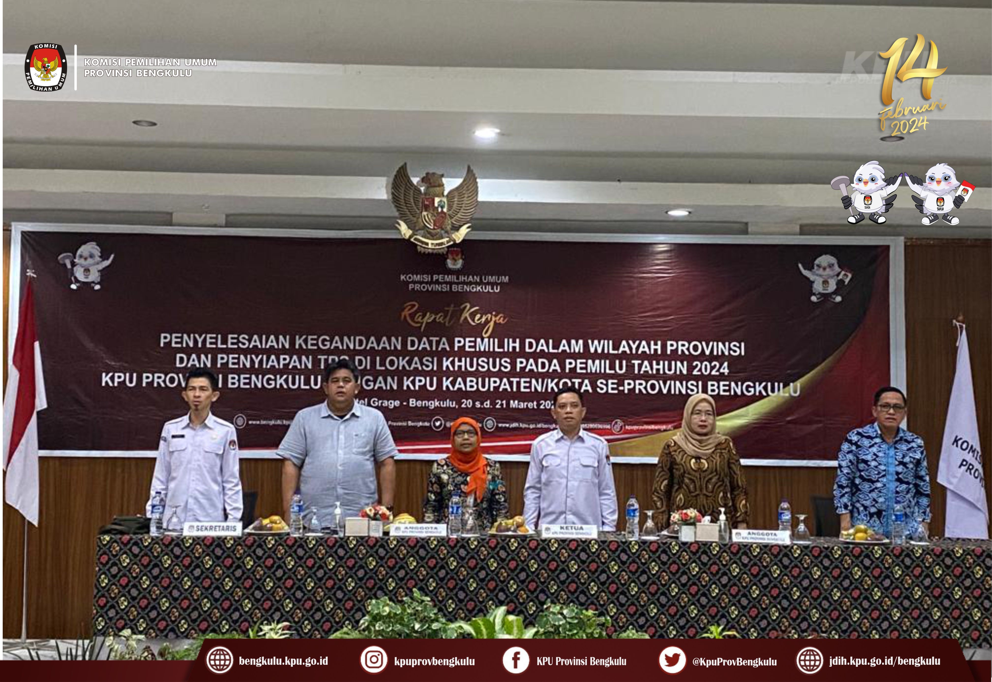 Ketua KPU Provinsi Bengkulu Irwan Saputra bersama Anggota Siti Baroroh, Darlinsyah, Emex Verzoni, dan Irna Riza Yuliastuty serta Sekretaris Kemas Mohammad Ajir hadir sekaligus membuka acara Rapat Kerja Penyelesaian Kegandaan Dalam Wilayah Provinsi dan Penyiapan TPS di Lokasi Khusus pada Pemilu Tahun 2024, Senin (20/3/2023) di Grage Hotel Bengkulu. Peserta kegiatan adalah Ketua Divisi Perencanaan Data dan Informasi, Kasubbag Perencanaan Data dan Informasi, dan Admin/Operator Sidalih KPU Kabupaten/Kota se-Provinsi Bengkulu