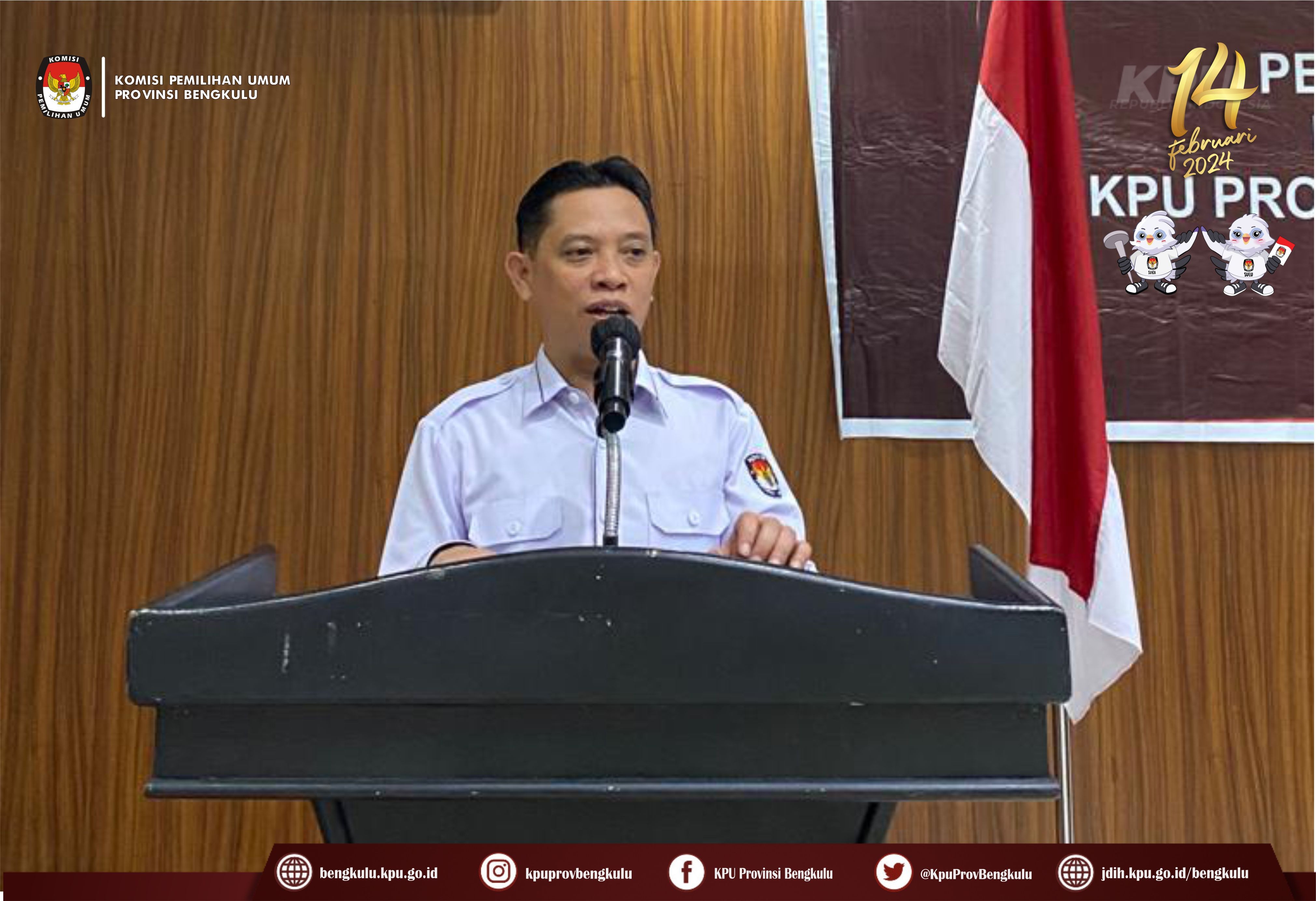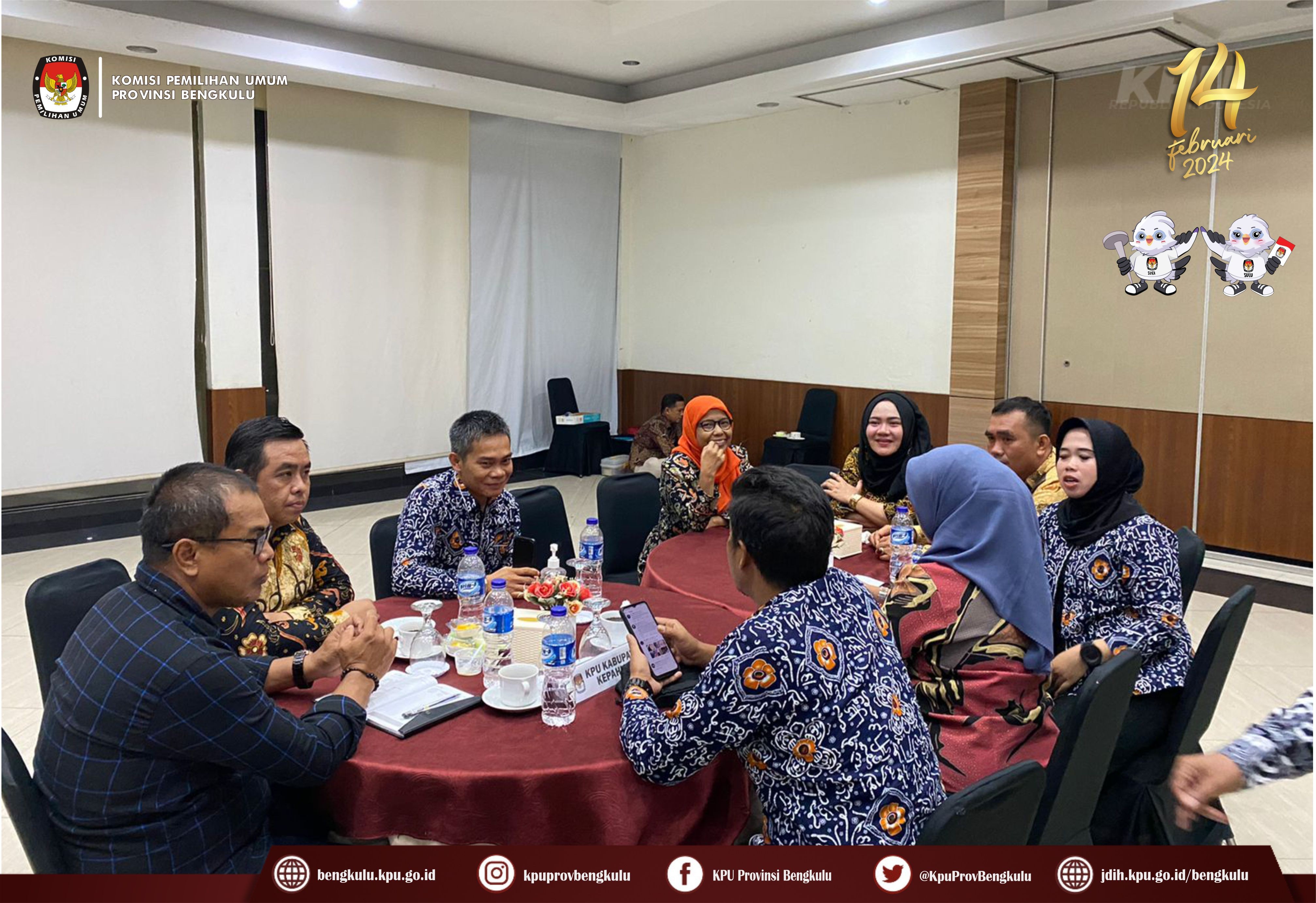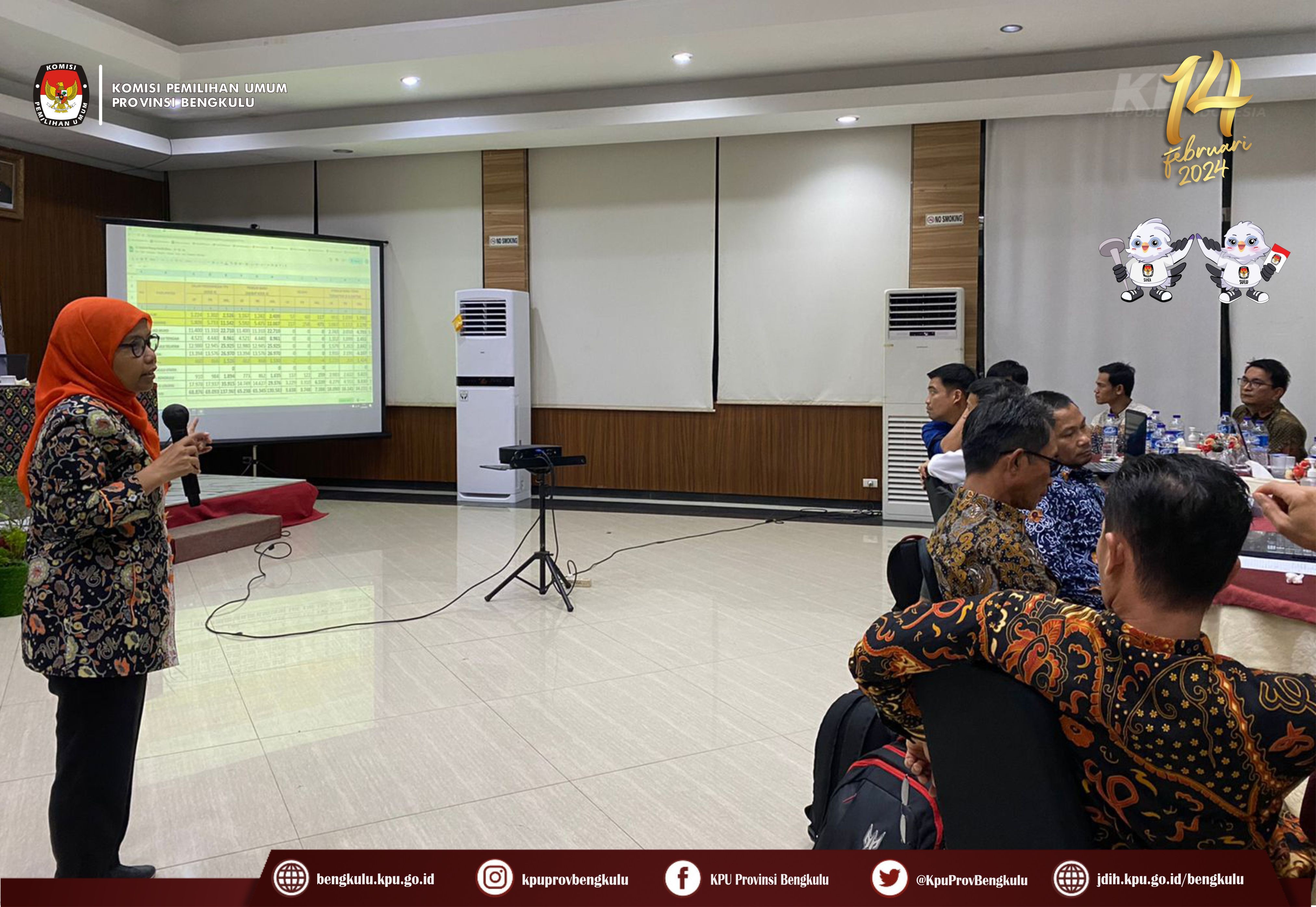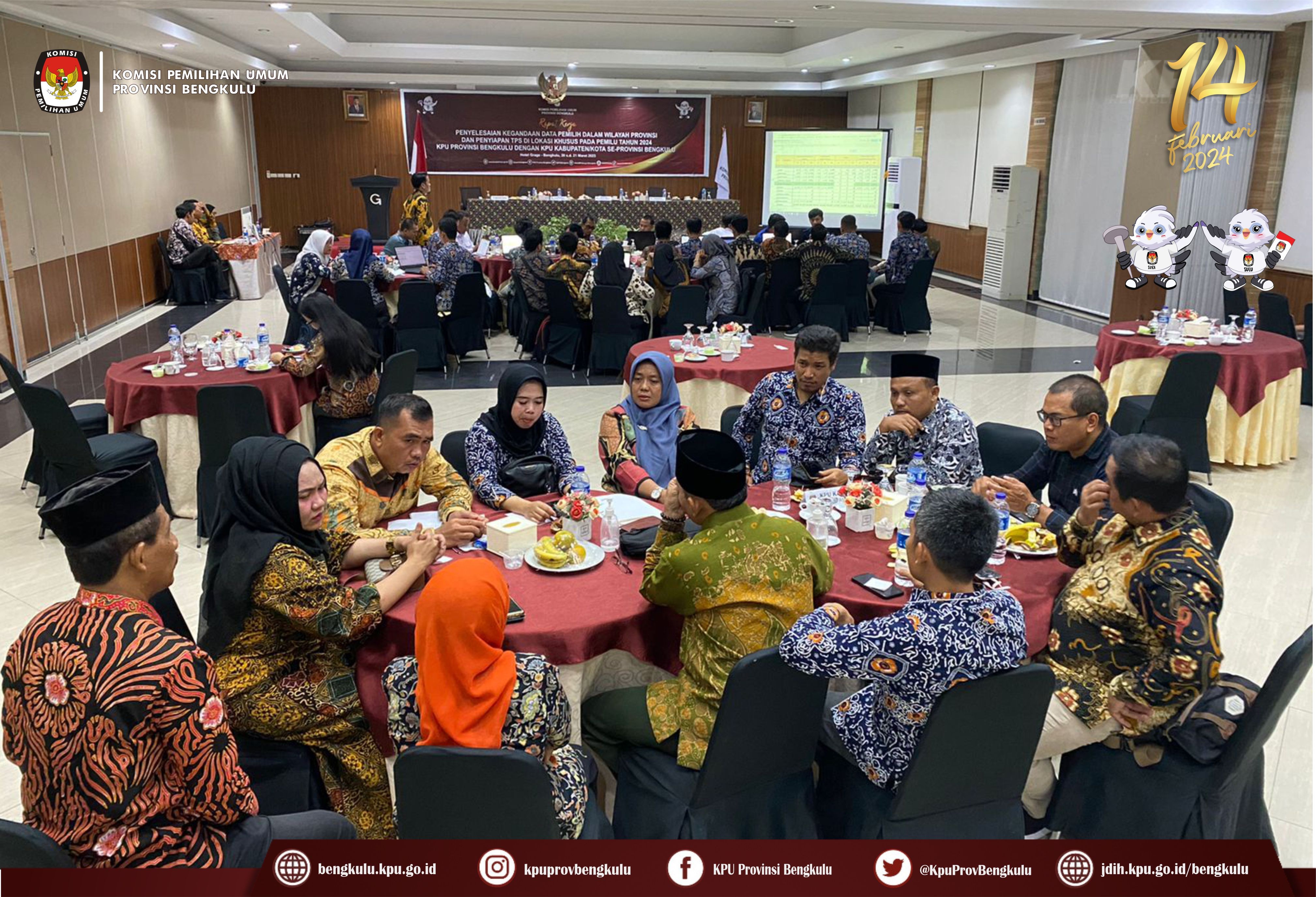 Ketua KPU Provinsi Bengkulu Irwan Saputra bersama Anggota Siti Baroroh, Darlinsyah, Emex Verzoni, dan Irna Riza Yuliastuty serta Sekretaris Kemas Mohammad Ajir hadir sekaligus membuka acara Rapat Kerja Penyelesaian Kegandaan Dalam Wilayah Provinsi dan Penyiapan TPS di Lokasi Khusus pada Pemilu Tahun 2024, Senin (20/3/2023) di Grage Hotel Bengkulu. Peserta kegiatan adalah Ketua Divisi Perencanaan Data dan Informasi, Kasubbag Perencanaan Data dan Informasi, dan Admin/Operator Sidalih KPU Kabupaten/Kota se-Provinsi Bengkulu