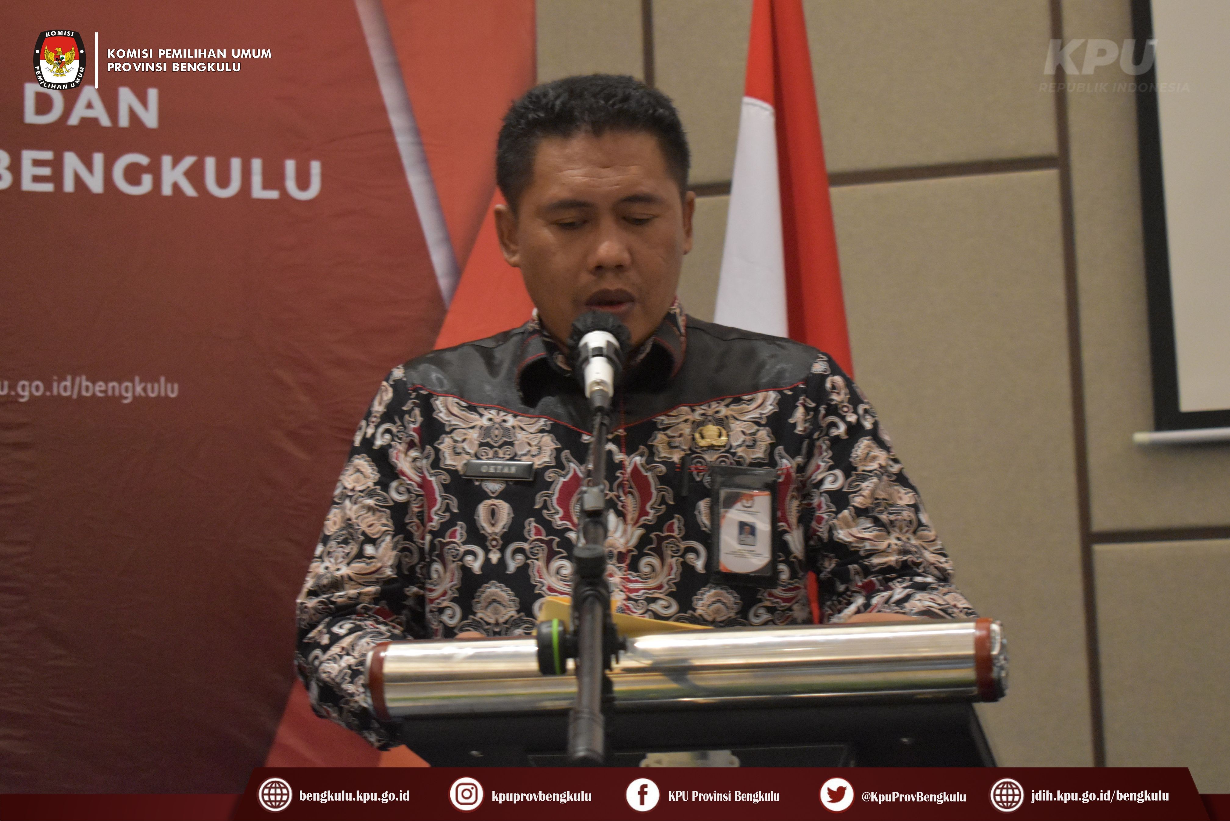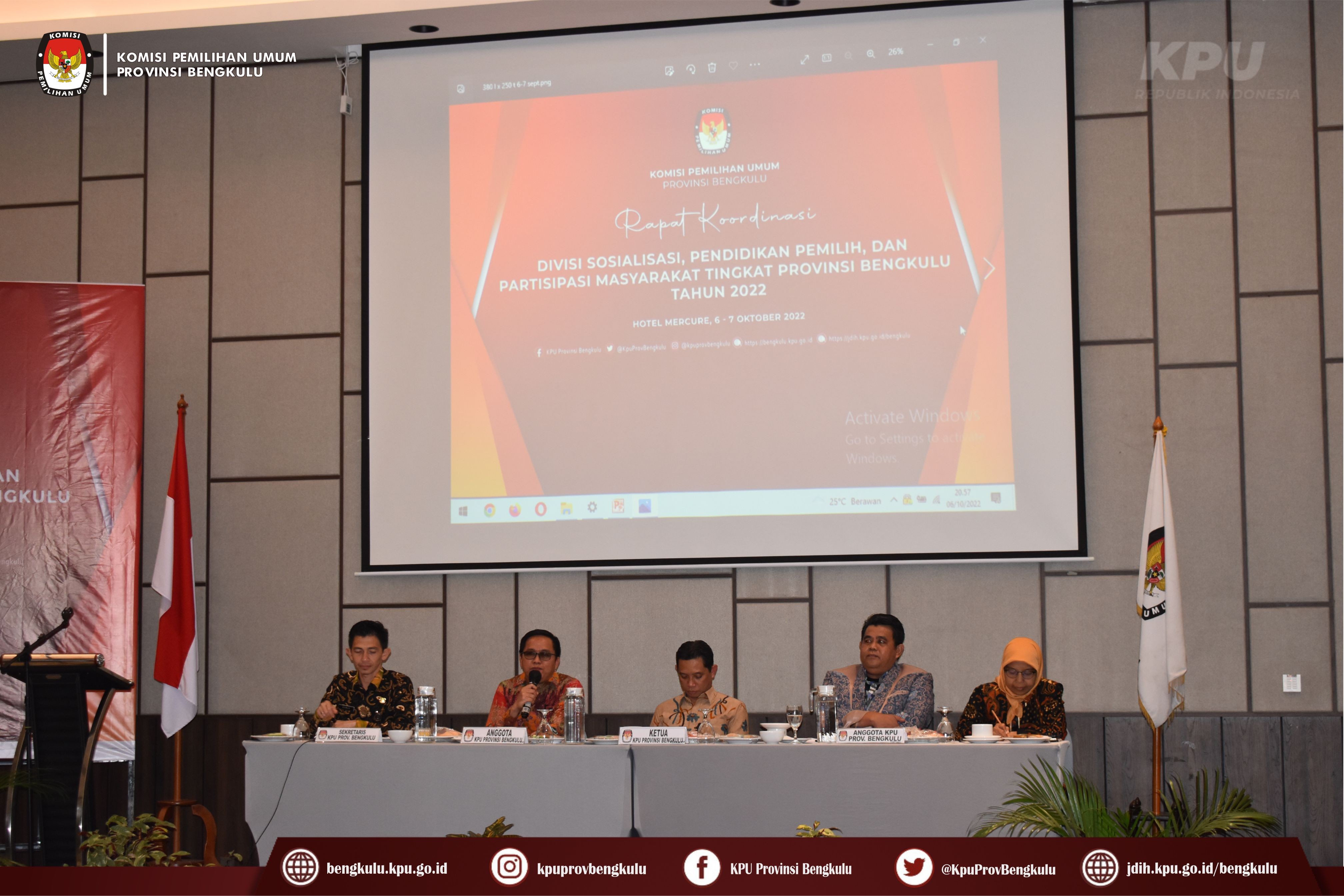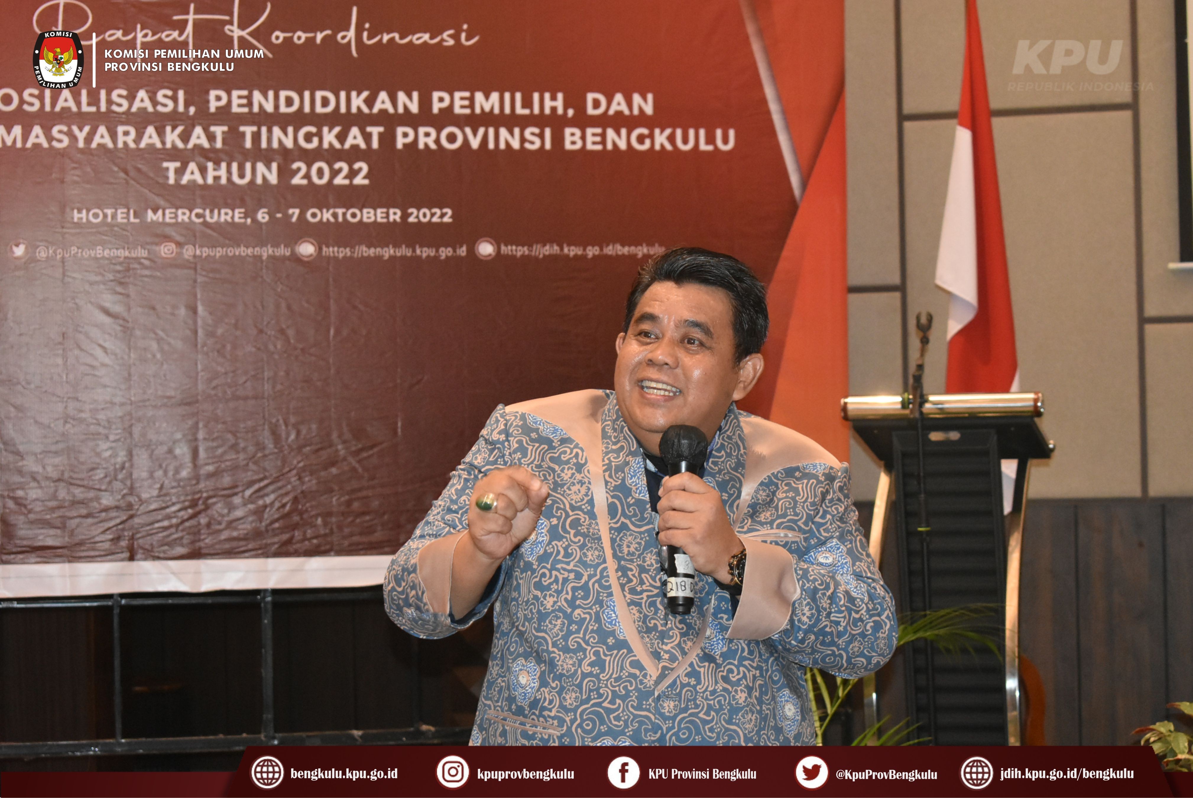 Bengkulu-bengkulu.kpu.go.id, Ketua KPU Provinsi Bengkulu Irwan Saputra dan Anggota Siti Baroroh, Darlinsyah dan Emex Verzoni serta Sekretaris Kemas Mohammad Ajir membuka acara Rapat Koordinasi Divisi Sosialisasi, Pendidikan Pemilih dan Partisipasi Masyarakat Tingkat Provinsi Bengkulu Tahun 2022 di Mercure Hotel Bengkulu, Kamis (6/10). Kegiatan ini diikuti oleh Ketua, Anggota Divisi Sosdiklih Parmas dan SDM, Sekretaris, Kasubbag Teknis Penyelenggaraan Pemilu Partisipasi dan Hubungan Masyarakat dan Operator/Pengelola Media Sosial.