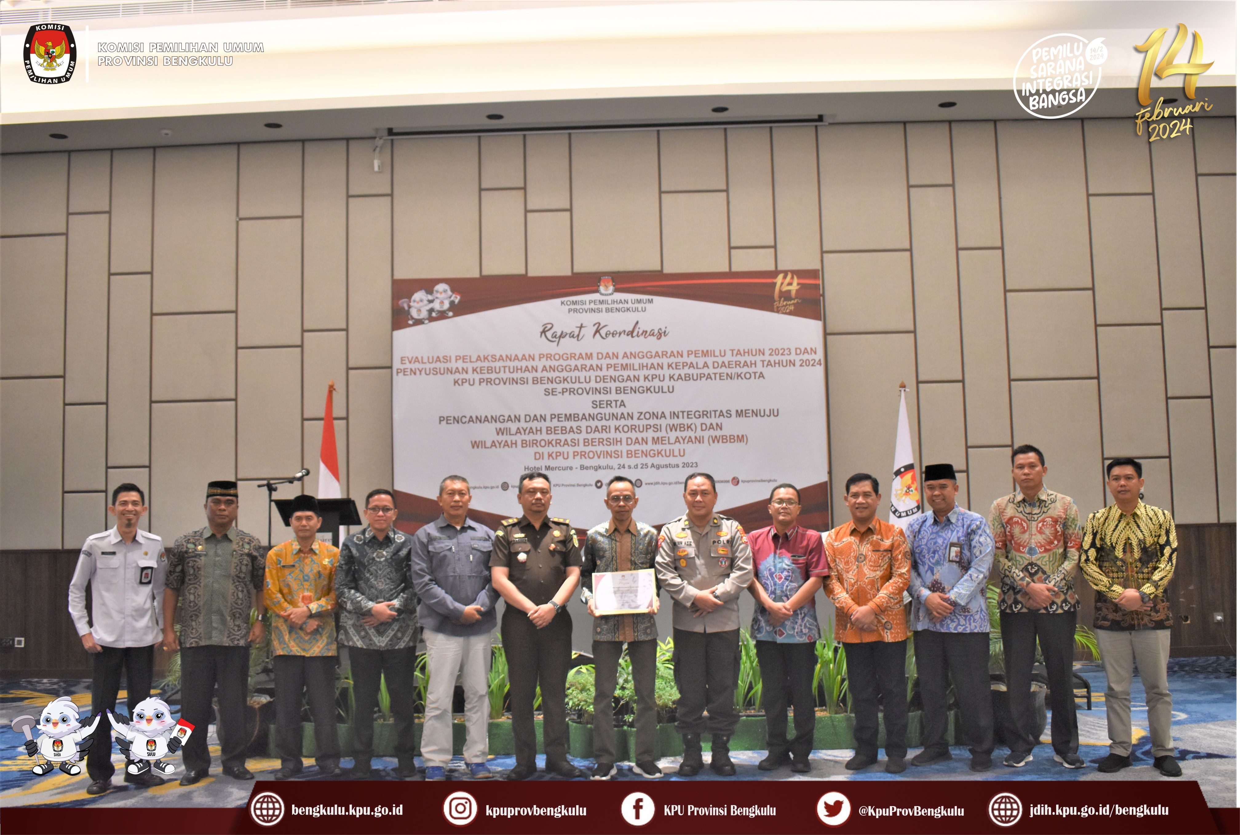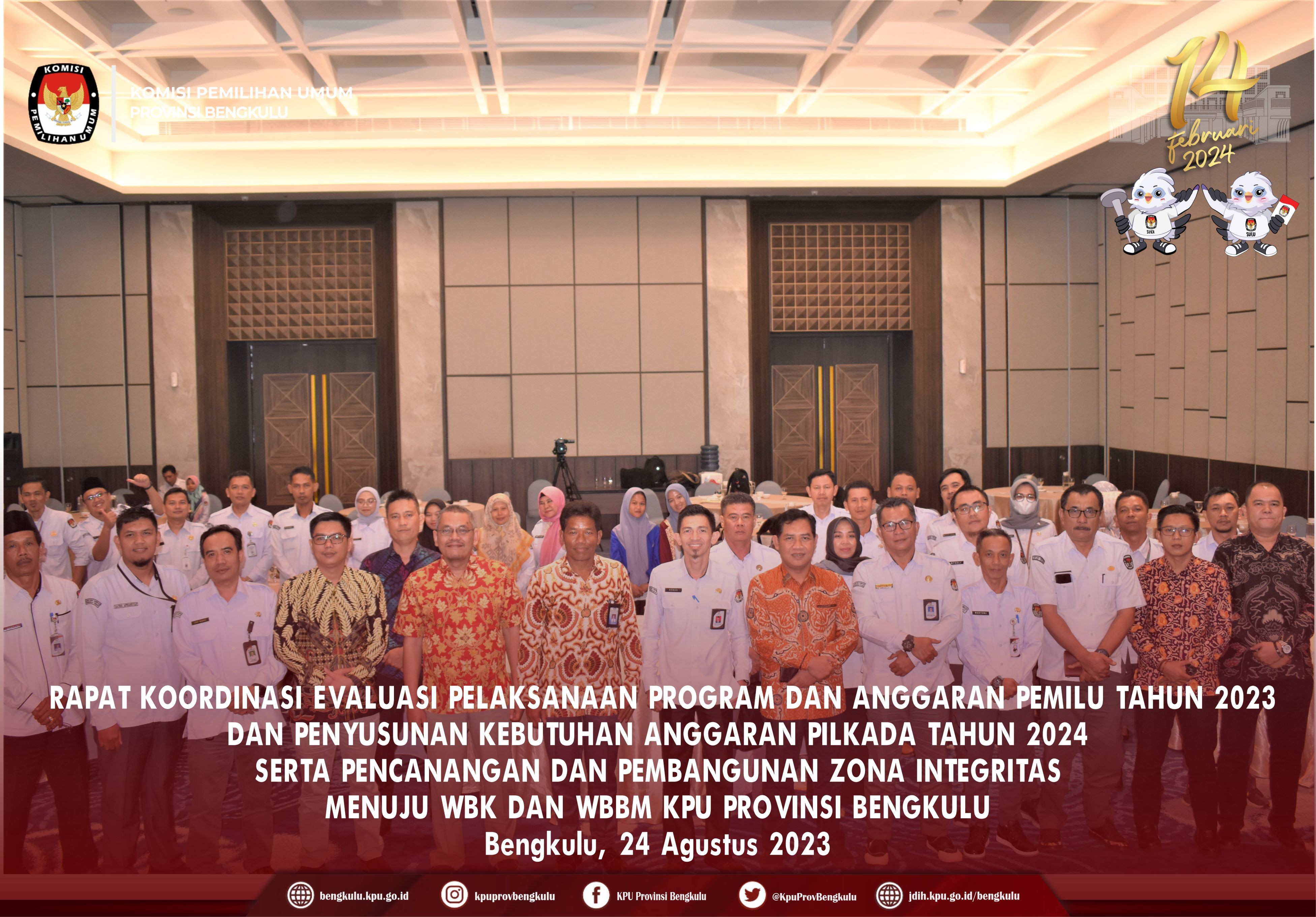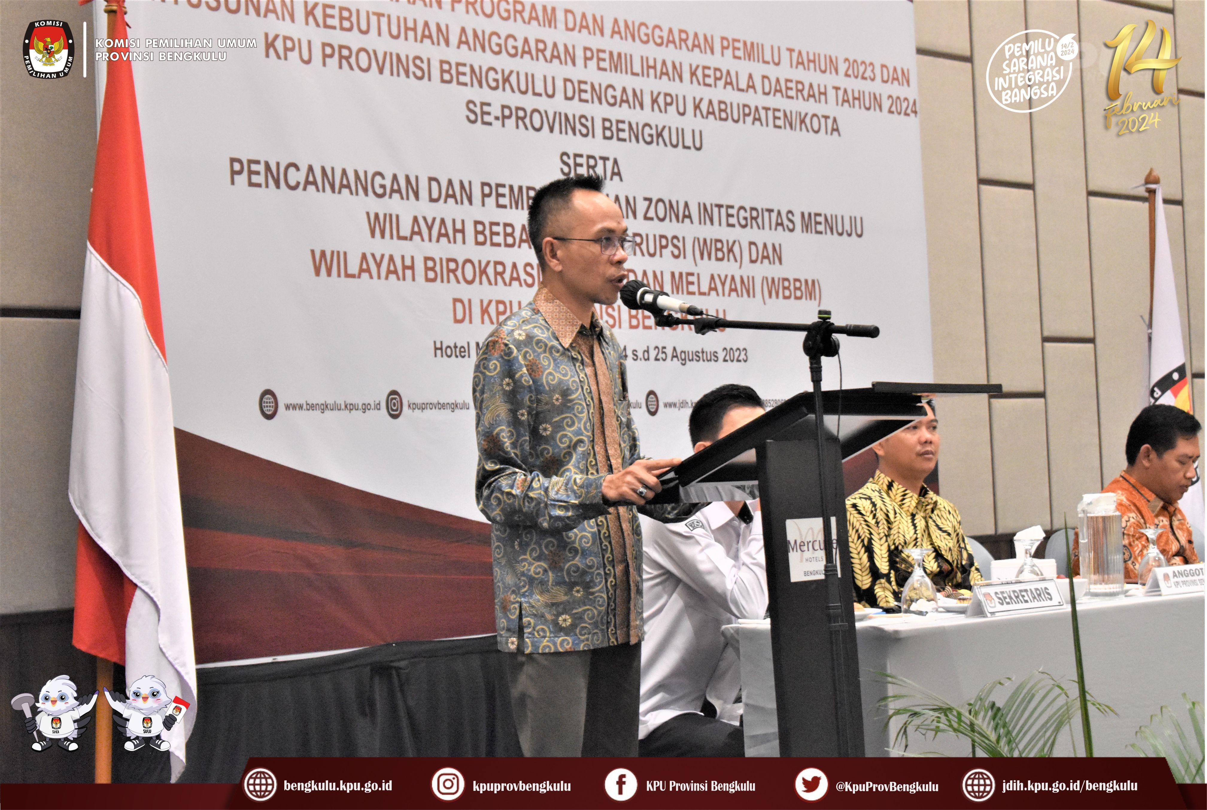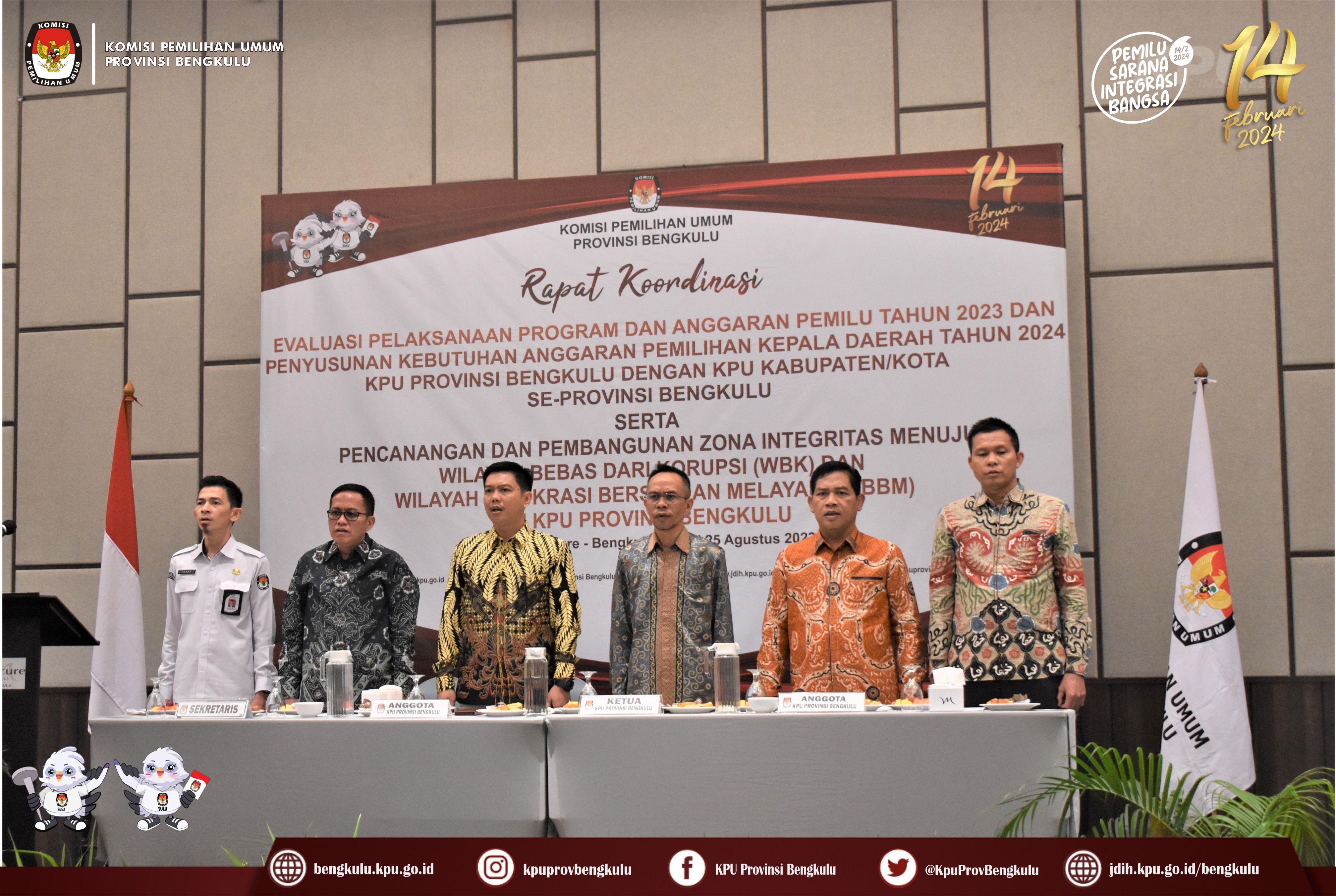 Ketua KPU Provinsi Bengkulu Rusman Sudarsono bersama Anggota Alpin Samsen, Dodi Hendra Supiarso, Emex Verzoni dan Sarjan Efendi serta Sekretaris Kemas Mohammad Ajir membuka Rapat Koordinasi Evaluasi Pelaksanaan Program dab Anggaran Pemilu Tahun 2023 serta Penyusunan Kebutuhan Anggaran Pilkada Tahub 2024, Kamis (24/8/2023). Peserta kegiatan yang hadir adalah Unsur Polda, Ombudsman, Kejati, Danrem 041 Gamas, Bawaslu Provinsi, KIP, Dinas Dukcapil, dan Kesbangpol, serta Ketua Divisi Rendatin, Sekretaris, Kasubbag Rendatin dan Operator Perencanaan KPU Kabupaten/Kota se- Provinsi Bengkulu. Rangkaian acara dibuka dengan menyanyikan Lagu Indonesia Raya, Sambutan Ketua KPU Provinsi Bengkulu, dilanjutkan dengan Pencanangan dan Pembangunan Zona Integritas menuju Wilayah Bebas dari Korupsi (WBK) dan Wilayah Birokrasi Bersih dan Melayani (WBBM) di KPU Provinsi Bengkulu. Acara diisi dengan Penyampaian Materi dari Kanwil DJPb Provinsi Bengkulu Muhammad Budi Dharmanto dan Kepala BPKP Provinsi Bengkulu Muzzakir.