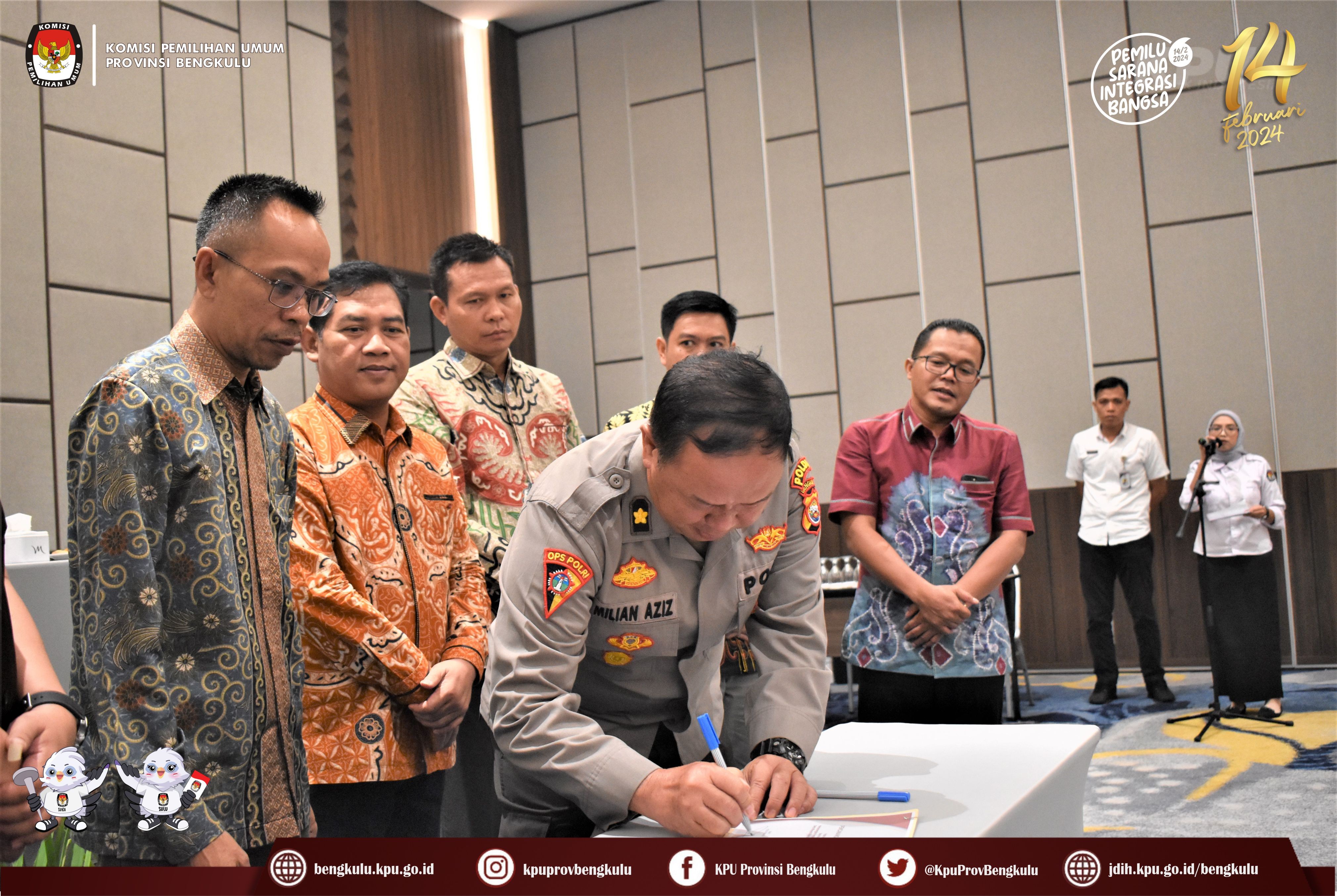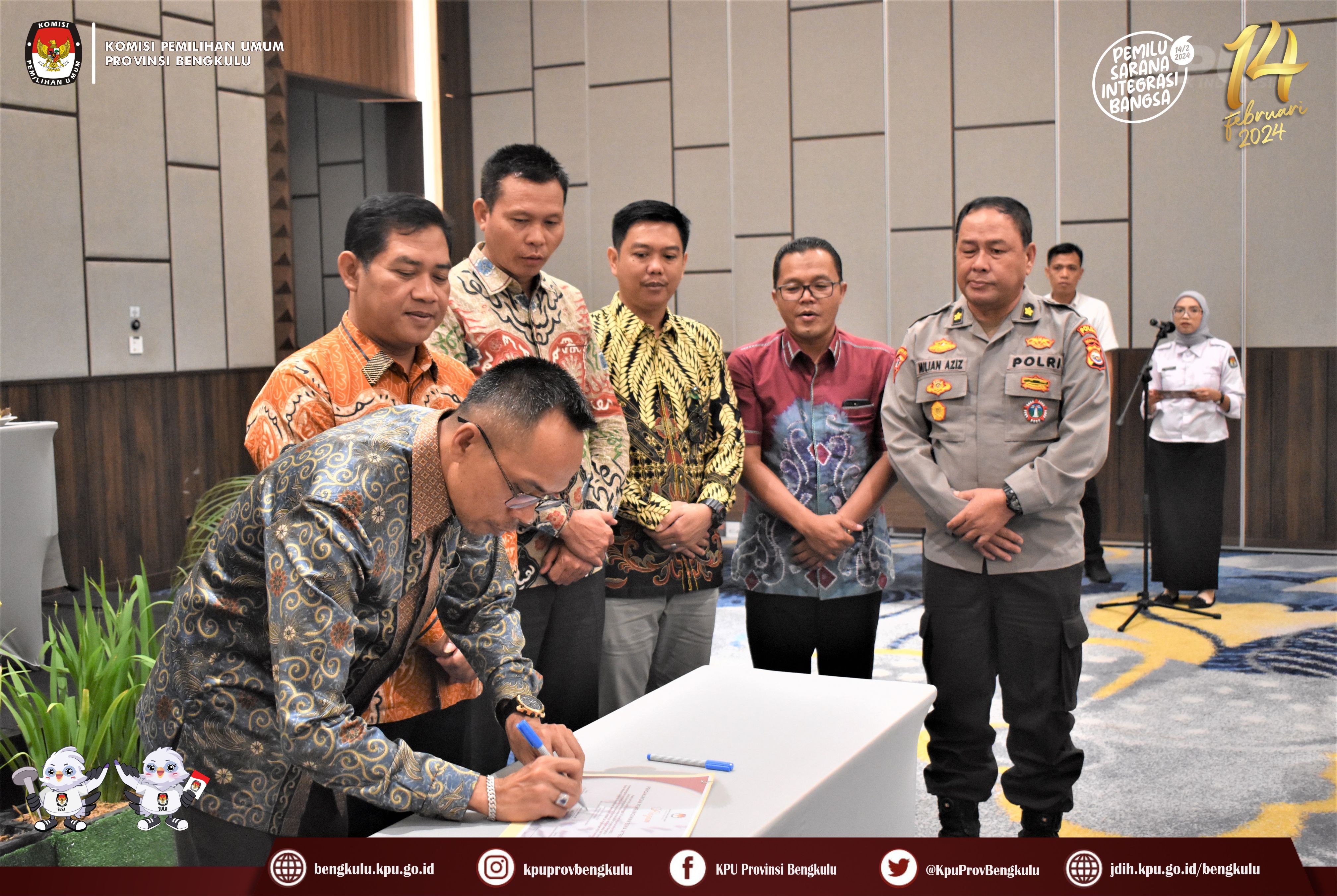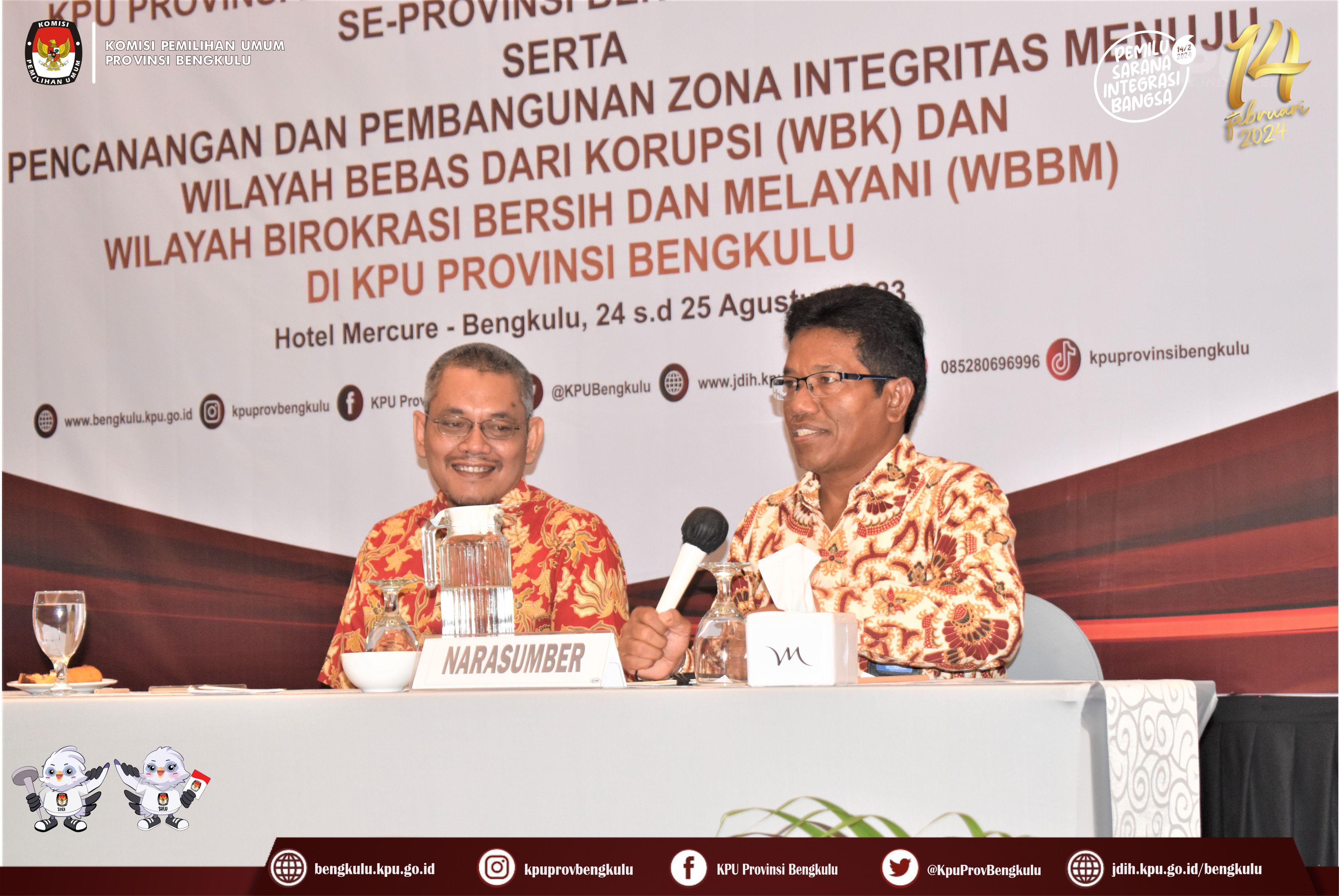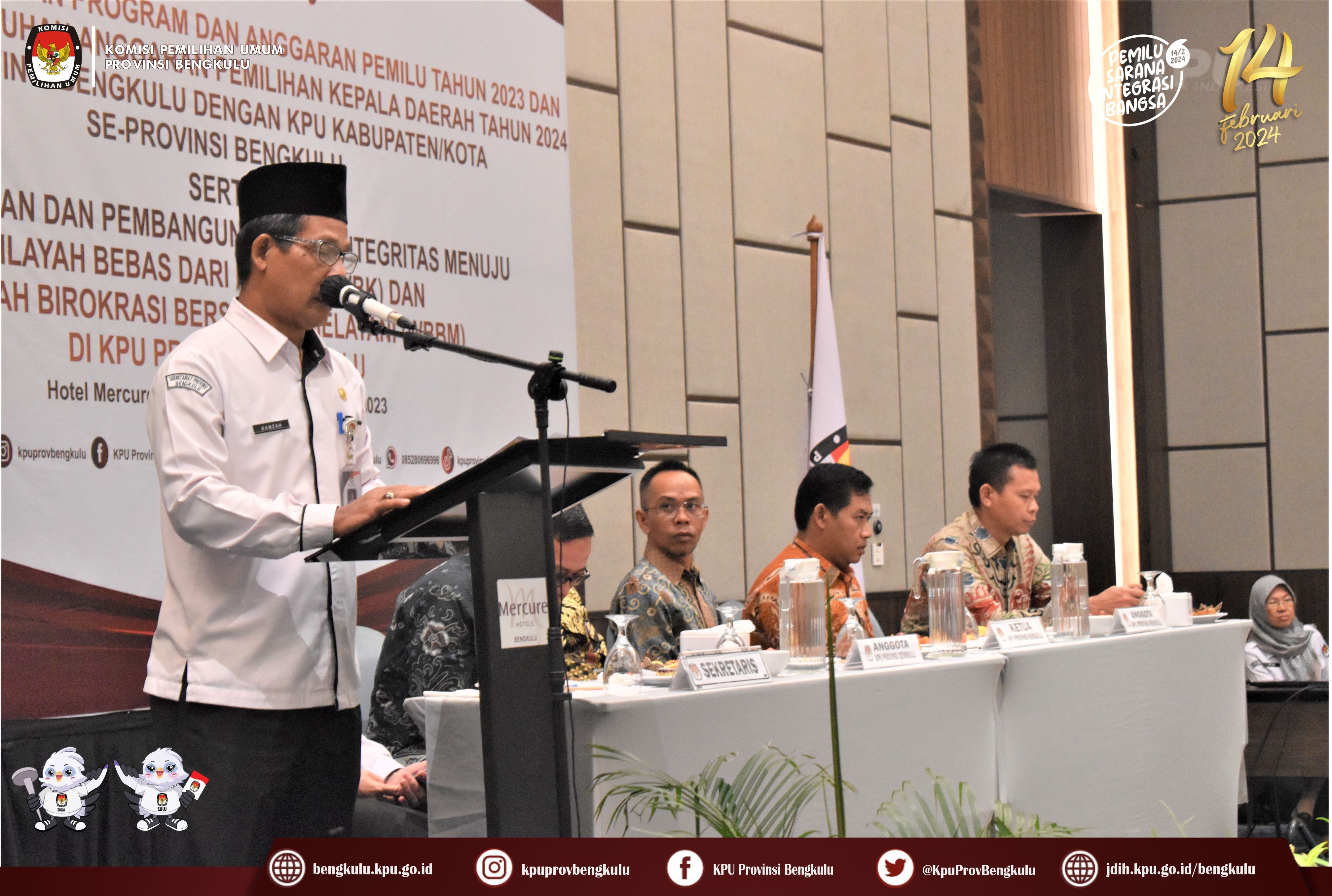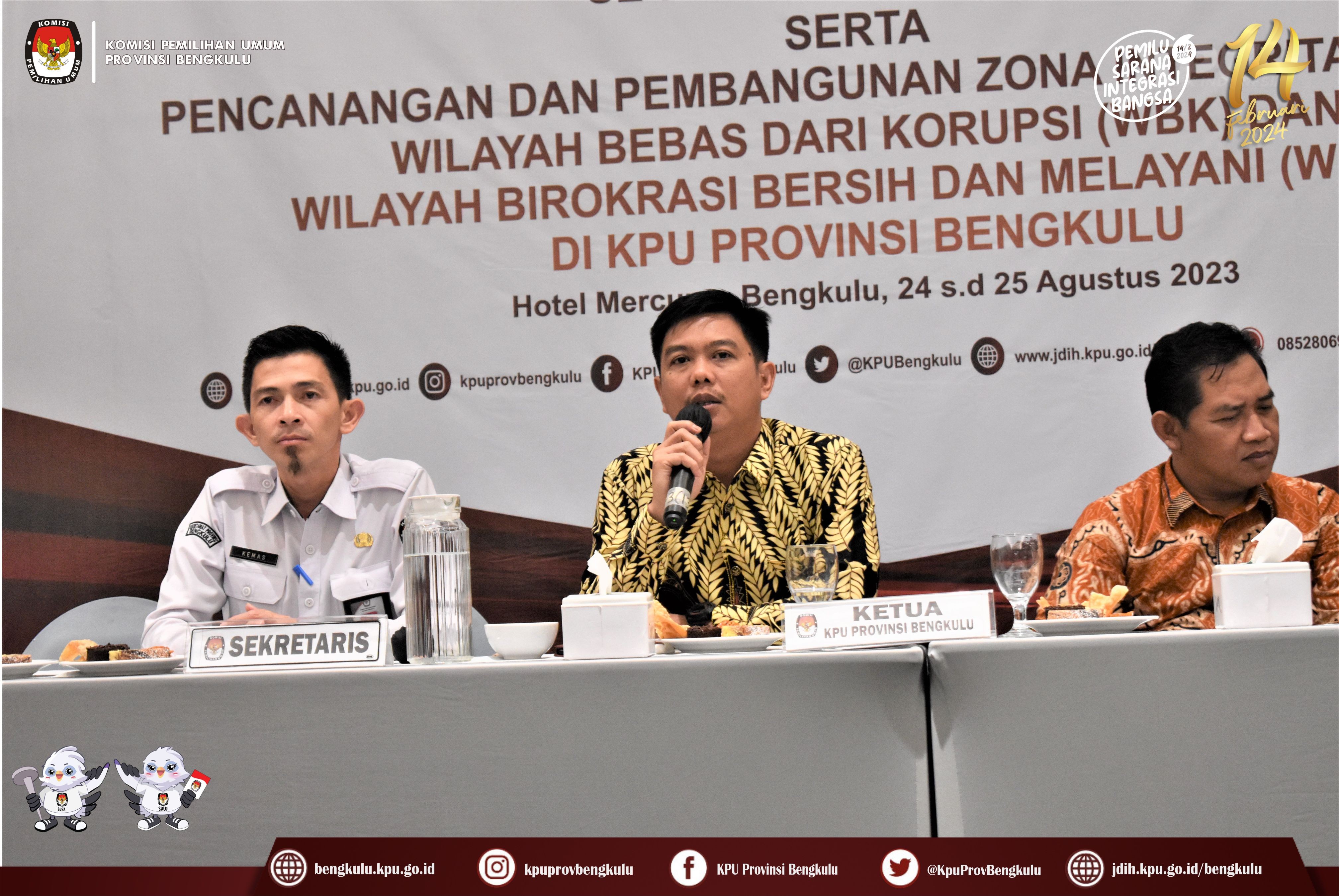 Ketua KPU Provinsi Bengkulu Rusman Sudarsono bersama Anggota Alpin Samsen, Dodi Hendra Supiarso, Emex Verzoni dan Sarjan Efendi serta Sekretaris Kemas Mohammad Ajir membuka Rapat Koordinasi Evaluasi Pelaksanaan Program dab Anggaran Pemilu Tahun 2023 serta Penyusunan Kebutuhan Anggaran Pilkada Tahub 2024, Kamis (24/8/2023). Peserta kegiatan yang hadir adalah Unsur Polda, Ombudsman, Kejati, Danrem 041 Gamas, Bawaslu Provinsi, KIP, Dinas Dukcapil, dan Kesbangpol, serta Ketua Divisi Rendatin, Sekretaris, Kasubbag Rendatin dan Operator Perencanaan KPU Kabupaten/Kota se- Provinsi Bengkulu. Rangkaian acara dibuka dengan menyanyikan Lagu Indonesia Raya, Sambutan Ketua KPU Provinsi Bengkulu, dilanjutkan dengan Pencanangan dan Pembangunan Zona Integritas menuju Wilayah Bebas dari Korupsi (WBK) dan Wilayah Birokrasi Bersih dan Melayani (WBBM) di KPU Provinsi Bengkulu. Acara diisi dengan Penyampaian Materi dari Kanwil DJPb Provinsi Bengkulu Muhammad Budi Dharmanto dan Kepala BPKP Provinsi Bengkulu Muzzakir.