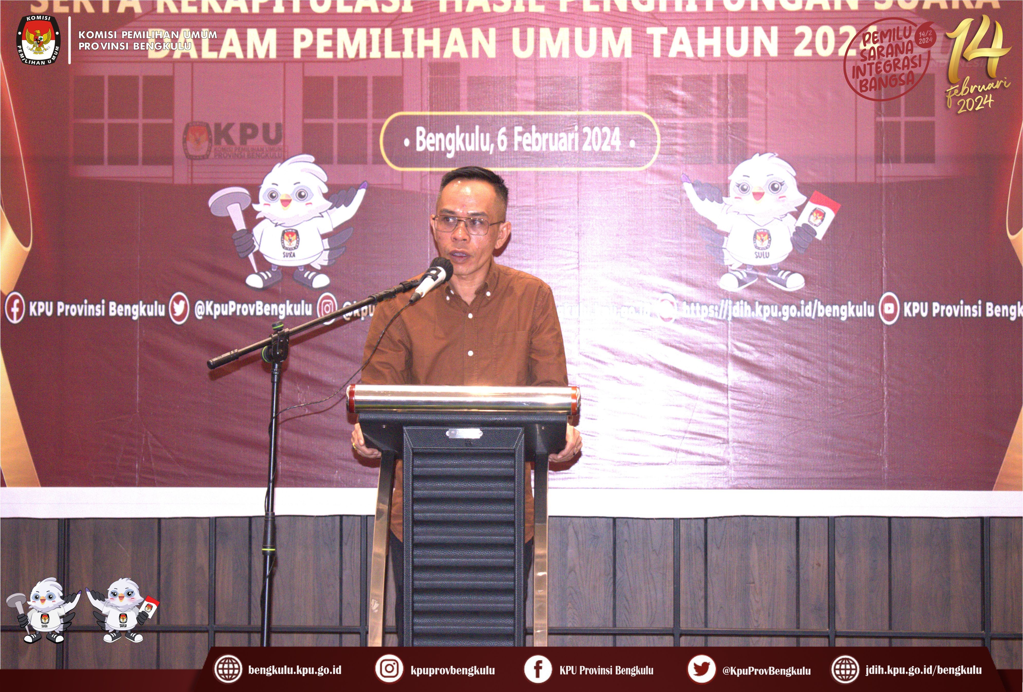 Bengkulu, bengkulu.kpu.go.id - Ketua KPU Provinsi Bengkulu Rusman Sudarsono bersama Anggota Alpin Samsen, Dodi Hendra Supiarso, Emex Verzoni dan Sarjan Efendi serta Sekretaris Kemas Mohammad Ajir membuka Rapat Koordinasi Kesiapan Pemungutan dan Penghitungan Suara Serta Rekapitulasi hasil Penghitungan Suara Dalam Pemilihan Umum Tahun 2024 pada Selasa (6/2/2024) secara luring dan daring bertempat di Mercure Hotel Bengkulu. Hadir dalam acara adalah Ketua, Anggota, Sekretaris dan Kasubbag TPPHM KPU Kabupaten/Kota se-Provinsi Bengkulu, Anggota Bawaslu Divisi Hukum, Pencegahan, Parmas dan Humas Kabupaten/Kota se-Provinsi Bengkulu, Kesbangpol dan Dinas Dukcapil Provinsi Bengkulu. Rusman menyampaikan bahwa kegiatan dalam rangka memastikan kesiapan penyelenggara pemilu menjelang 7 (tujuh) hari menuju pemungutan suara dan menyamakan persepsi dan pemahaman antara KPU dan Bawaslu mengenai kebijakan dan mekanisme pemungutan, penghitungan dan rekapitulasi penghitungan perolehan suara pemilu tahun 2024. Acara diisi dengan pemaparan materi dalam diskusi panel dengan menghadirkan narasumber dari Anggota KPU Provinsi Bengkulu Sarjan Efendi, Tenaga Ahli KPU RI Firnandes Maurisya dan Anggota Bawaslu Provinsi Bengkulu Eko Sugianto. Sarjan memaparkan materi mengenai kebijakan umum Pemungutan dan Penghitungan Suara Serta Rekapitulasi hasil Penghitungan Suara, Penetapan Calon Terpilih, dan Persiapan Penerimaan LPPDK Peserta Pemilu Tahun 2024, Firnandes memaparkan materi potensi masalah pungut hitung suara pemilu serentak 2024 diantaranya pemilu yang demokratis, potensi masalah, Pemungutan suara ulang, potensi pidana pemilu dalam tungsura, langkah yang harus dilakukan, dan Eko memaparkan materi Potensi Pelanggaran Pemilu pada tahapan pumungutan dan penghitungan suara pemilu Tahun 2024. Selain materi acara juga diisi dengan diskusi tanya jawab.