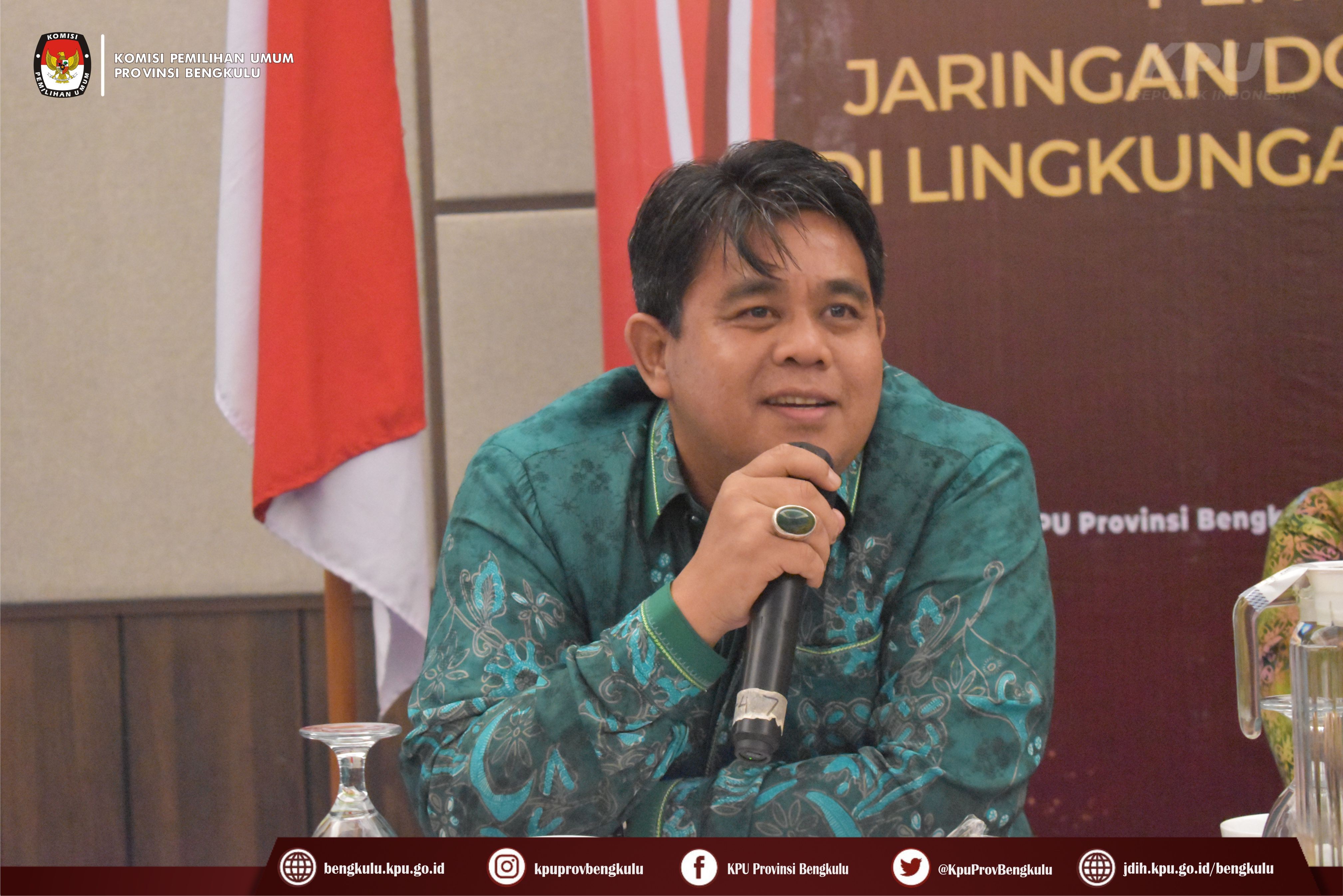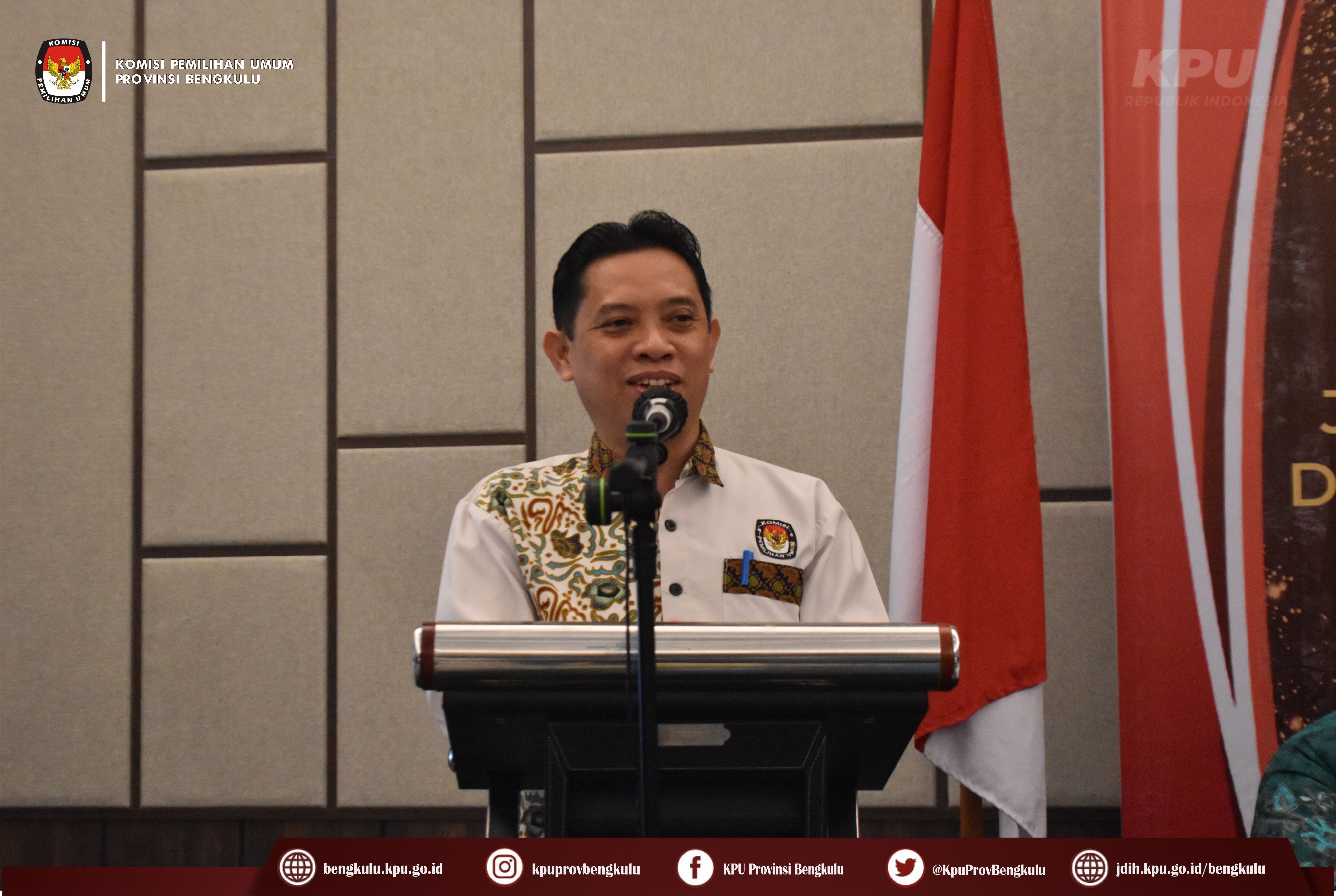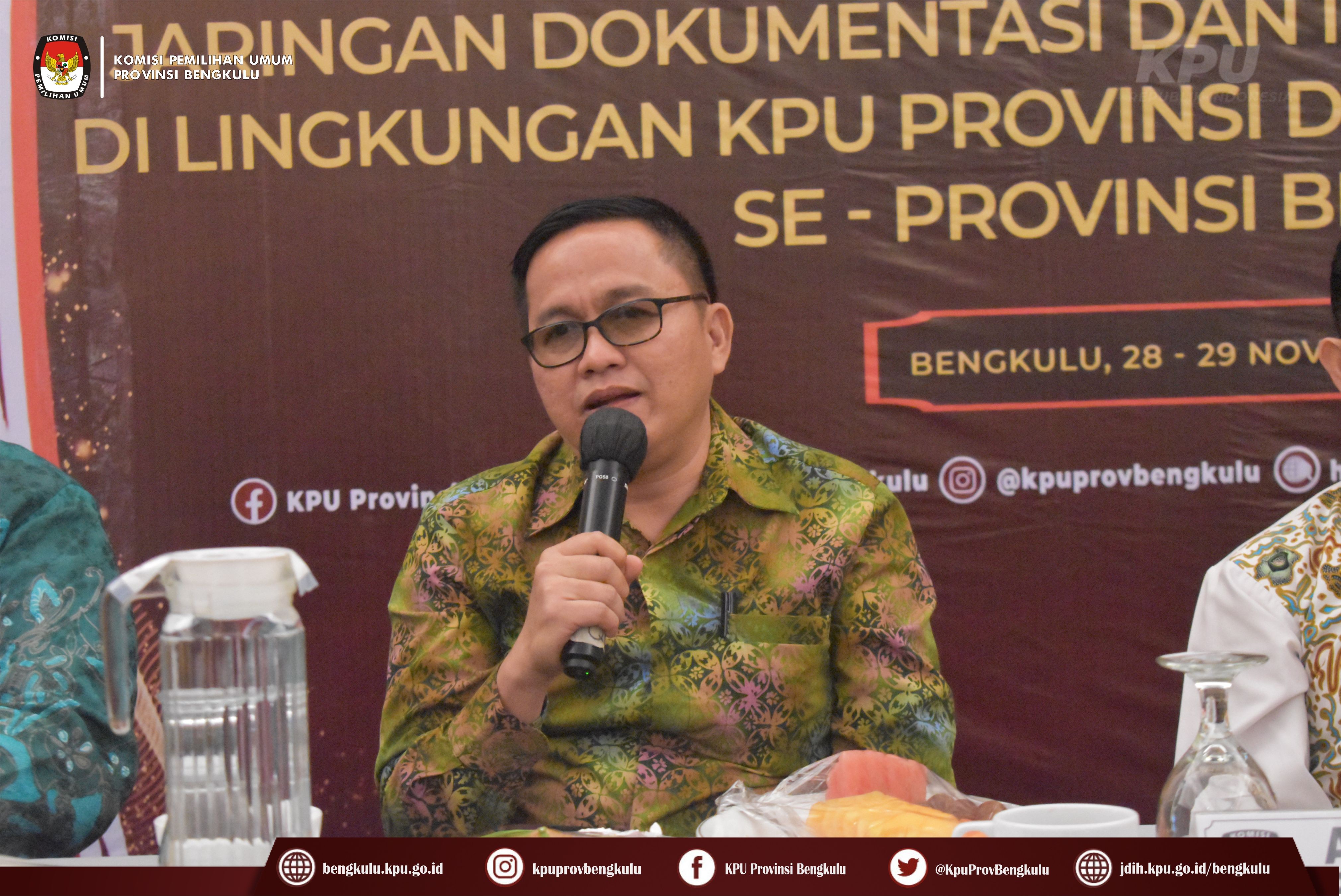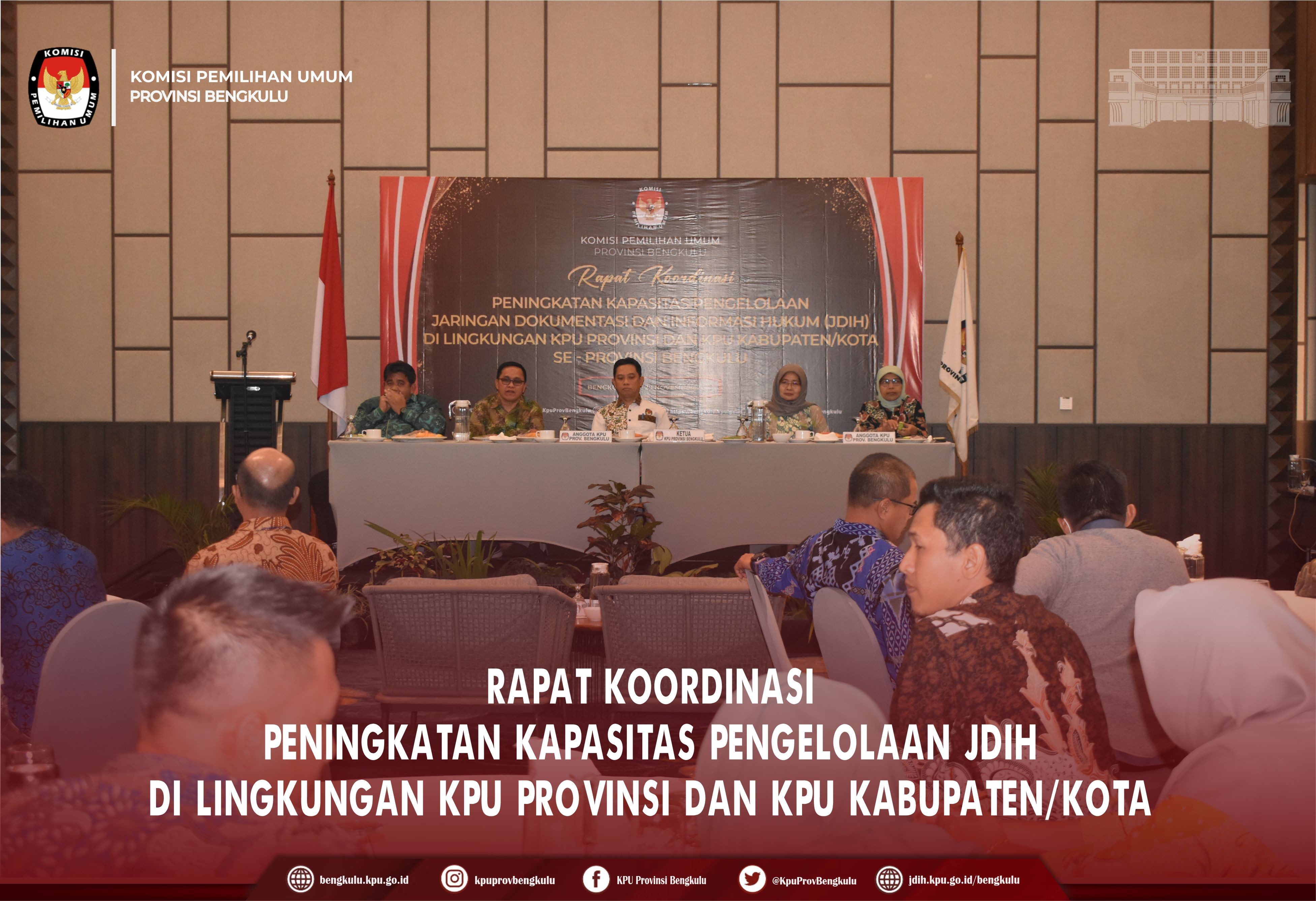 Bengkulu-bengkulu.kpu.go.id, Ketua KPU Provinsi Bengkulu Irwan Saputra didampingi Anggota KPU Provinsi Bengkulu Siti Baroroh, Darlinsyah, Emex Verzoni, dan Irna Riza Yuliastuty membuka acara Rapat Koordinasi Peningkatan Kapasitas Pengelolaan Jaringan Dokumentasi dan Informasi Hukum (JDIH) KPU Provinsi dan KPU Kabupaten/Kota se-Provinsi Bengkulu bertempat di Mercure Hotel Bengkulu, Senin (28/11).